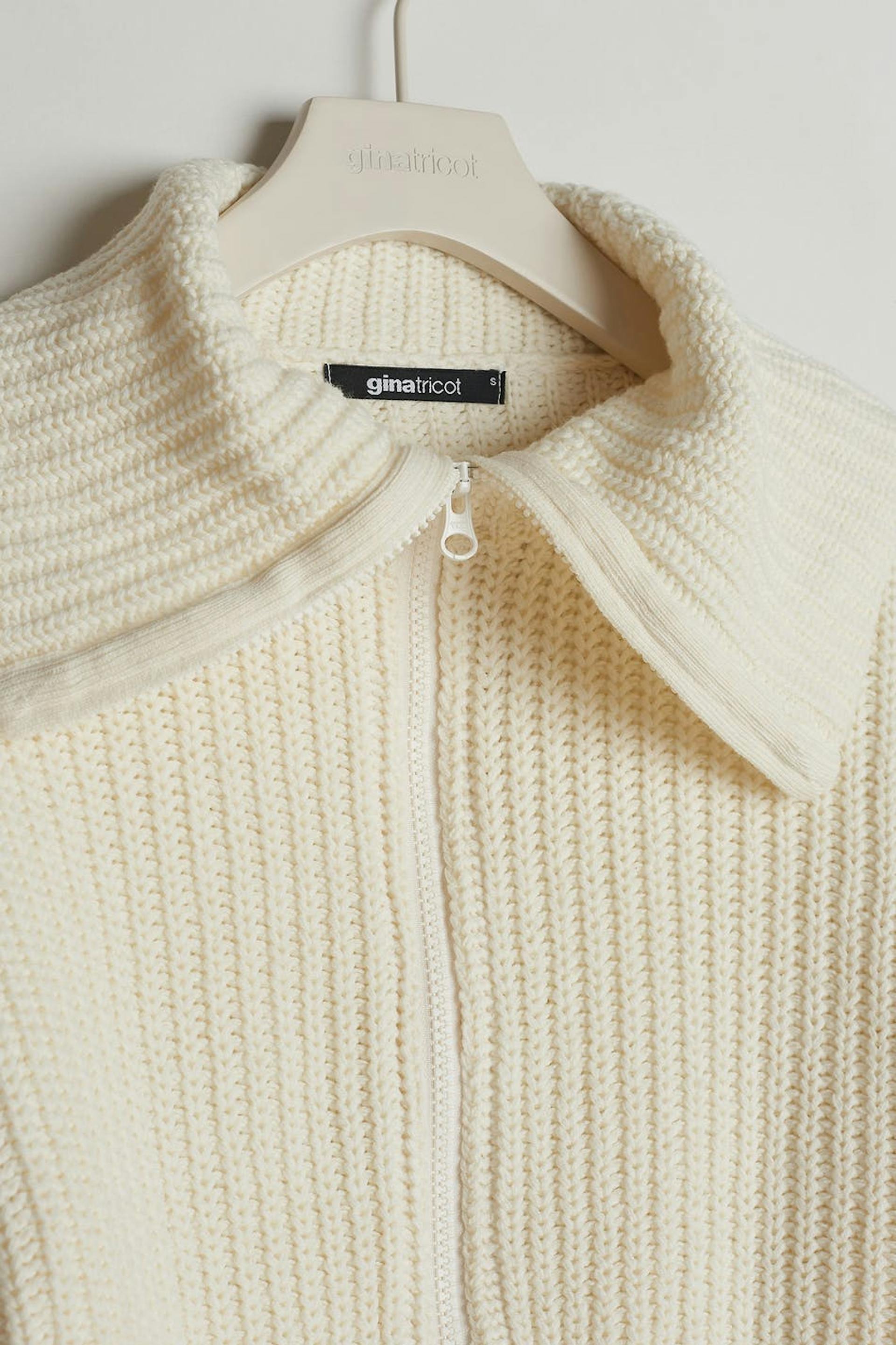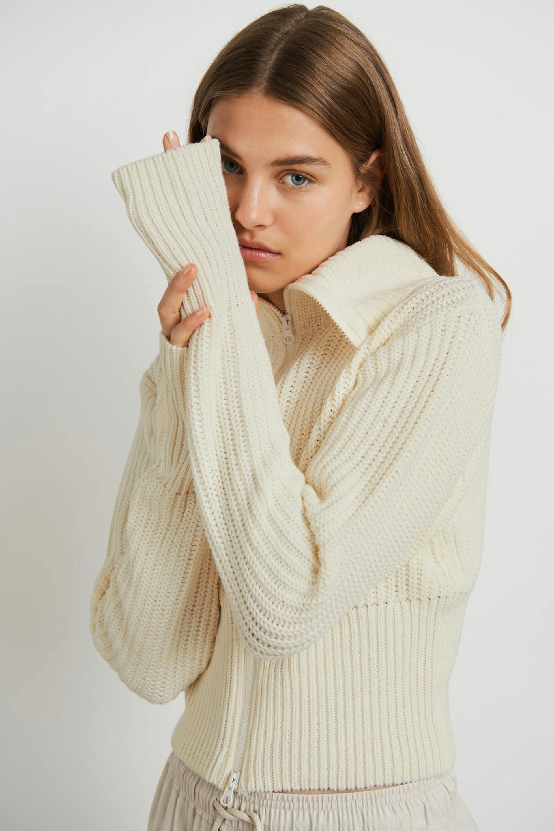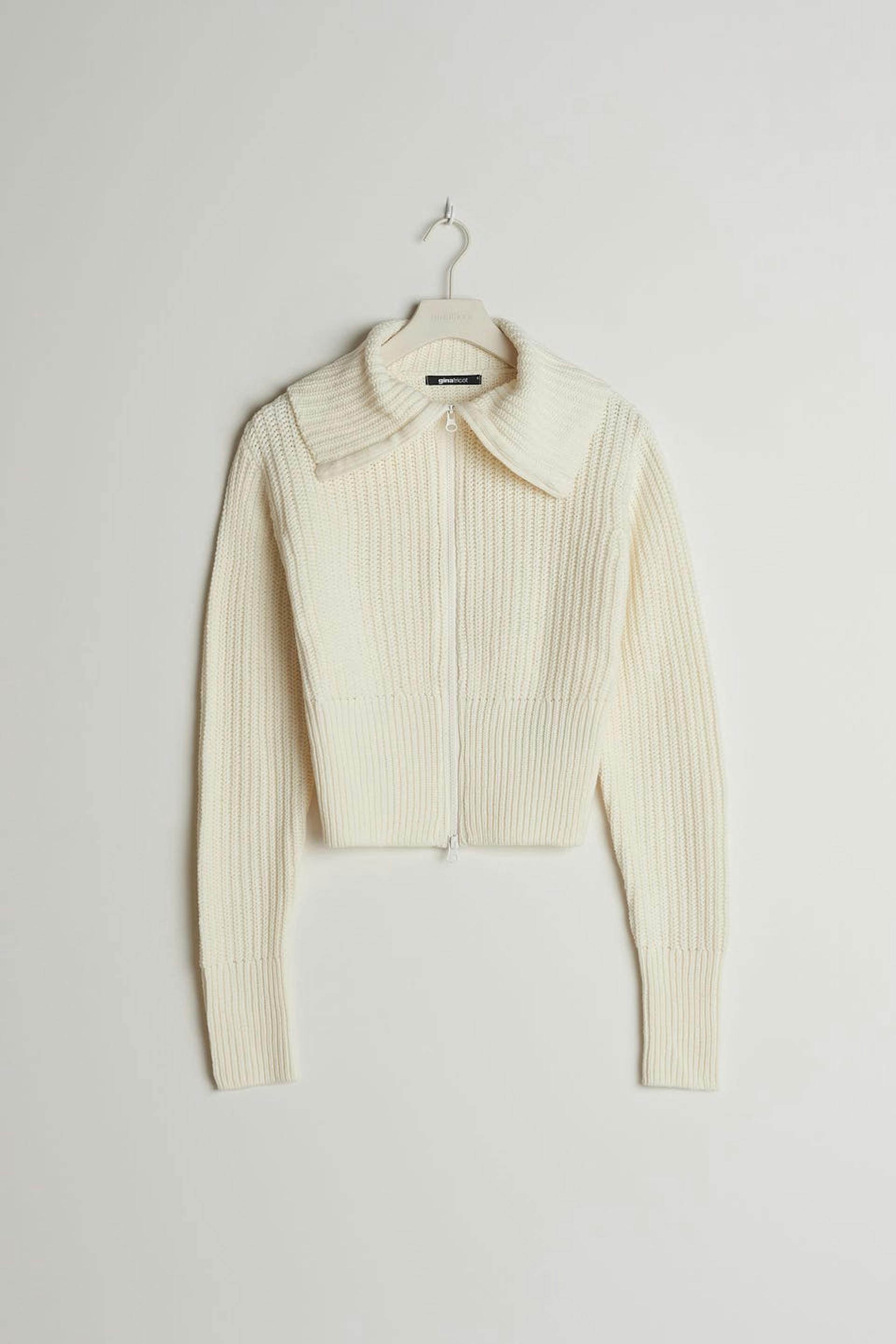 Strikket trøje med en høj krave. Trøjen er hvid og har en croppet længde. Den har en lynlås i plastik ved fronten.