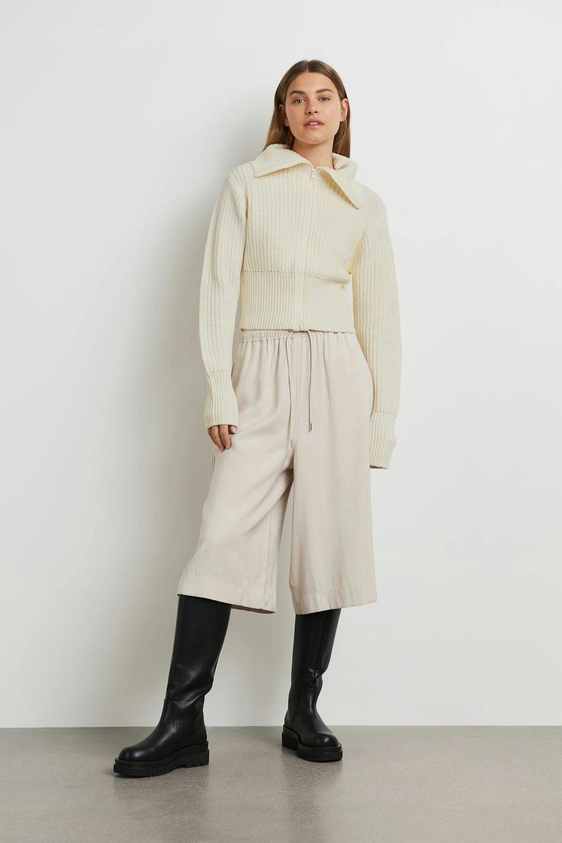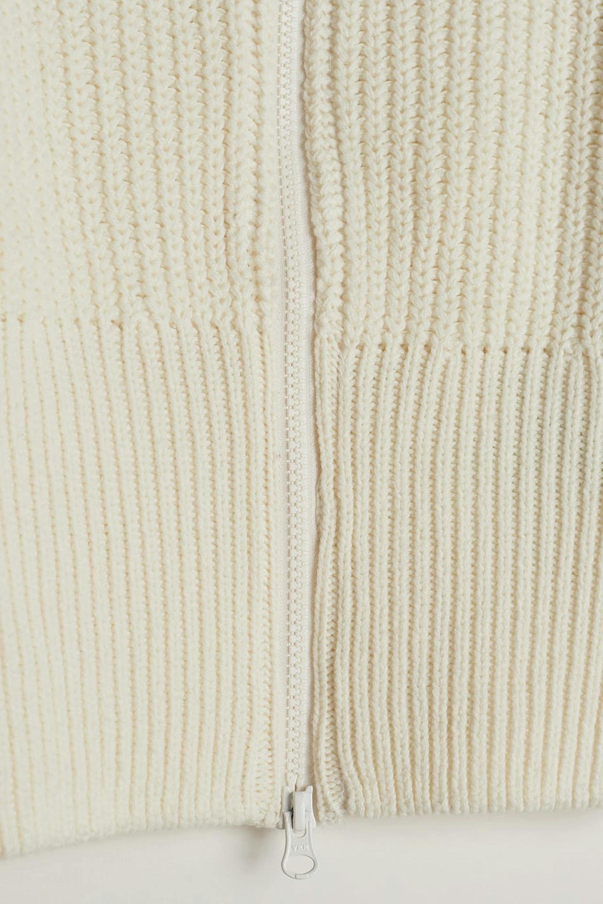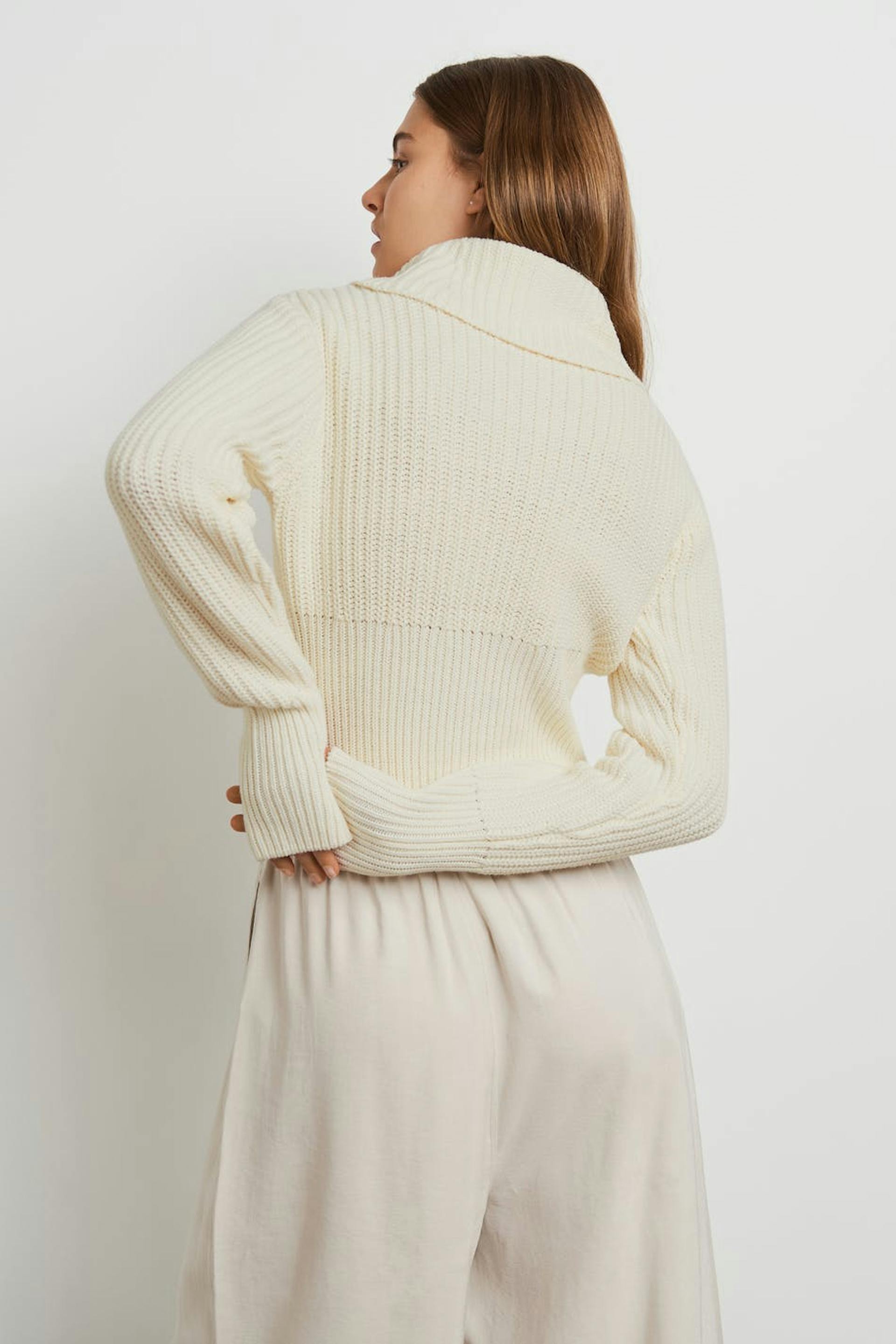 Strikket trøje med en høj krave. Trøjen er hvid og har en croppet længde. Den har en lynlås i plastik ved fronten.