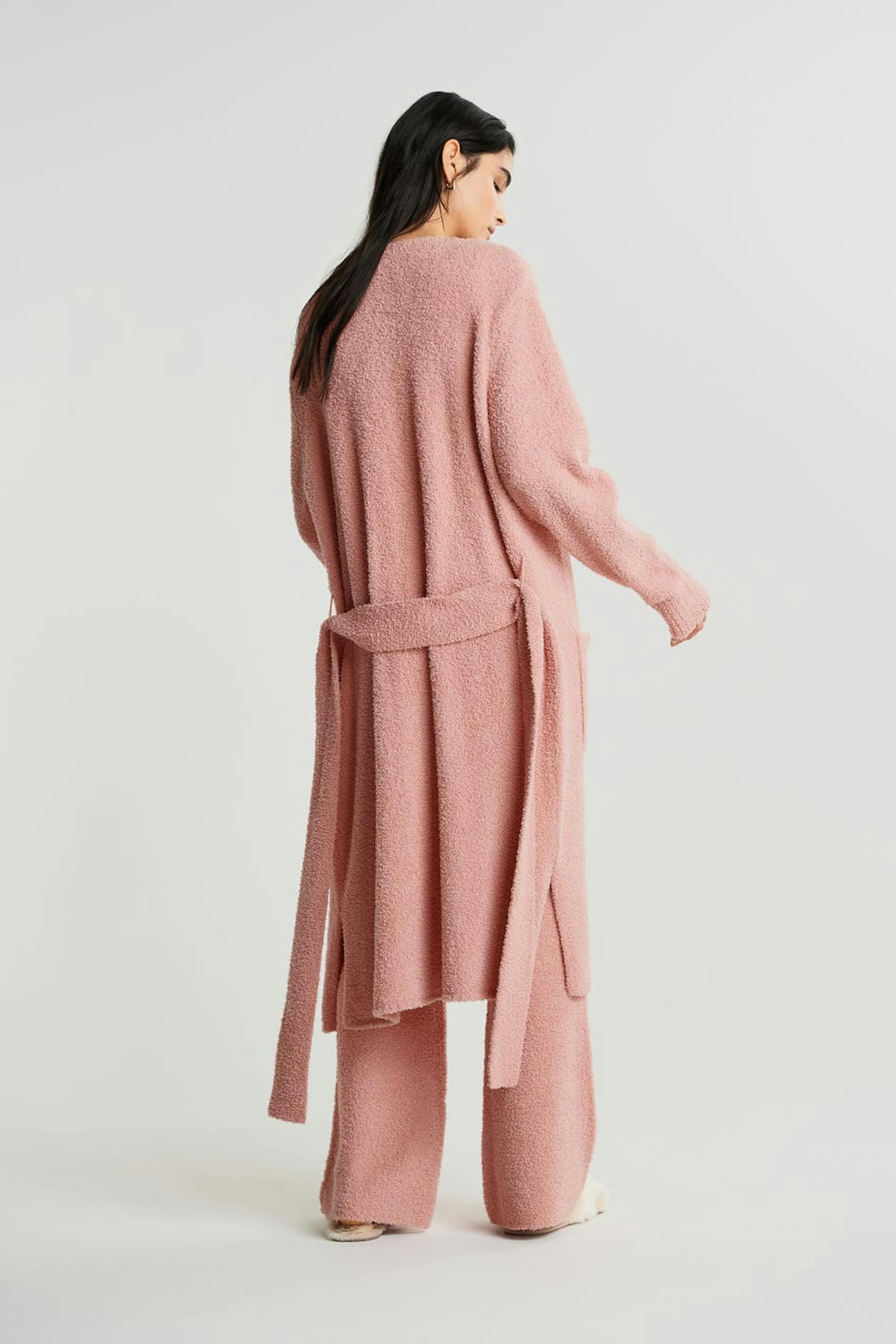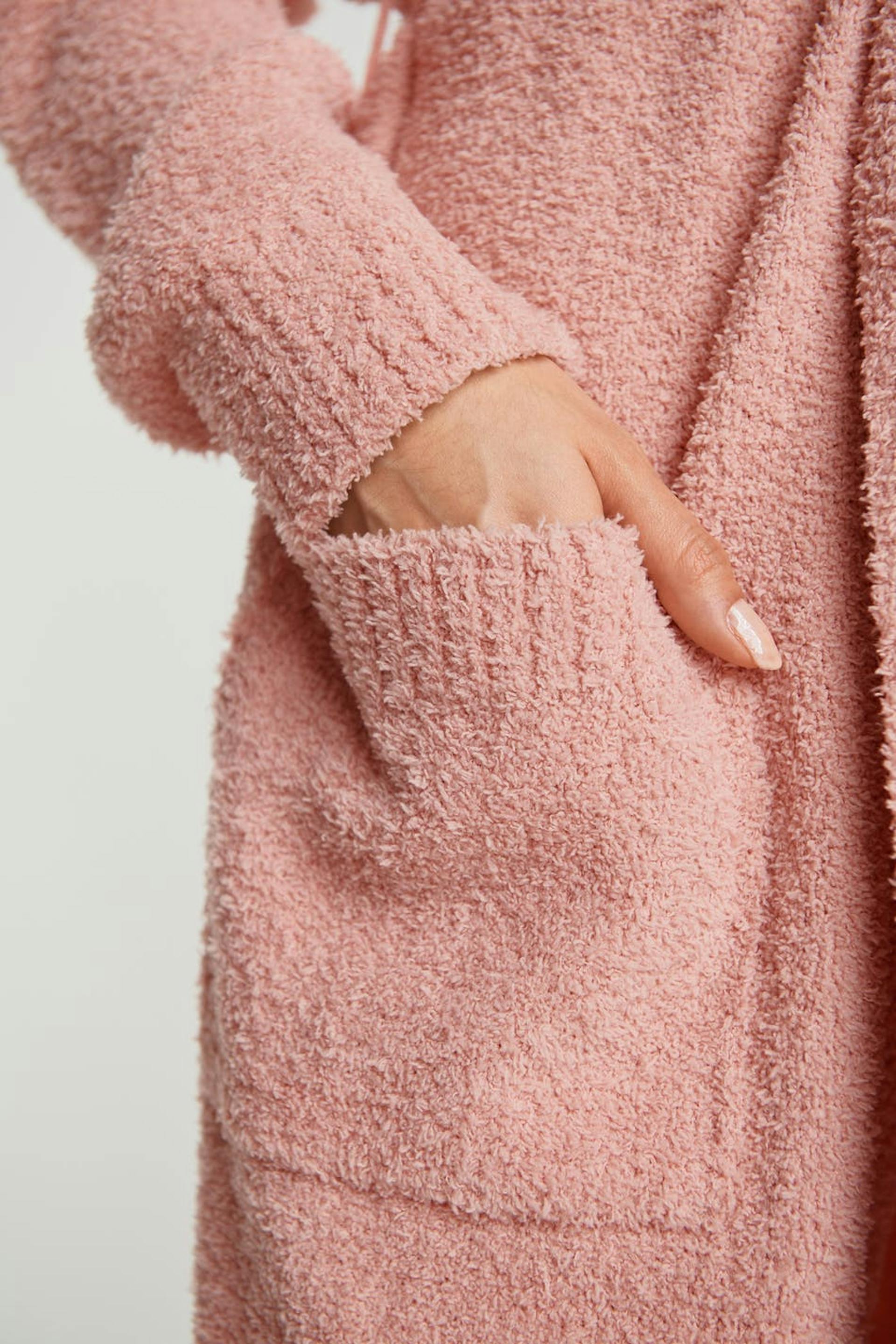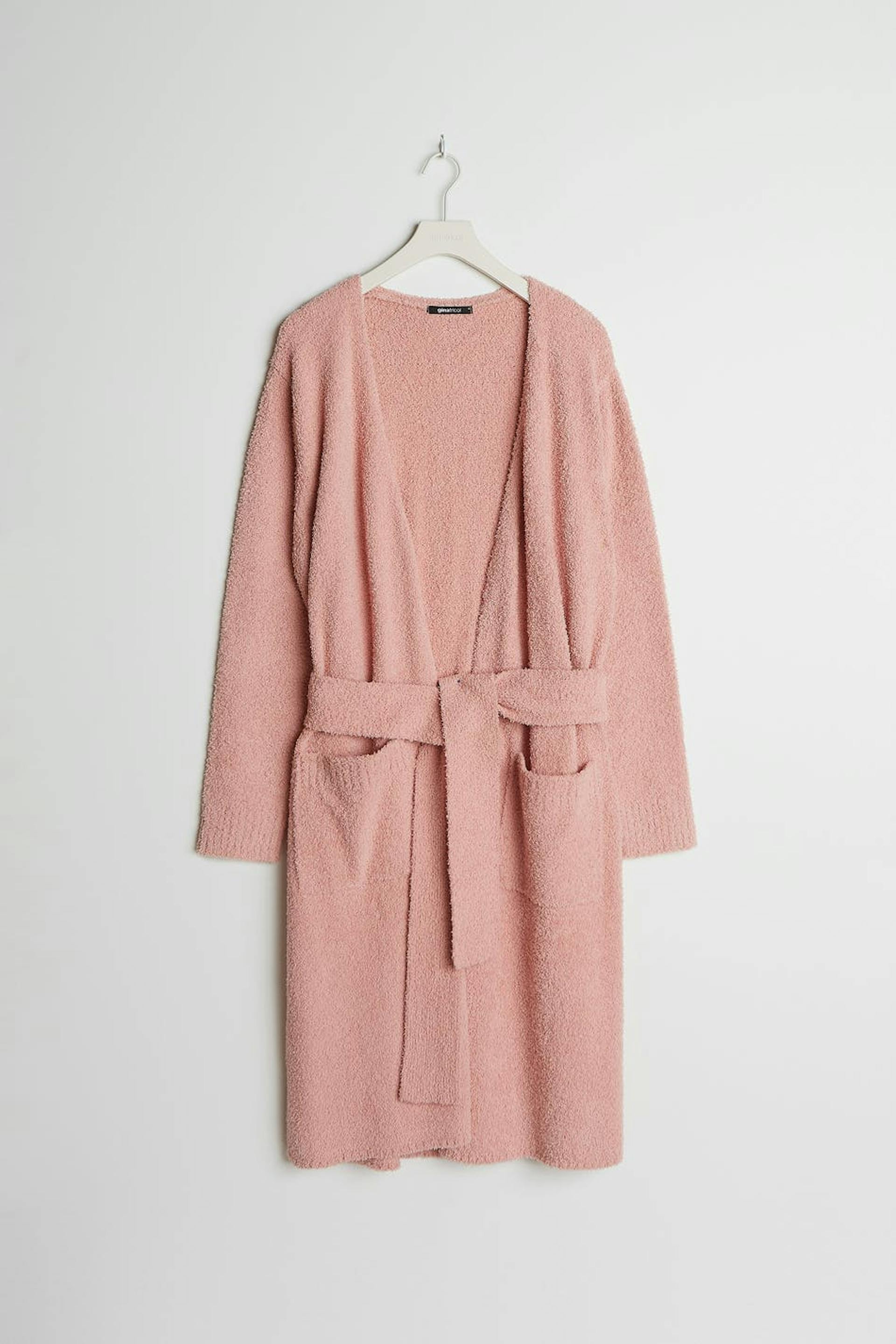 Hyggelig cardigan med lommer ved fronten. Cardiganen er pink, strikket og lang. Den har et bæltespænde ved taljen.