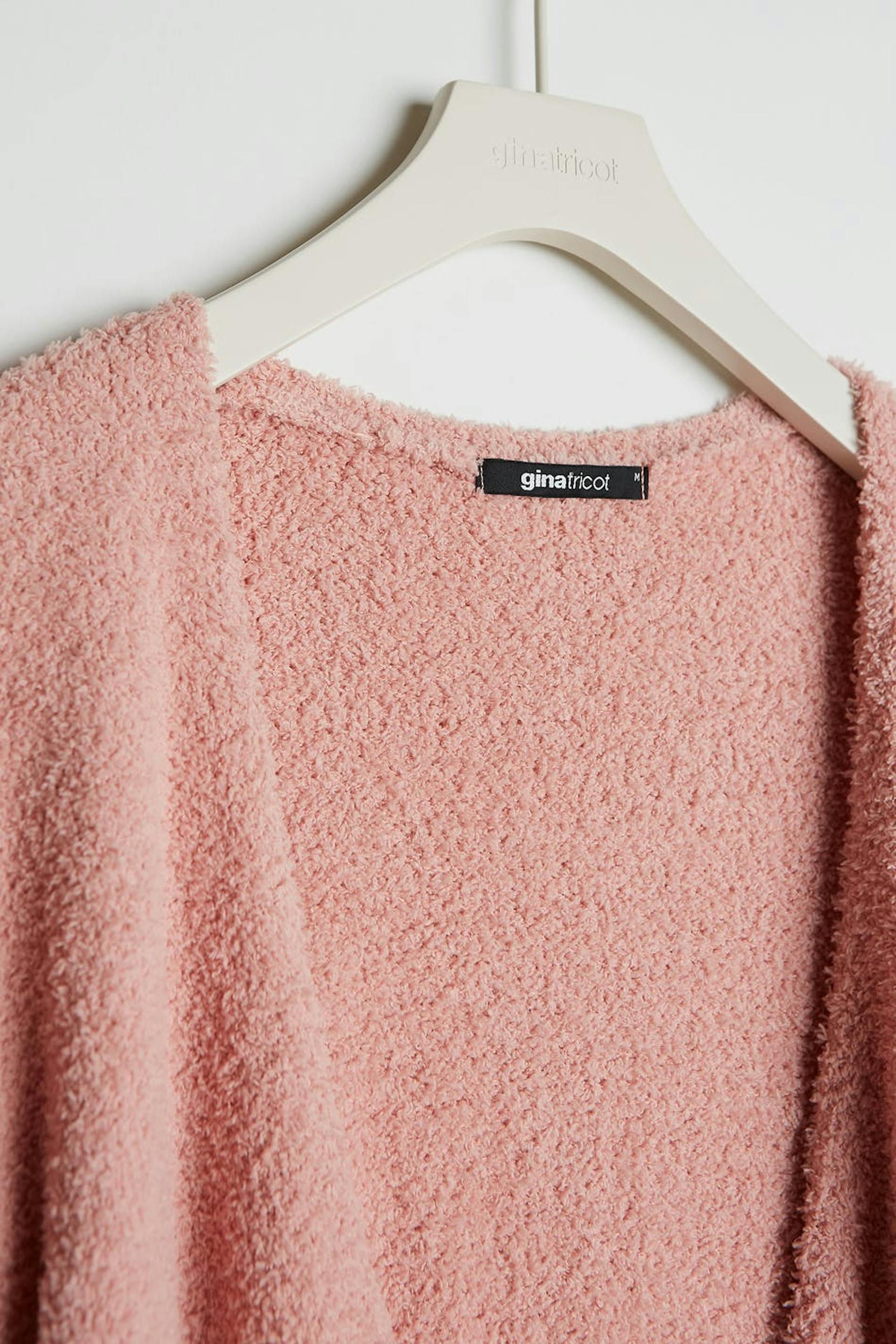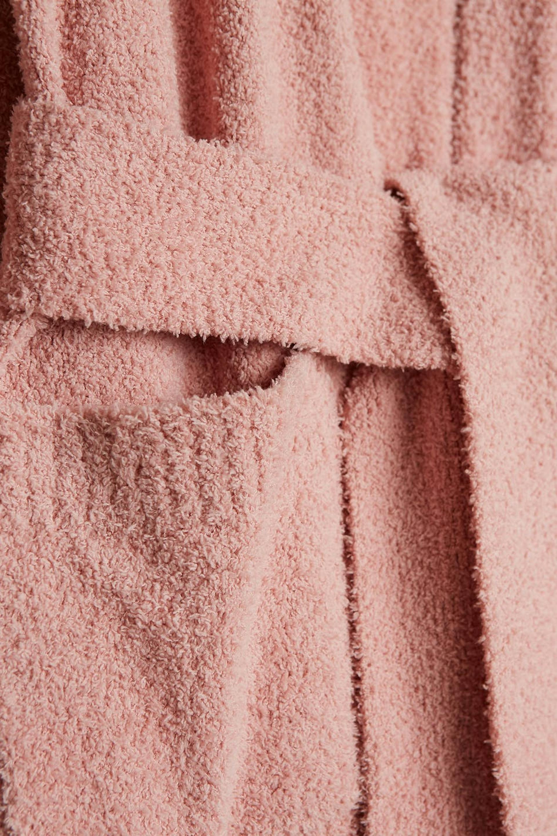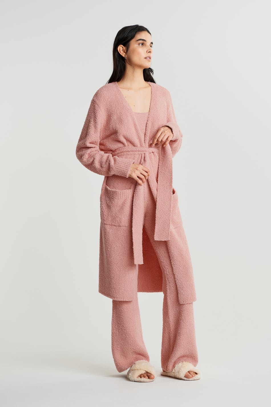 Hyggelig cardigan med lommer ved fronten. Cardiganen er pink, strikket og lang. Den har et bæltespænde ved taljen.