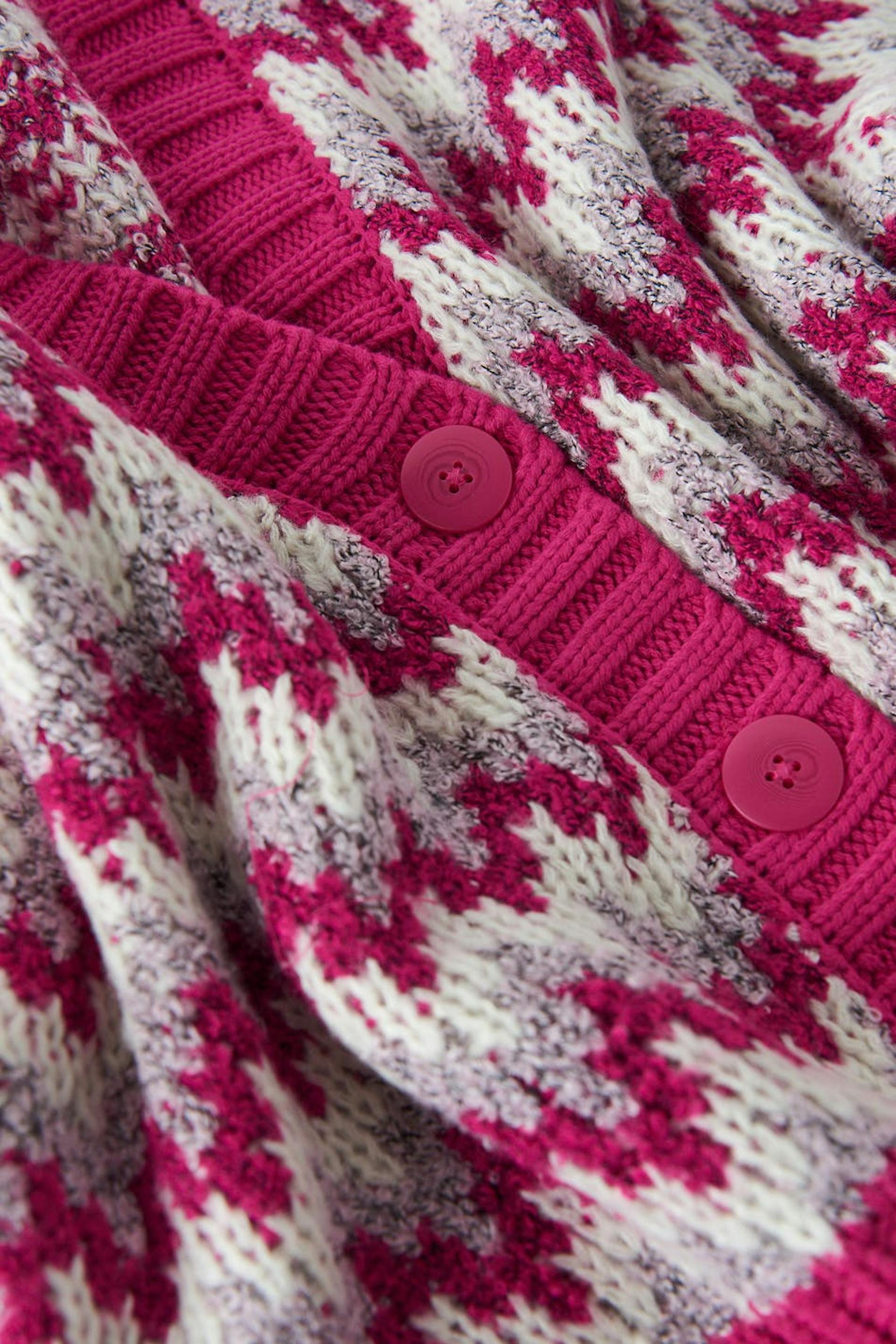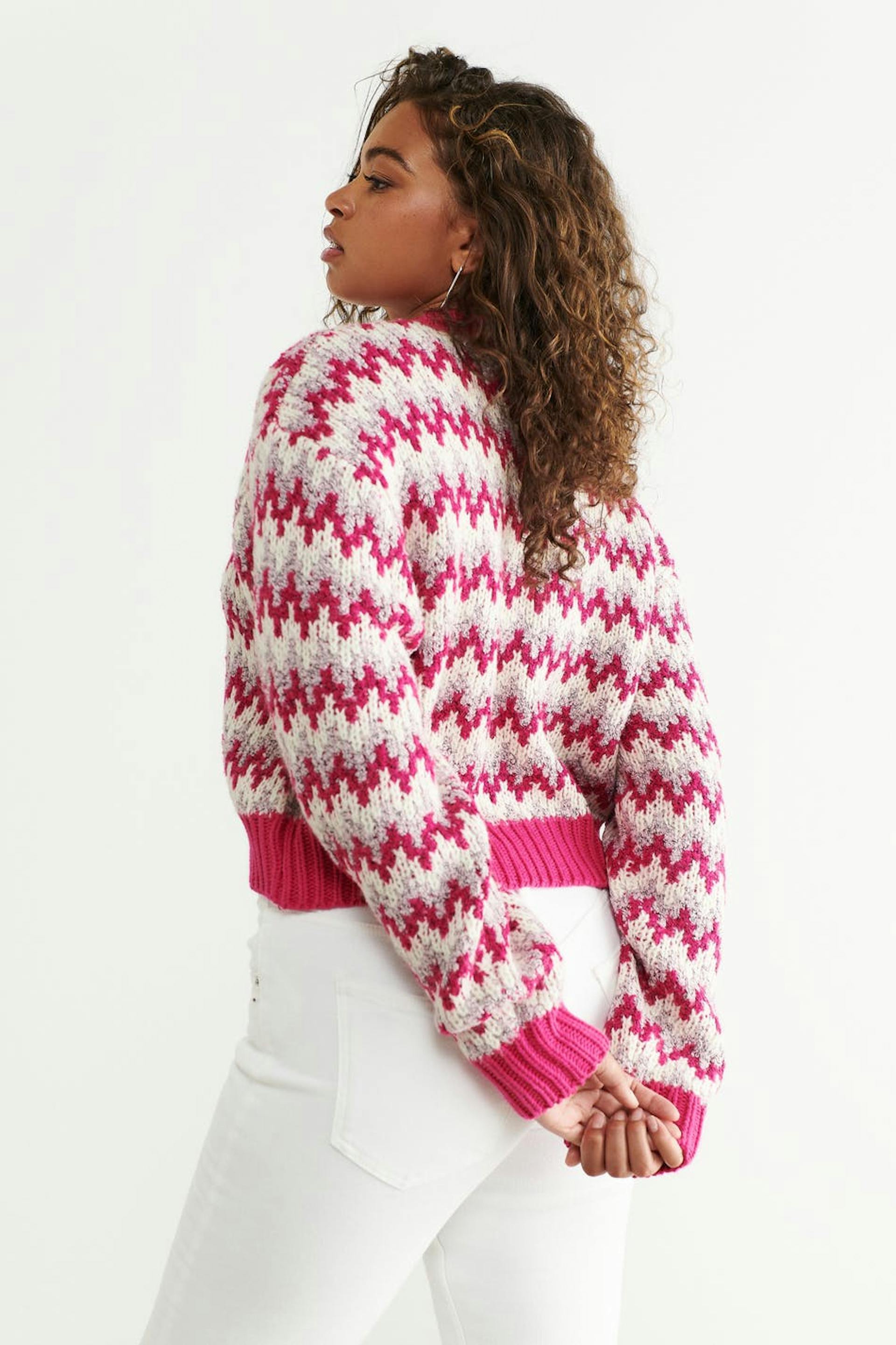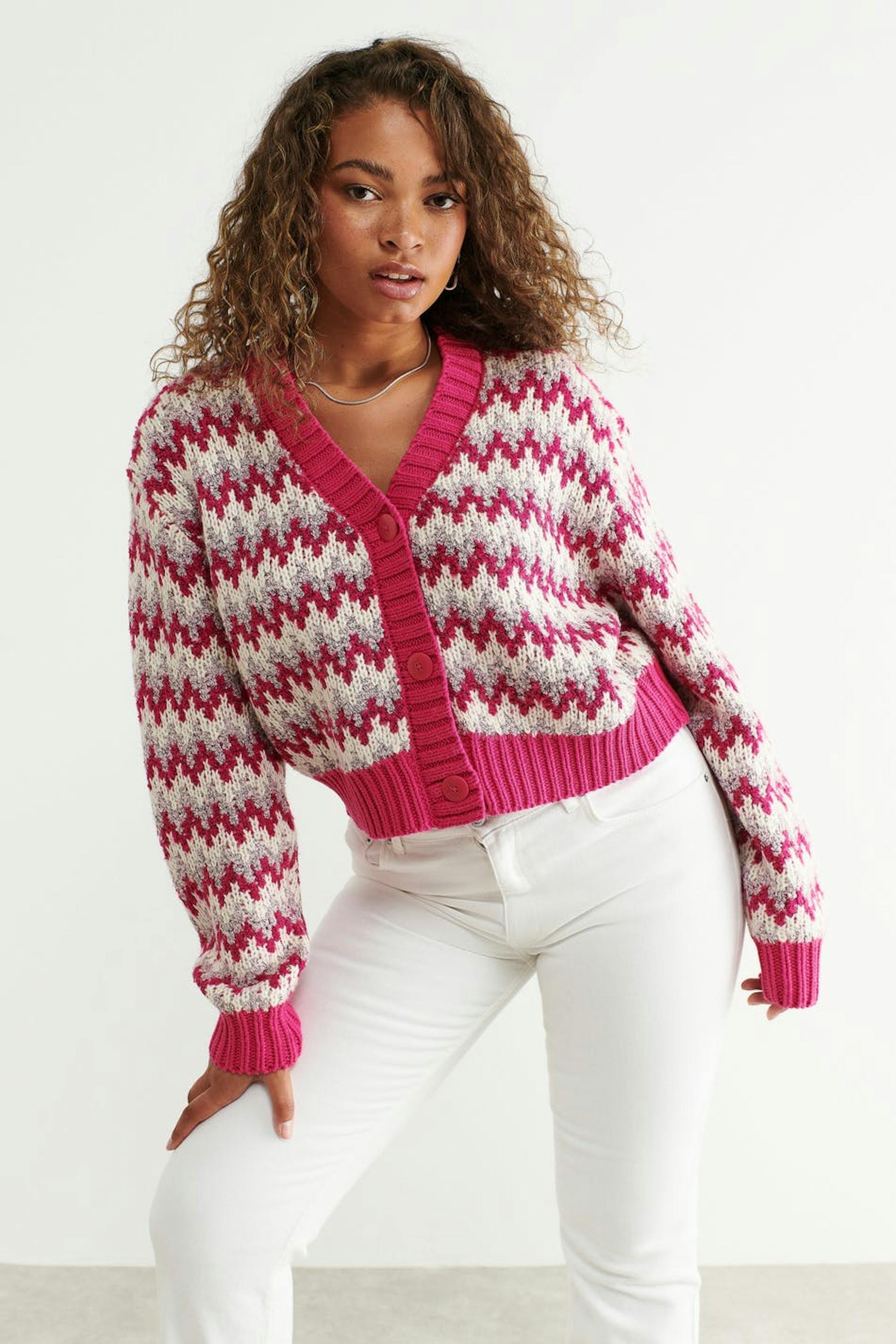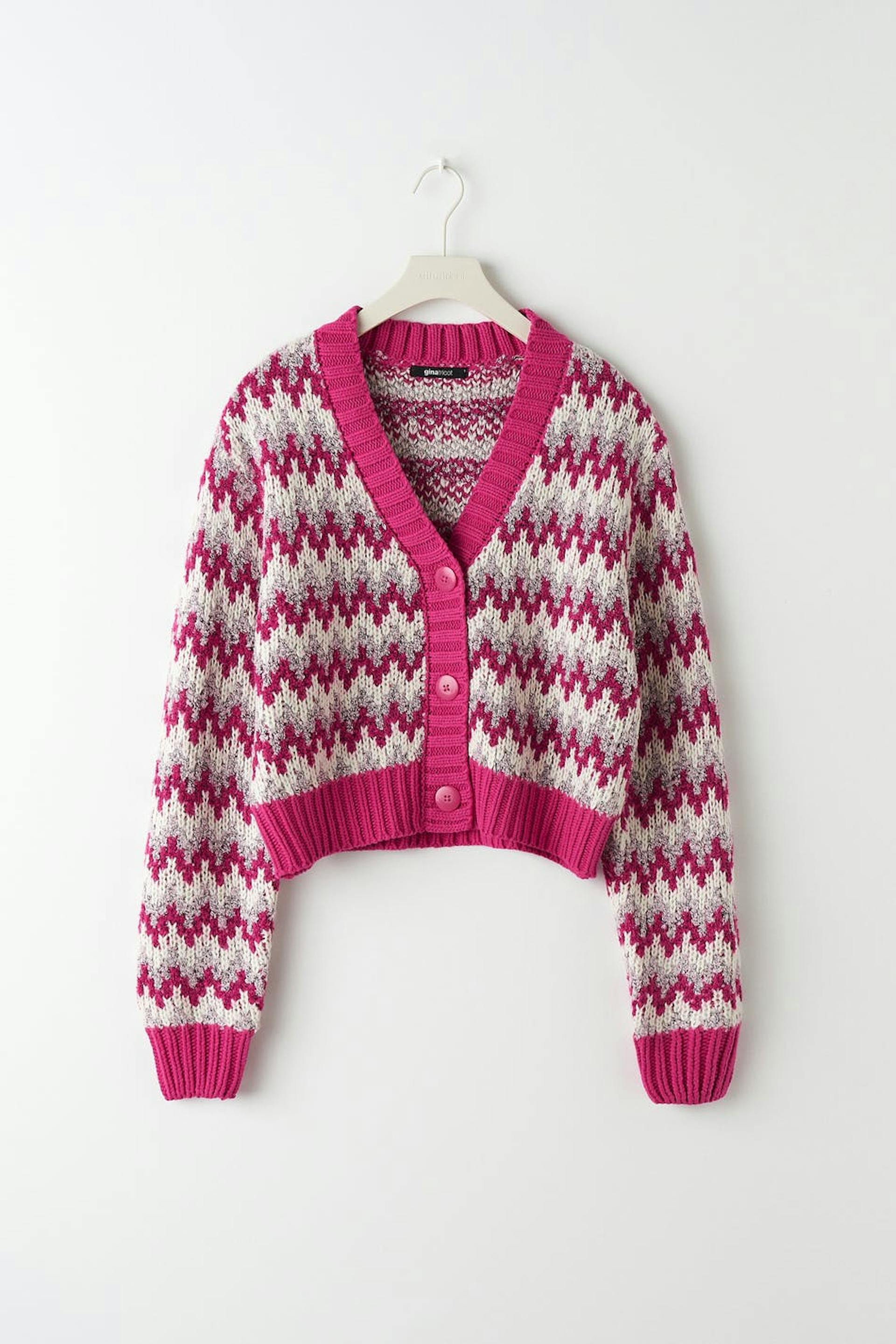 Strikket cardigan med boxy pasform. Cardiganen er pink og har knapstolpe foran. Den har v-udskæring og en croppet længde.