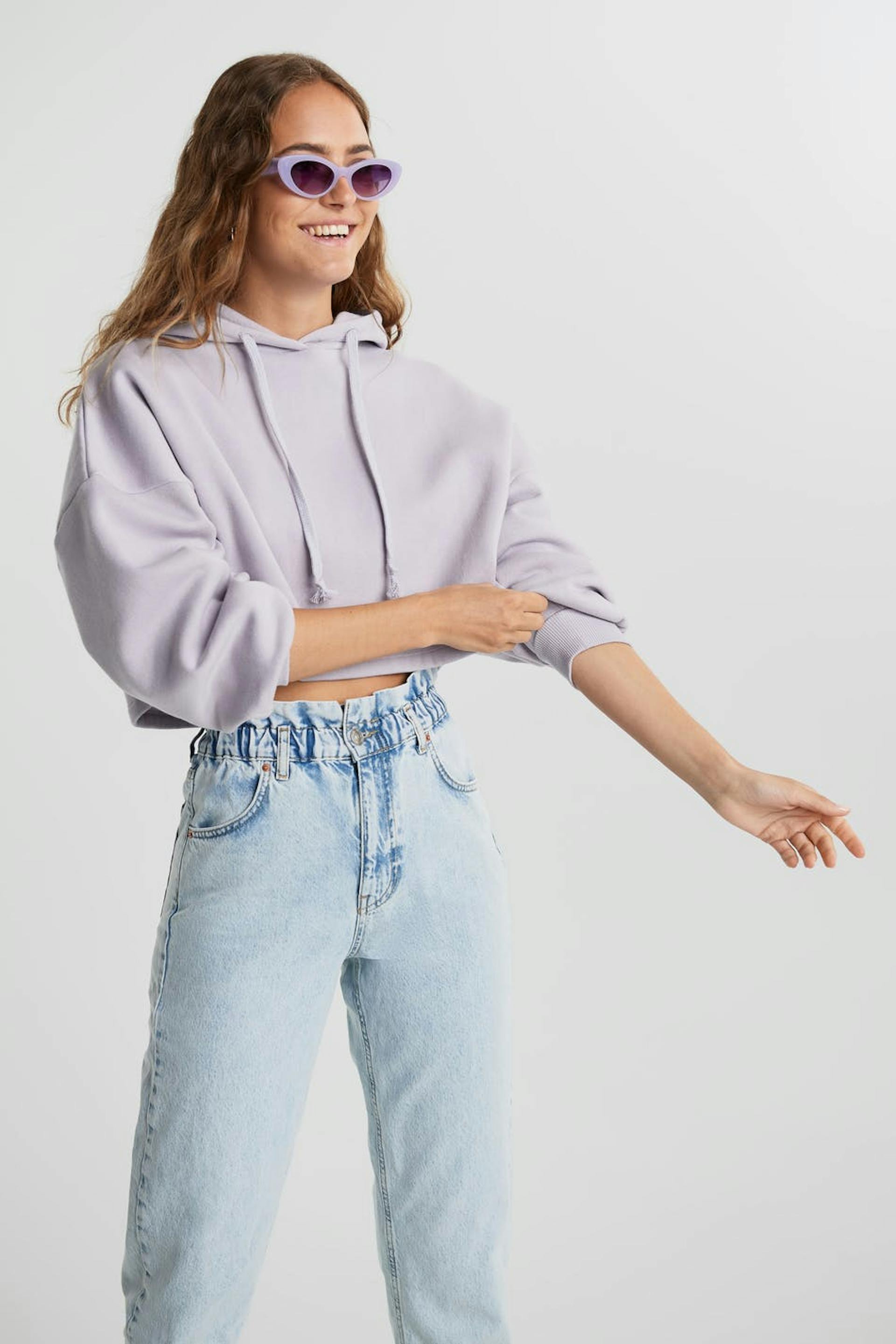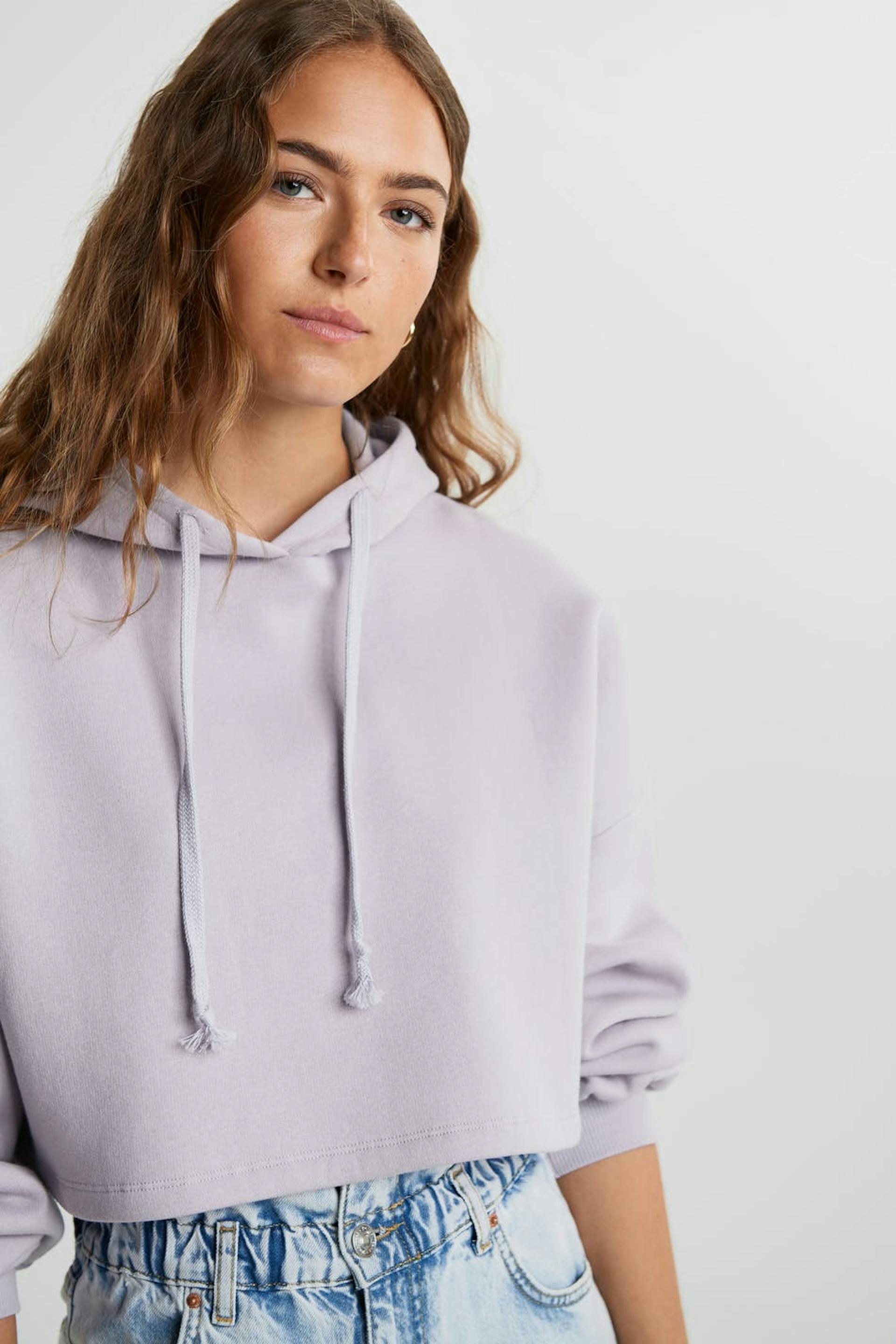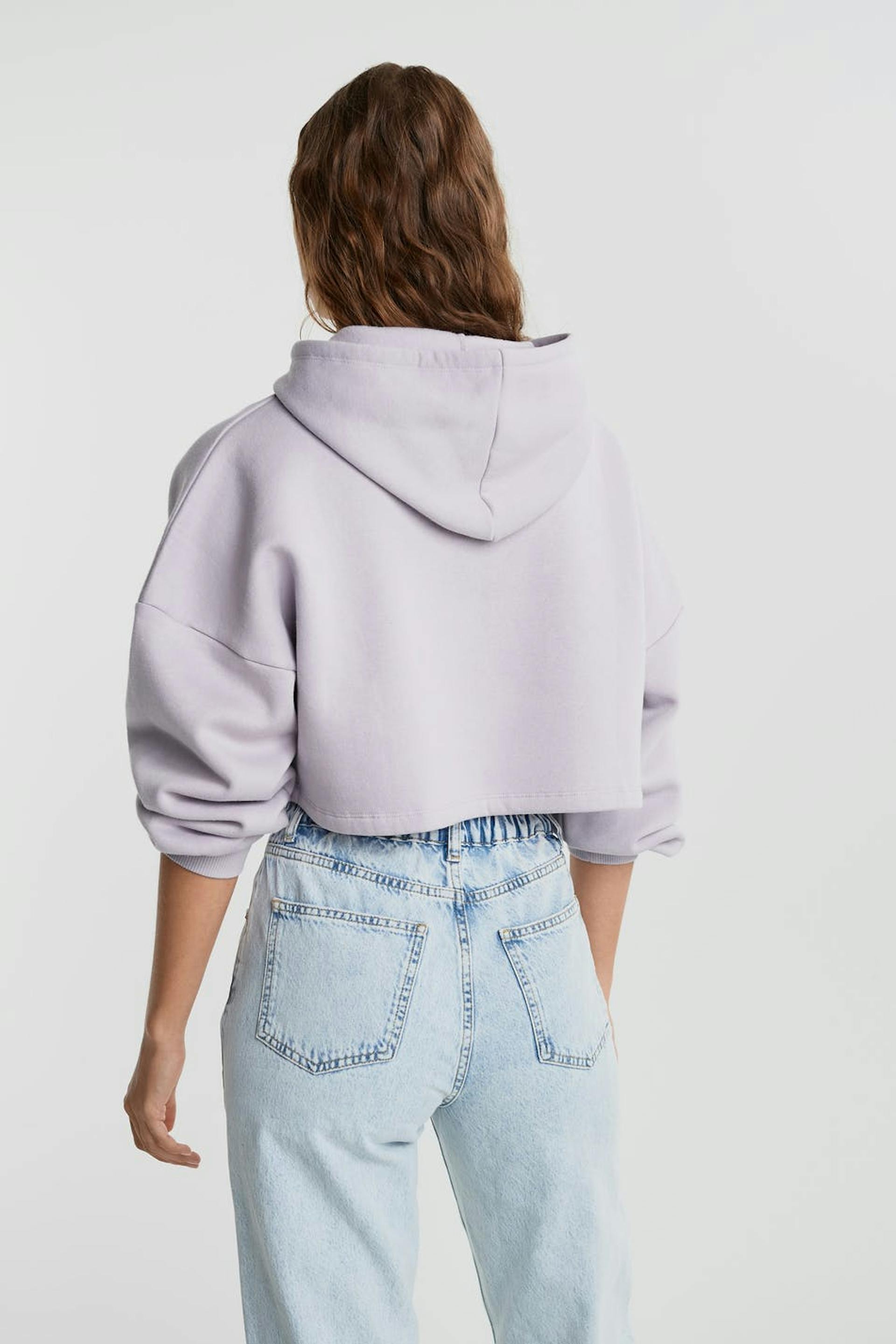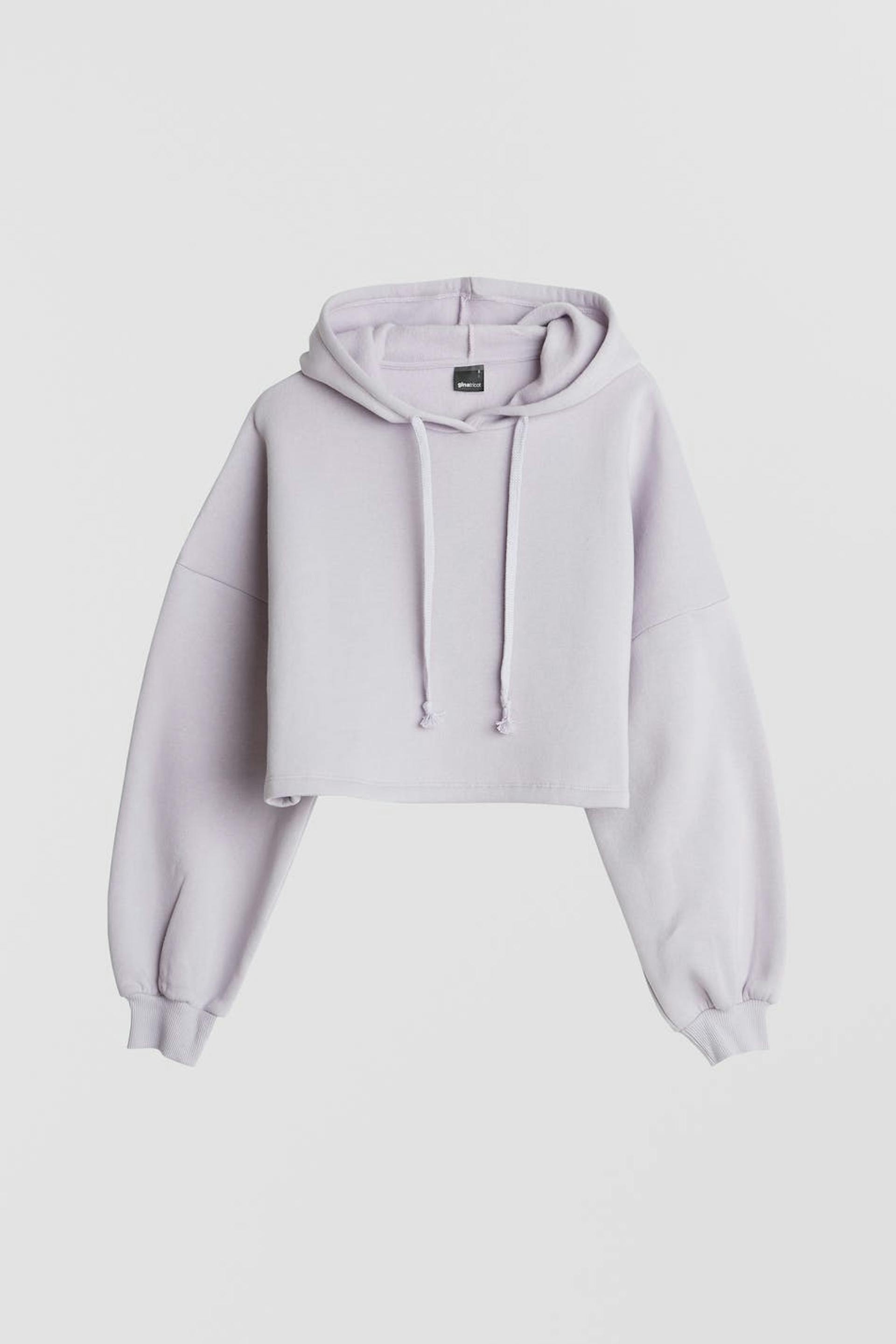 Kort hættetrøje med en generøs pasform. Hættetrøjen er lilla og har hætte med snøring. Den har en ribmanchet på ærmeafslutningerne.