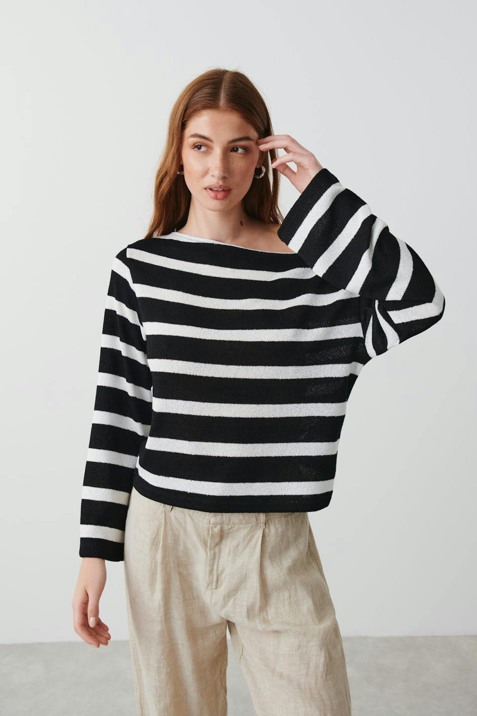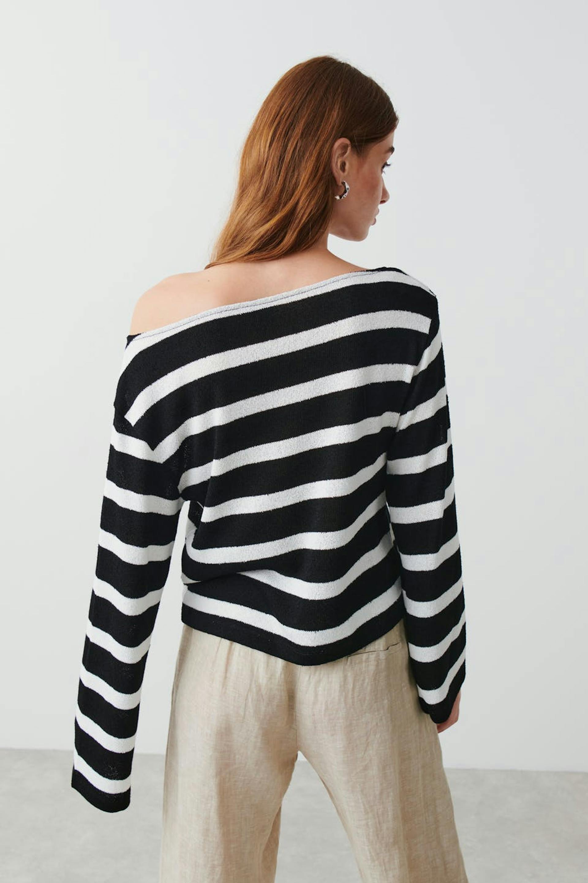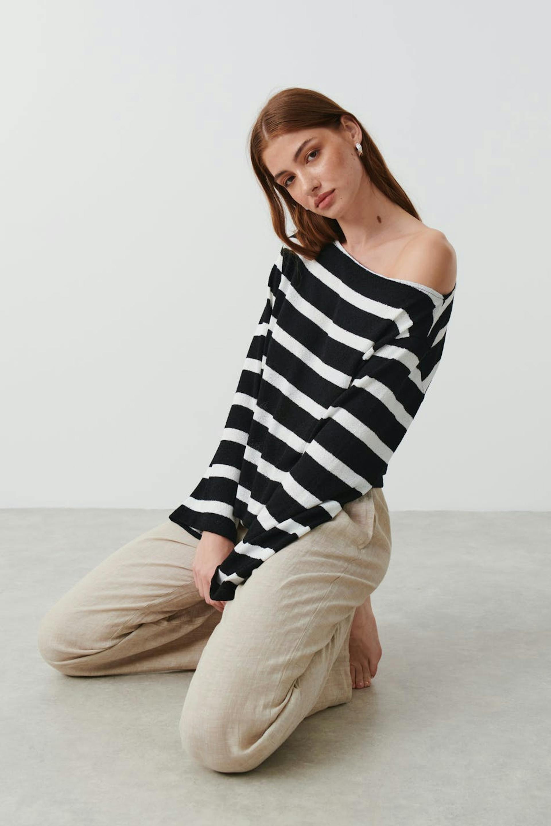 Stribet trøje i jersey med oversize pasform. Trøjen er sort og har bådudringning. Den har lanterneærmer og lave skuldre.