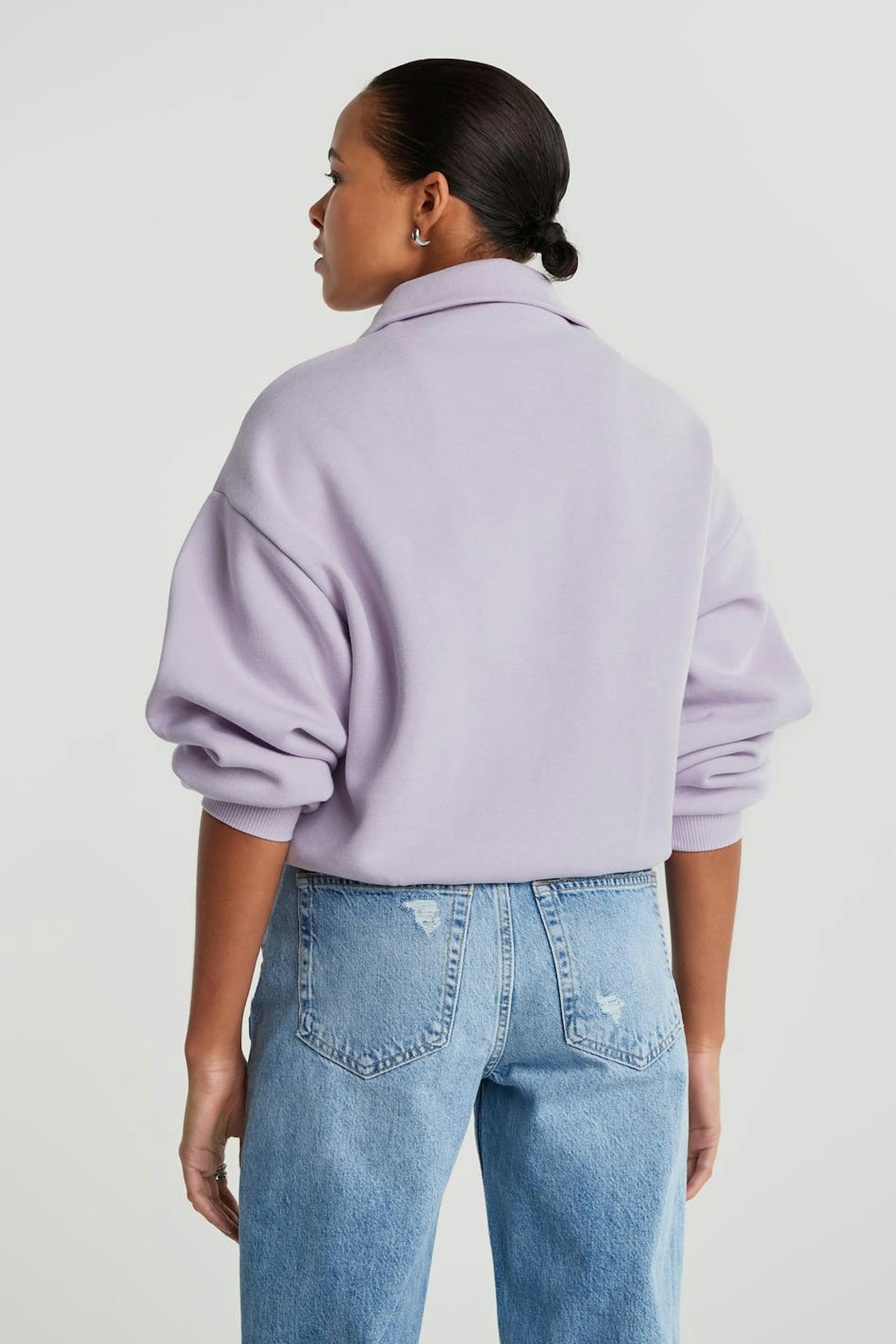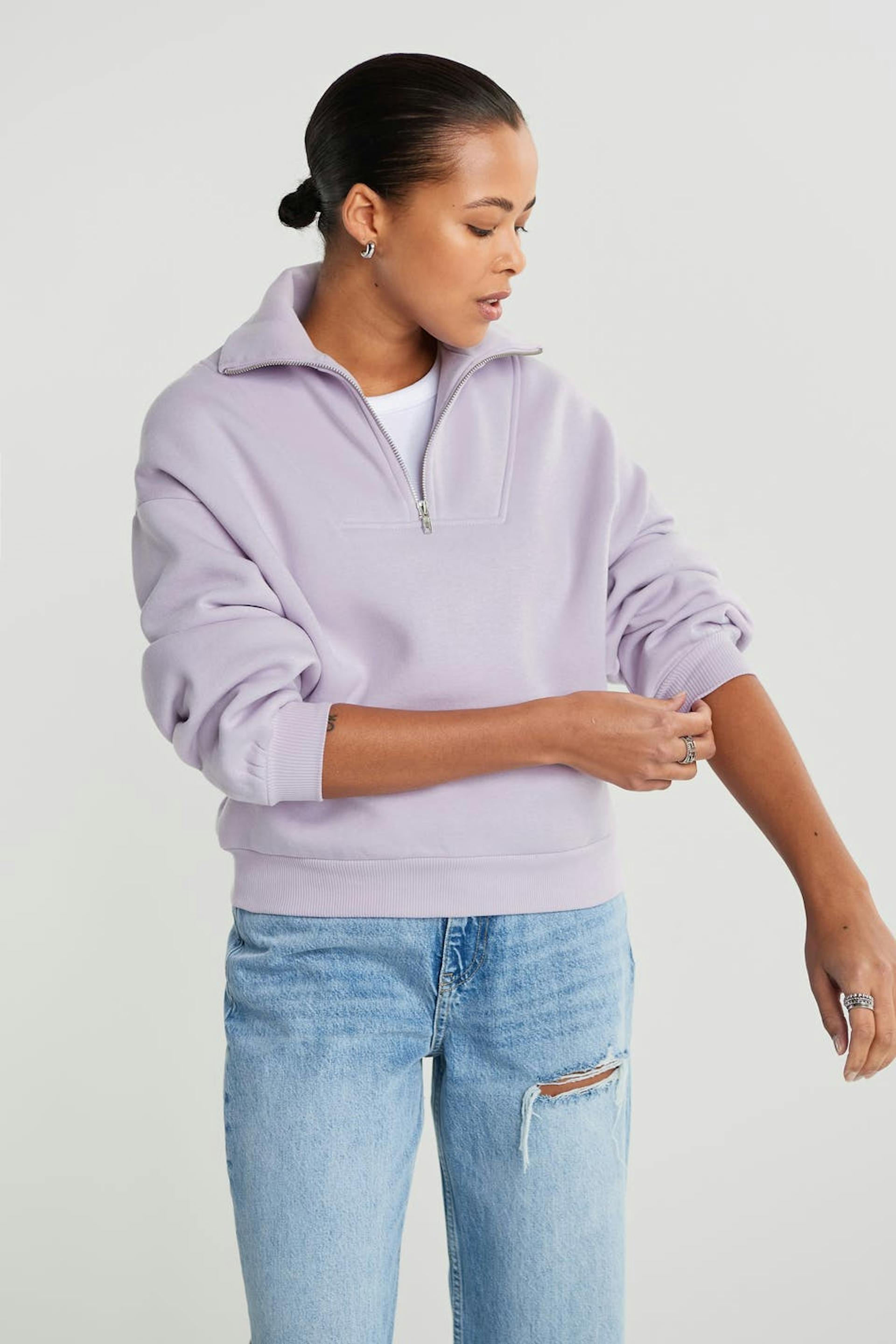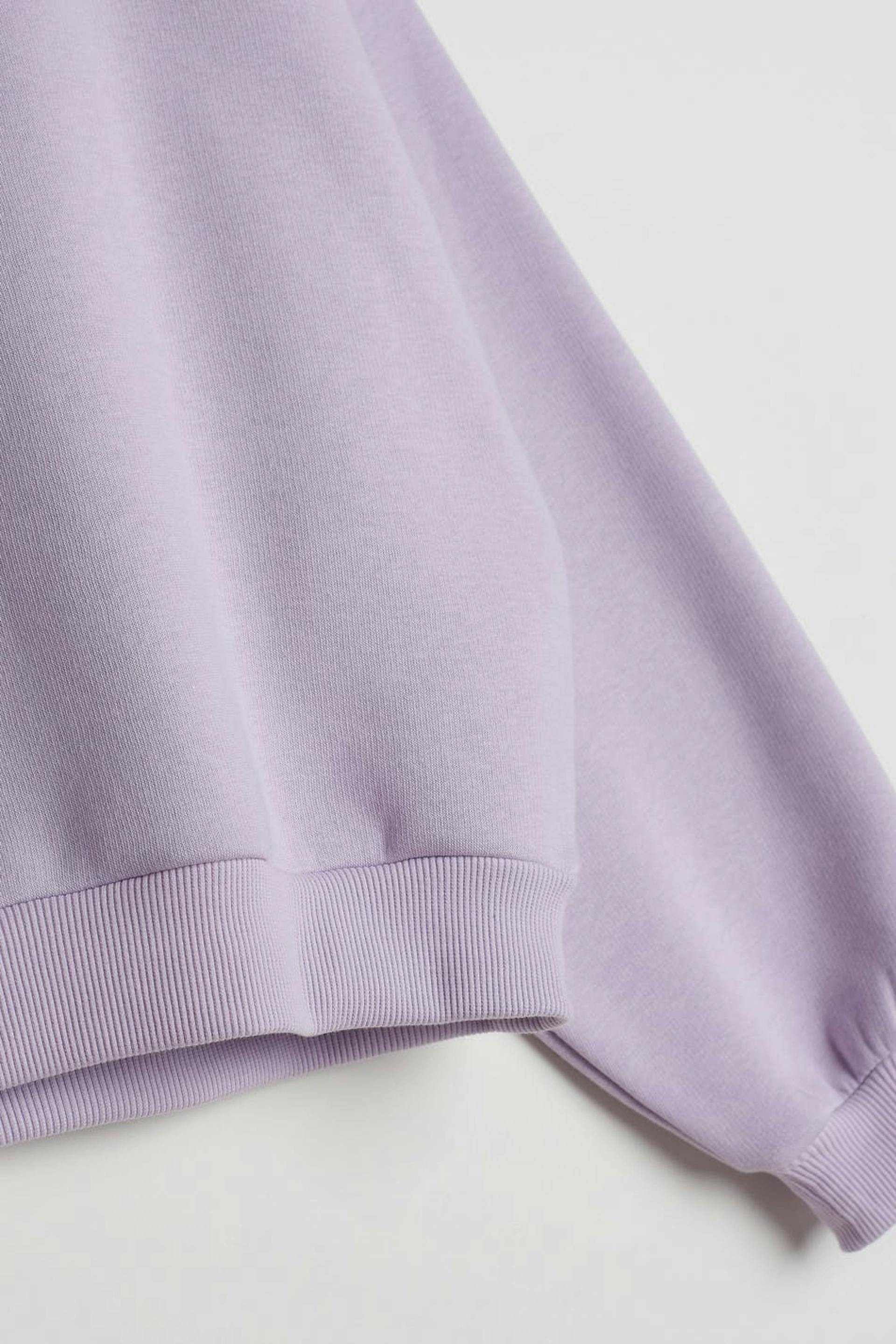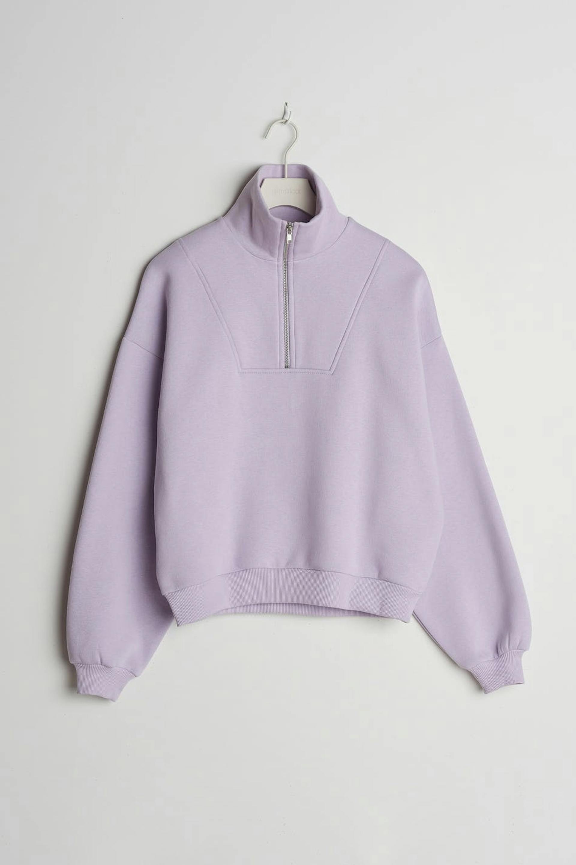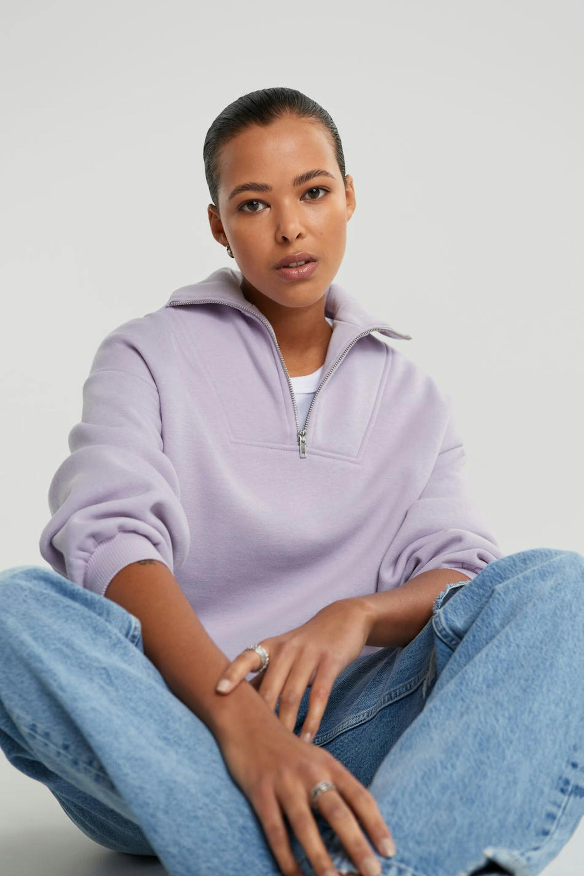Croppet trøje med en oversize pasform. Trøjen er lilla og har en lynlås til halsen. Den er fremstillet af jersey.