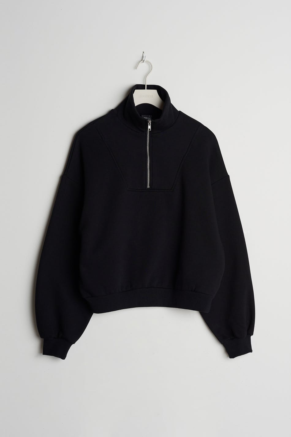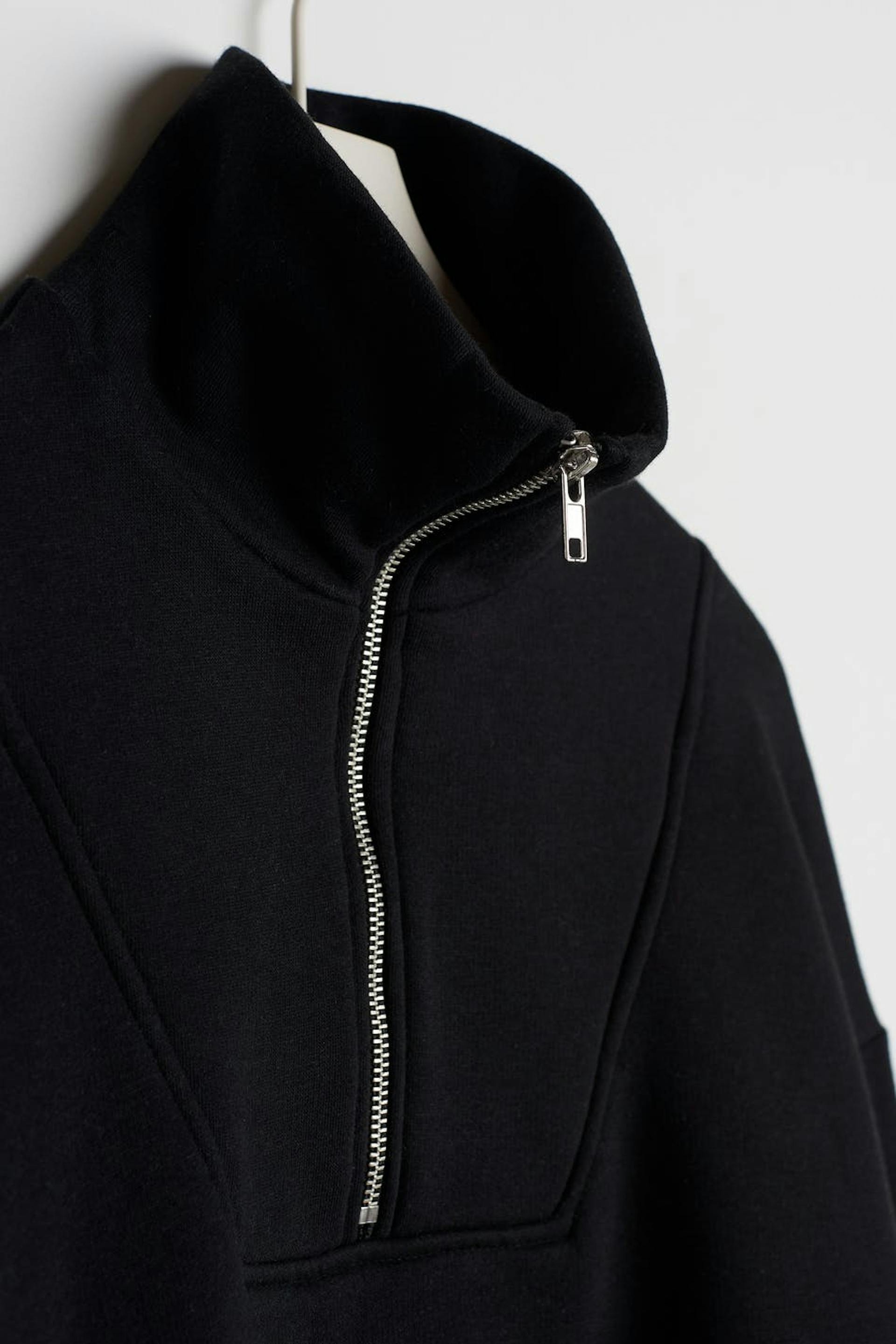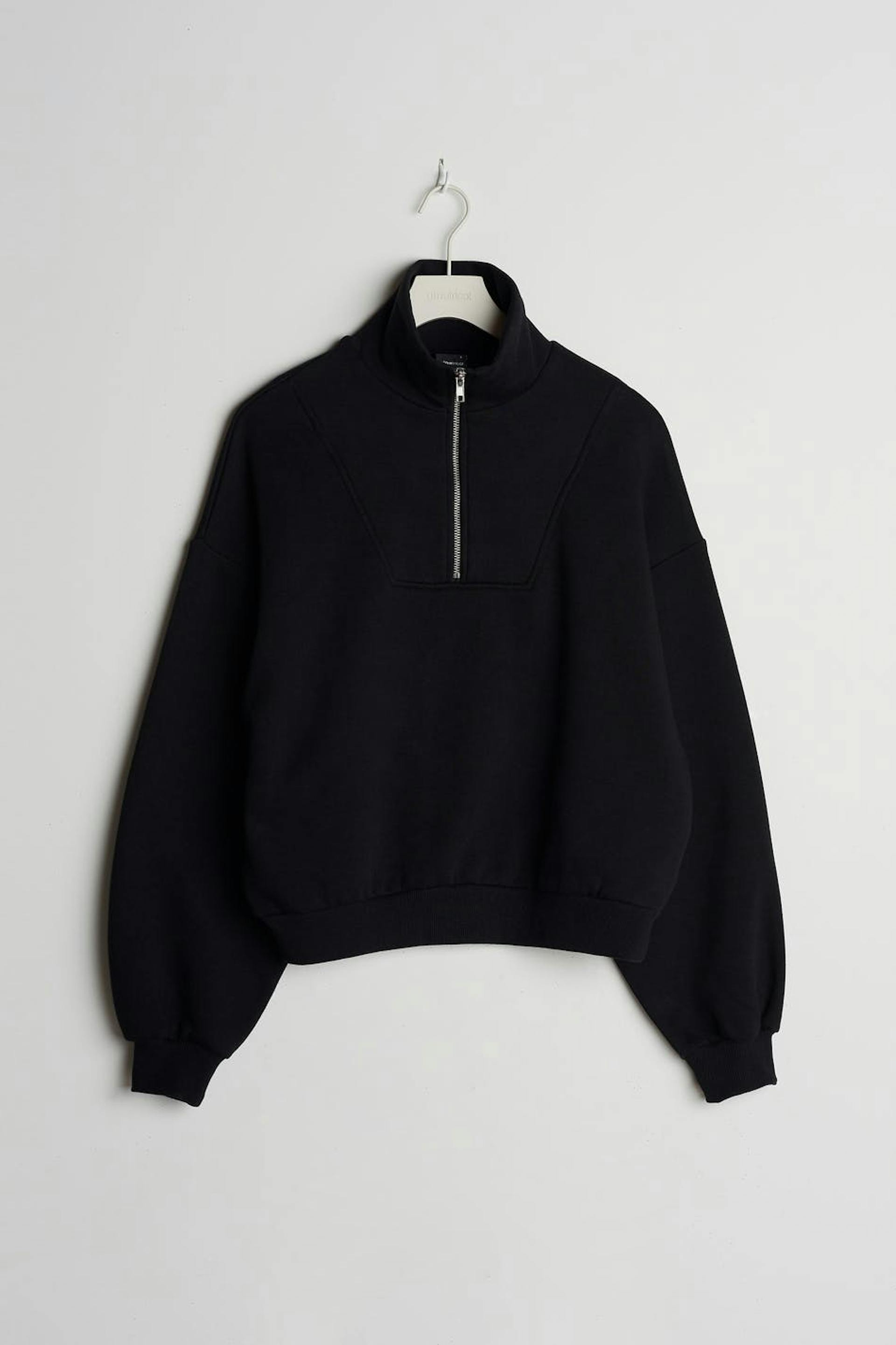 Croppet trøje med en oversize pasform. Trøjen er sort og har en lynlås til halsen.