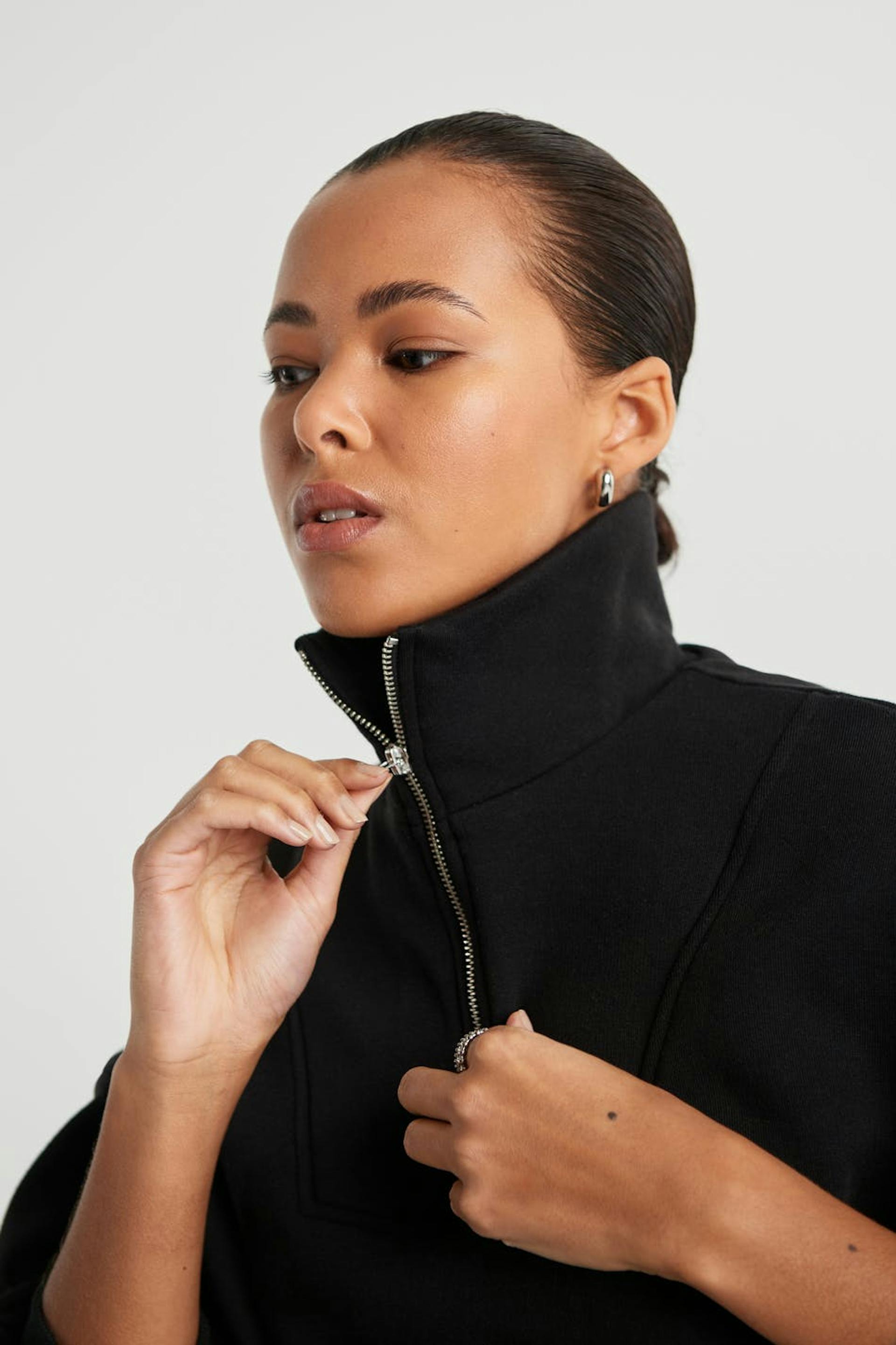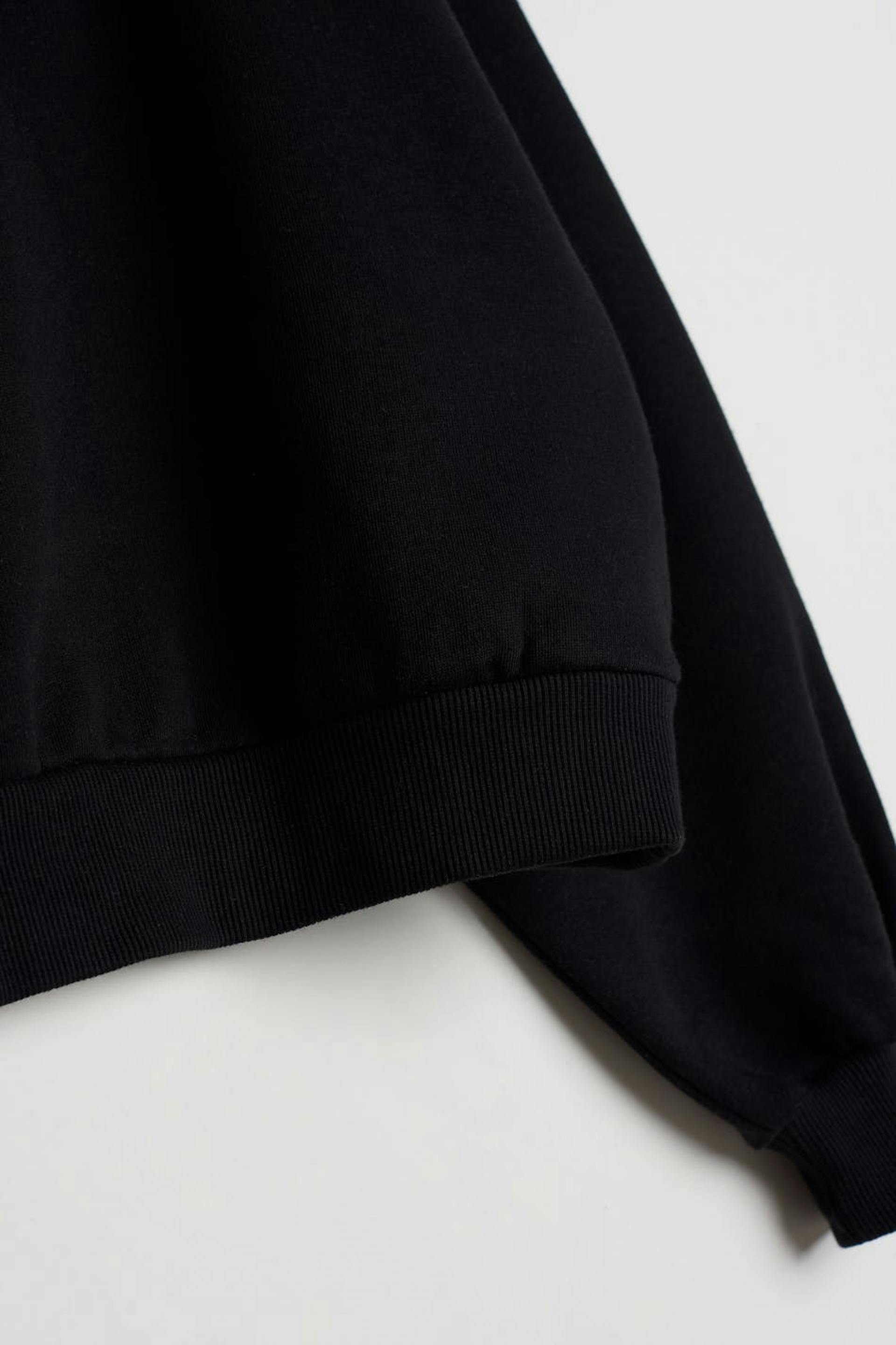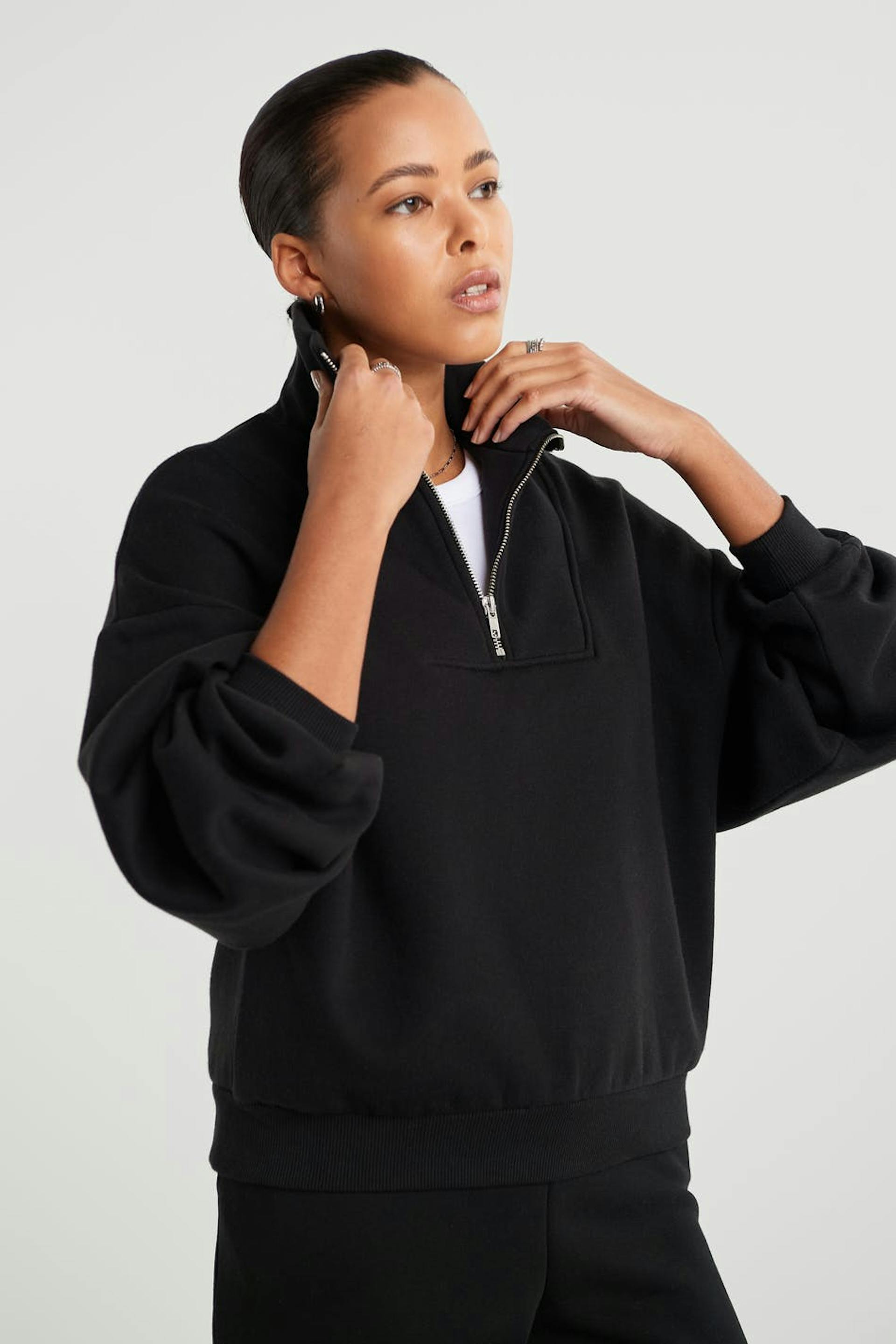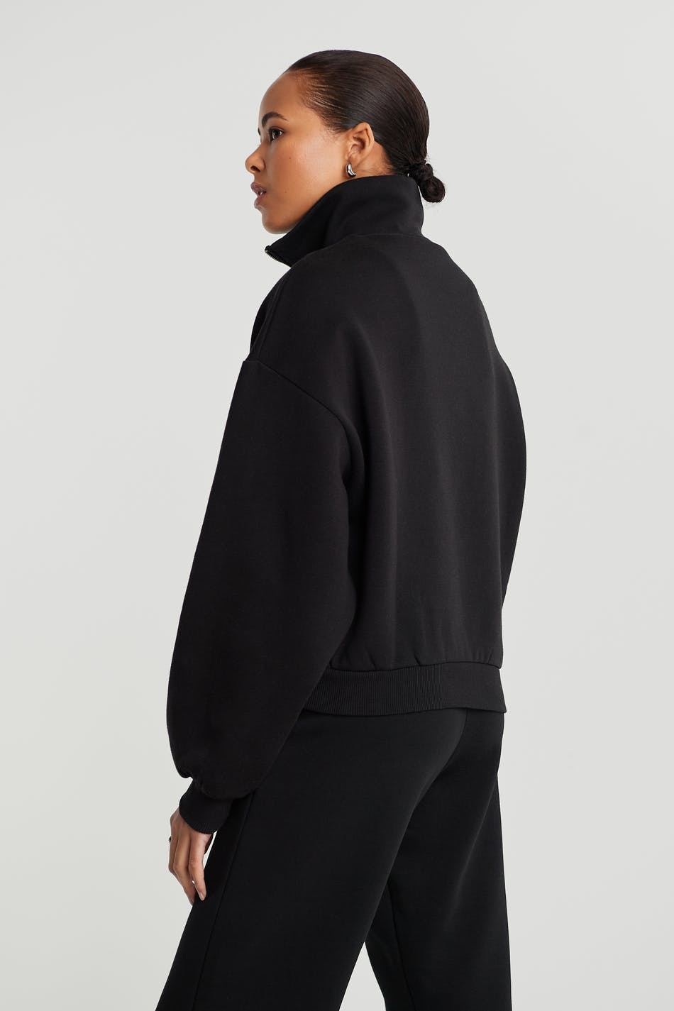Croppet trøje med en oversize pasform. Trøjen er sort og har en lynlås til halsen.