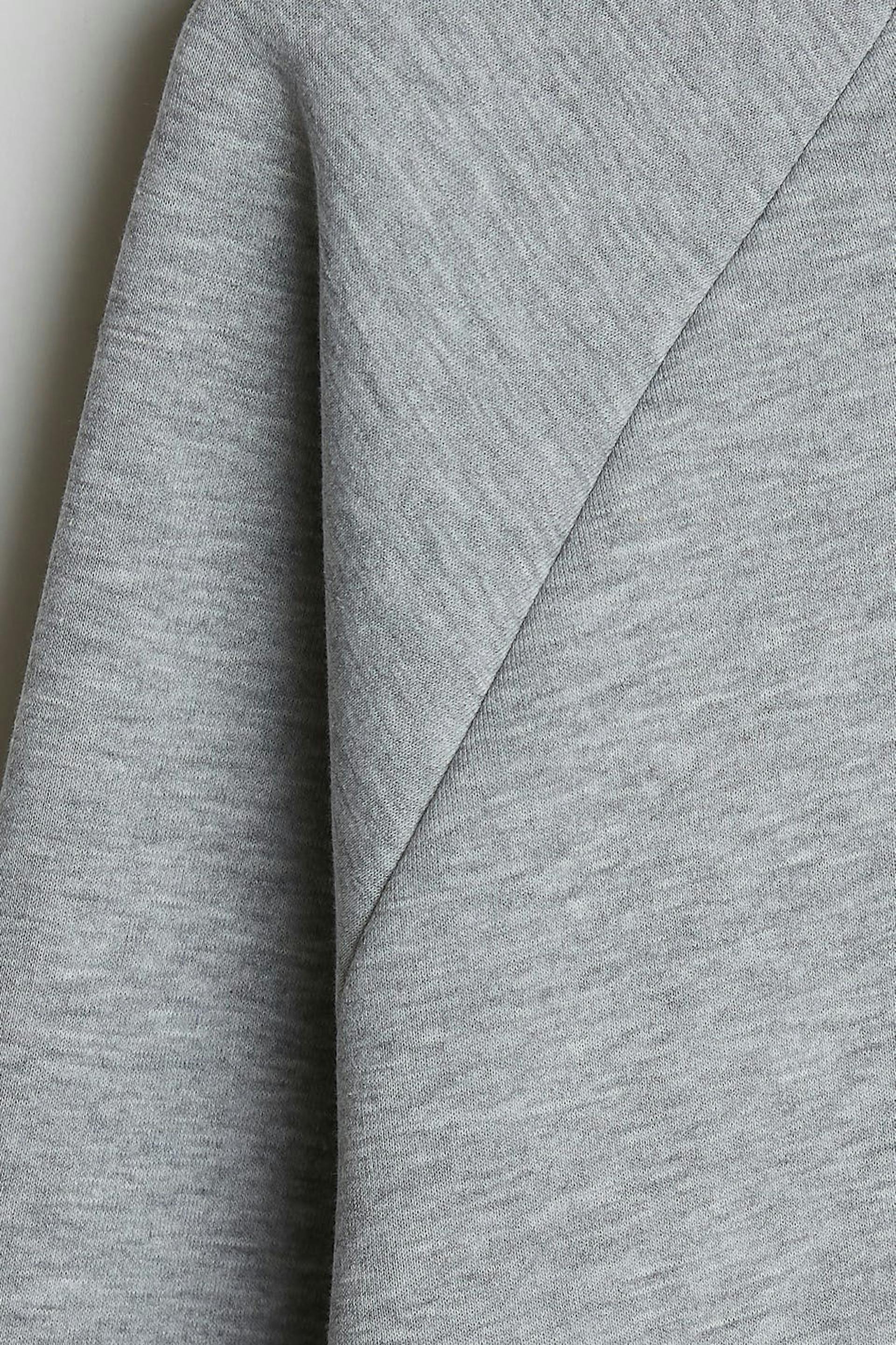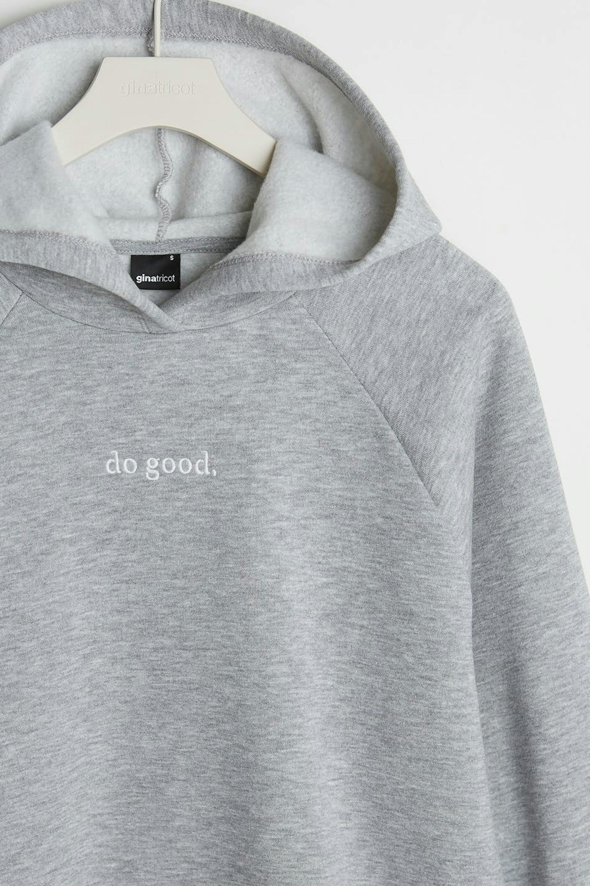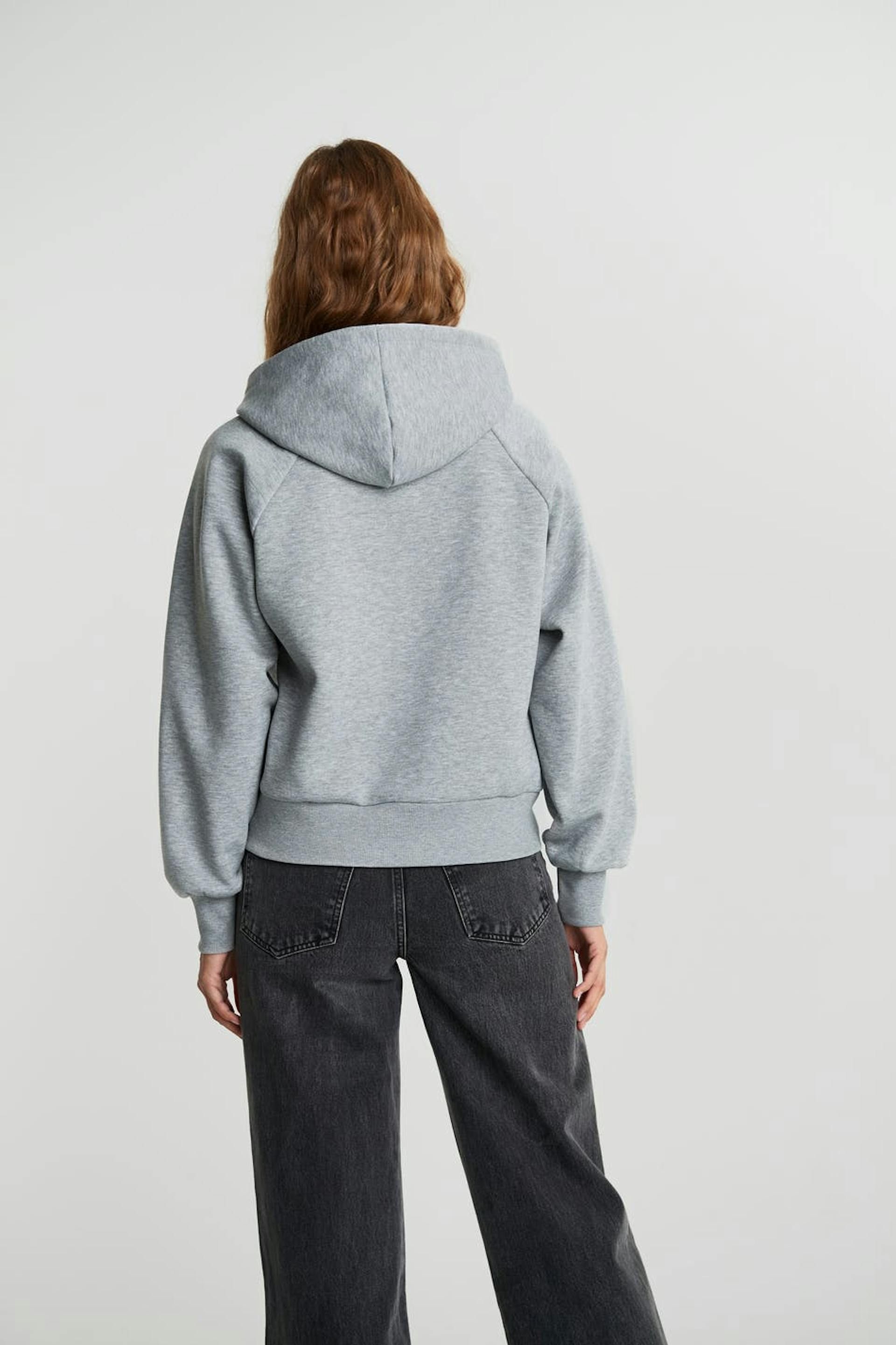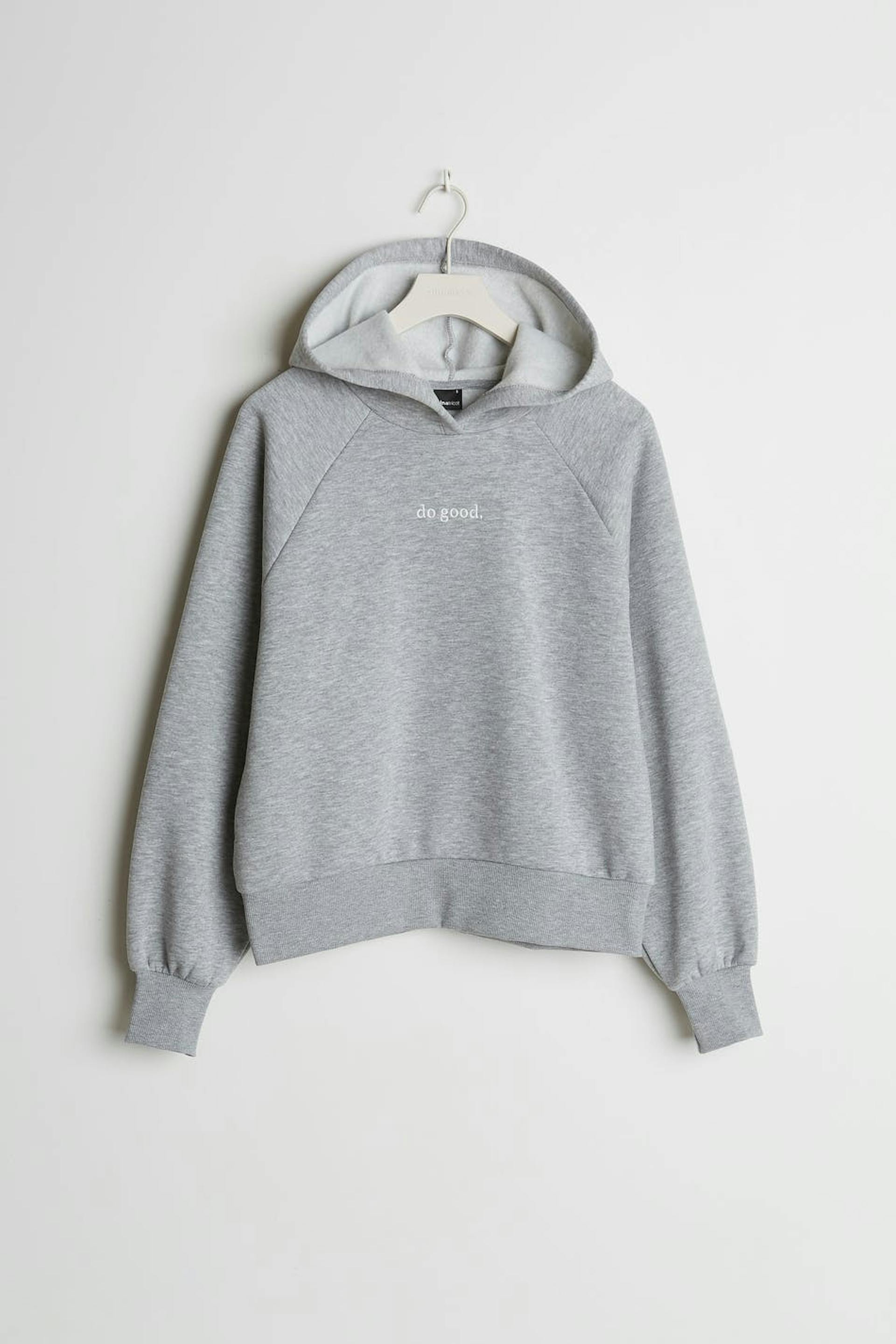 Hættetrøje med en generøs pasform. Hættetrøjen er grå og har en hætte. Den har et tryk på forsiden og et elastisk bånd på ærmeafslutningerne og ved sømmen.