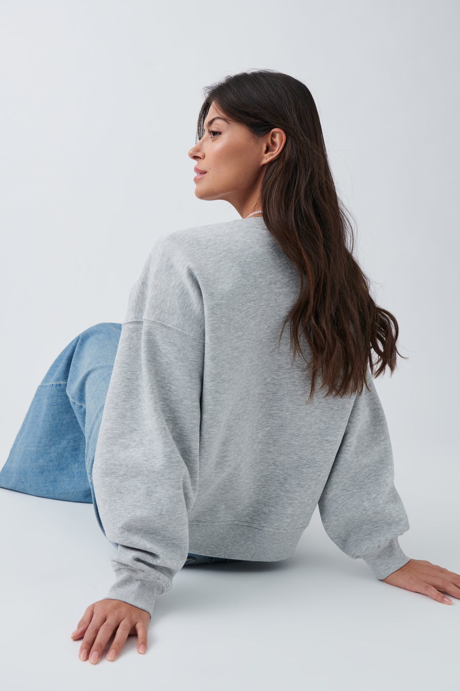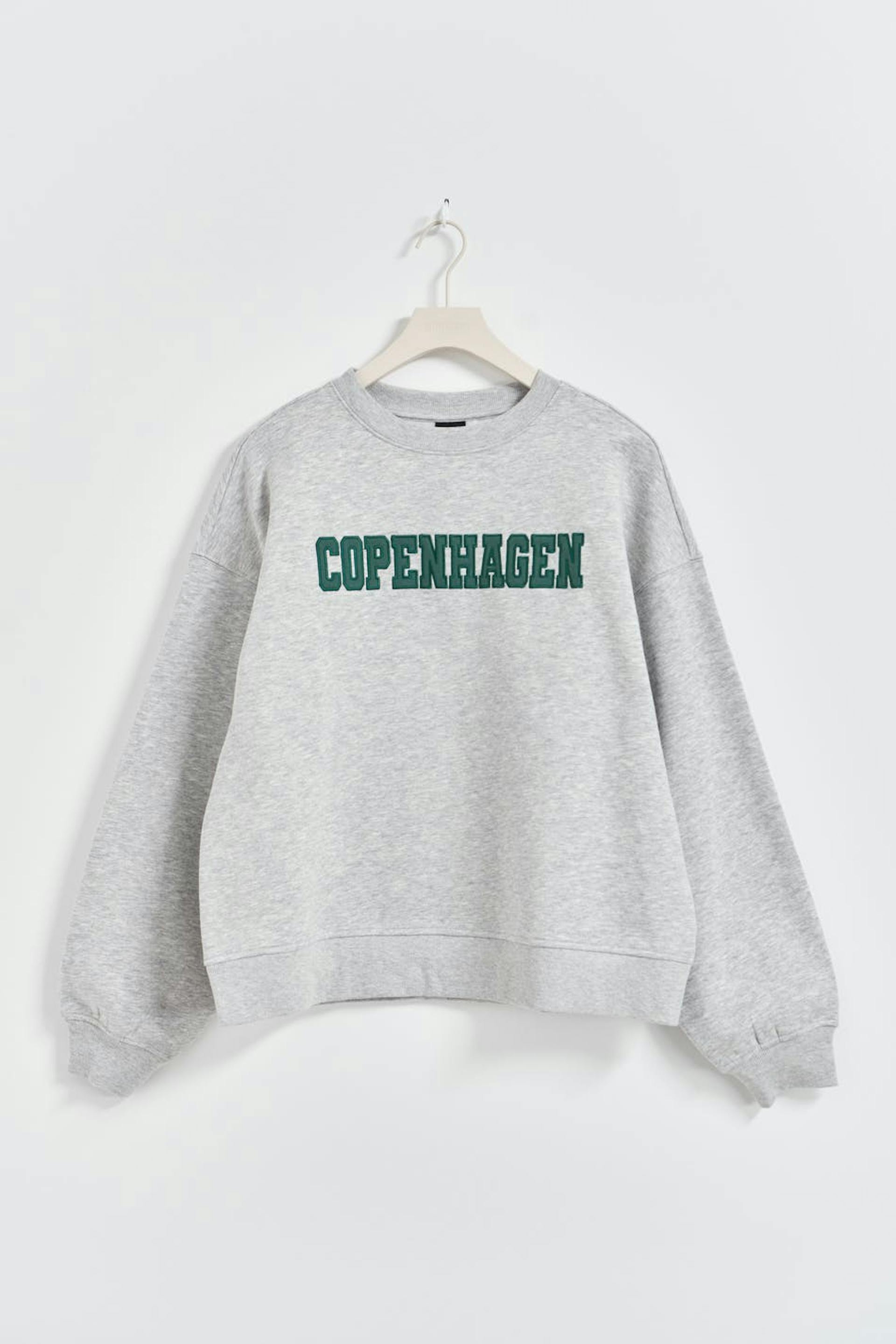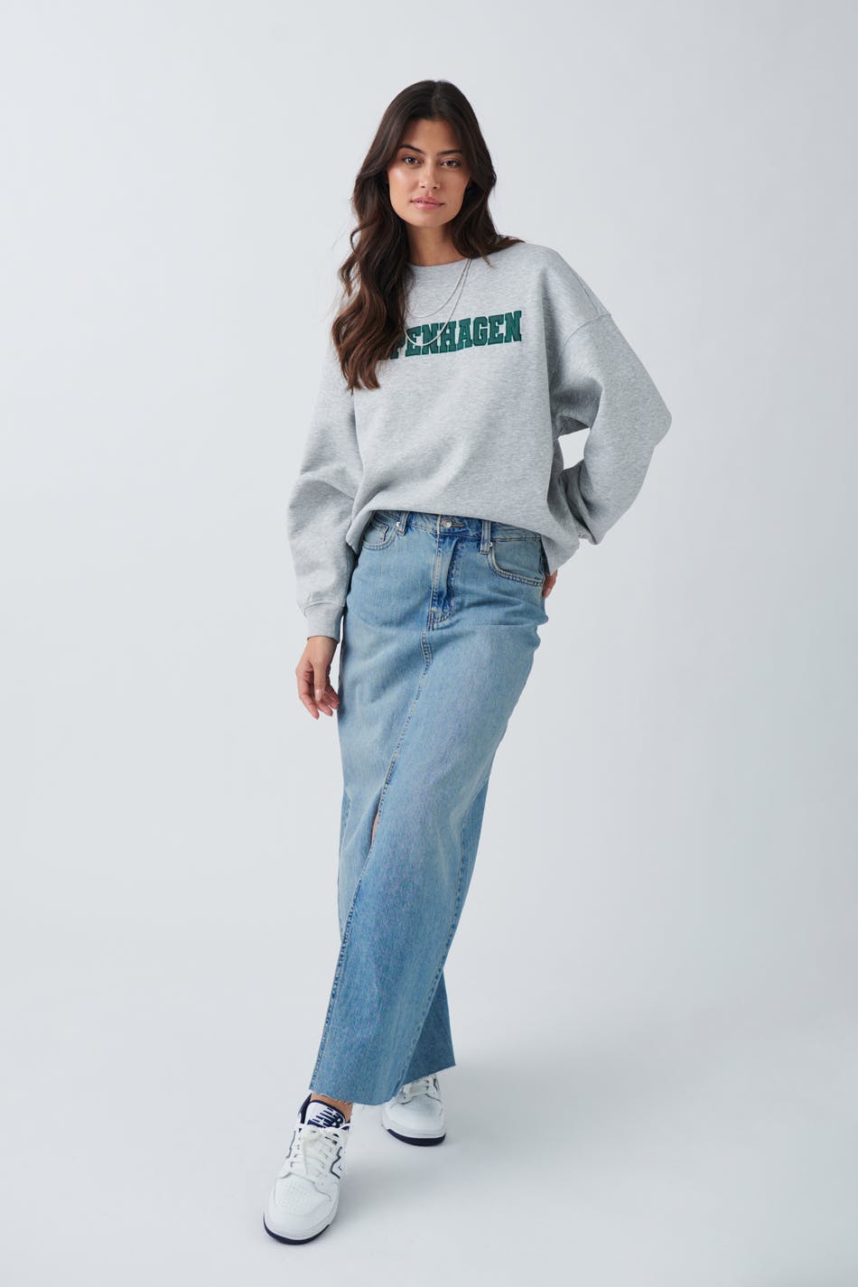 Sweatshirt med broderet tekst foran. Sweatshirten er grå og har oversize pasform. Den har rund udskæring, lav skulder og ribstrikning ved ærmekanter og ved den nederste kant.