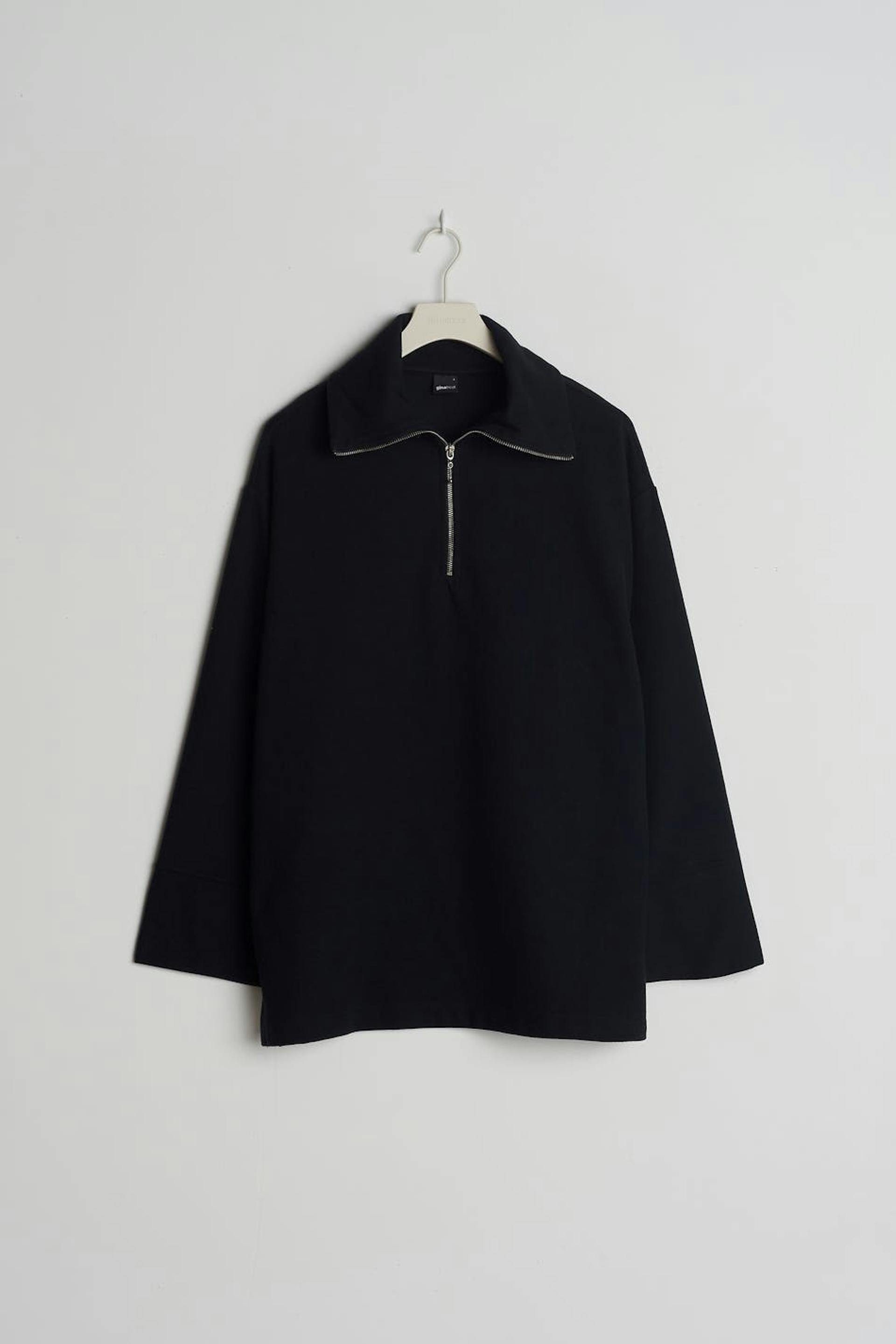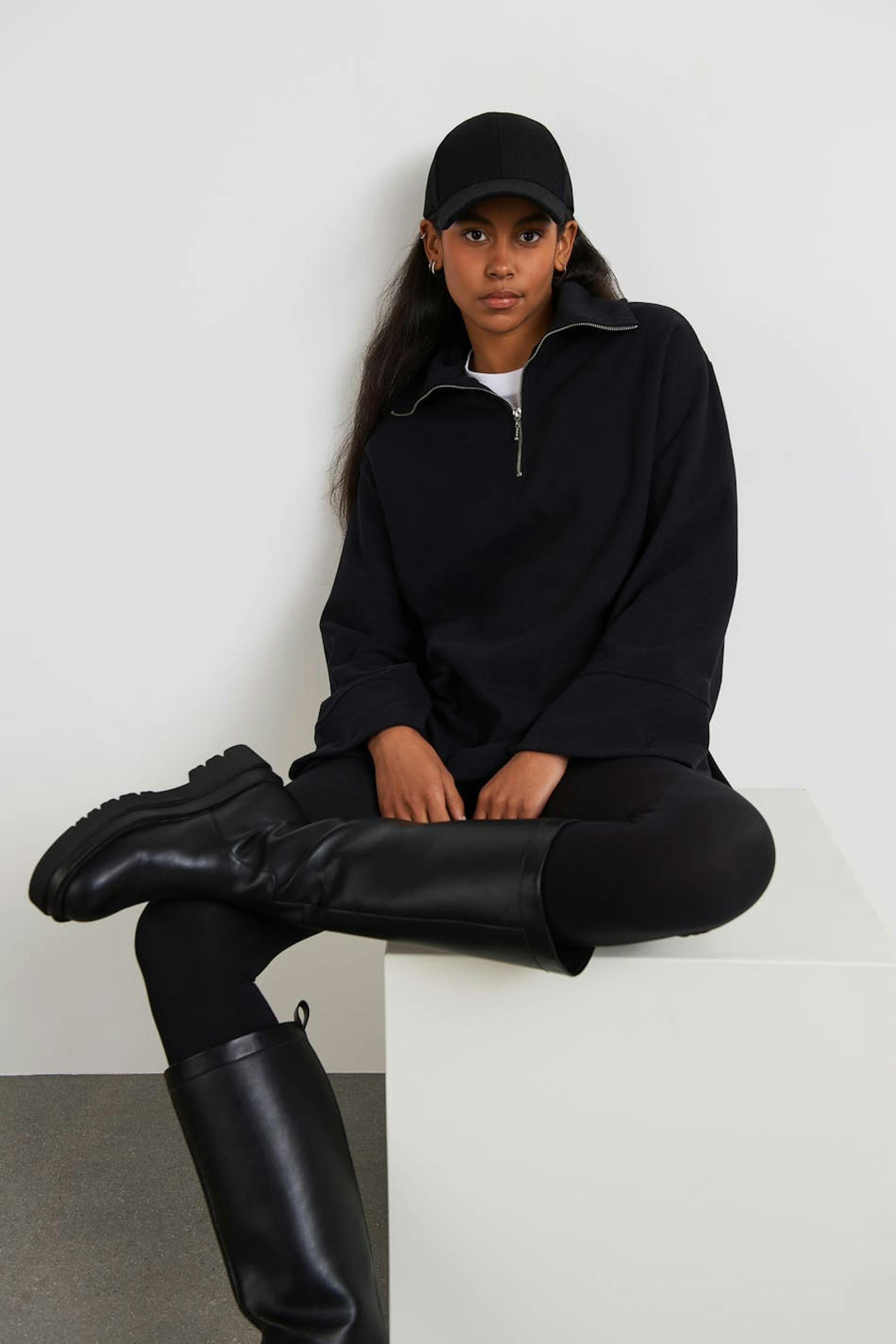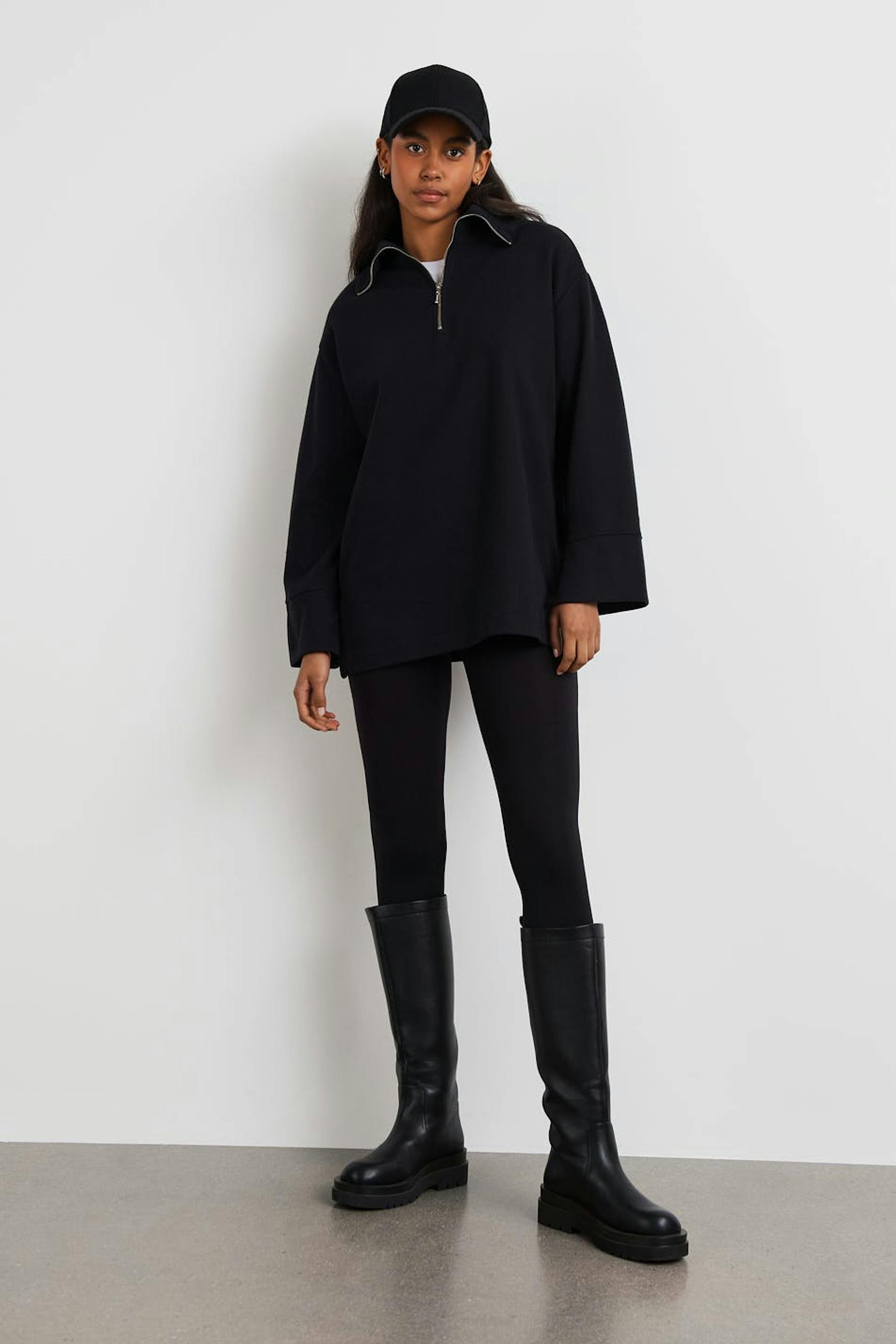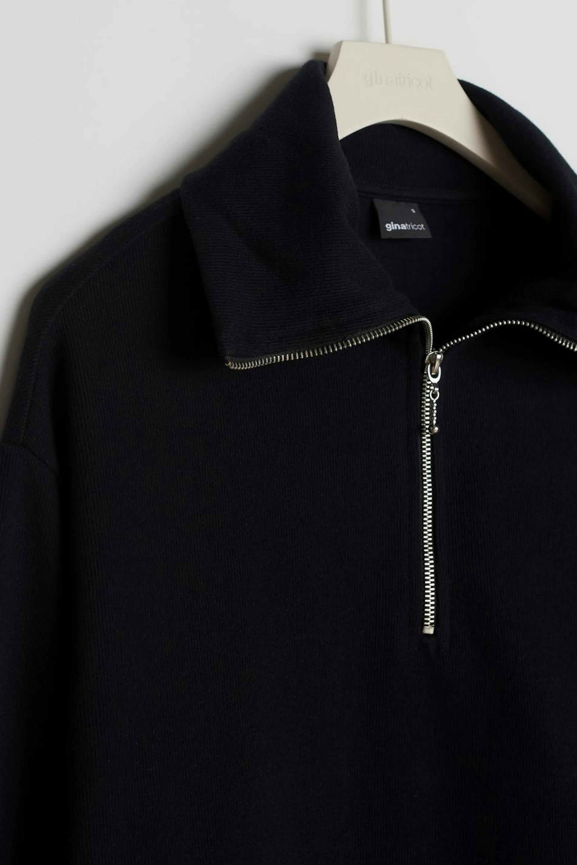 Trøje med en oversize pasform. Trøjen er grå og har et blødt materiale i jersey. Den har en krage, en halv lynlås på toppen og en slids på siderne og på ærmeafslutningerne.