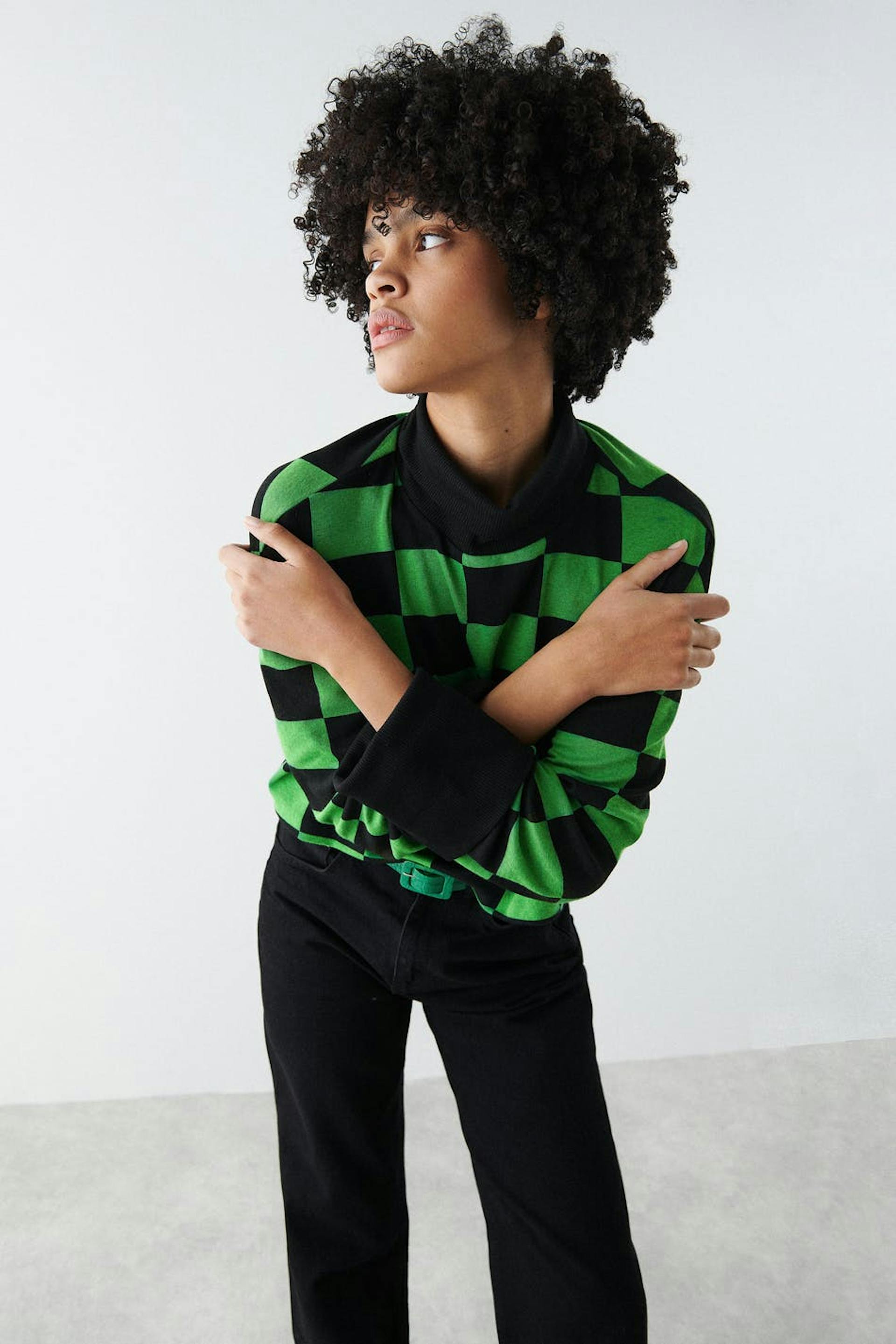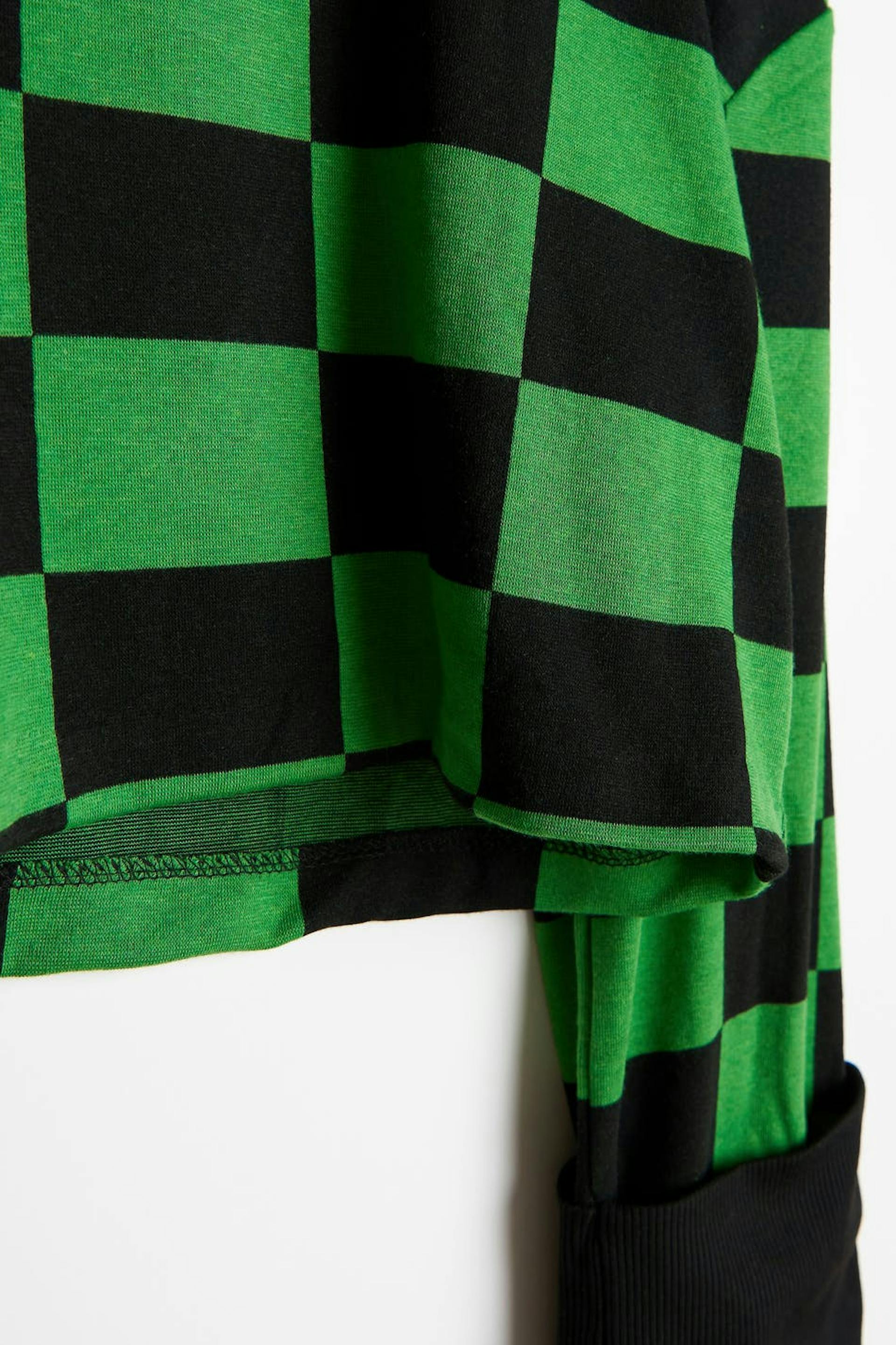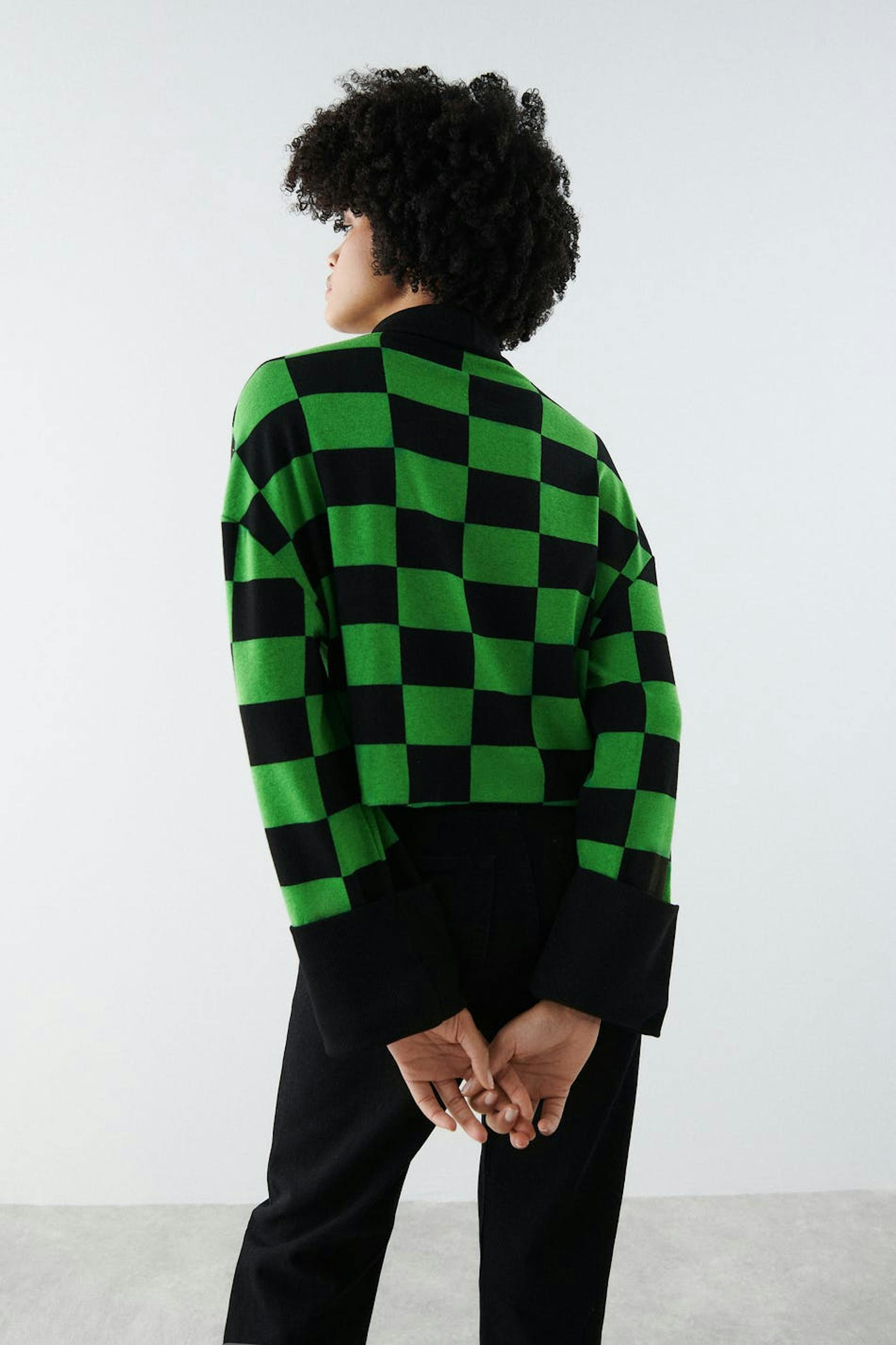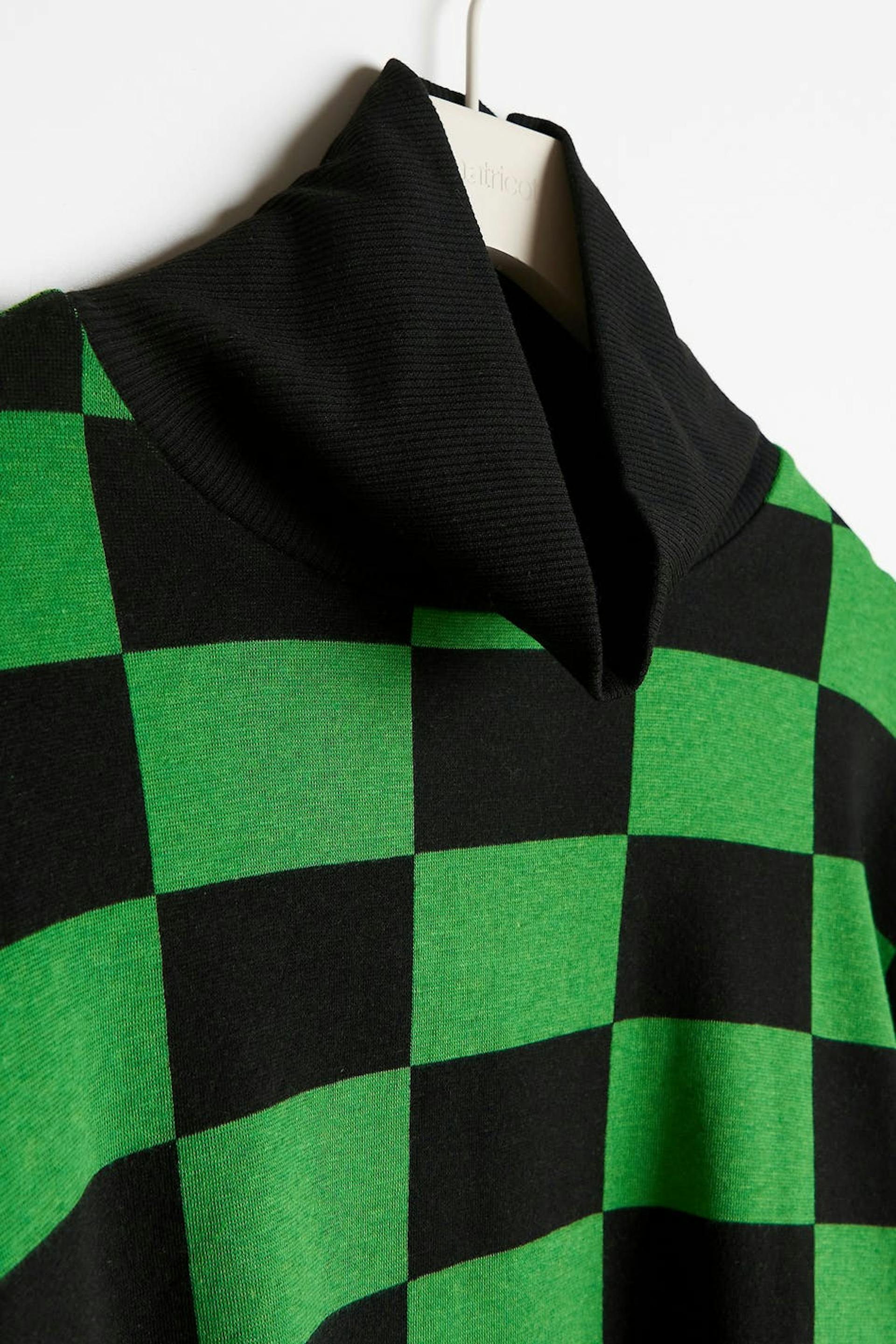 Skakternet trøje med turtleneck. Trøjen er grøn, sort og jersey. Den har en firkantet pasform, lange ærmer og en croppet længde.