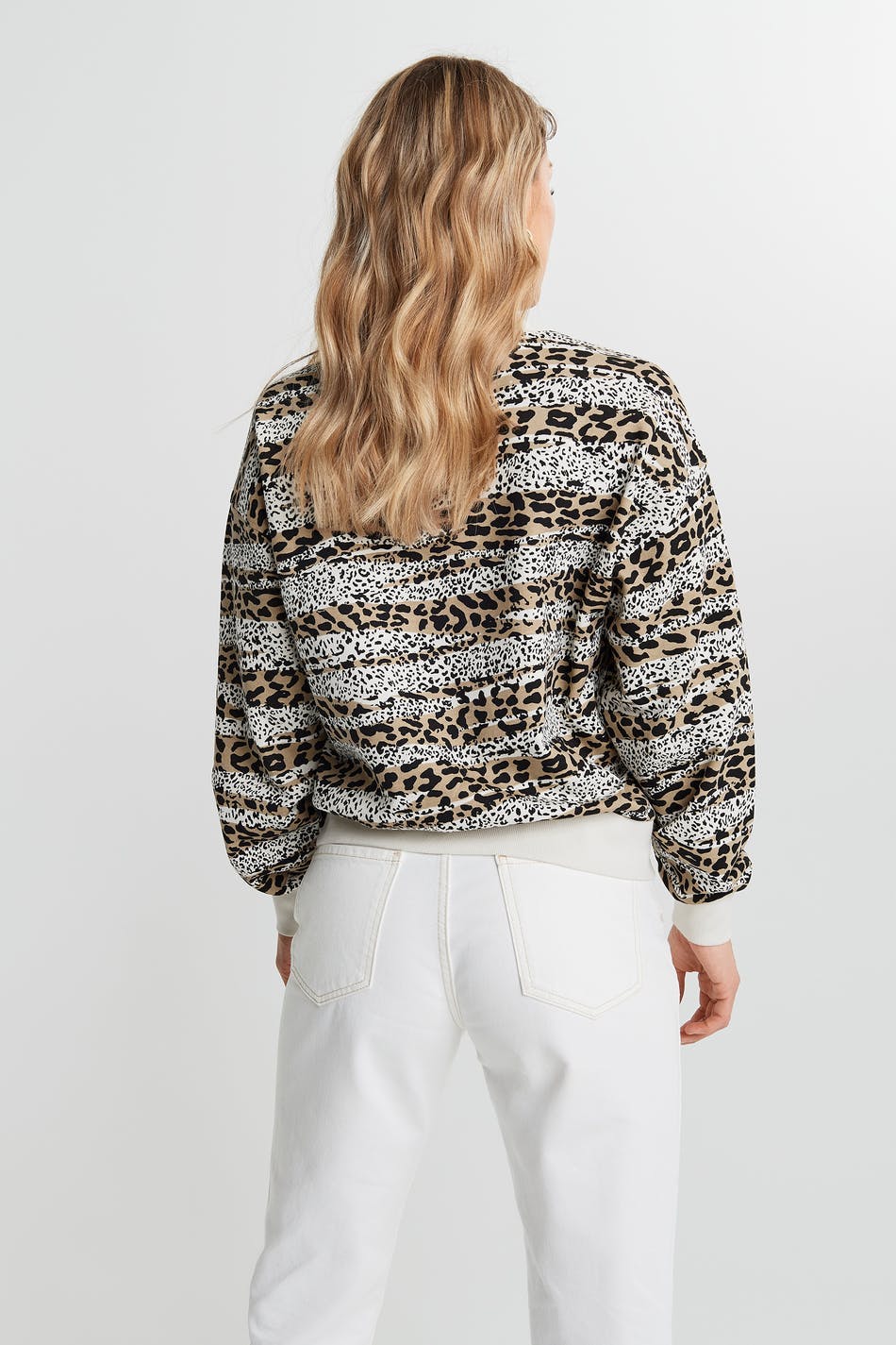 Langærmet hættetrøje med et tryk på brystet. Hættetrøjen er leopard og har ribmanchet på ærmeafslutningerne, på udskæringen og ved sømmen.