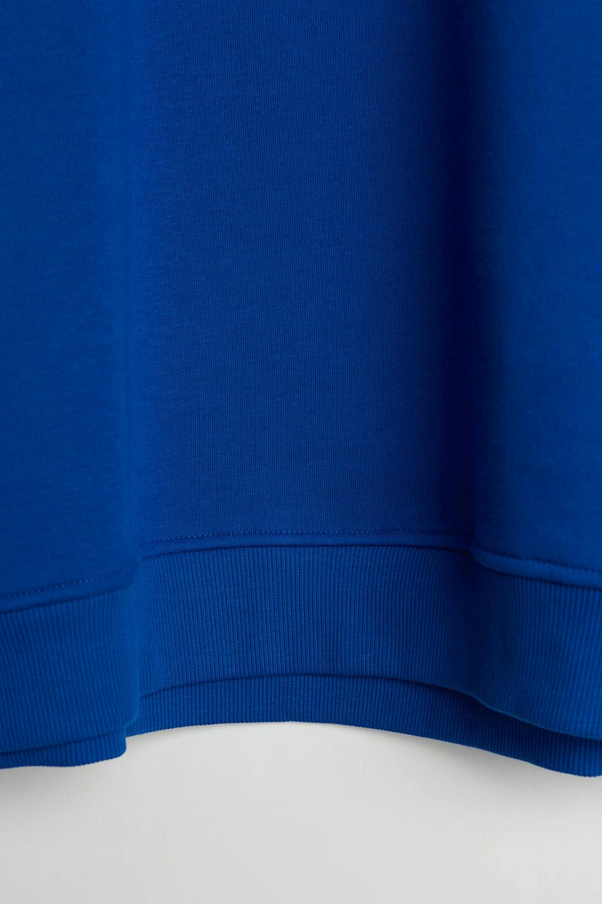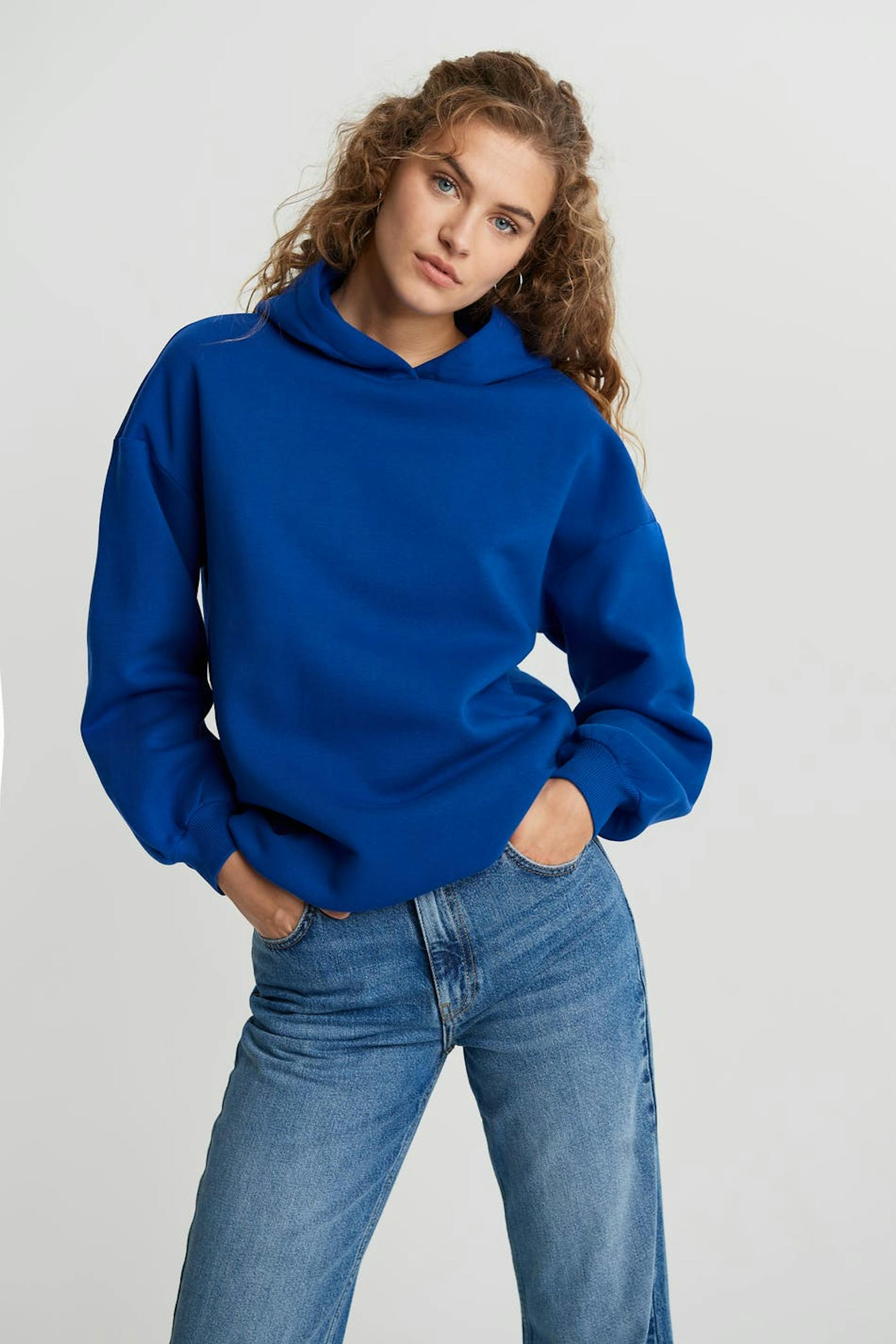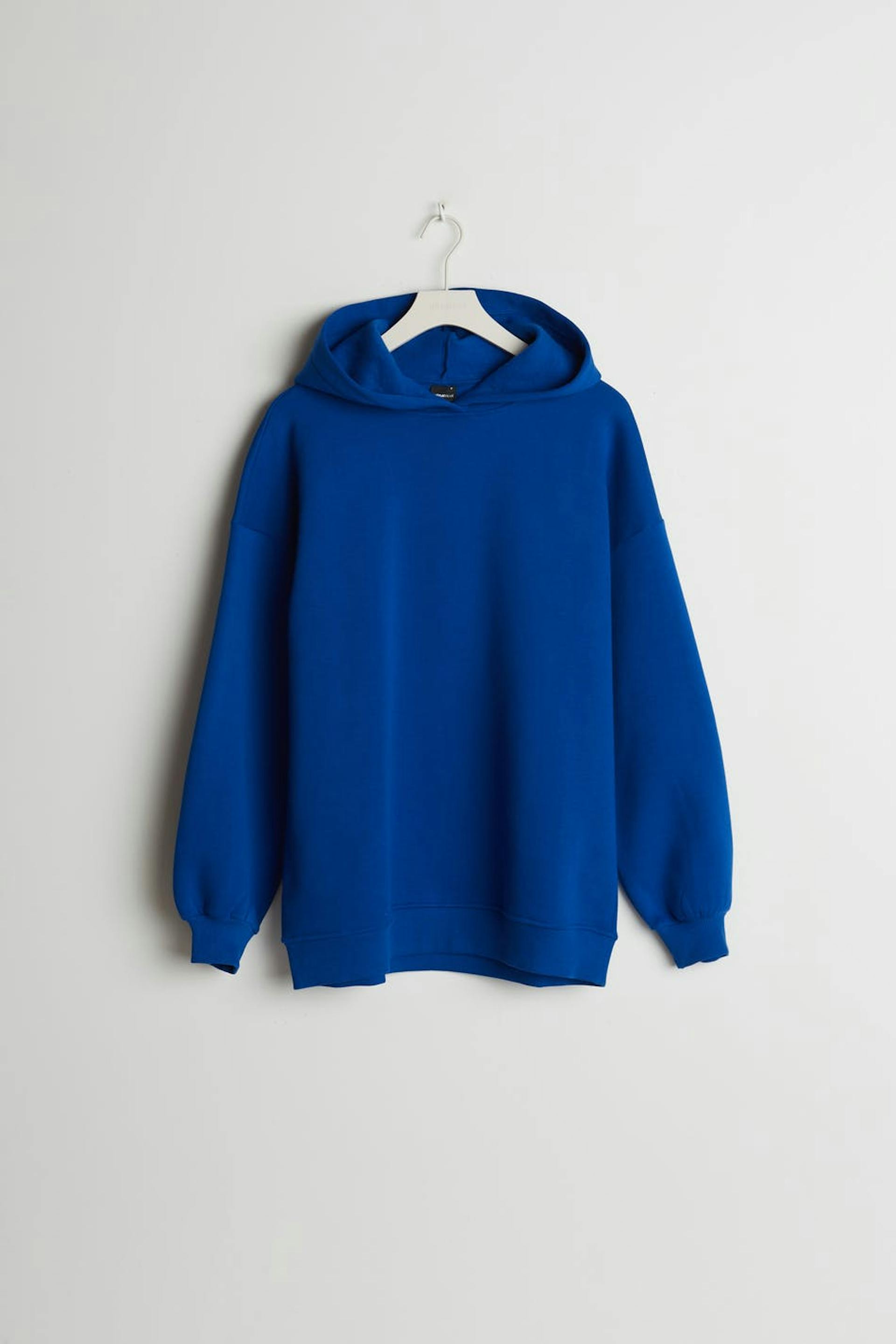 Hættetrøje med en generøs pasform. Hættetrøjen er blå og har en hætte. Den har elastisk bånd på ærmeafslutningerne og ved sømmen og lave skuldre.