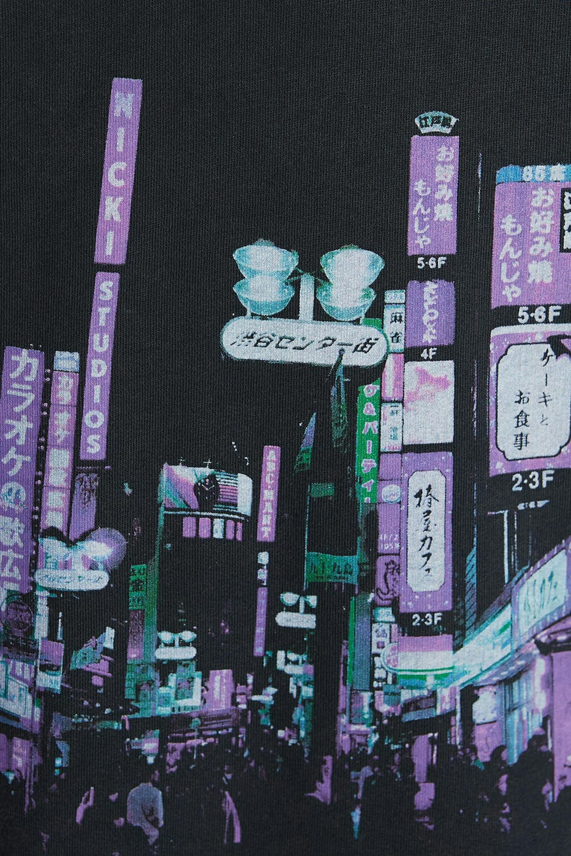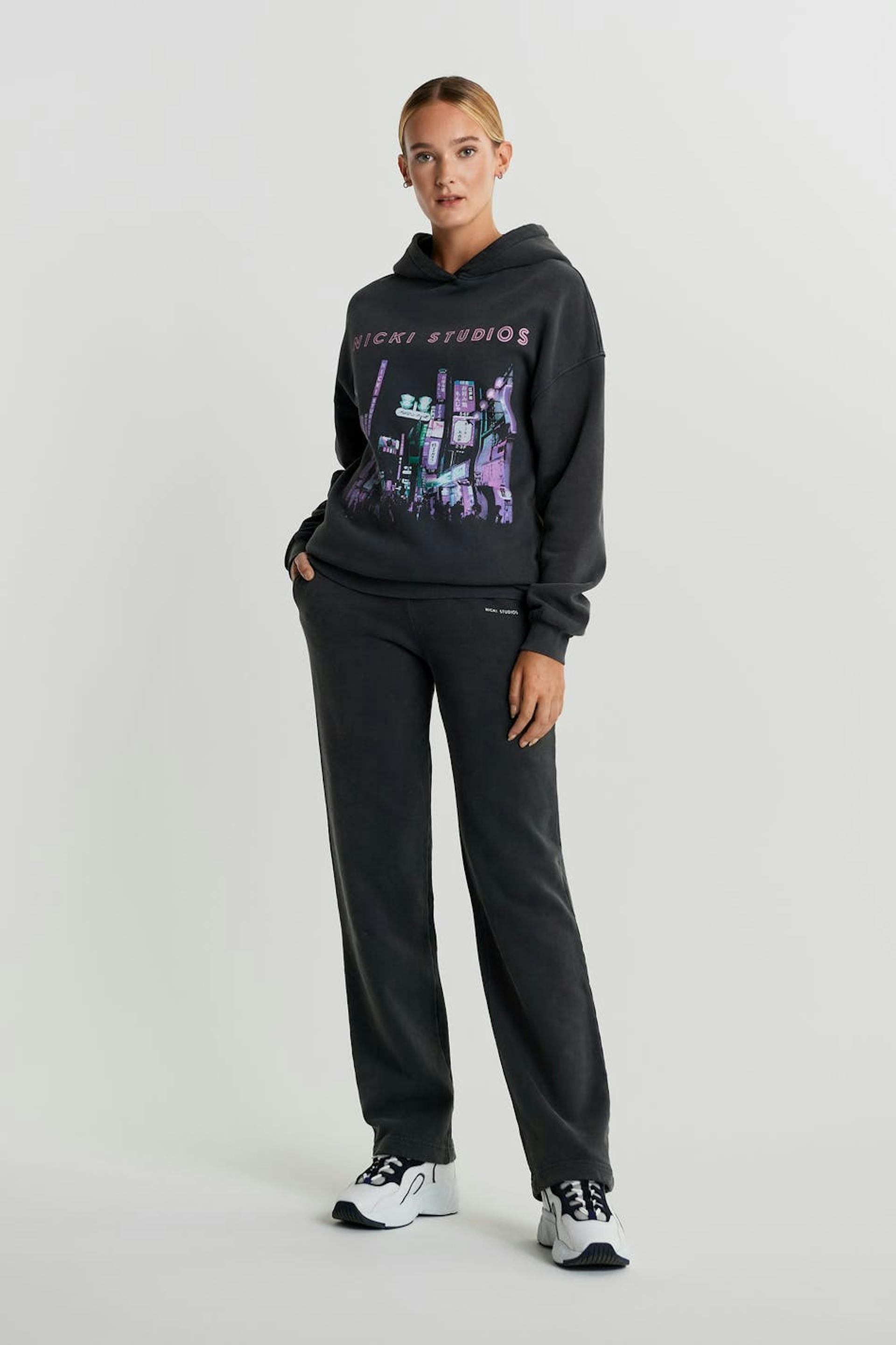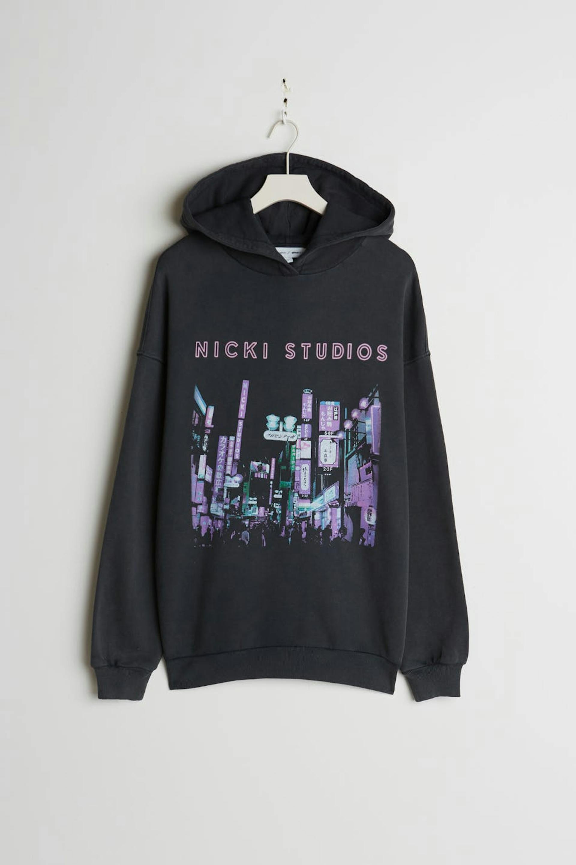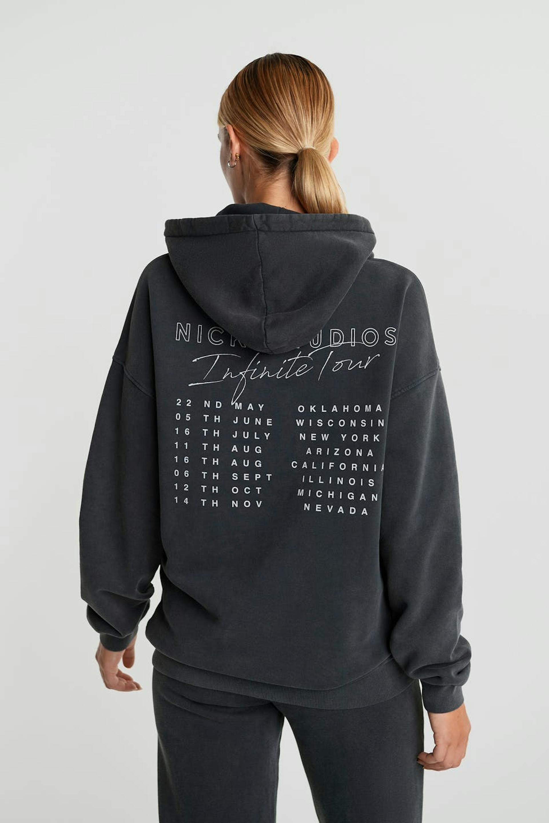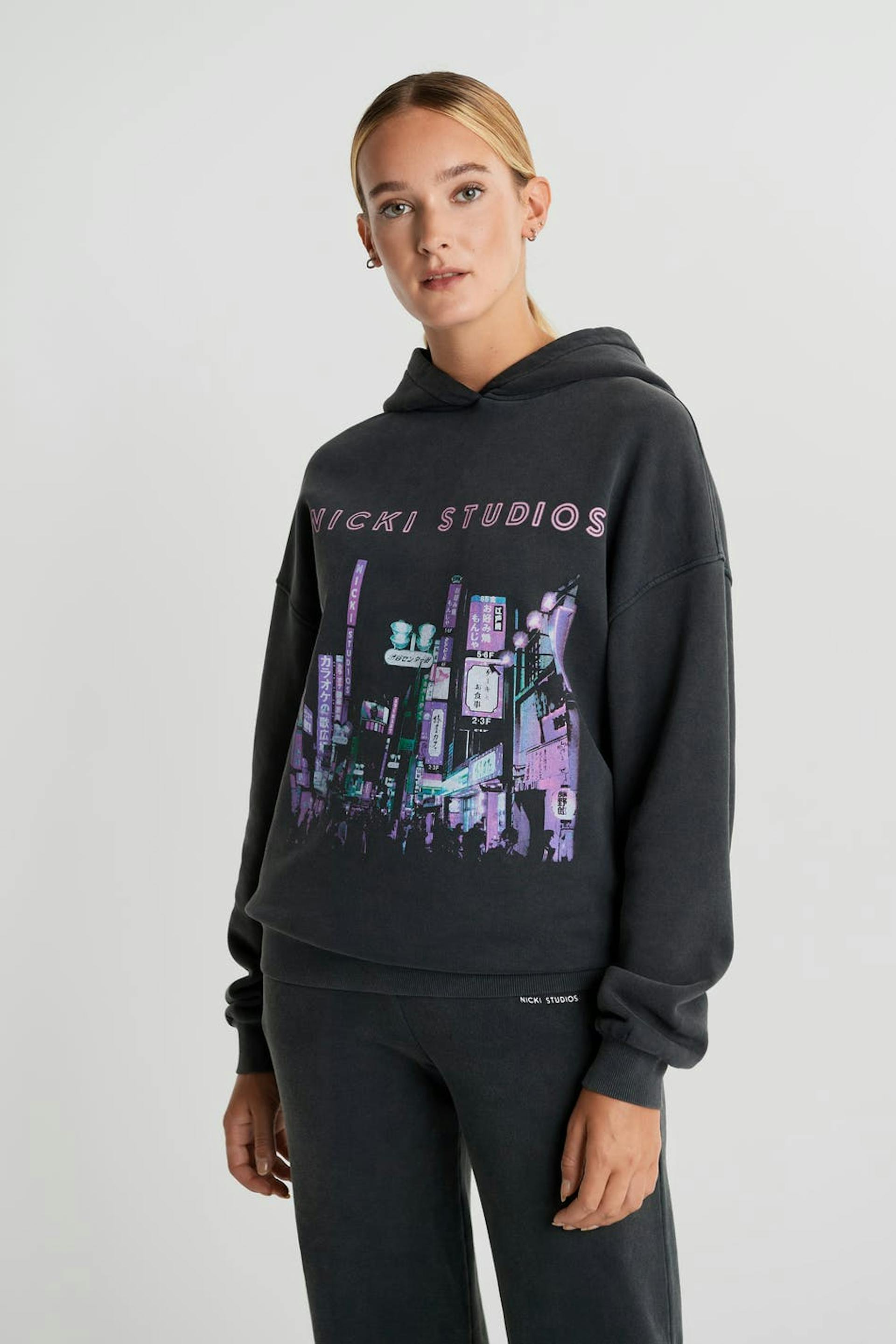 Langærmet hættetrøje med en generøs pasform. Hættetrøjen er sort og har en hætte. Den har et tryk på forsiden og på bagsiden.