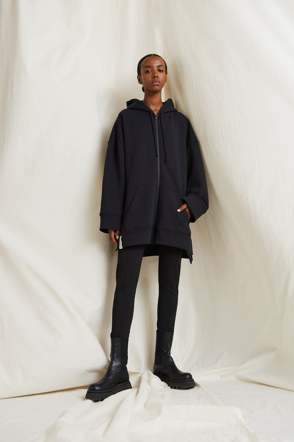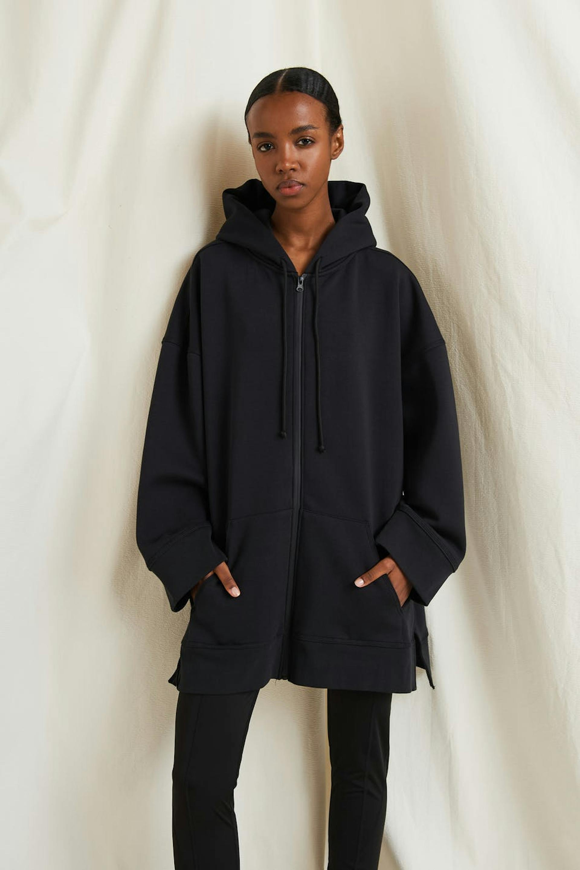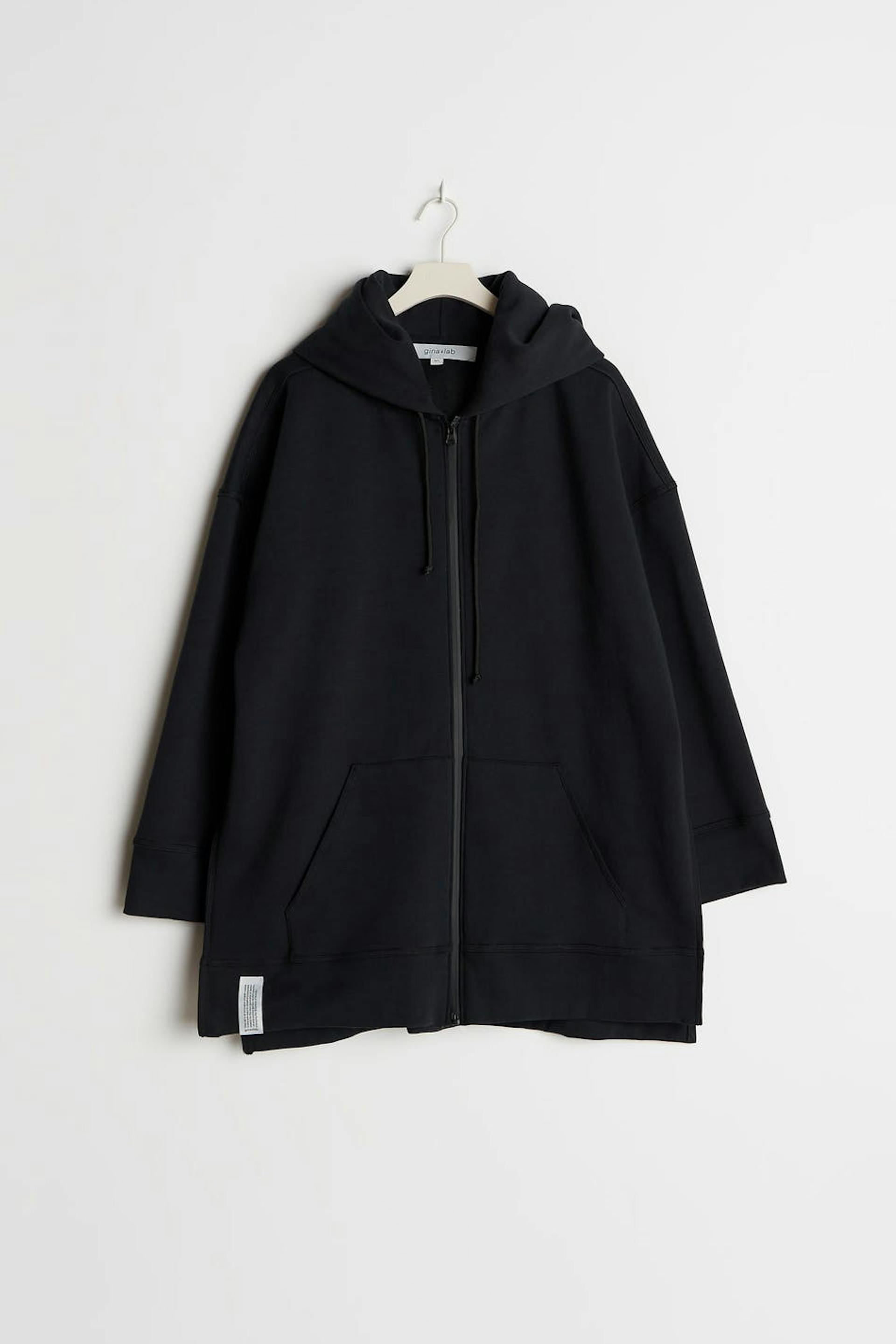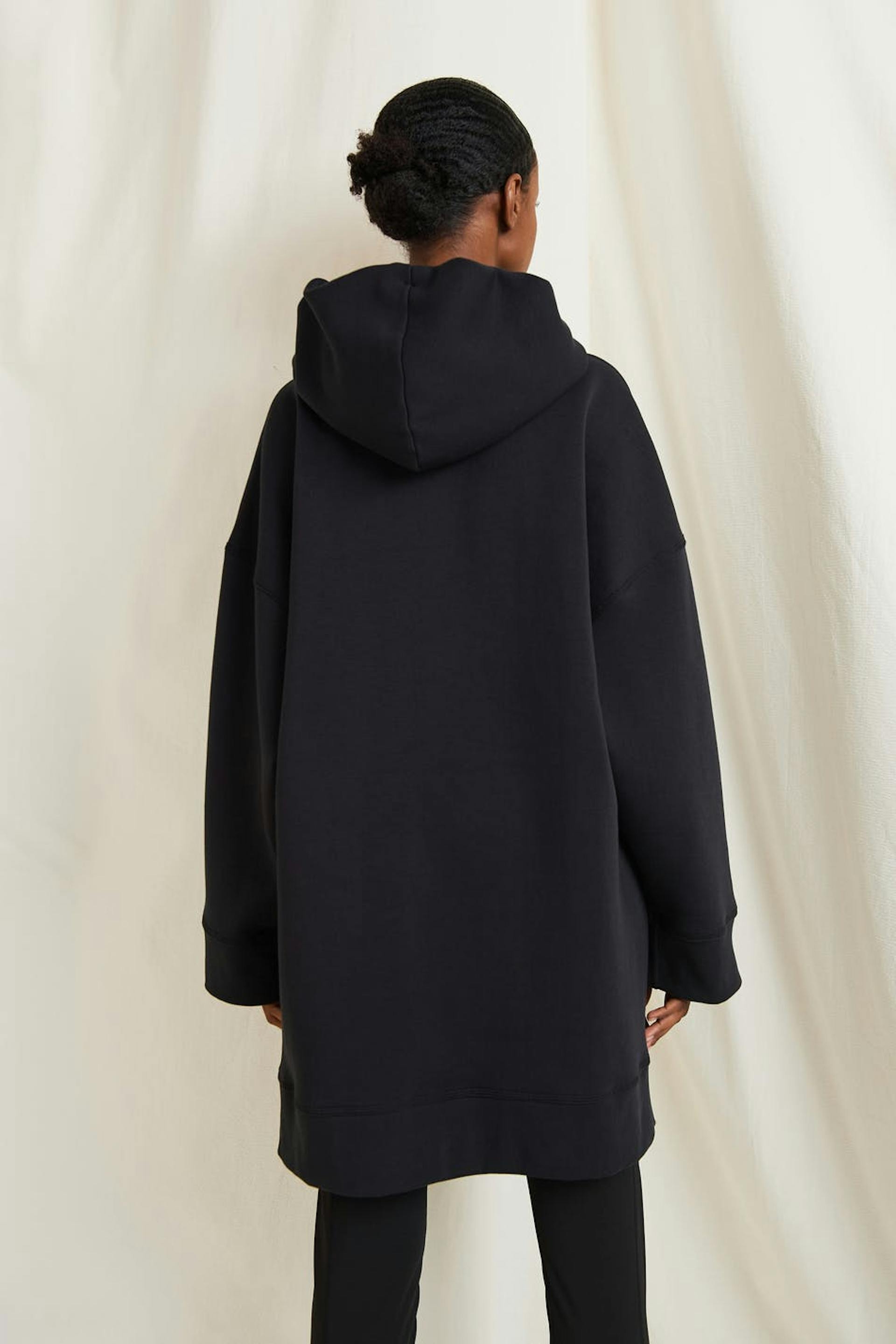 Hoodie fra Gina Lab med en oversize pasform. Hoodien er sort og har blødt fleece for på indersiden. Den er fremstillet af sweatshirt-kvalitet og har brede ærmer, en kængurulomme ved fronten, slids på siderne og en stor hætte med justérbare bånd.