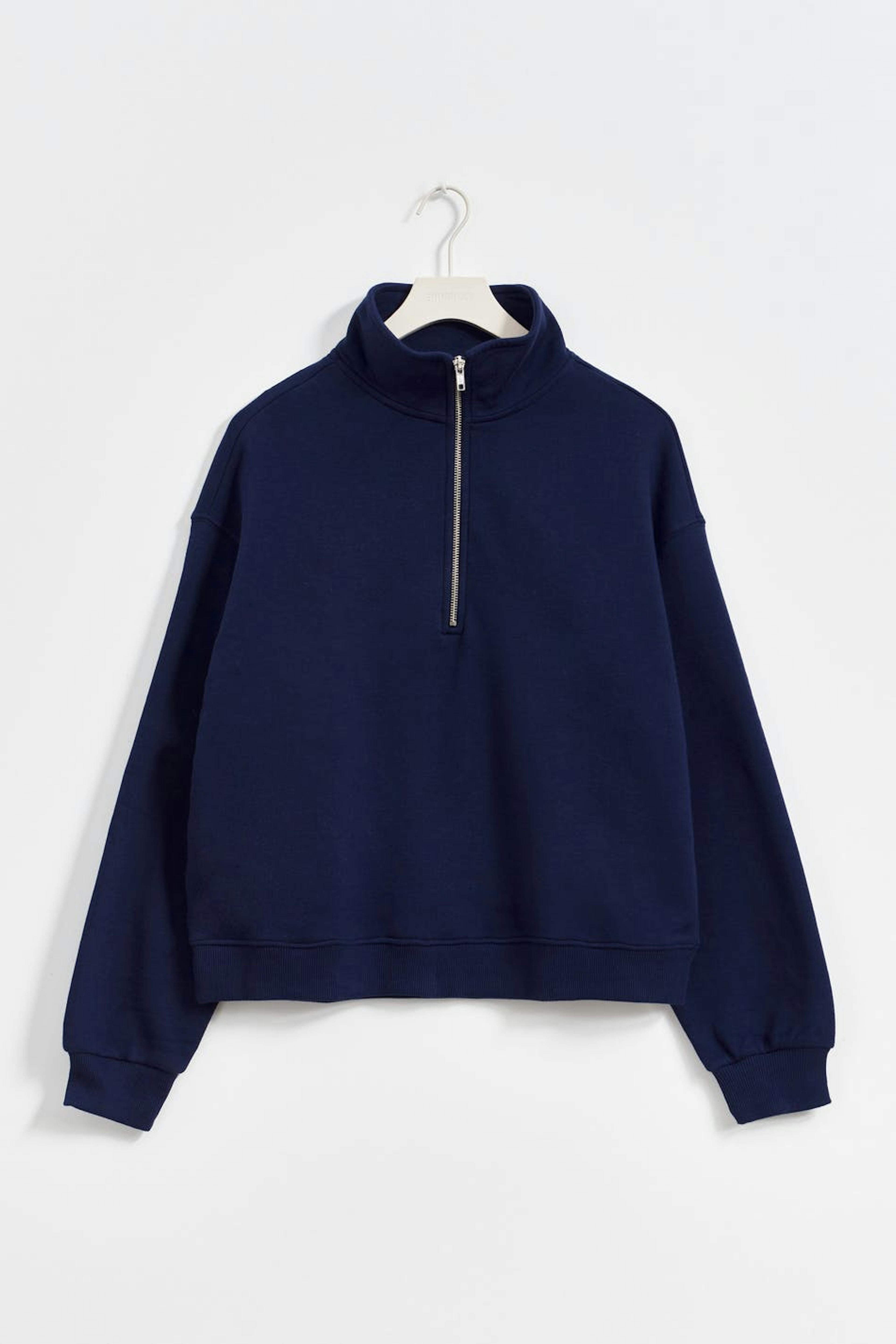 Trøje med lynlås på toppen. Trøjen er blå og har høj krave. Den har en oversize pasform, lav skulder og ribstrikning ved ærmekanter og ved den nederste kant.