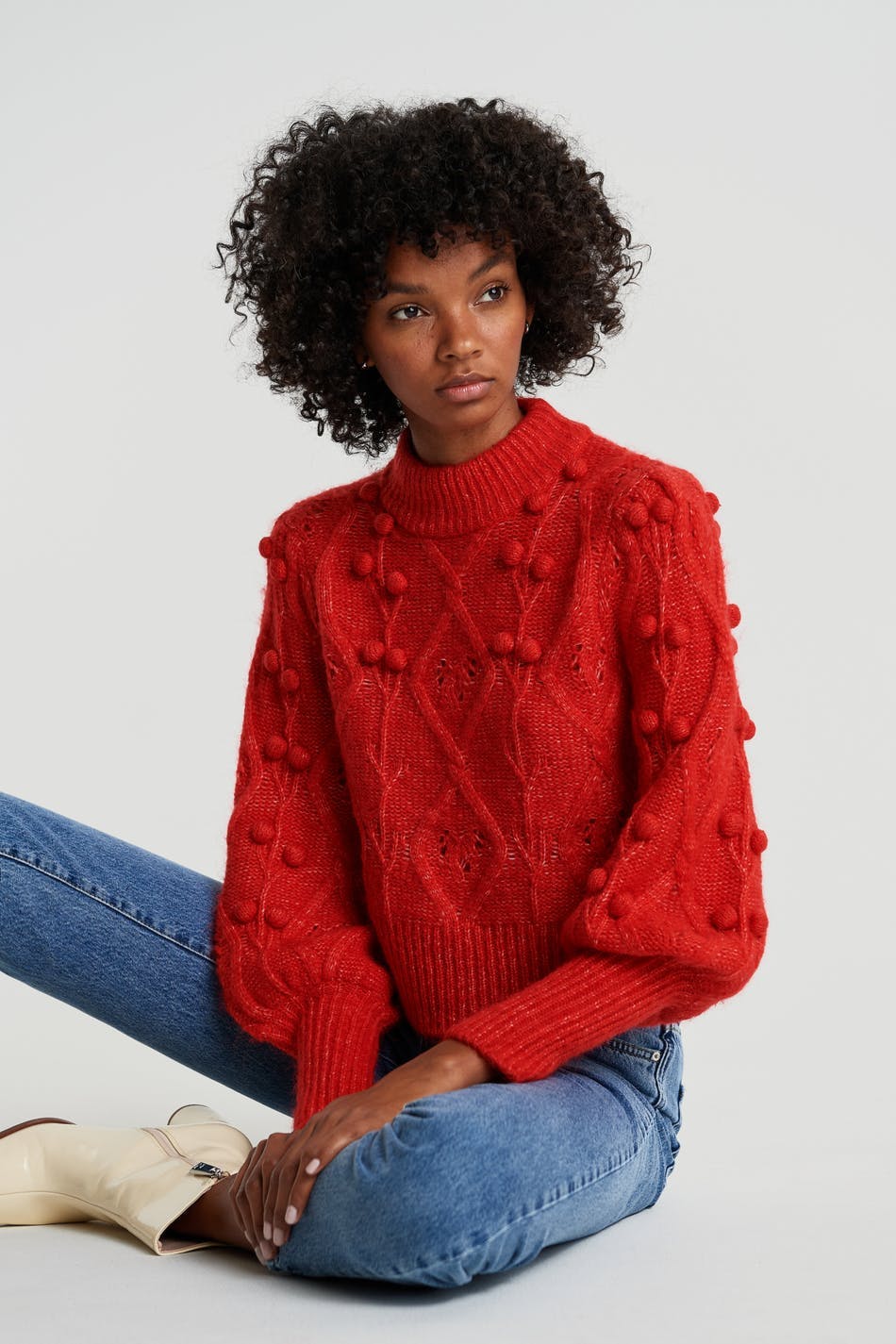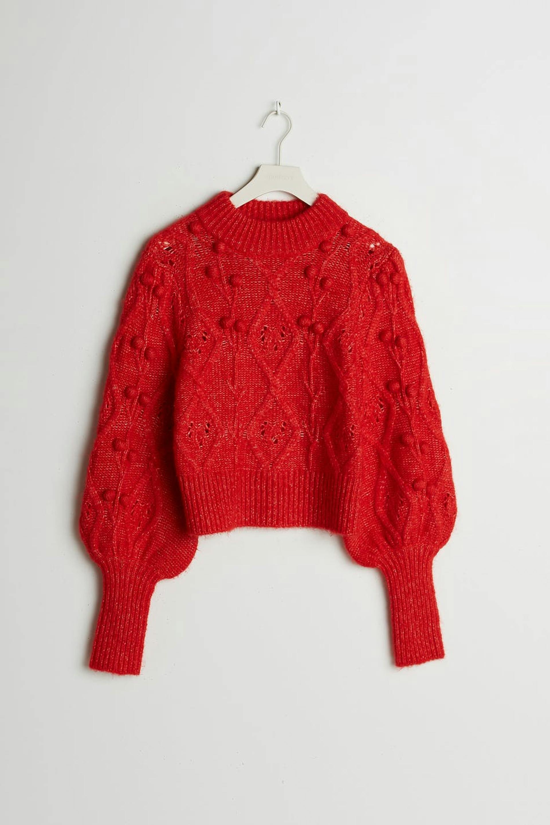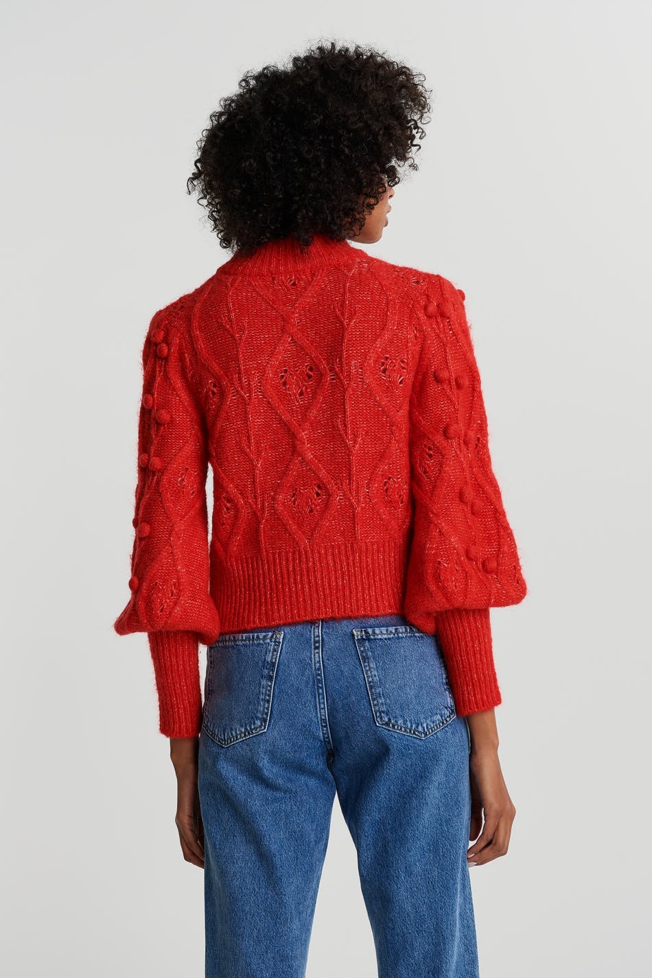 Kabelstrikket trøje med strikkede bolde i garn. Trøjen er rød og har lange, rummelige ærmer. Den har en ribmanchet på ærmeafslutningerne, på udskæringen og ved sømmen.