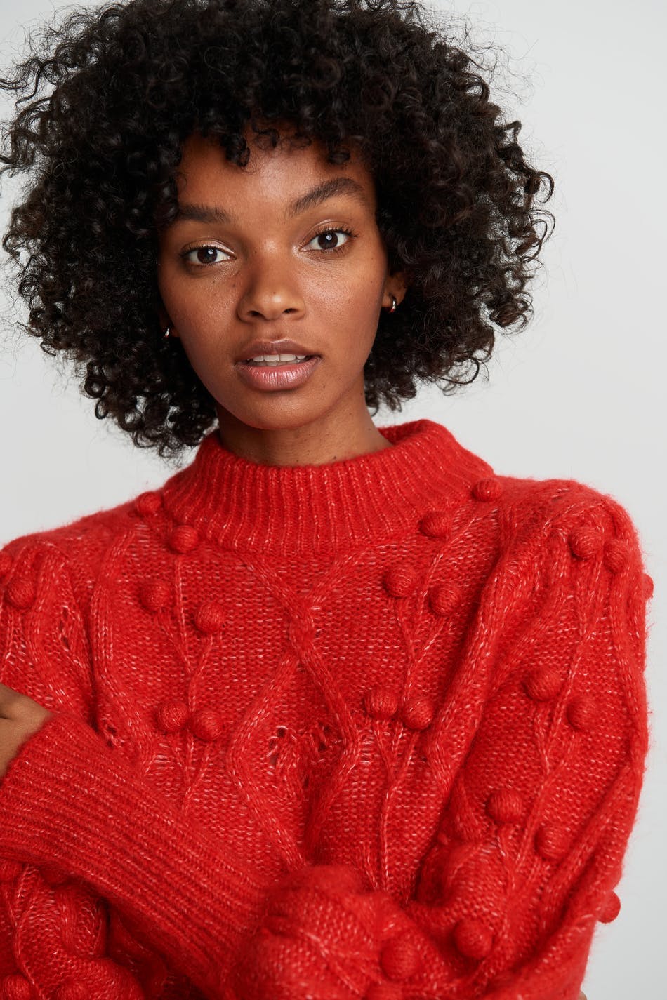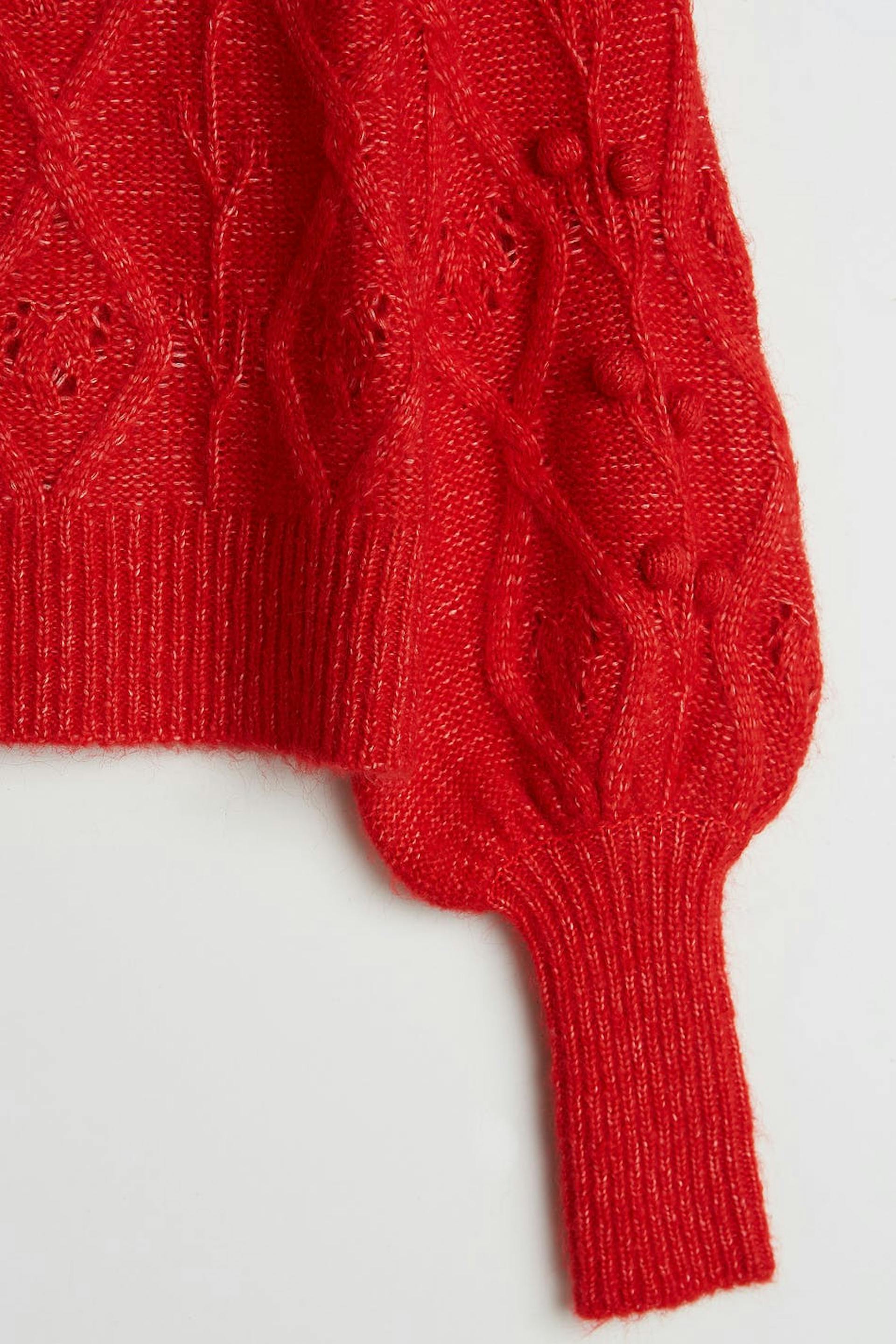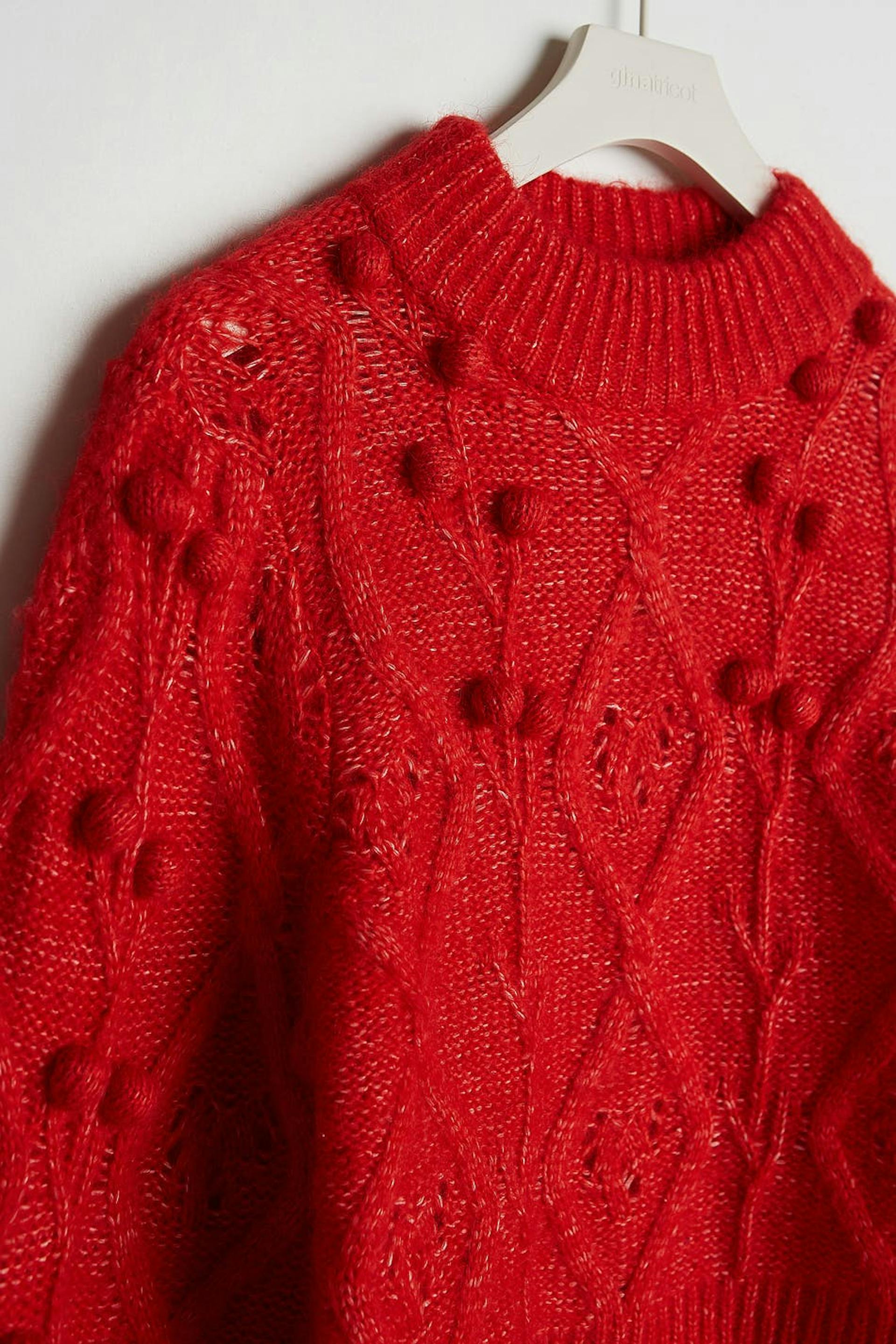 Kabelstrikket trøje med strikkede bolde i garn. Trøjen er rød og har lange, rummelige ærmer. Den har en ribmanchet på ærmeafslutningerne, på udskæringen og ved sømmen.