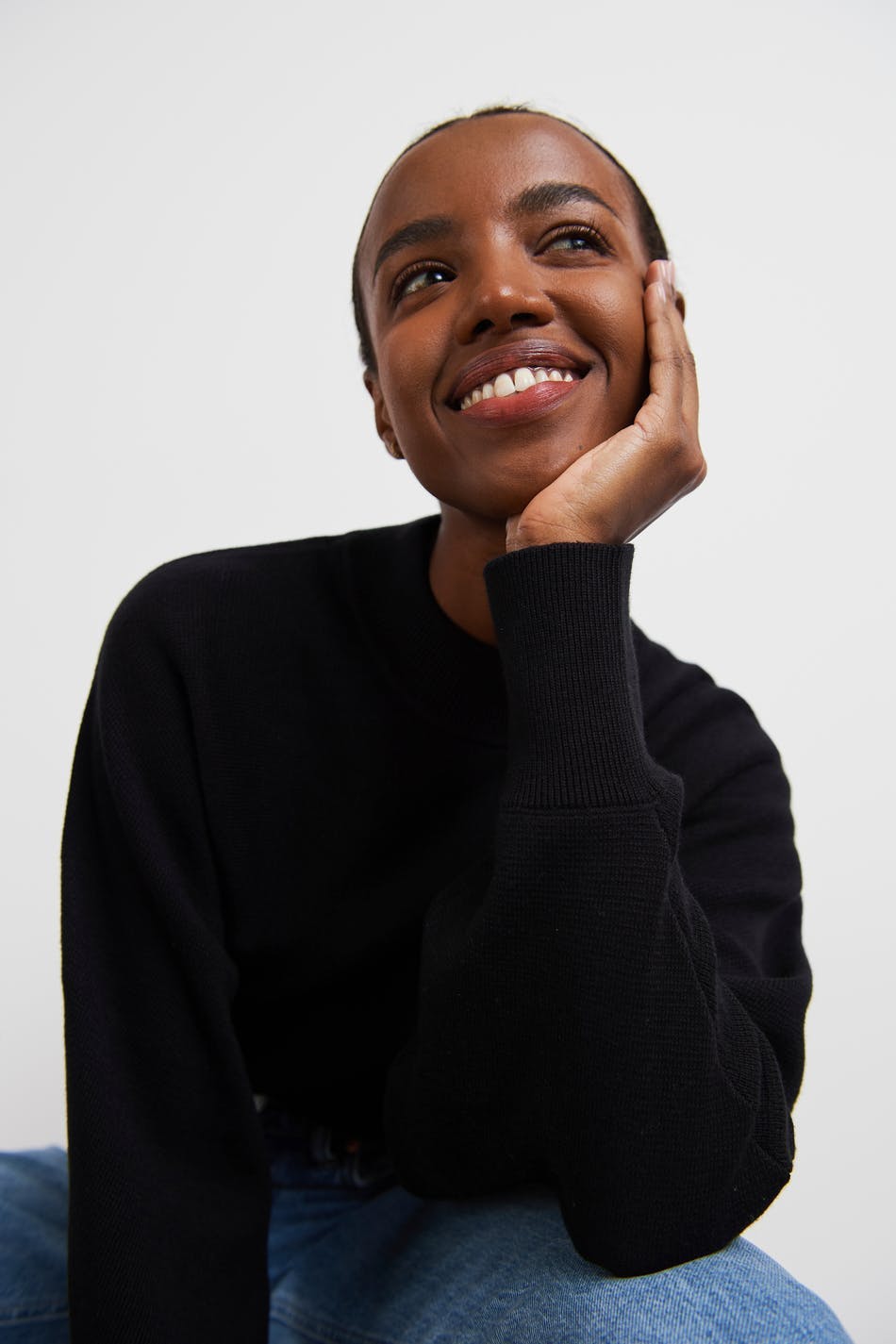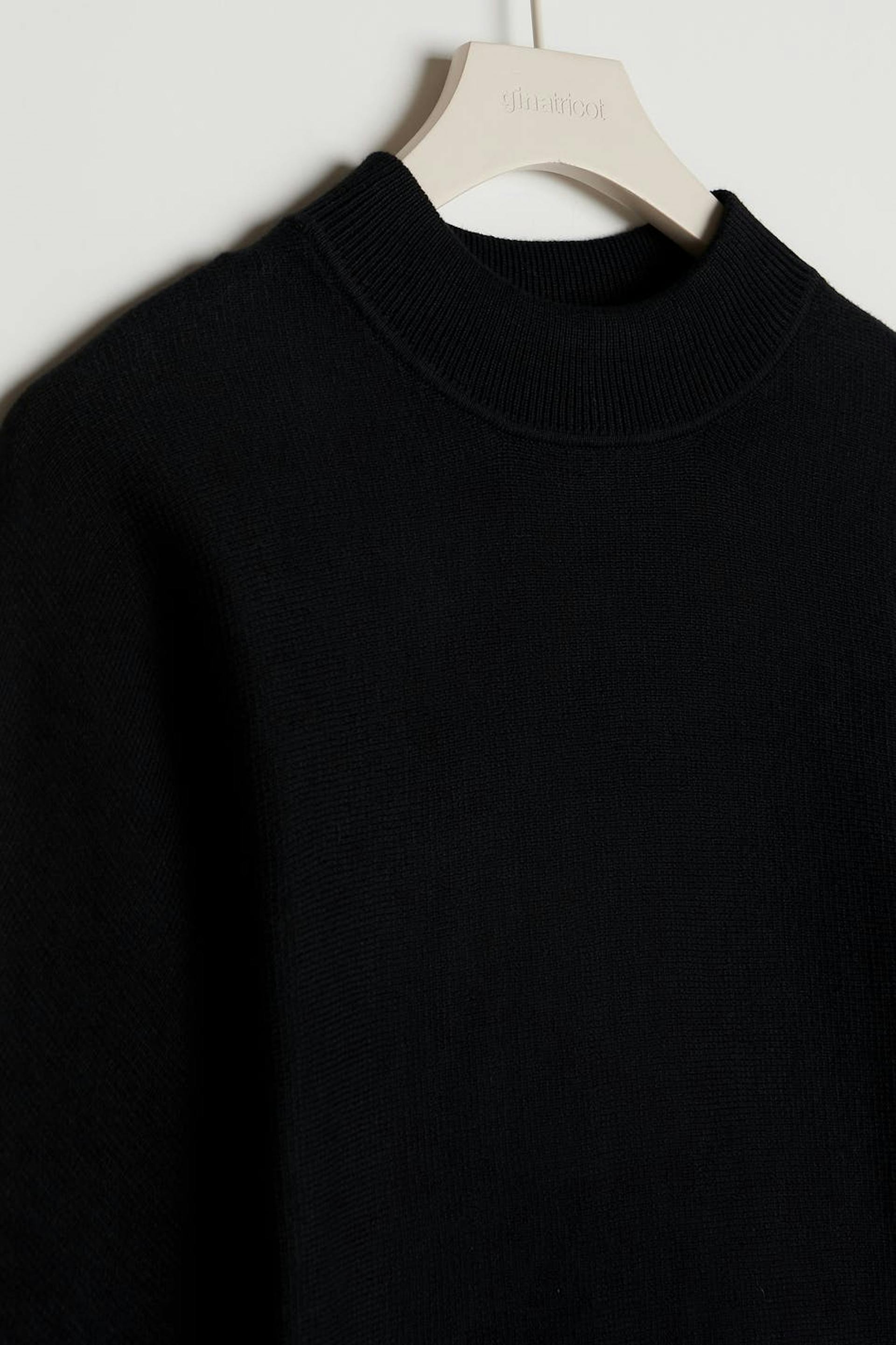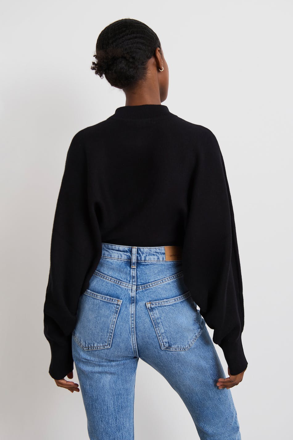 Strikket trøje med en løs pasform. Trøjen er sort og har flagermusærmer. Den har en høj udskæring og en bred, ribbet manchet ved nedersømmen.