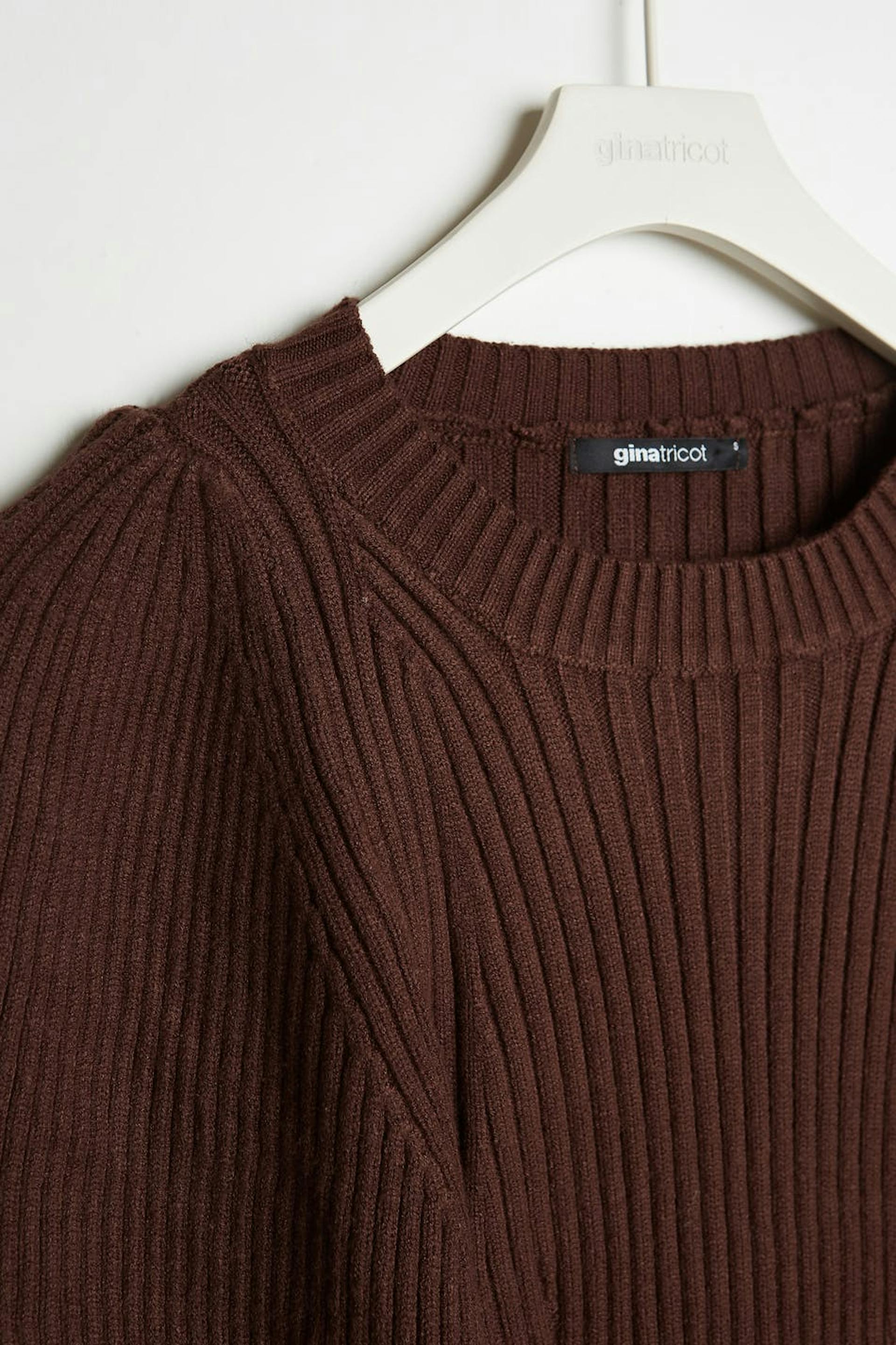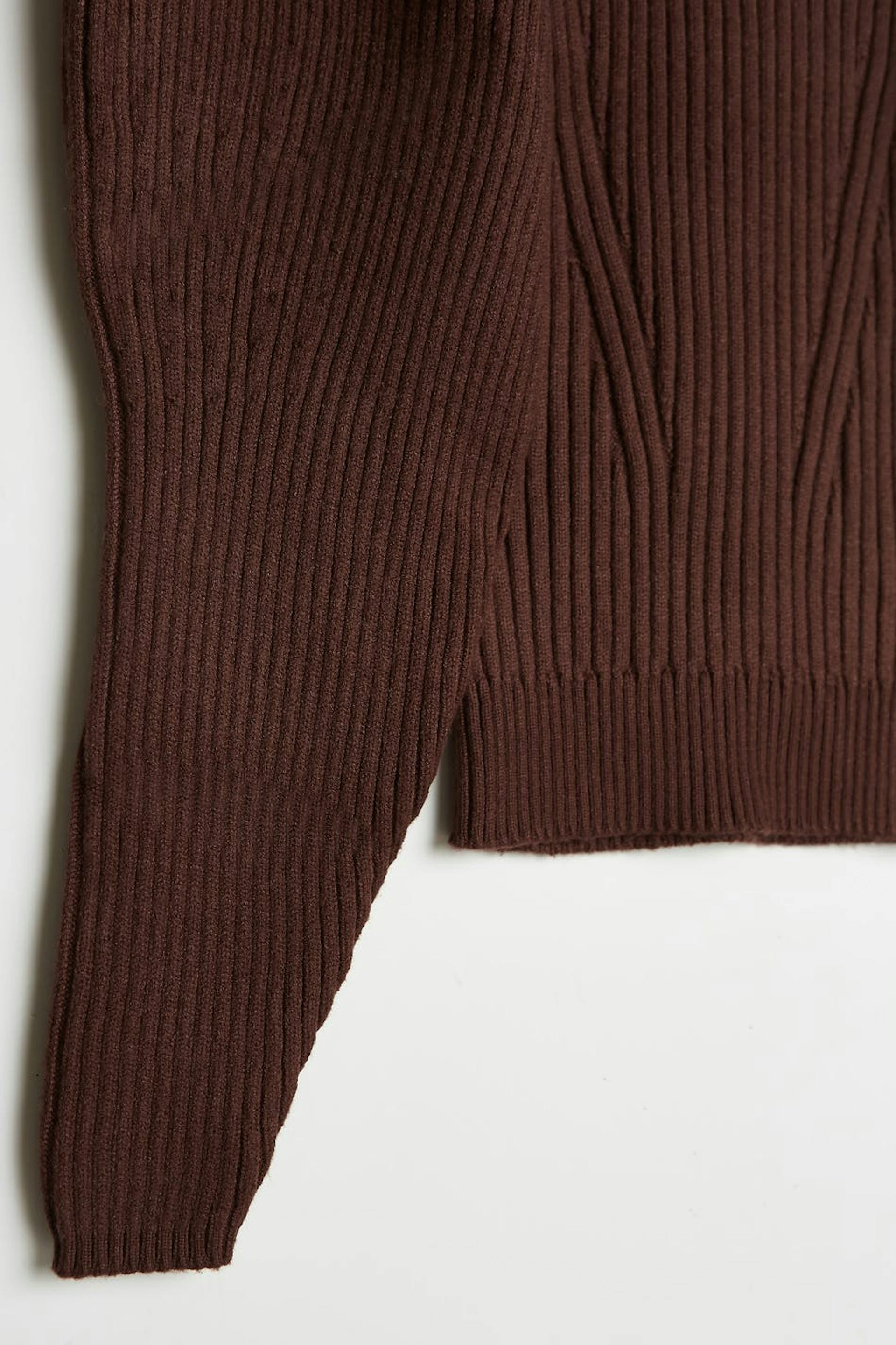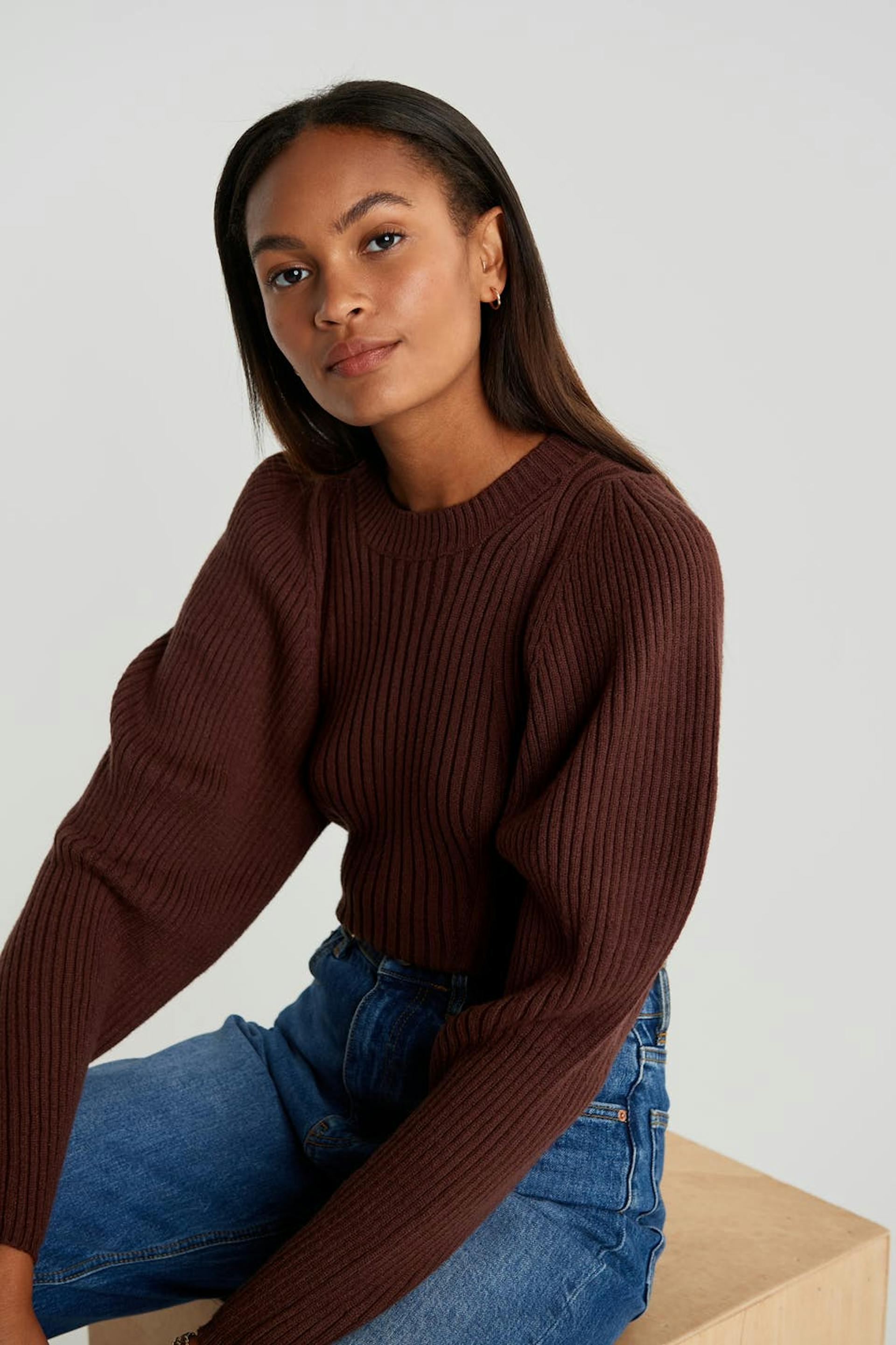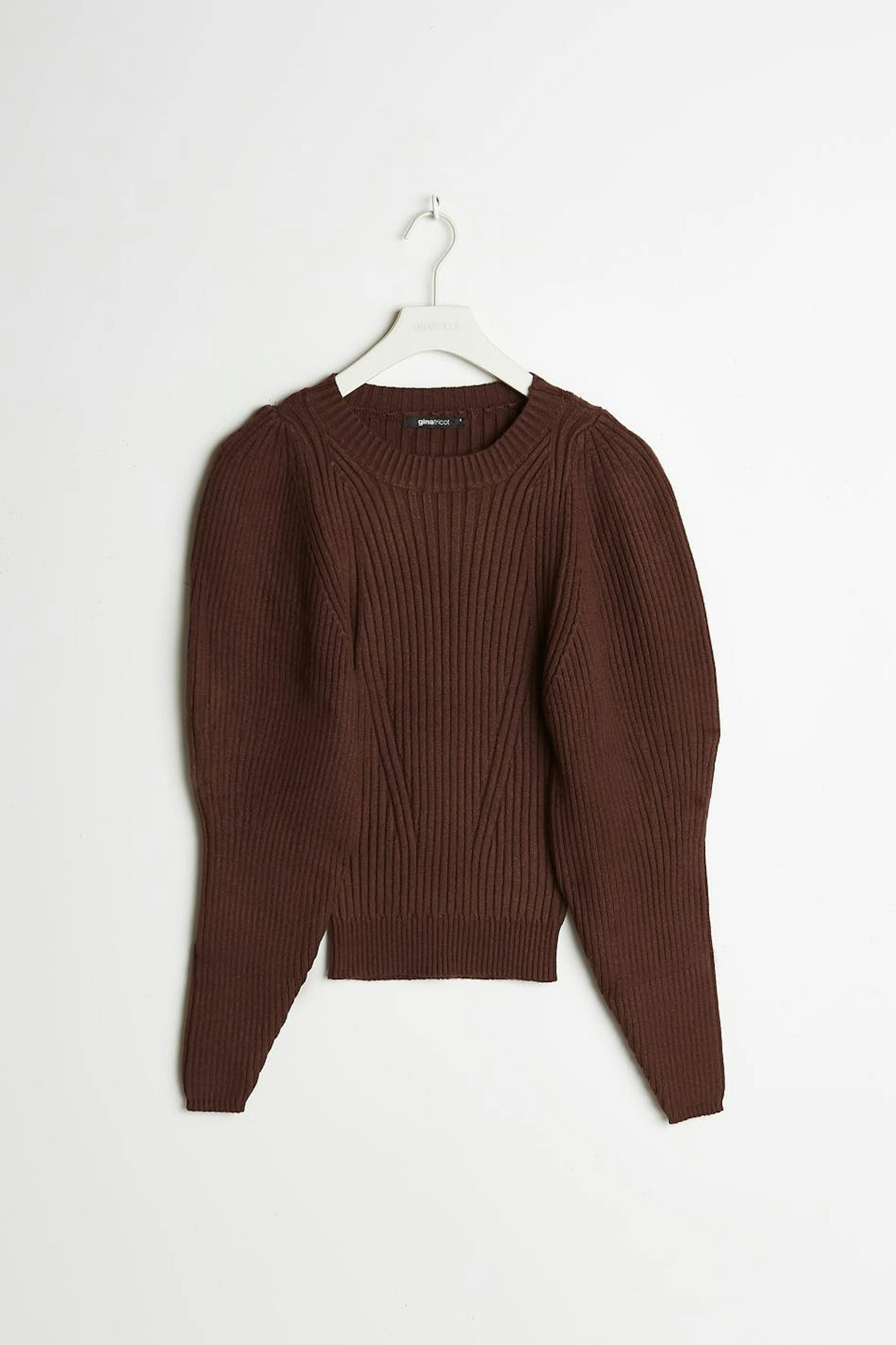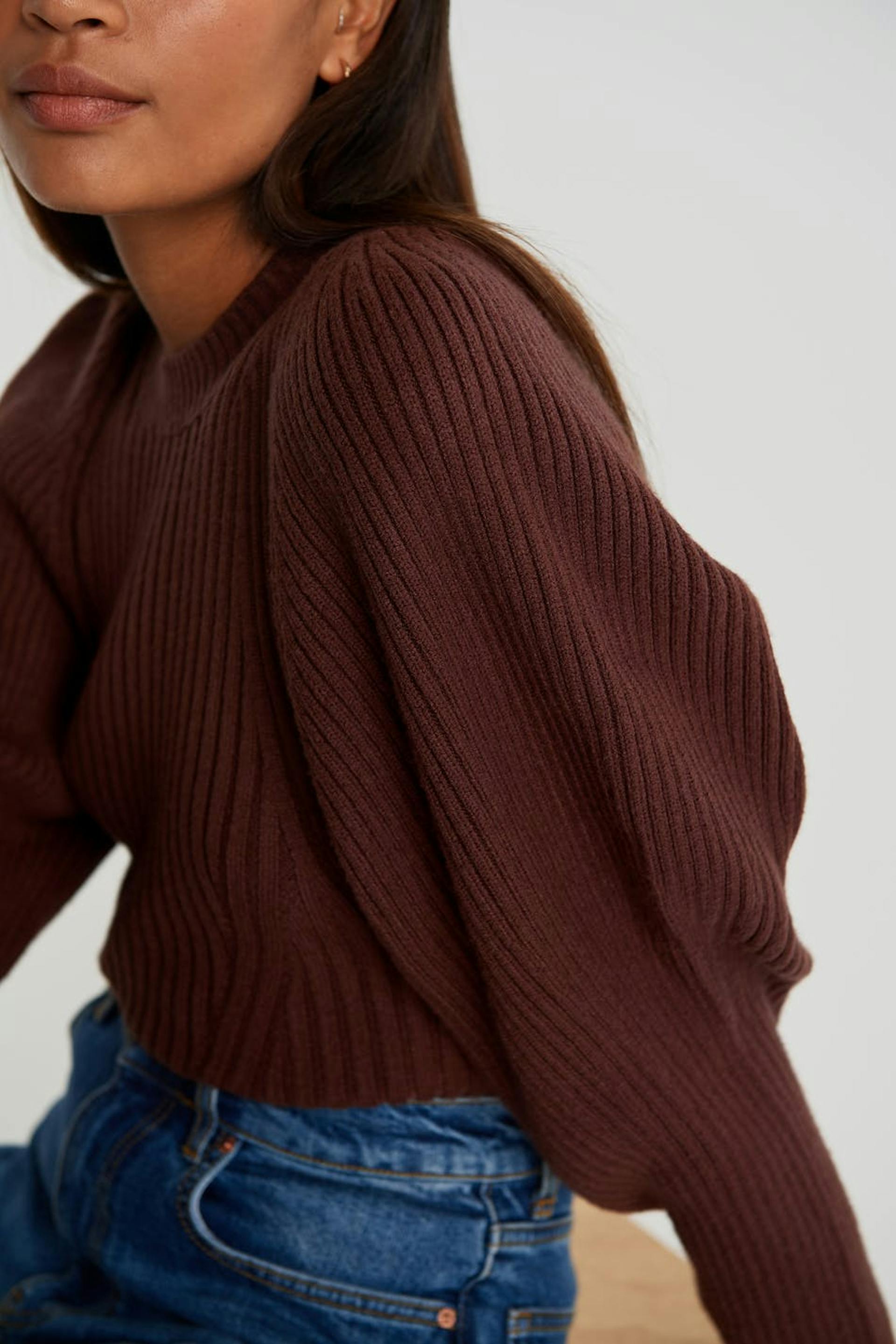 Strikket trøje med lange pufærmer. Trøjen er brun og ribbet.