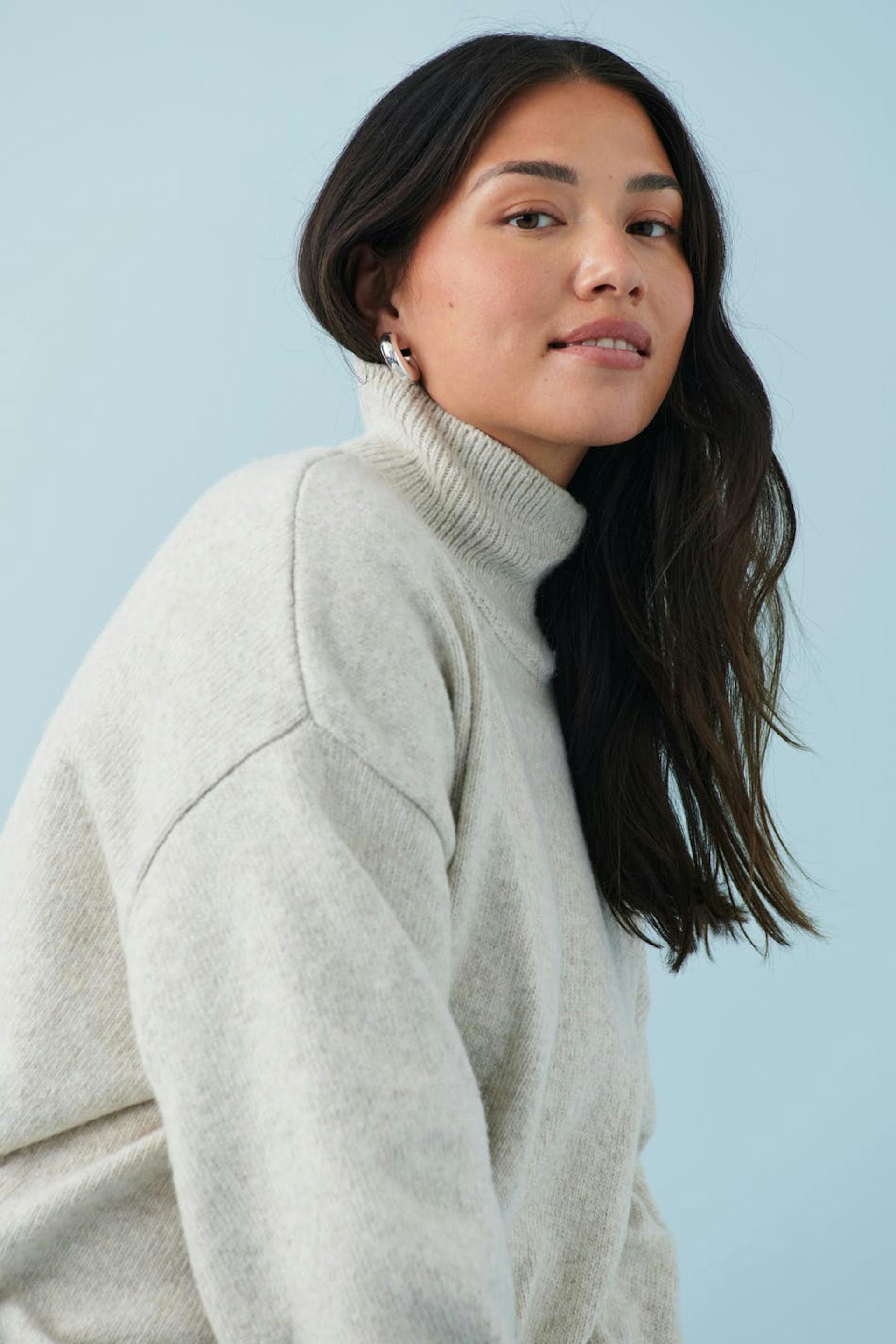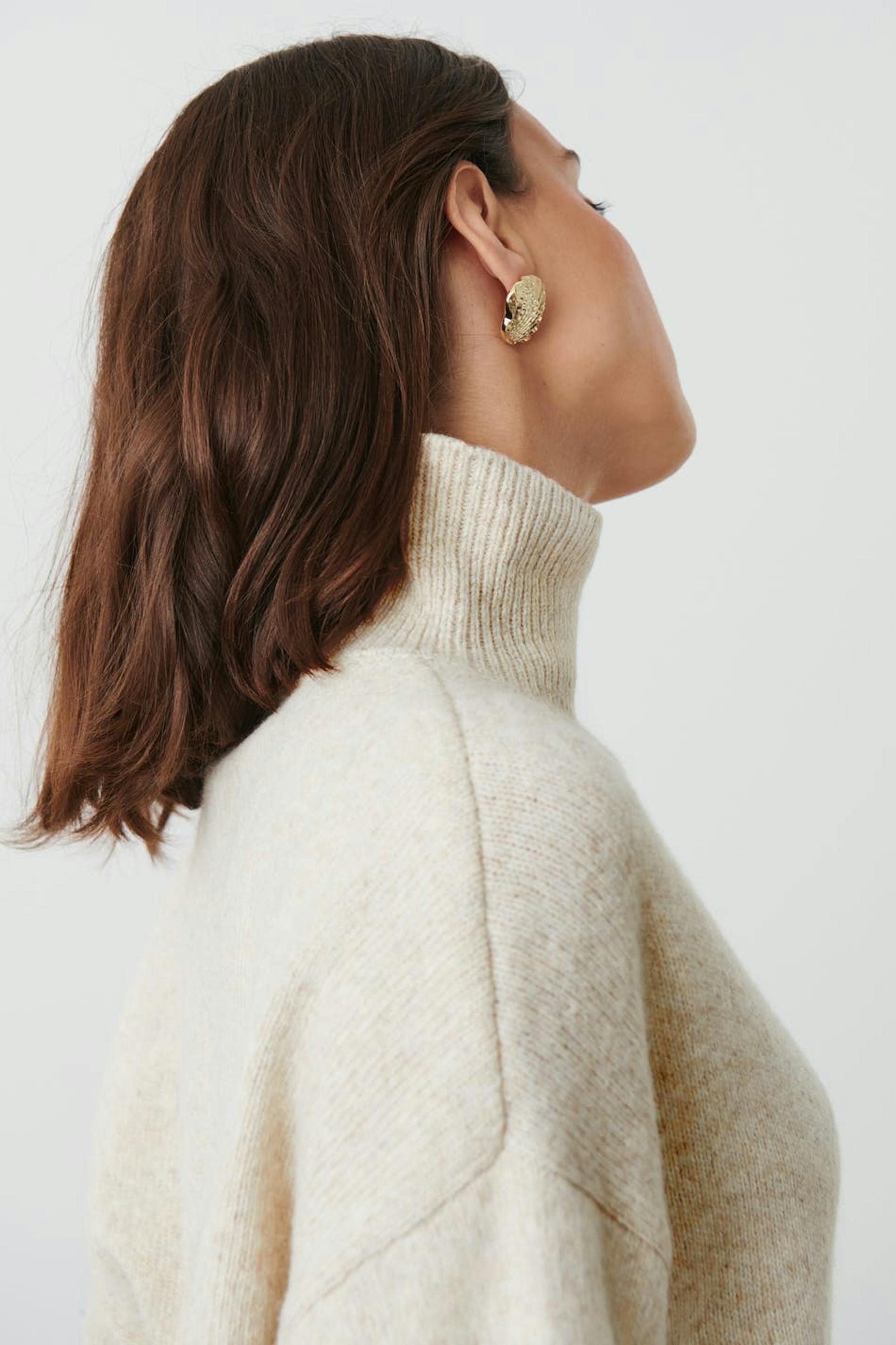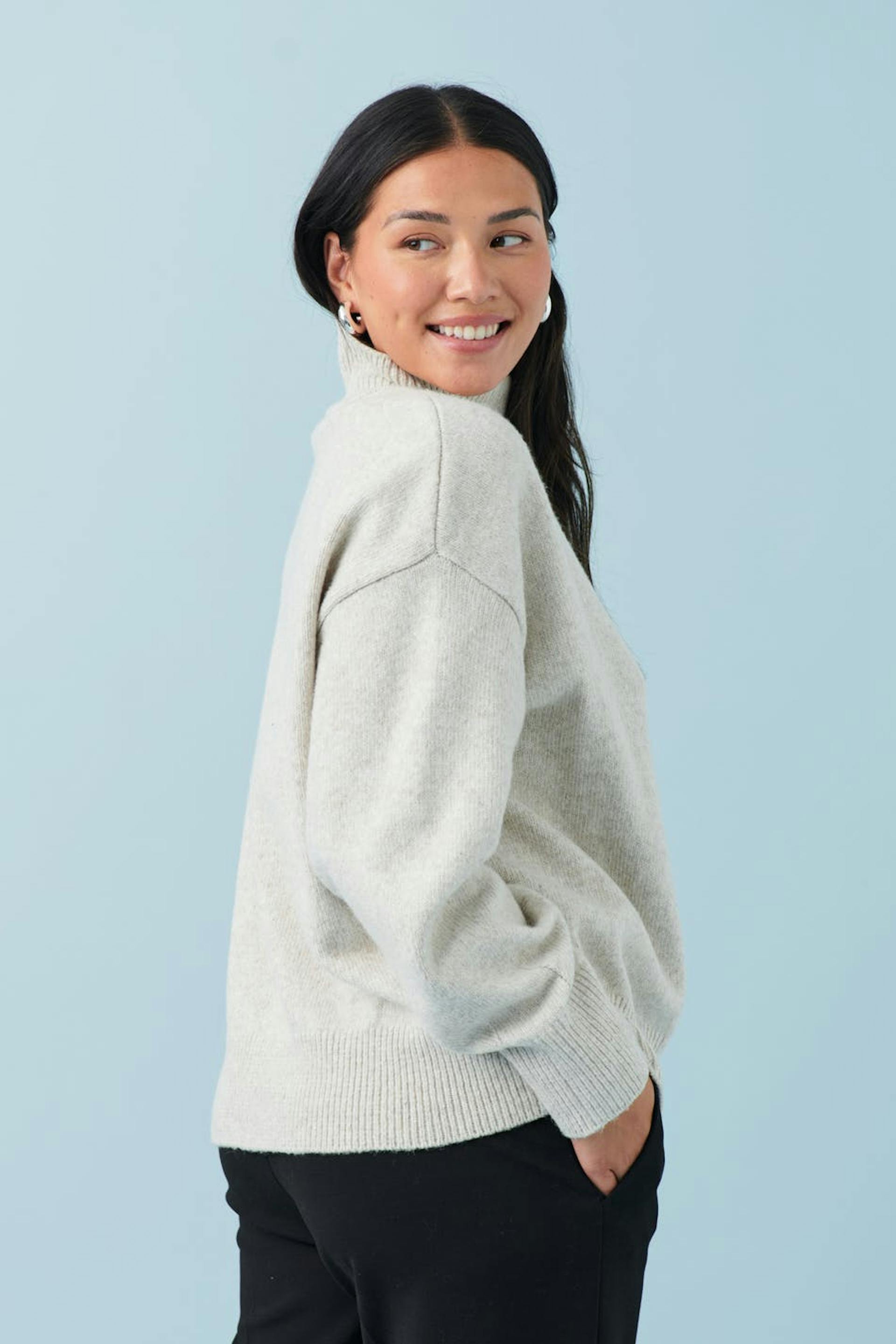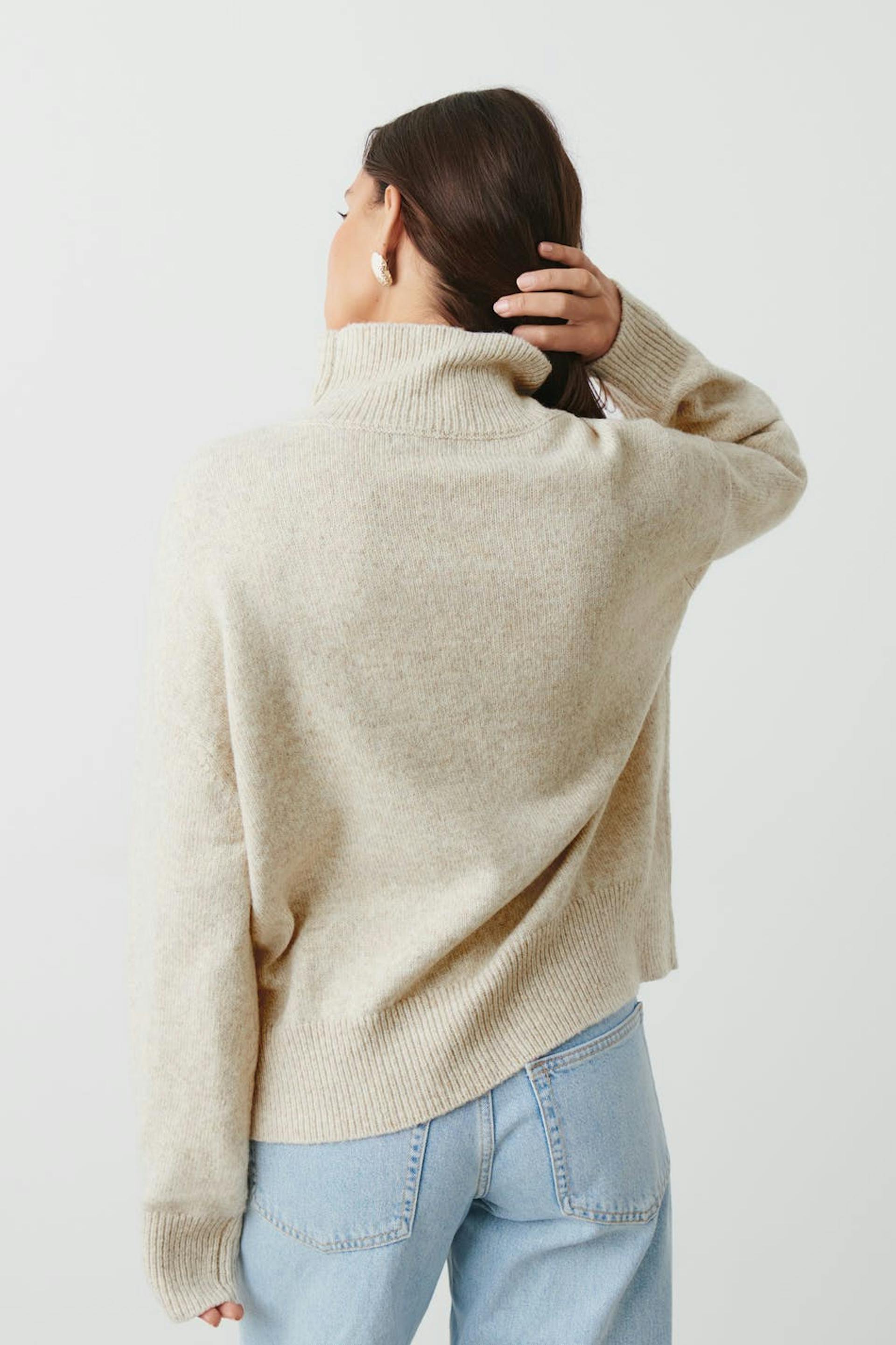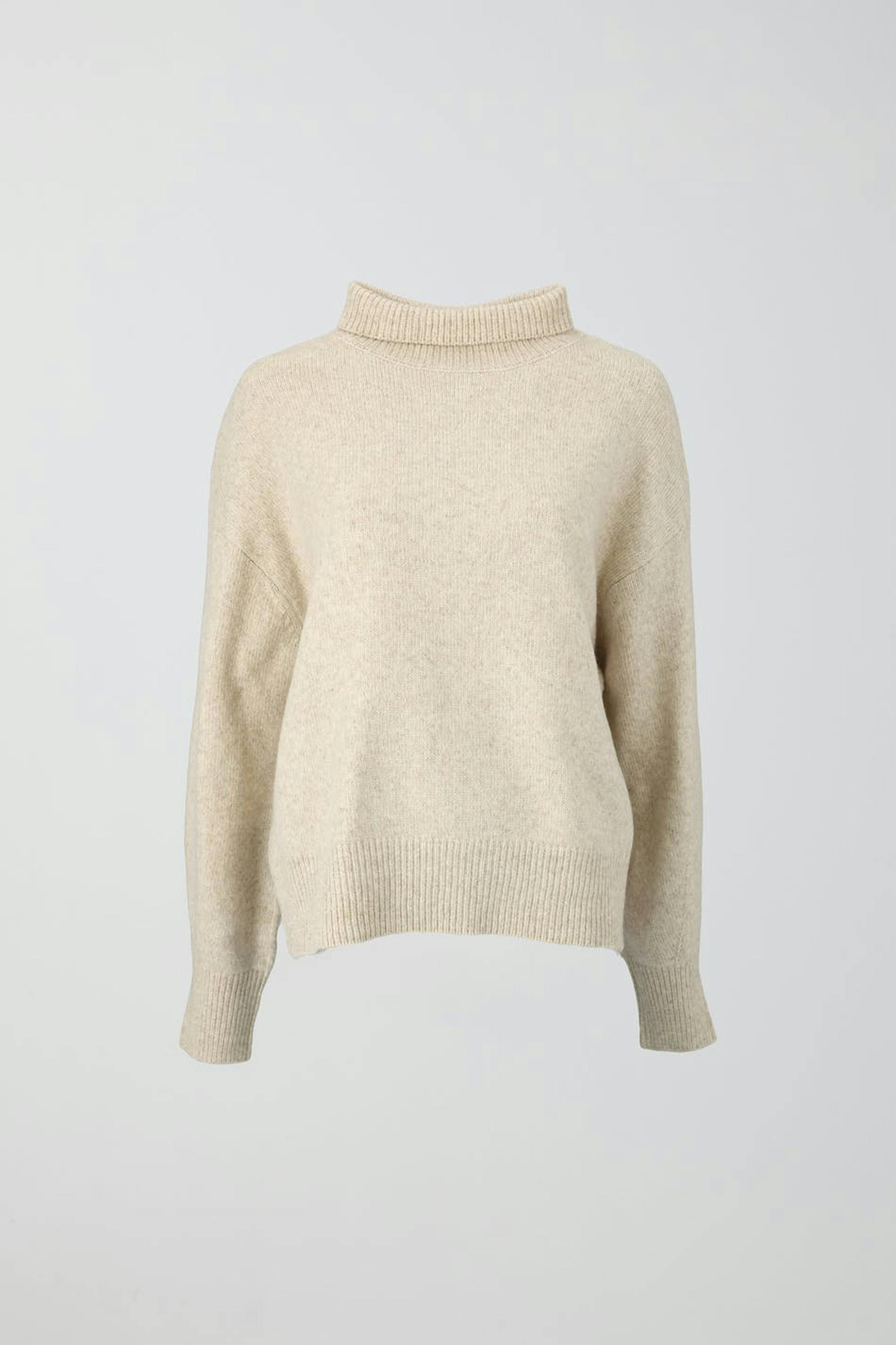 Striktrøje med ribbet turtleneck. Trøjen er beige og har oversize pasform. Den har langt ærme og ribstrikket kant.