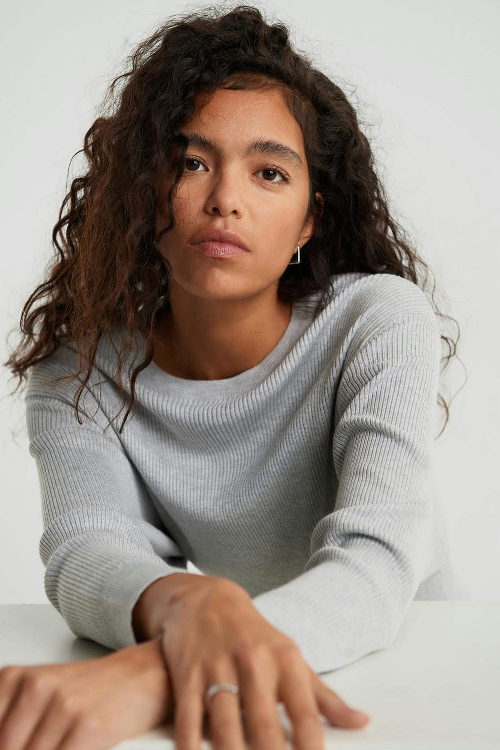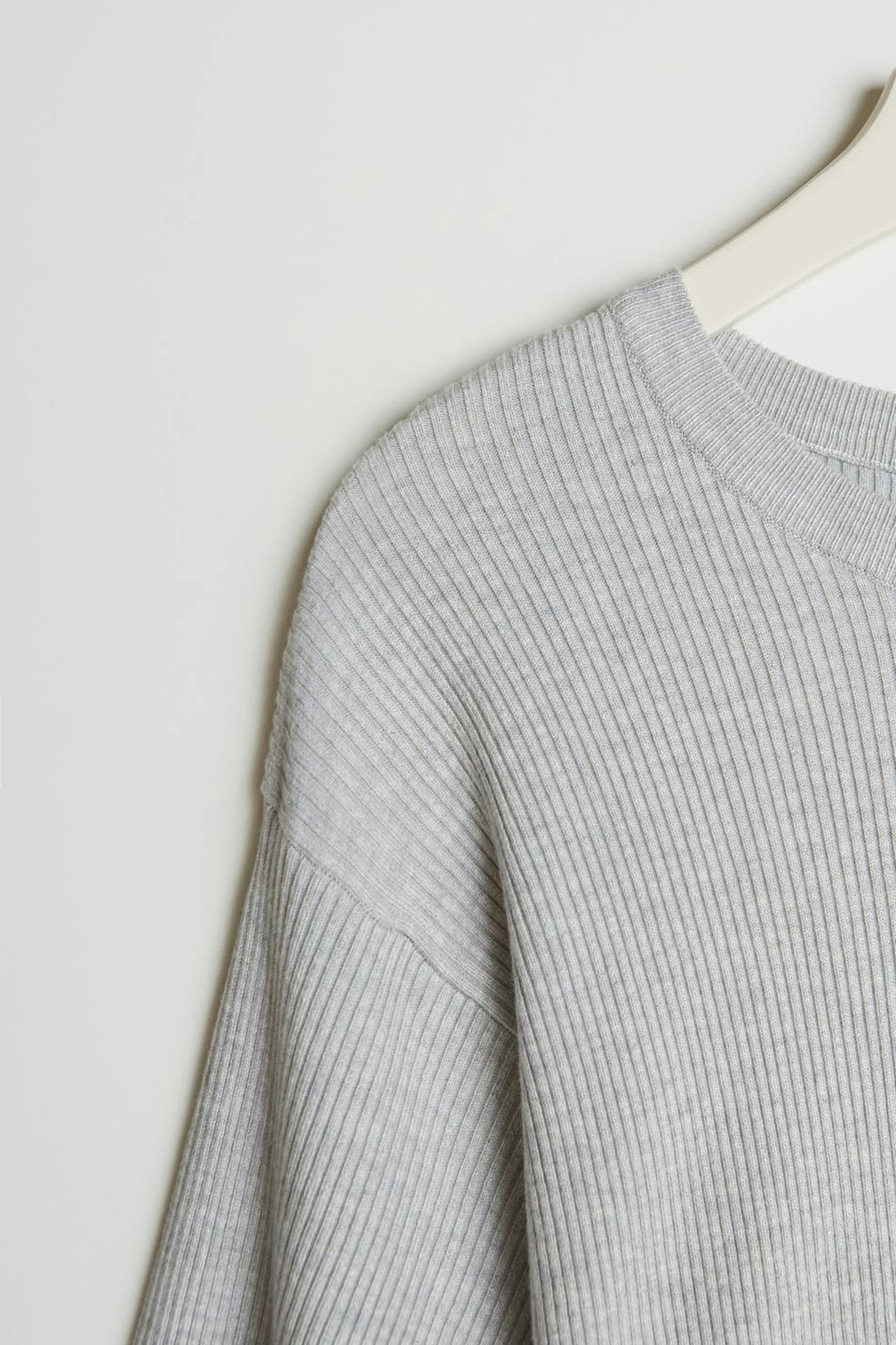Strikket jumper med en rummelig pasform. Jumperen er grå og har dybe [arm_holes_48137].
