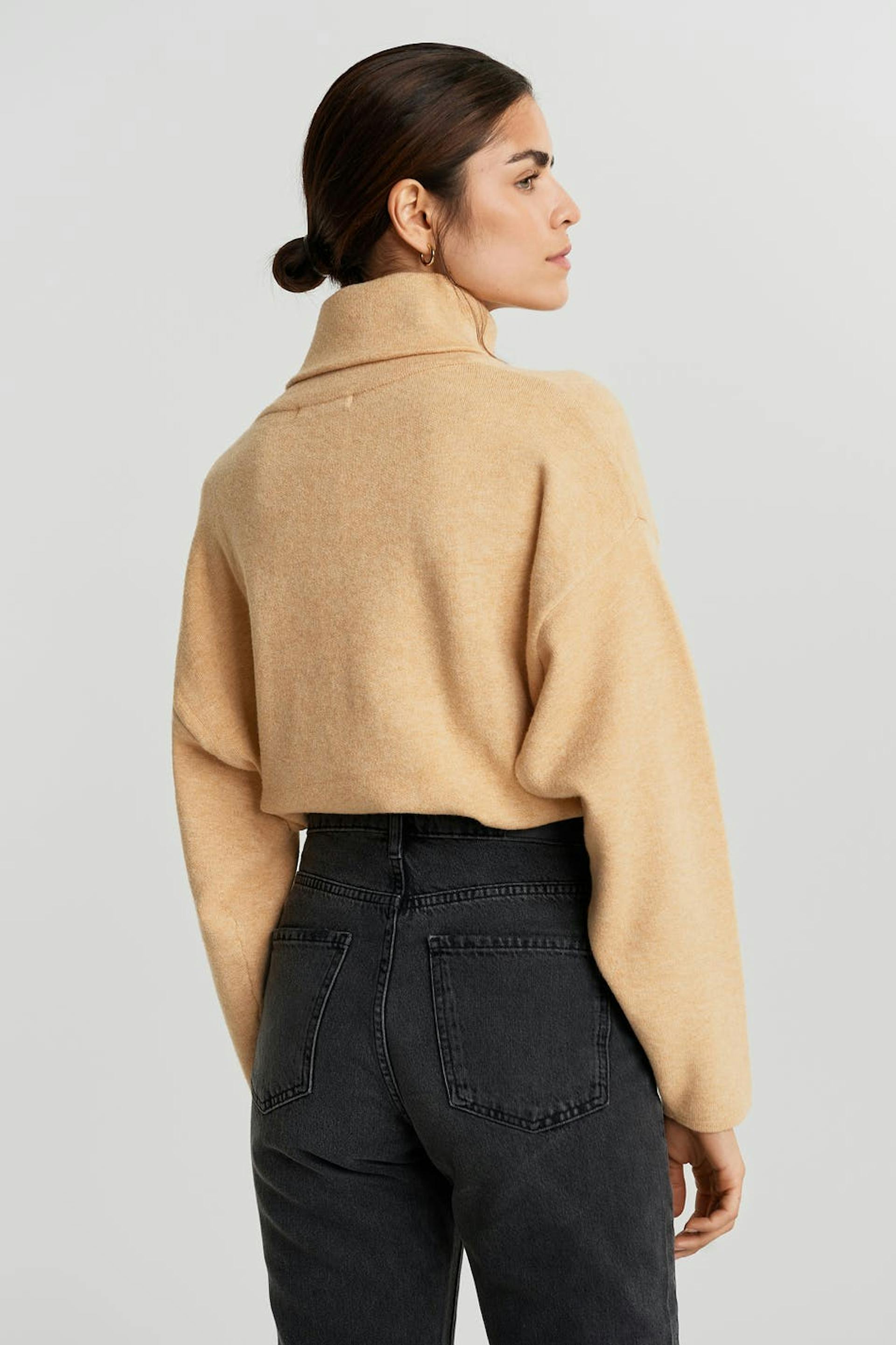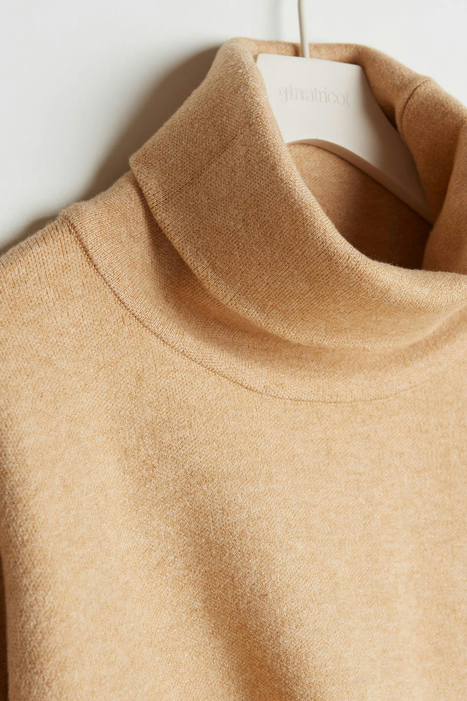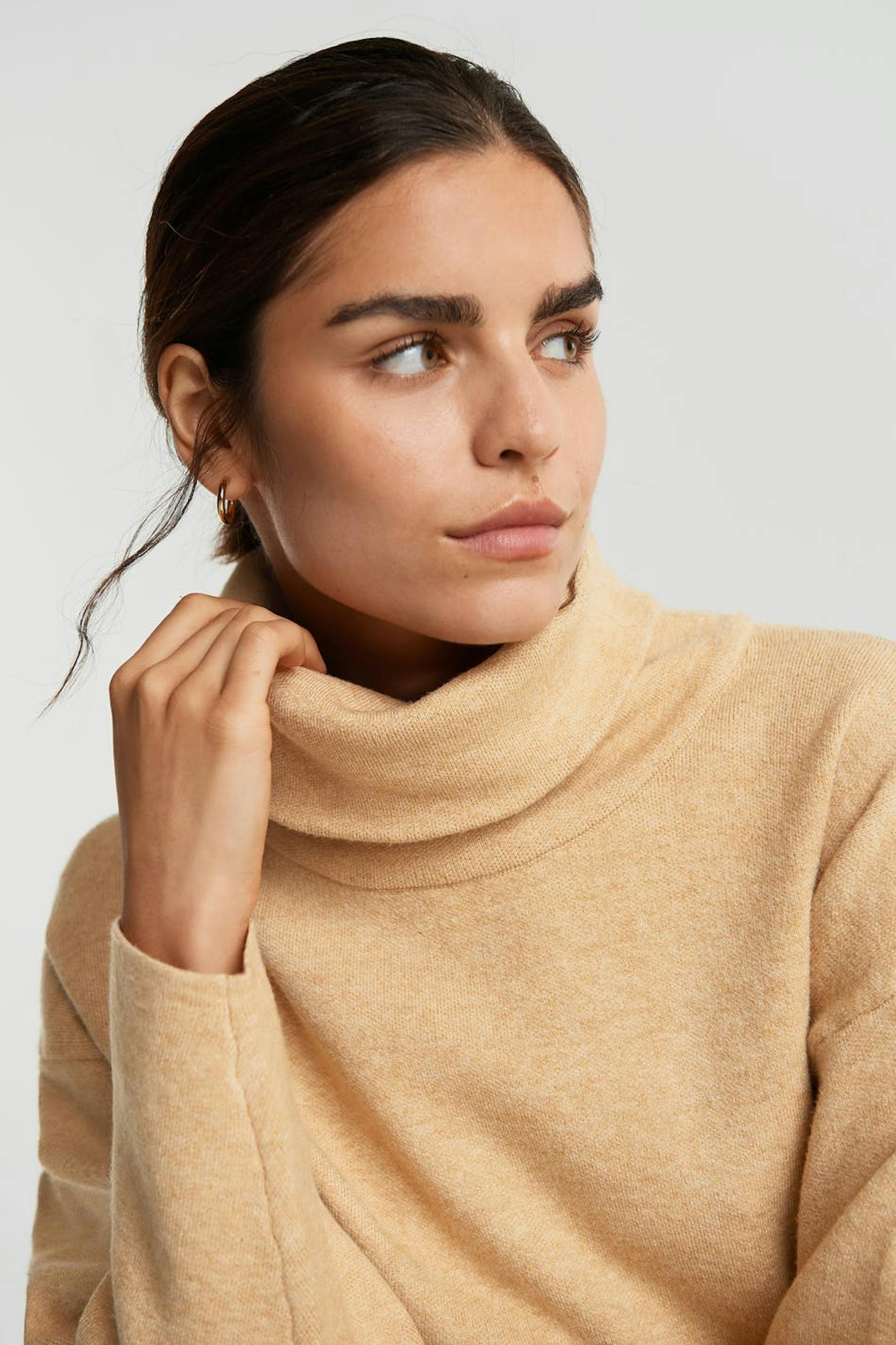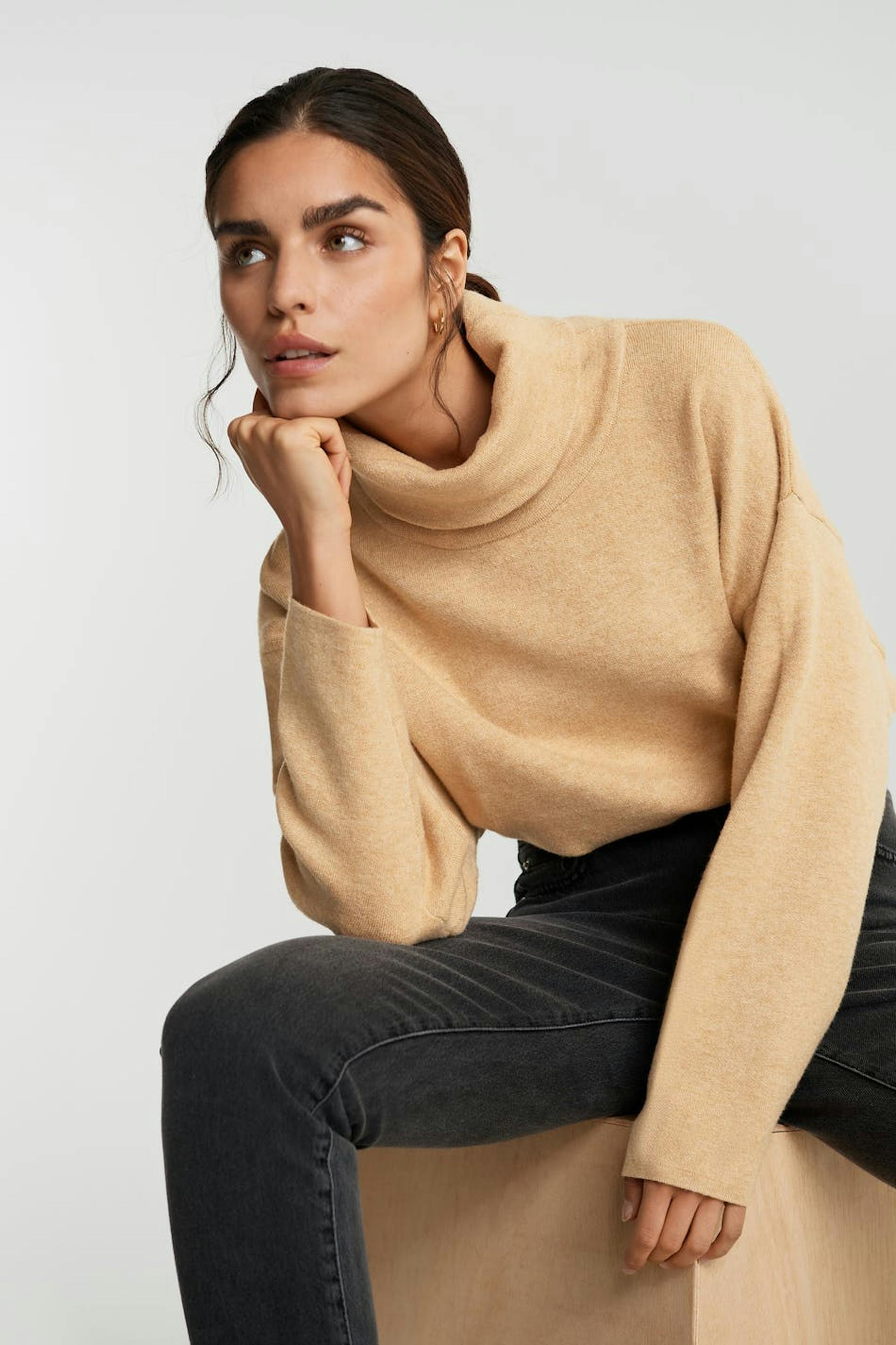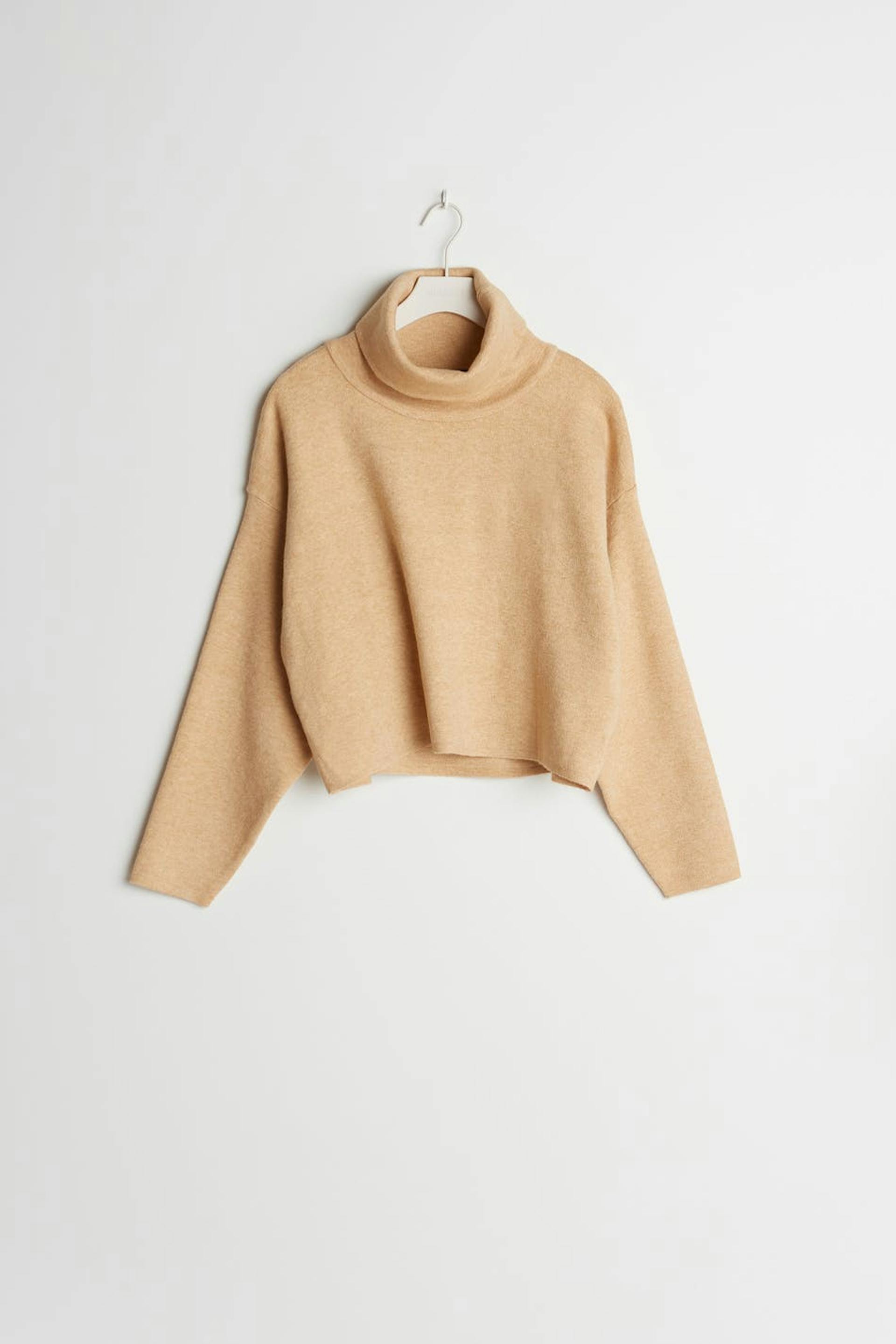 Langærmet jumper med en turtleneck. Jumperen er beige.