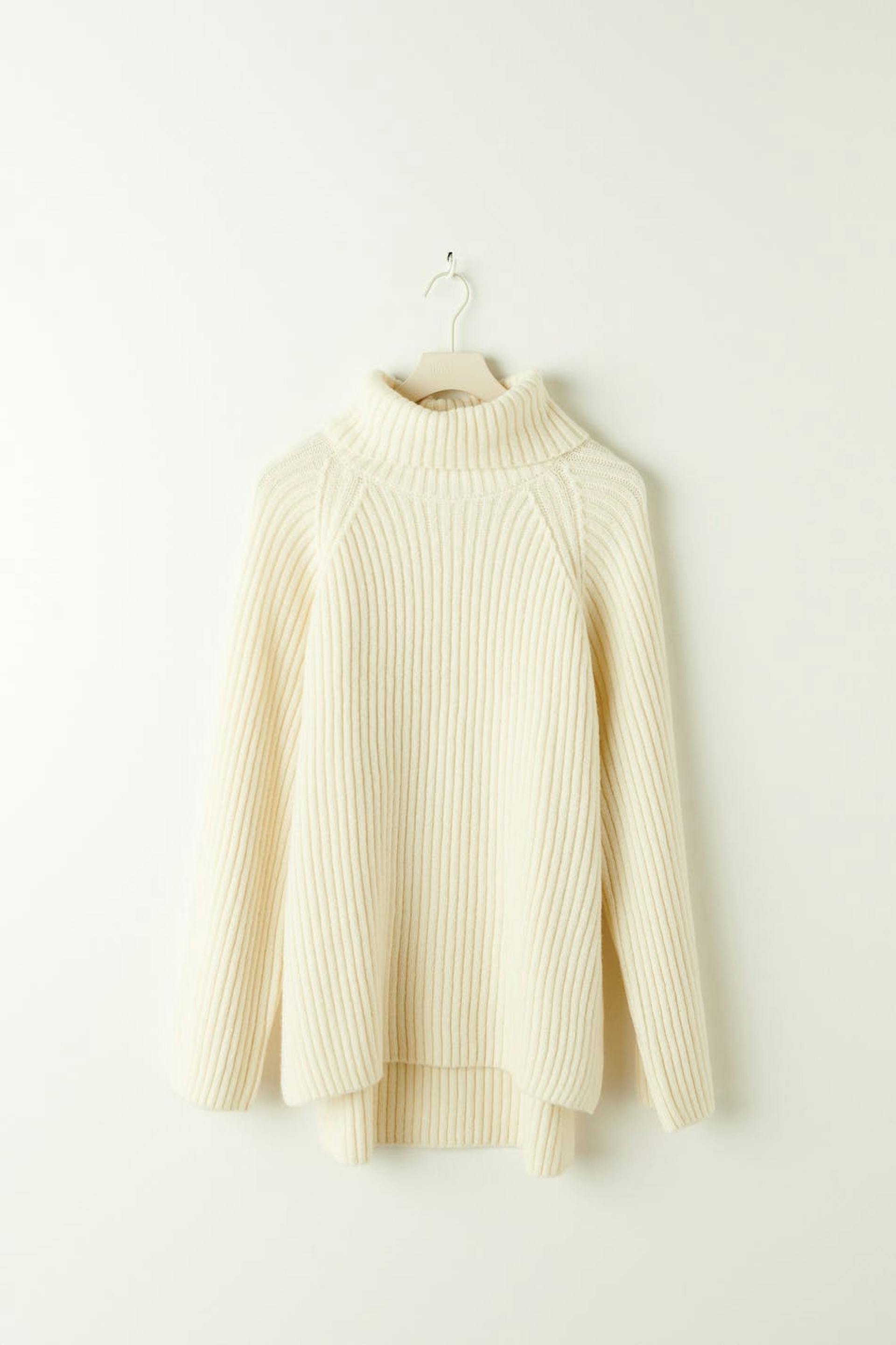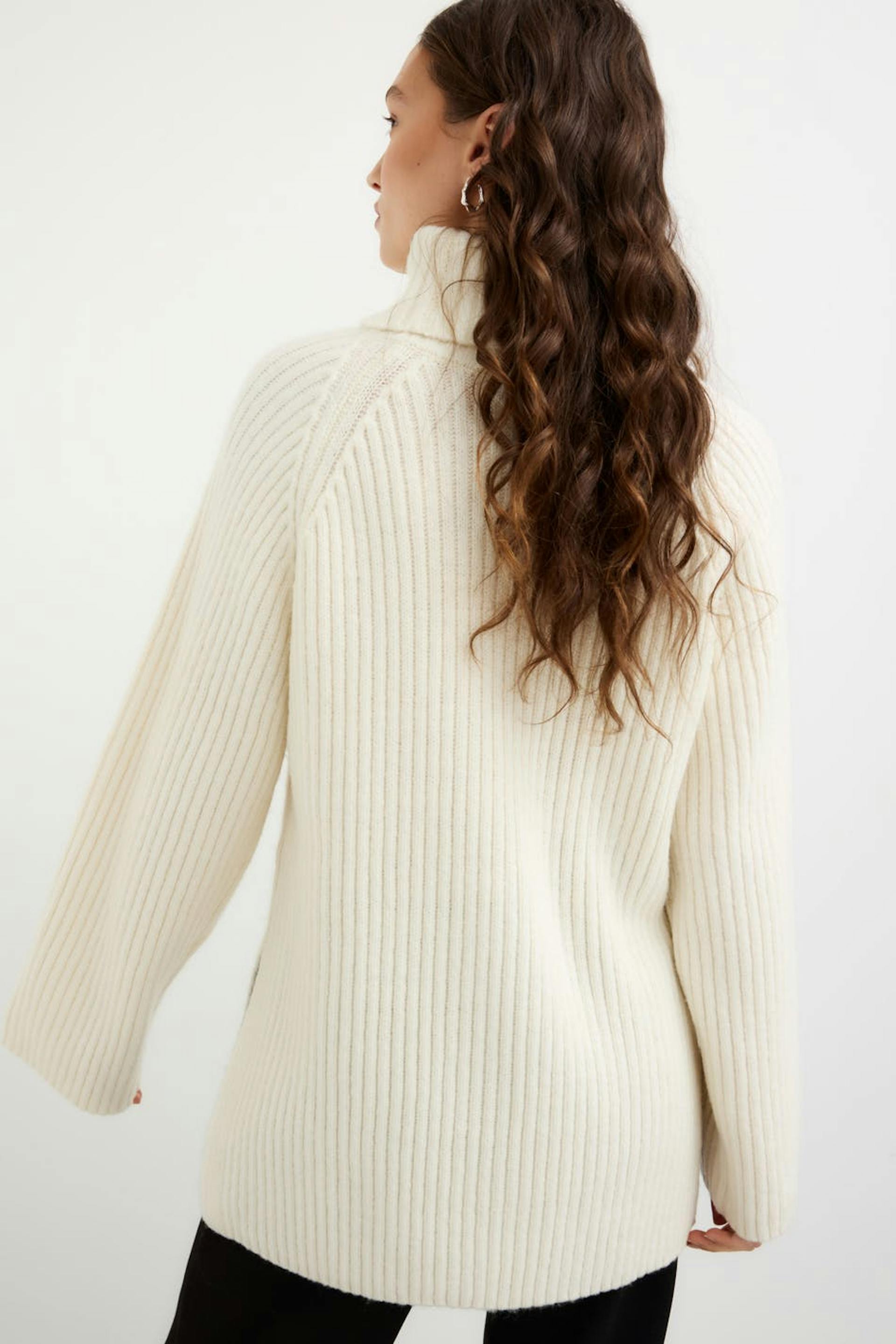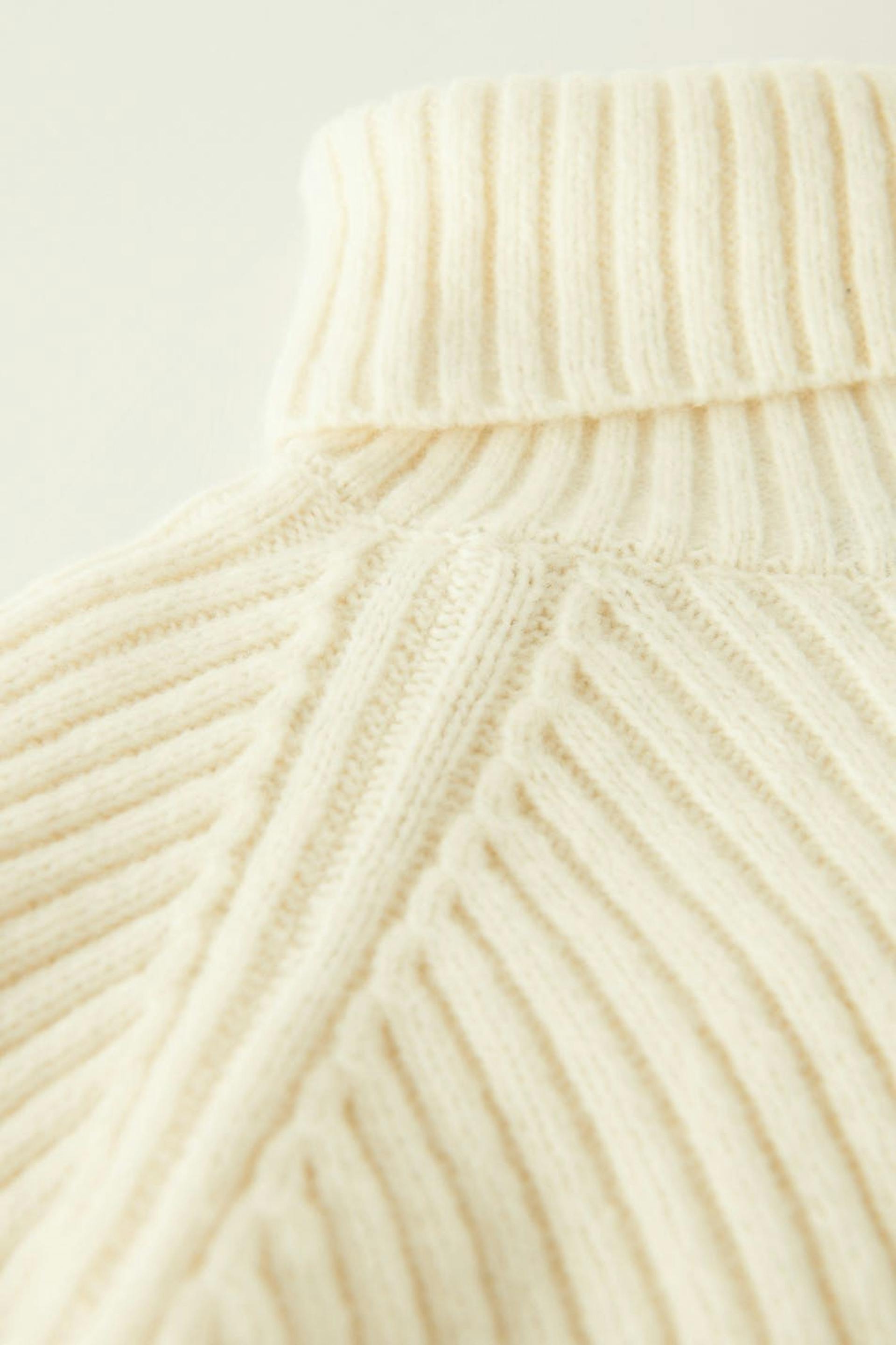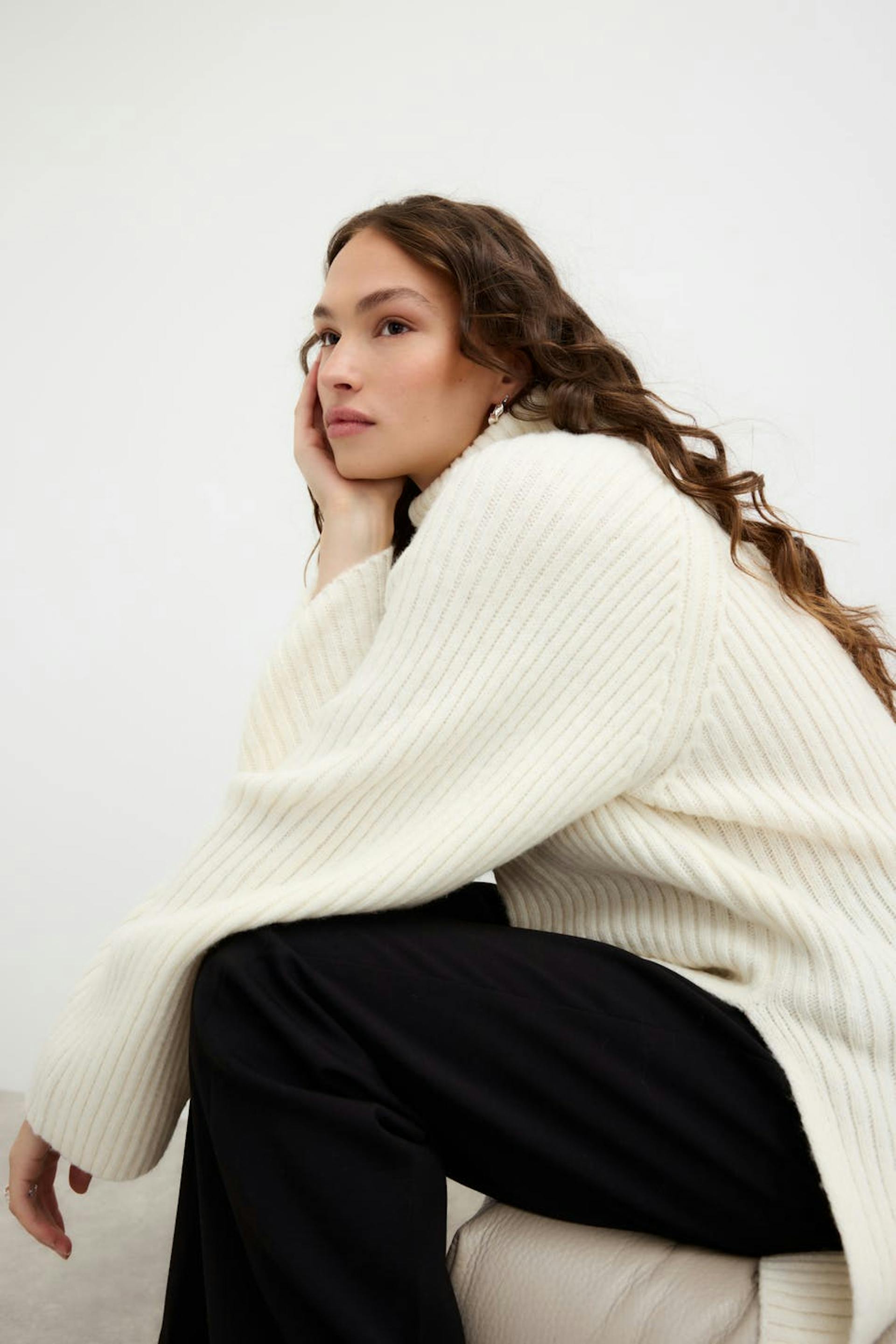 Strikket trøje i blød kvalitet med nedadvendt turtleneck. Trøjen er hvid og har boxy pasform. Den har raglanærmer og slids i siderne.