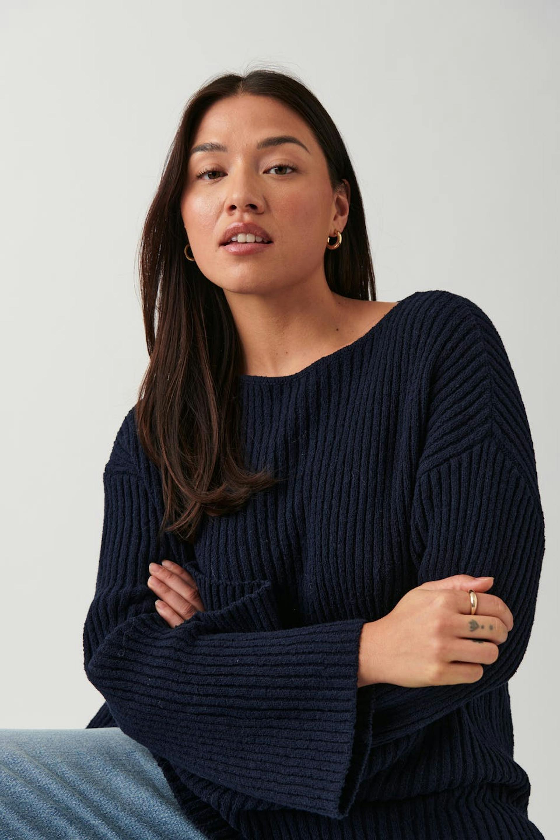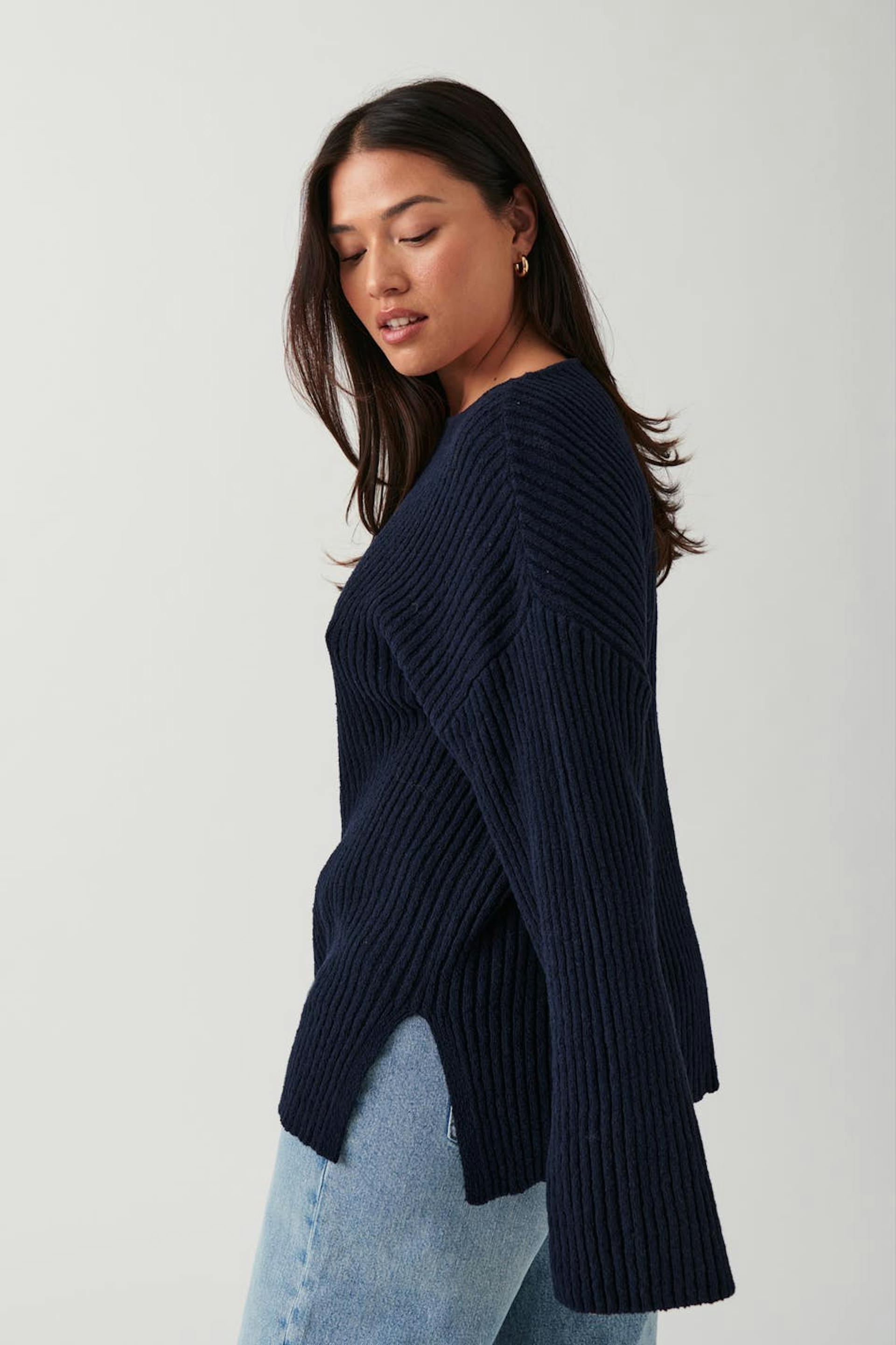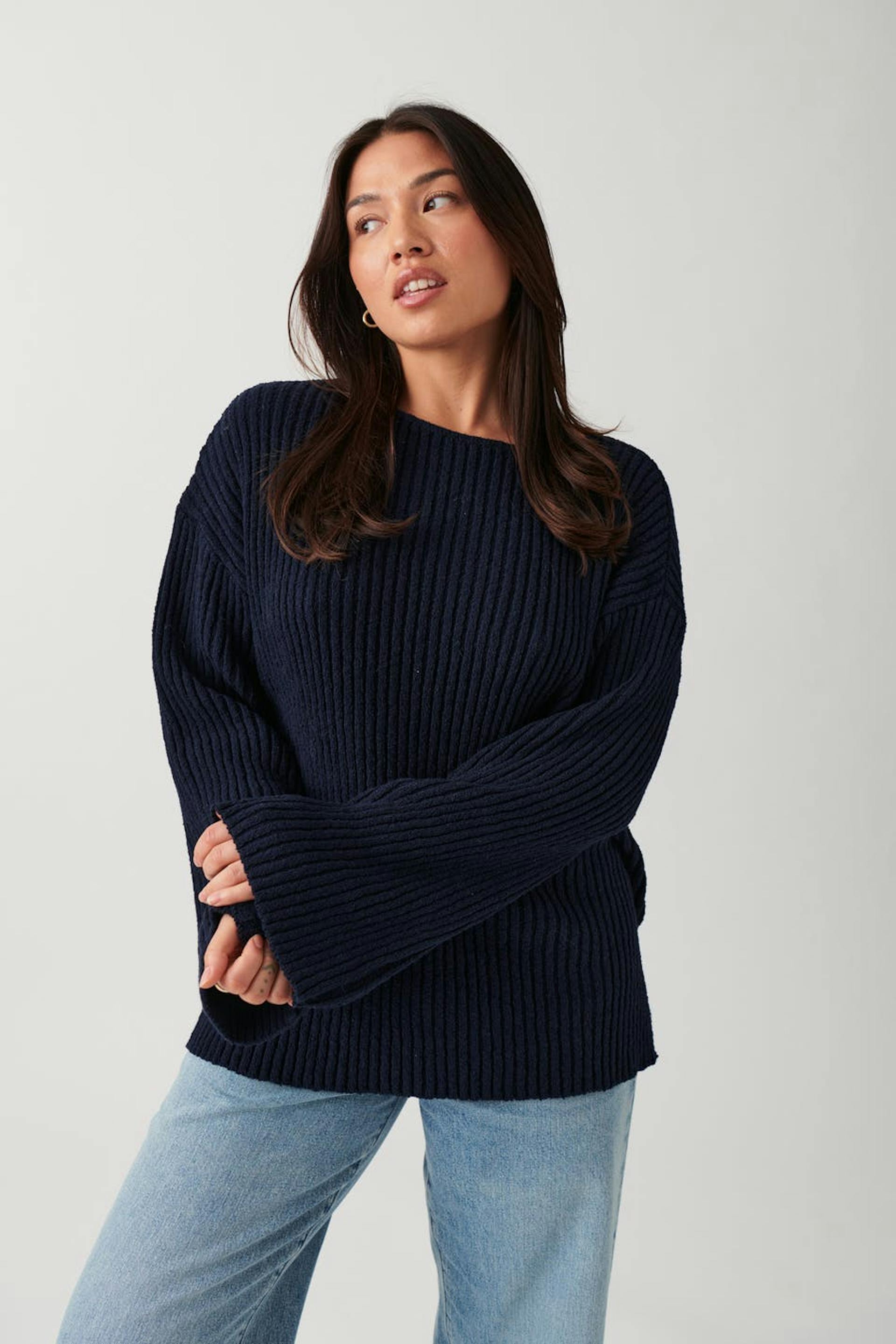 Striktrøje med bådudskæring. Trøjen er blå og har slids i siderne. Den har langt ærme og lav skulder.