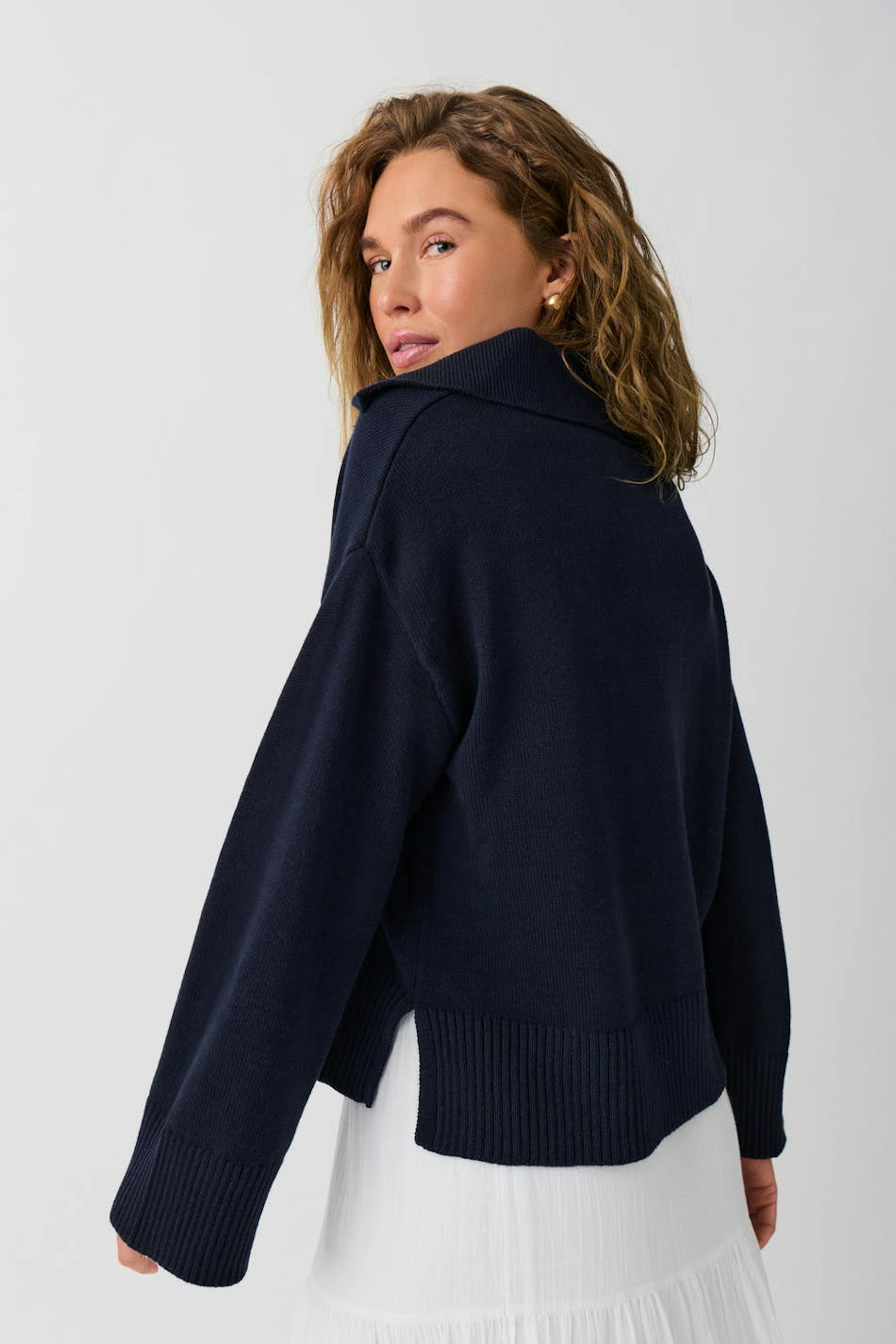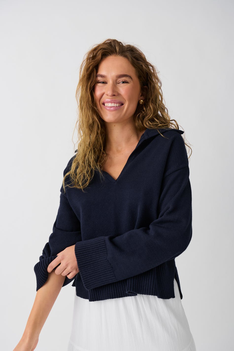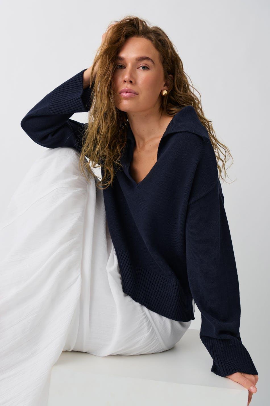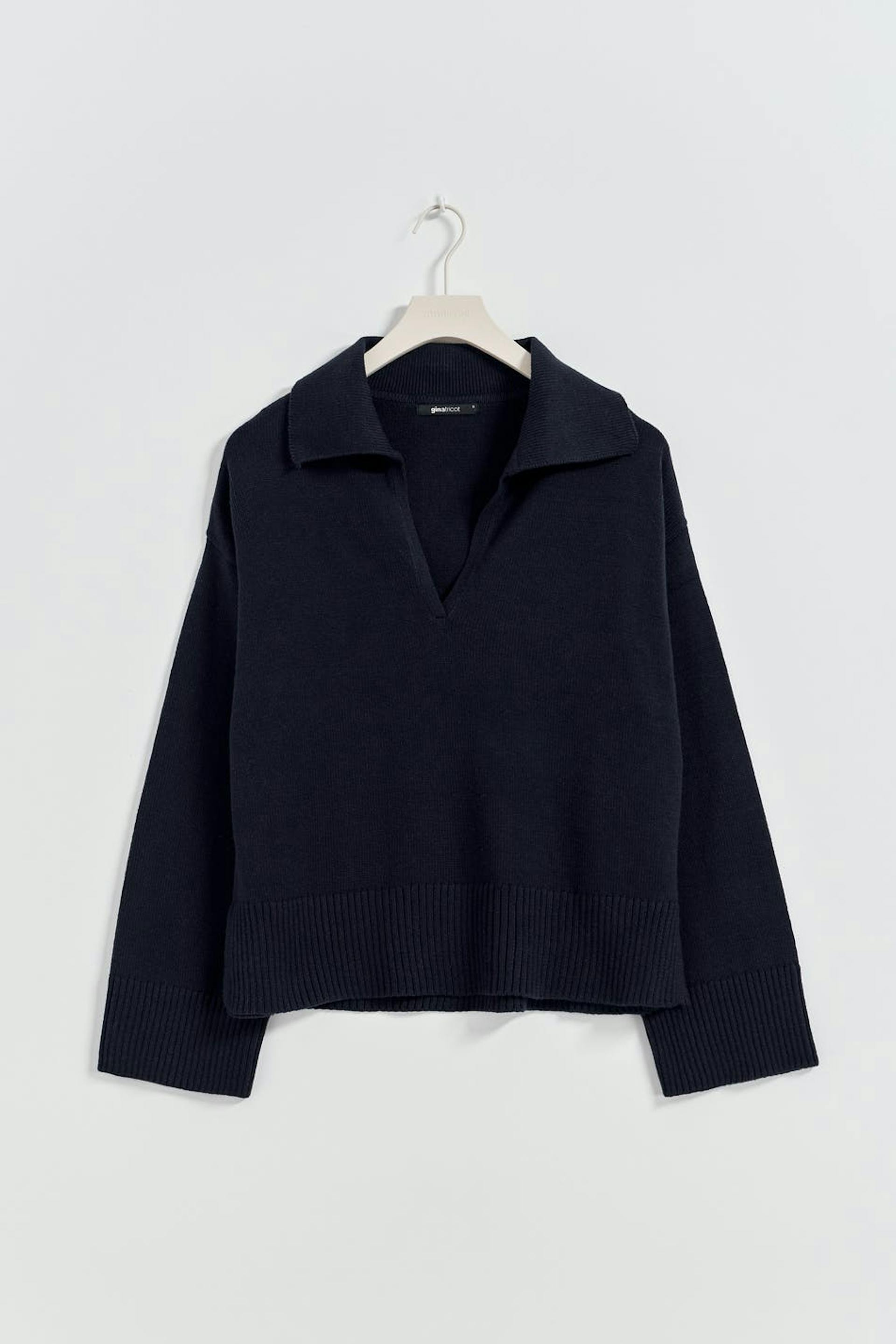 Striktrøje med boxy pasform. Trøjen er blå og har v-udskæring. Den har stor krave, slids i siderne og ribstrik ved den nederste kant.