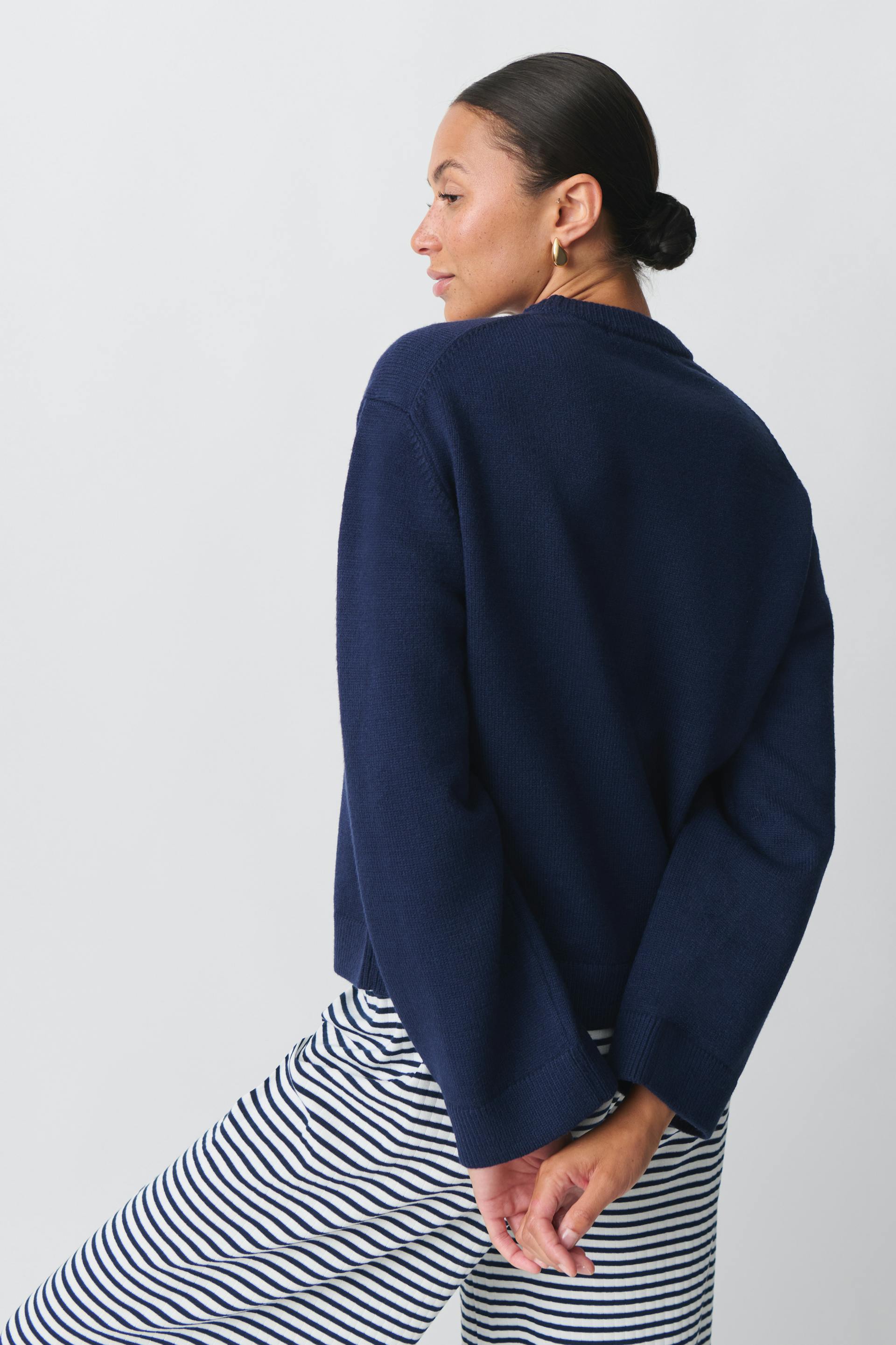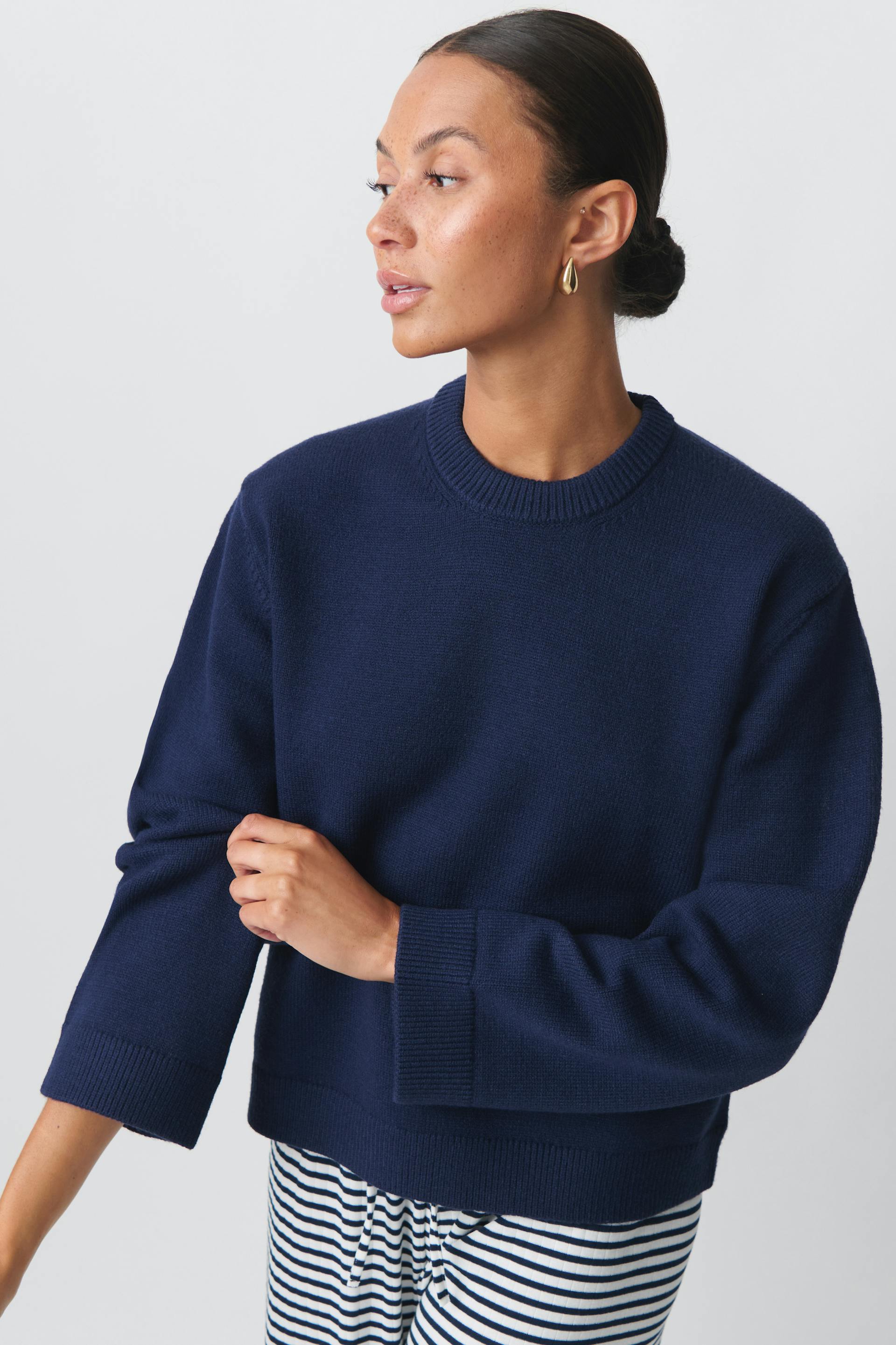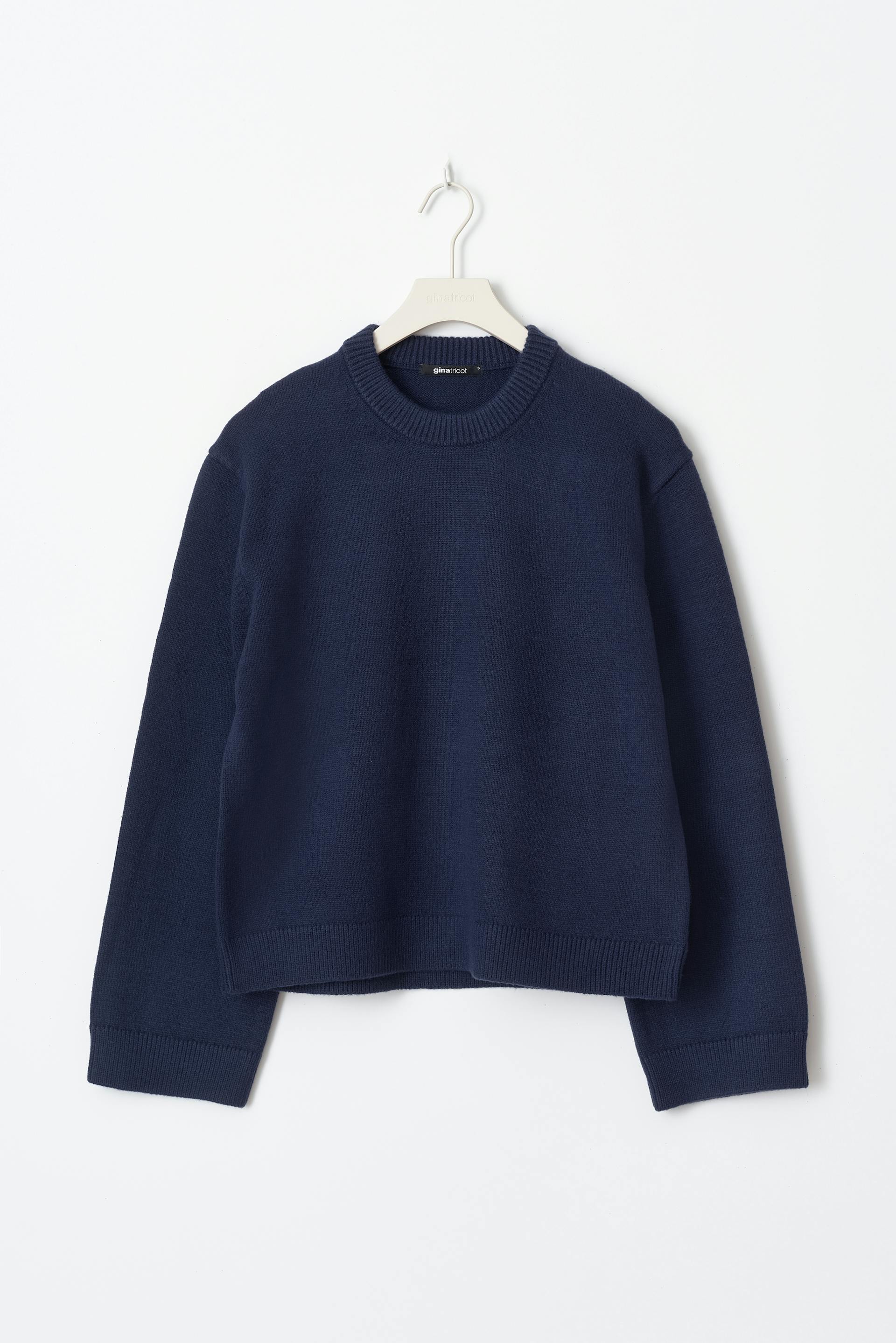 Striktrøje med normal pasform. Trøjen er blå og har rund halsudskæring. Den har langt ærme og ribstrik ved ærmekanter og ved den nederste kant.