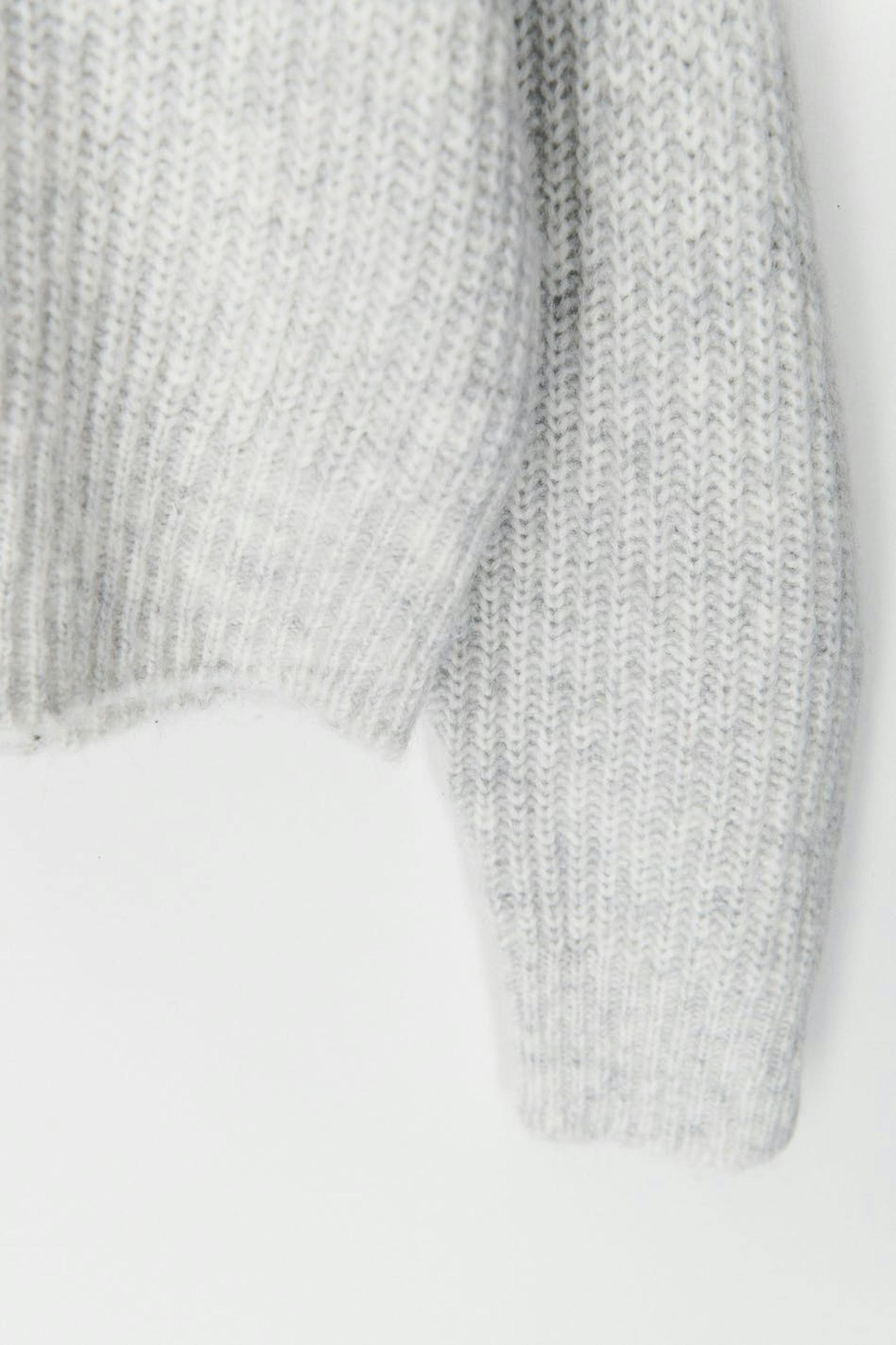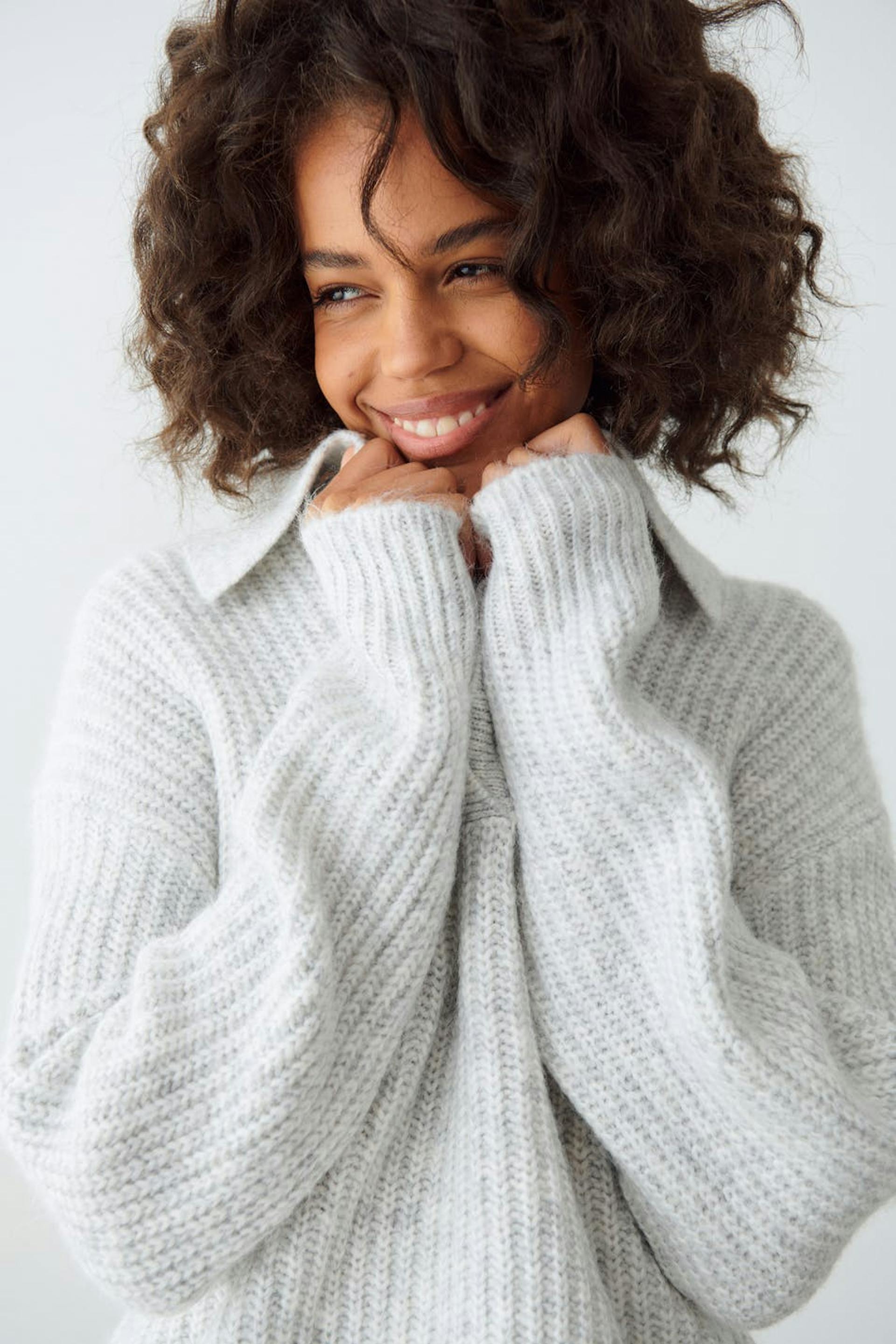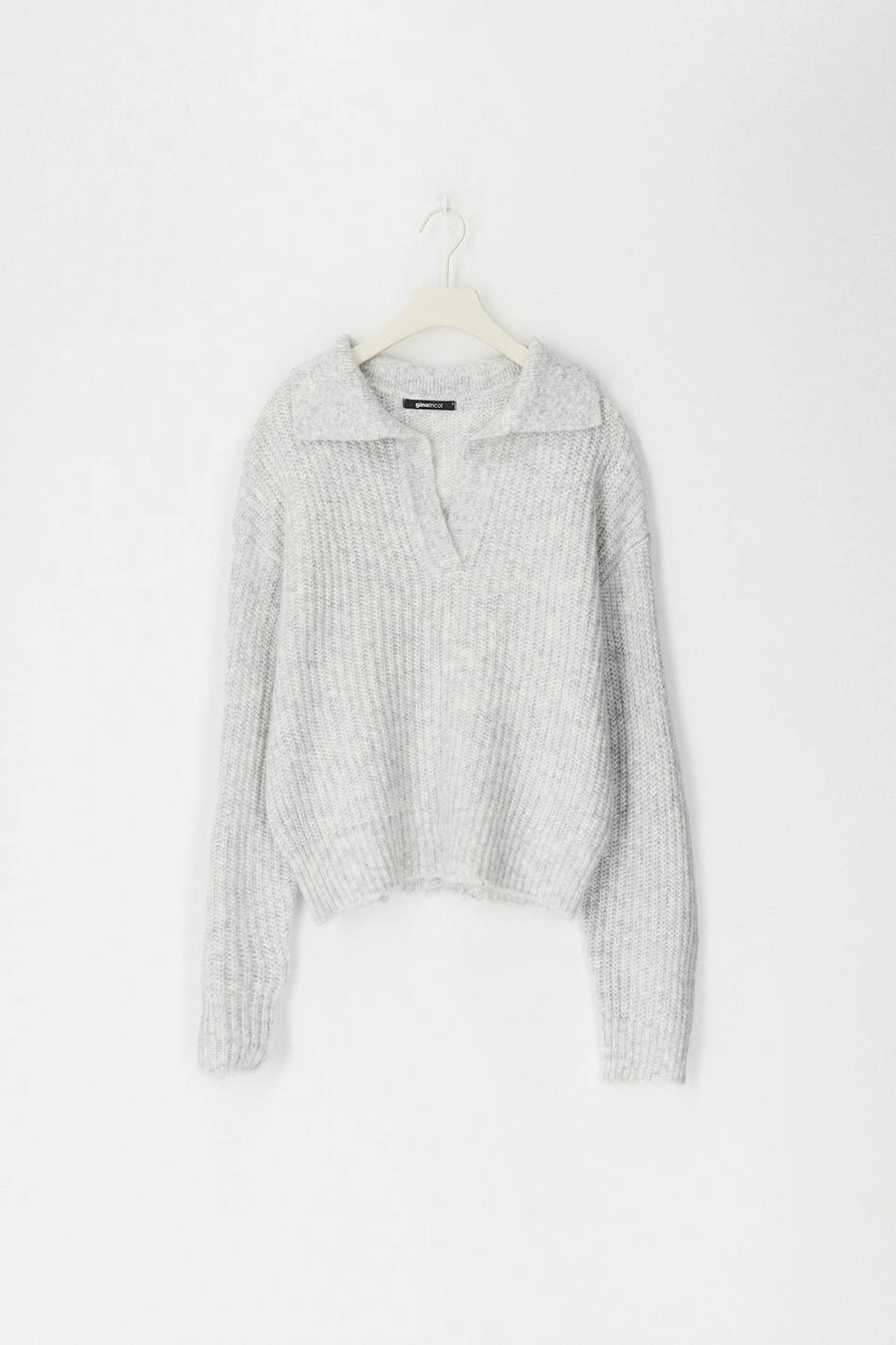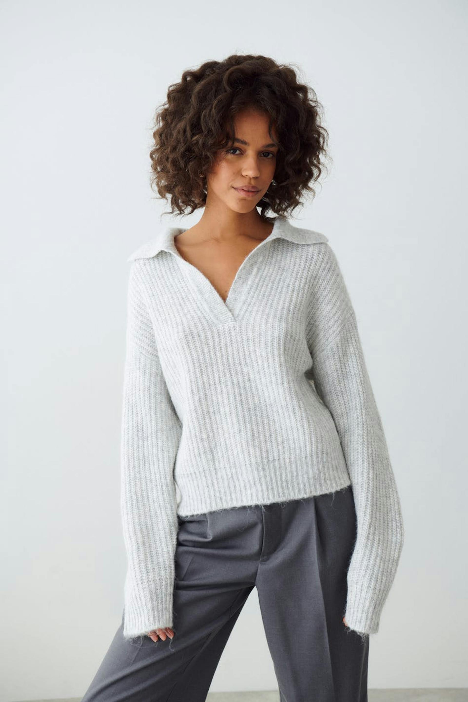 Striktrøje med boxy pasform. Trøjen er grå og har krave med overfald med V-hals.