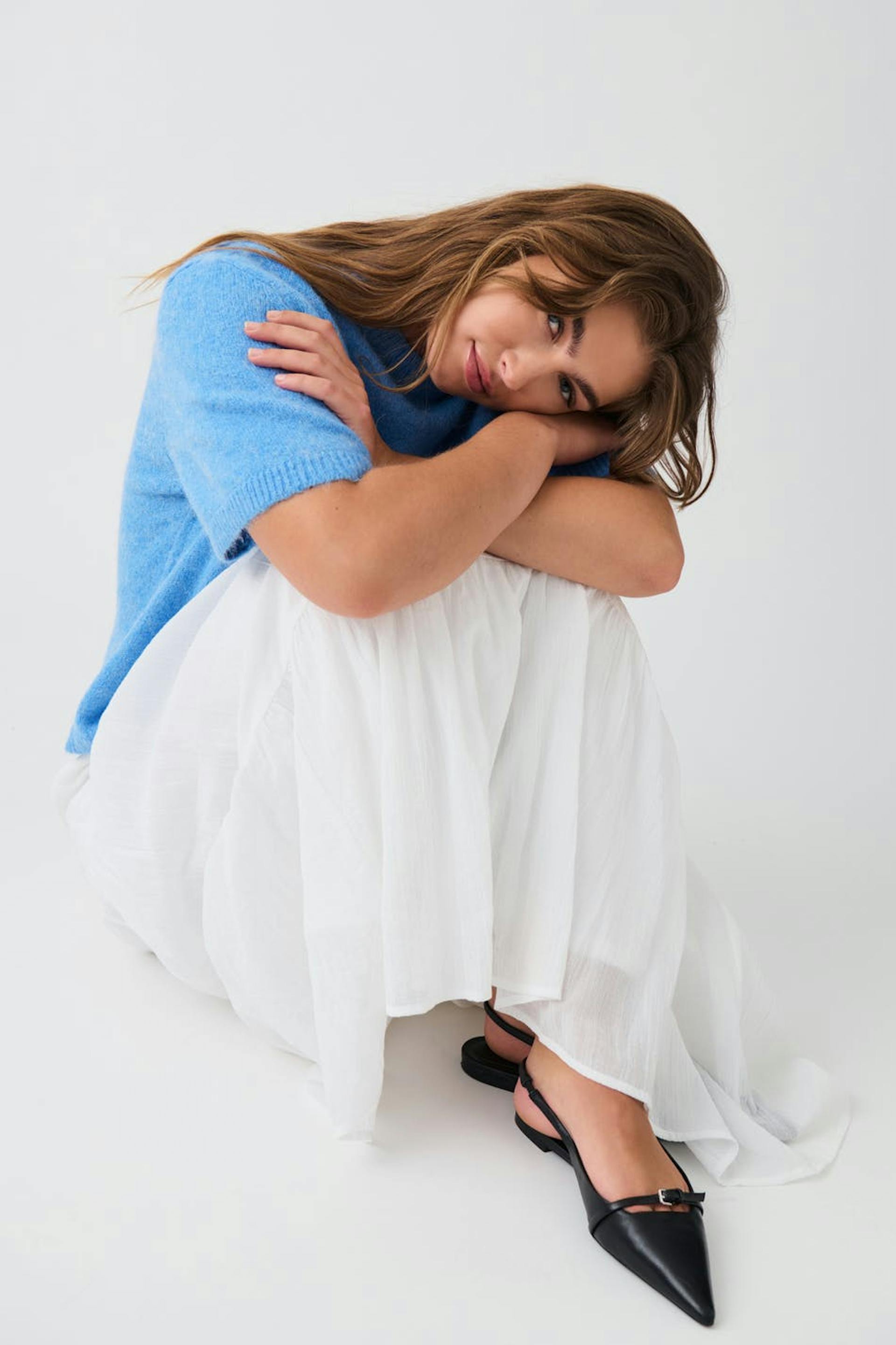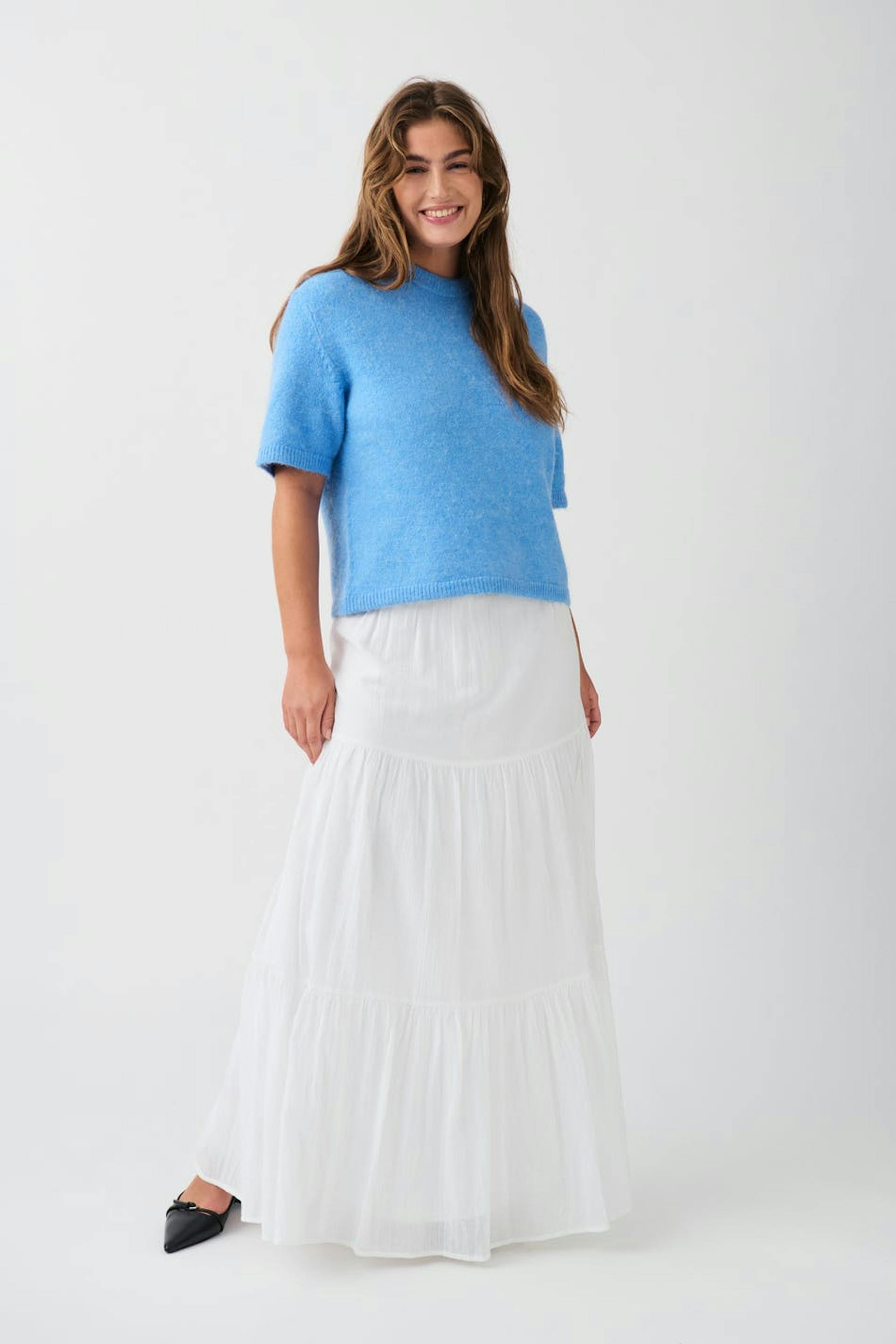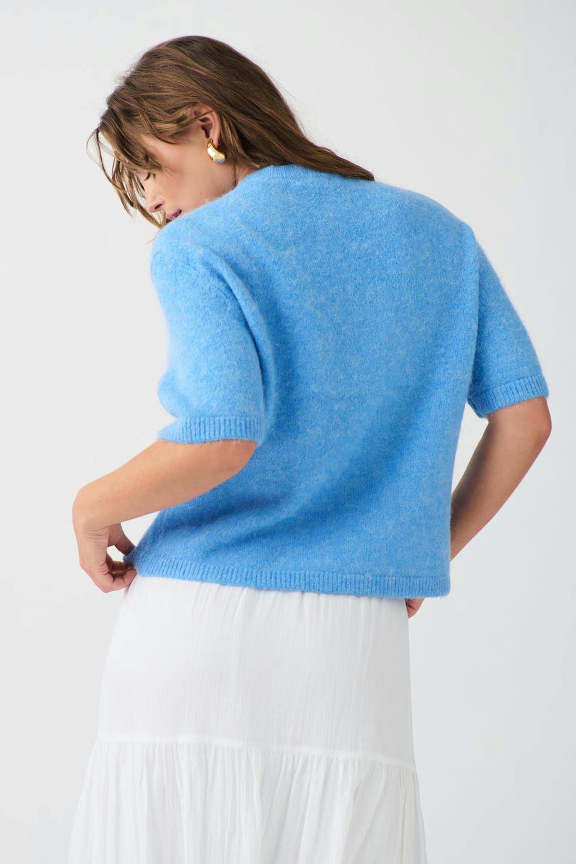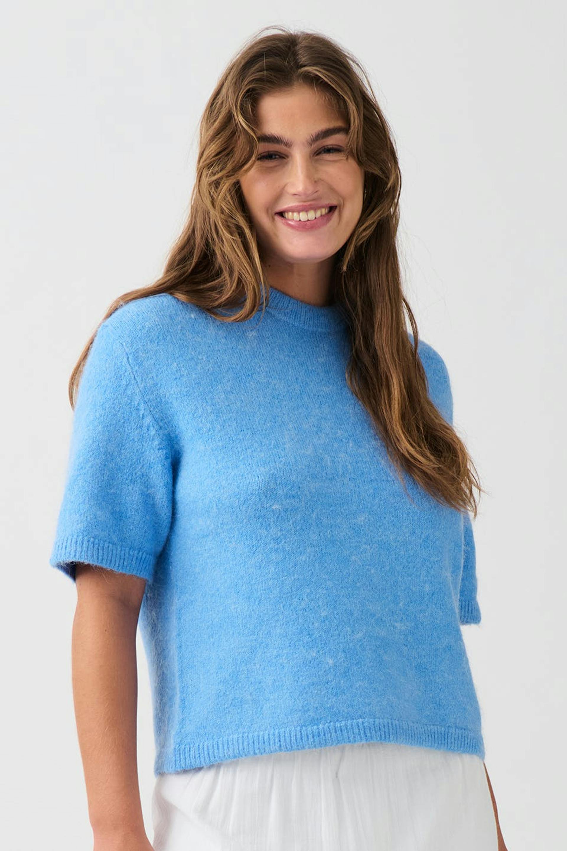 Kortærmet striktrøje med rund udskæring. Trøjen er blå og har blød kvalitet. Den har figurnær pasform og ribstrik ved ærmekanter og ved den nederste kant.
