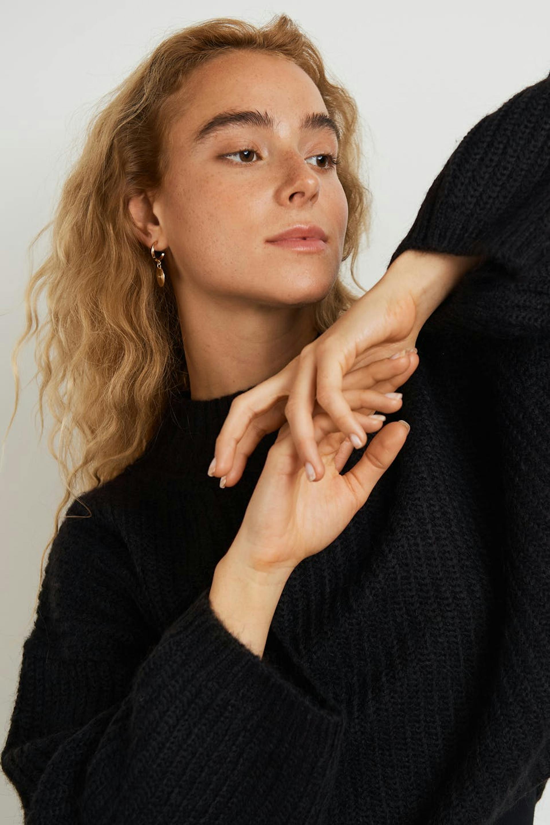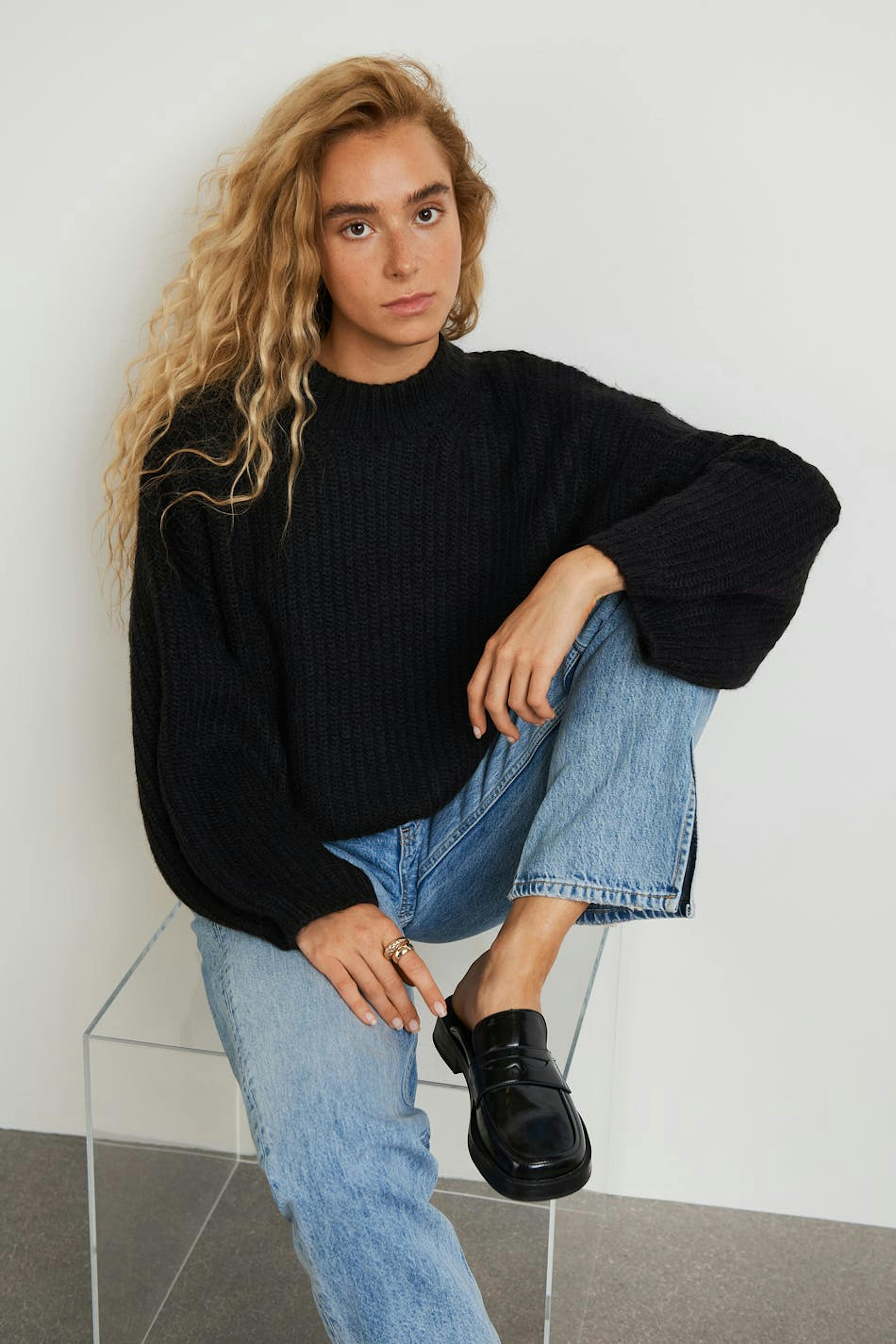 Strikket trøje med en oversize pasform. Trøjen er sort og har en kort længde. Den har ballonærmer og en høj udskæring.