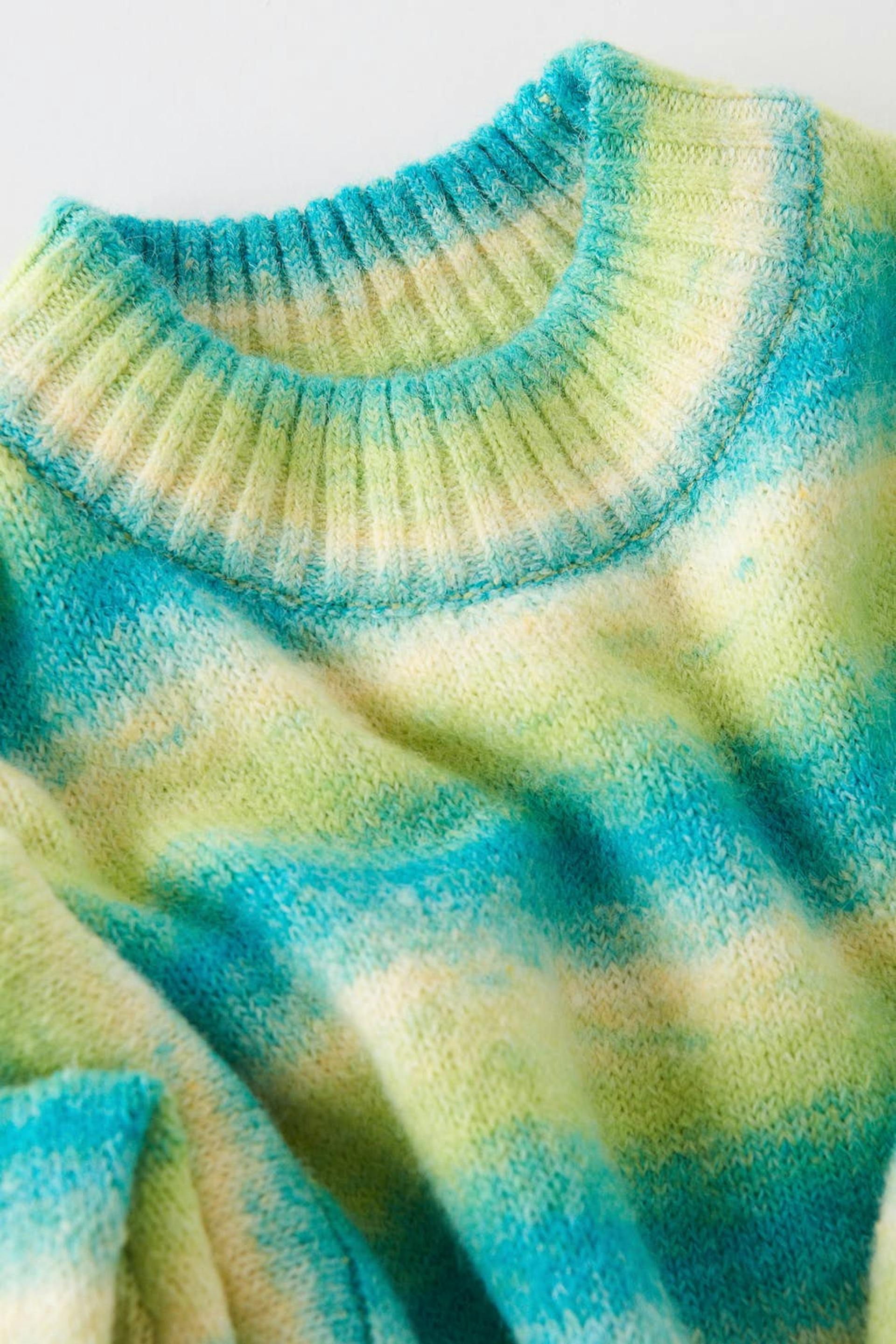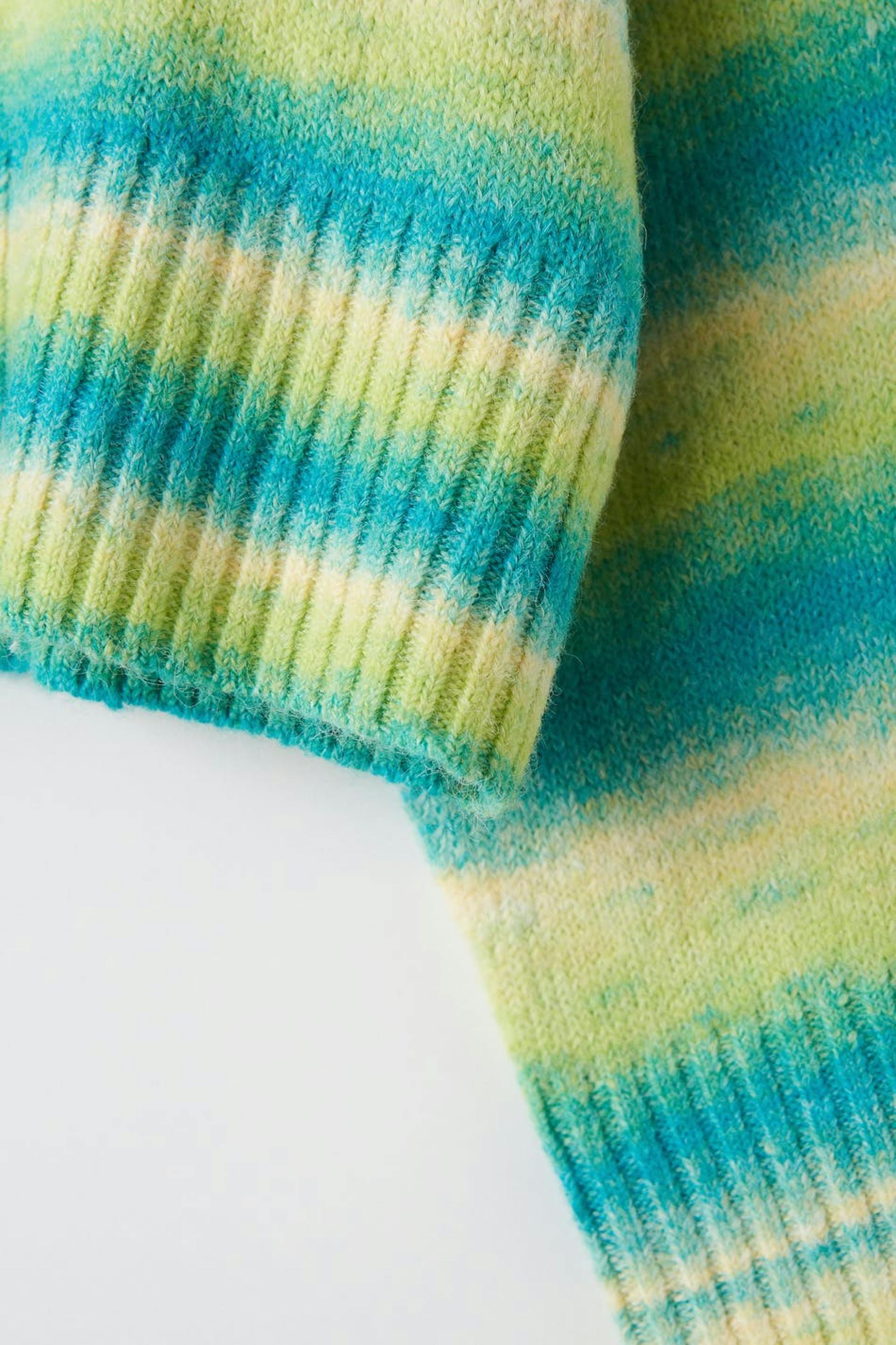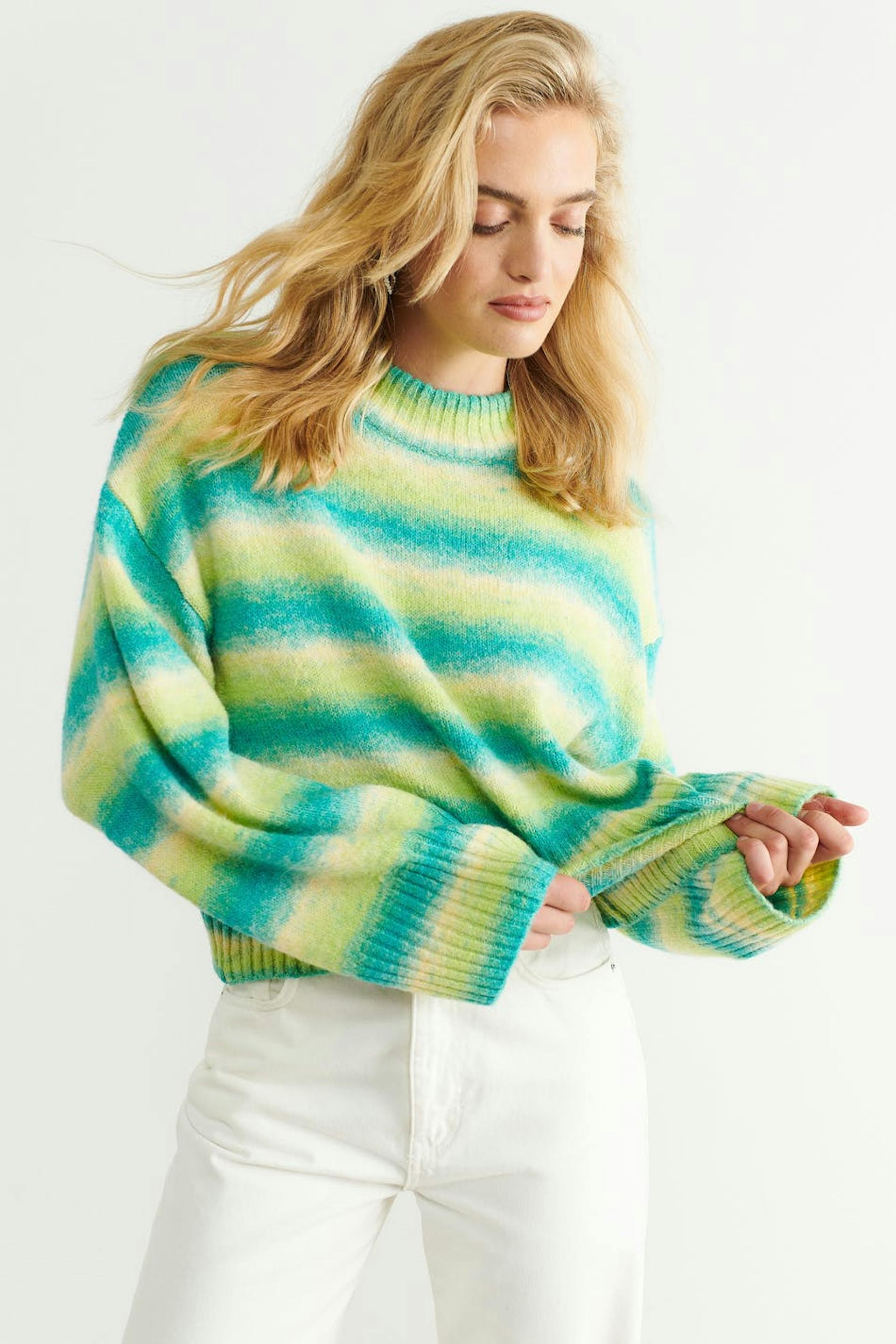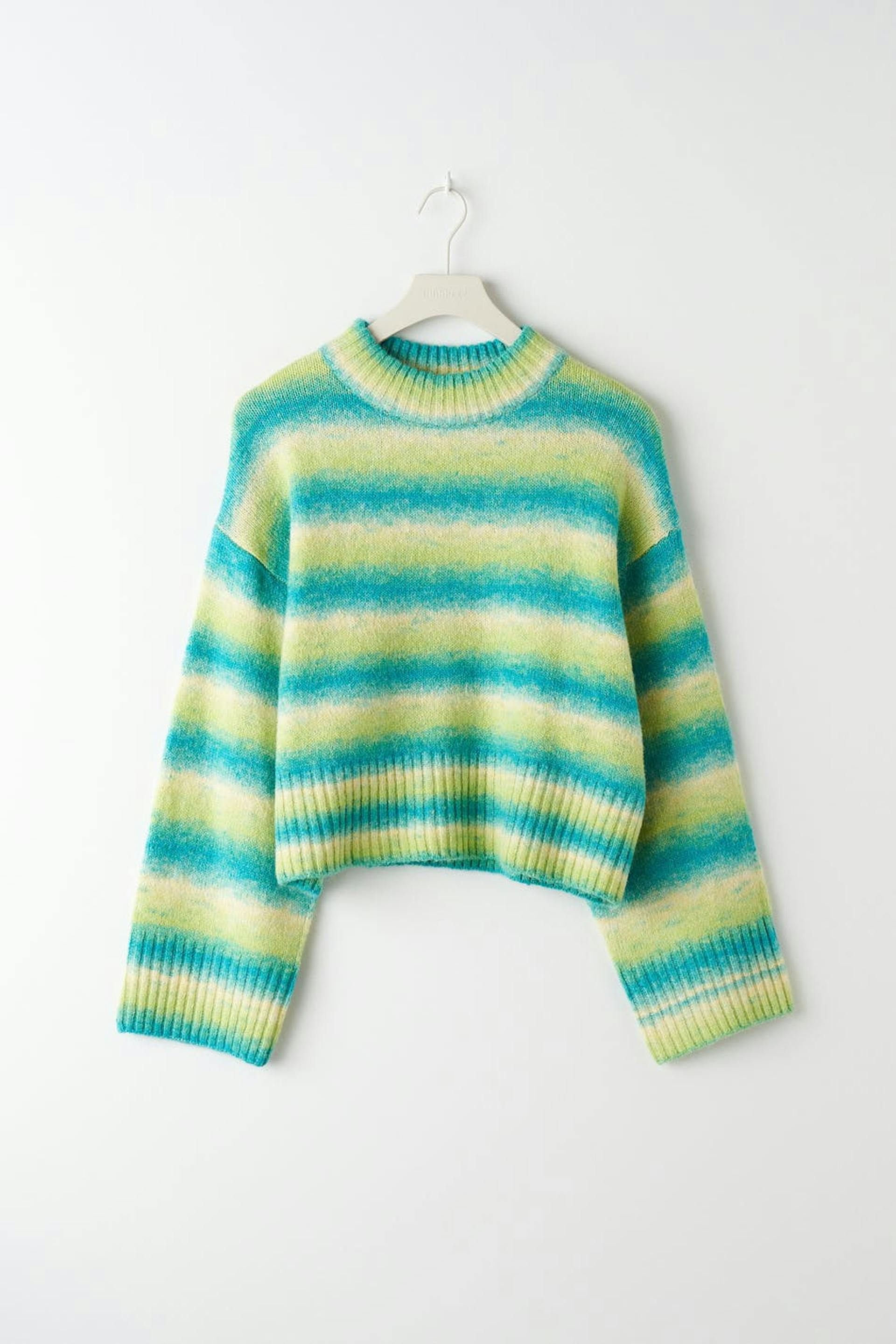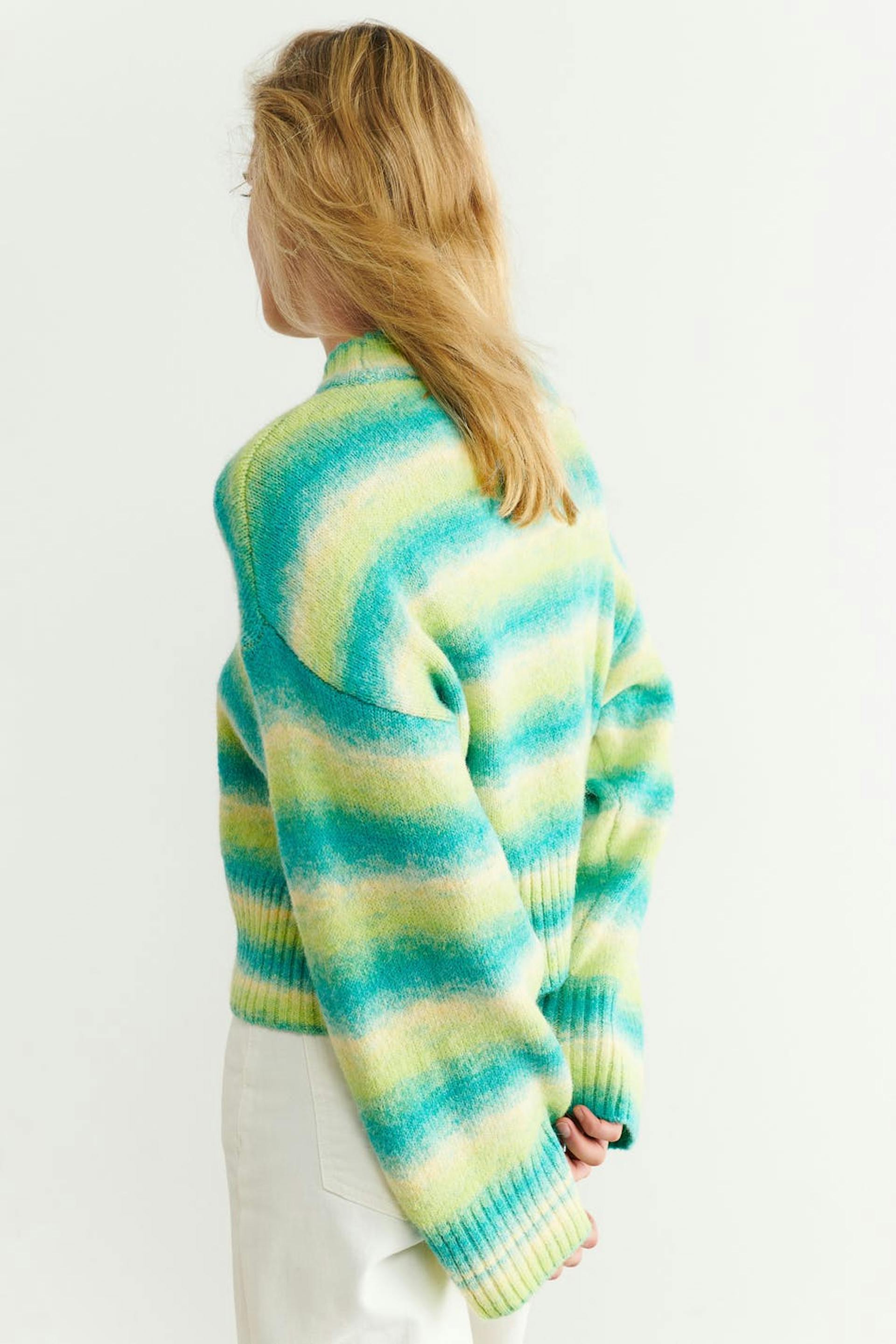 Stribet striktrøje med en oversize pasform. Trøjen er grøn og har en croppet længde. Den har brede ærmer, ribbet søm, lave skuldre og en rund, ribbet halsudskæring.