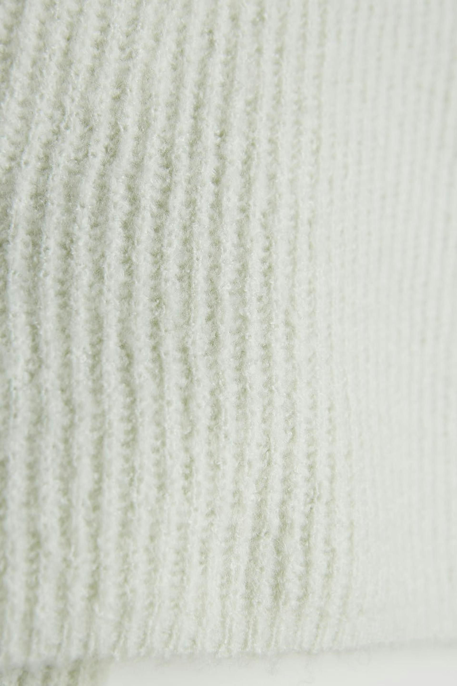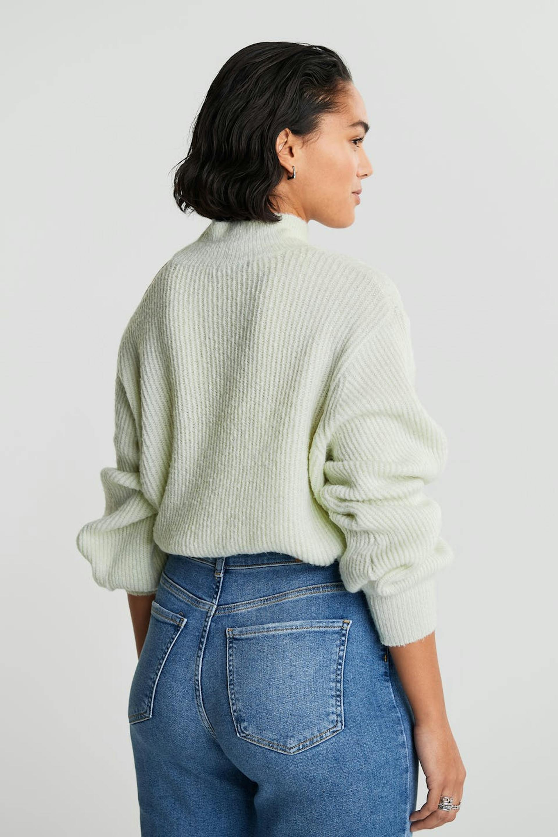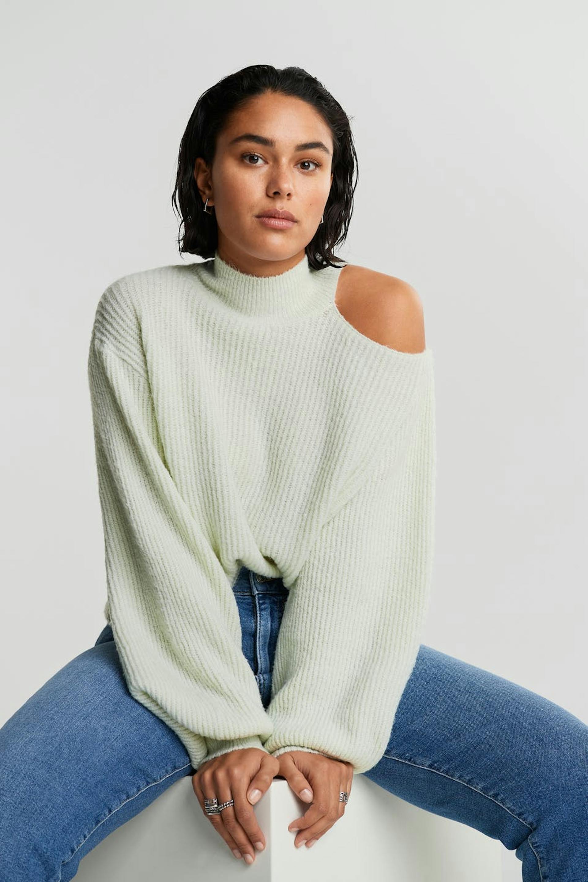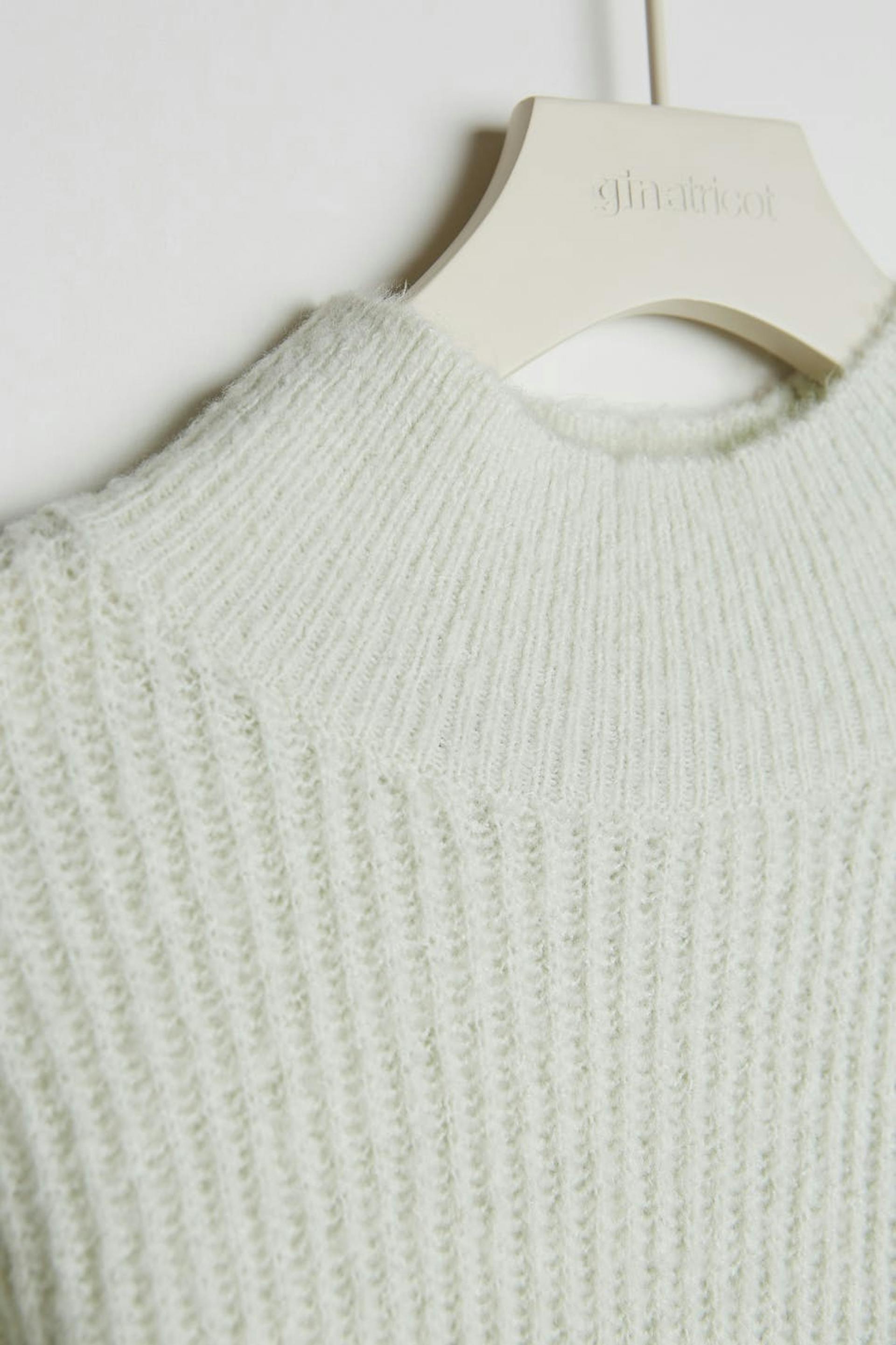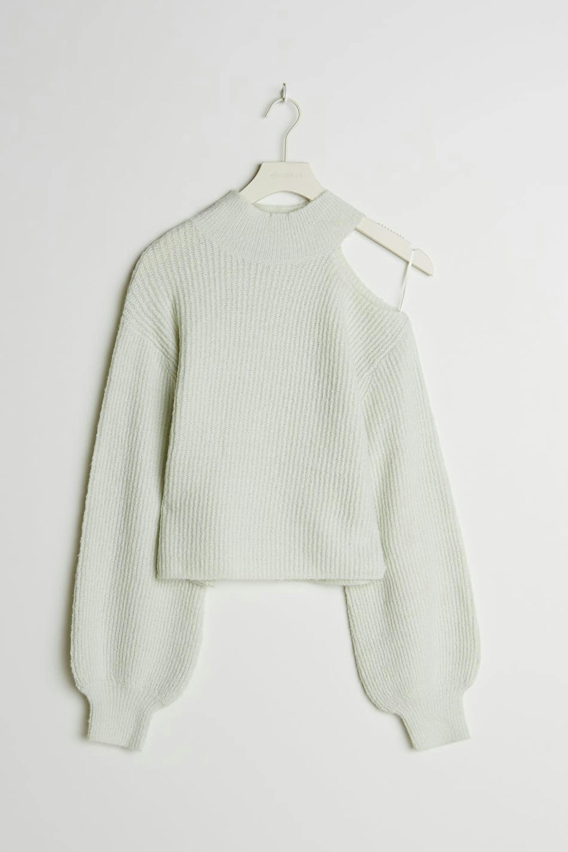 Strikket trøje med rummelige ærmer. Trøjen er hvid, strikket og ribbet. Den har en bar skulder og en høj udskæring.