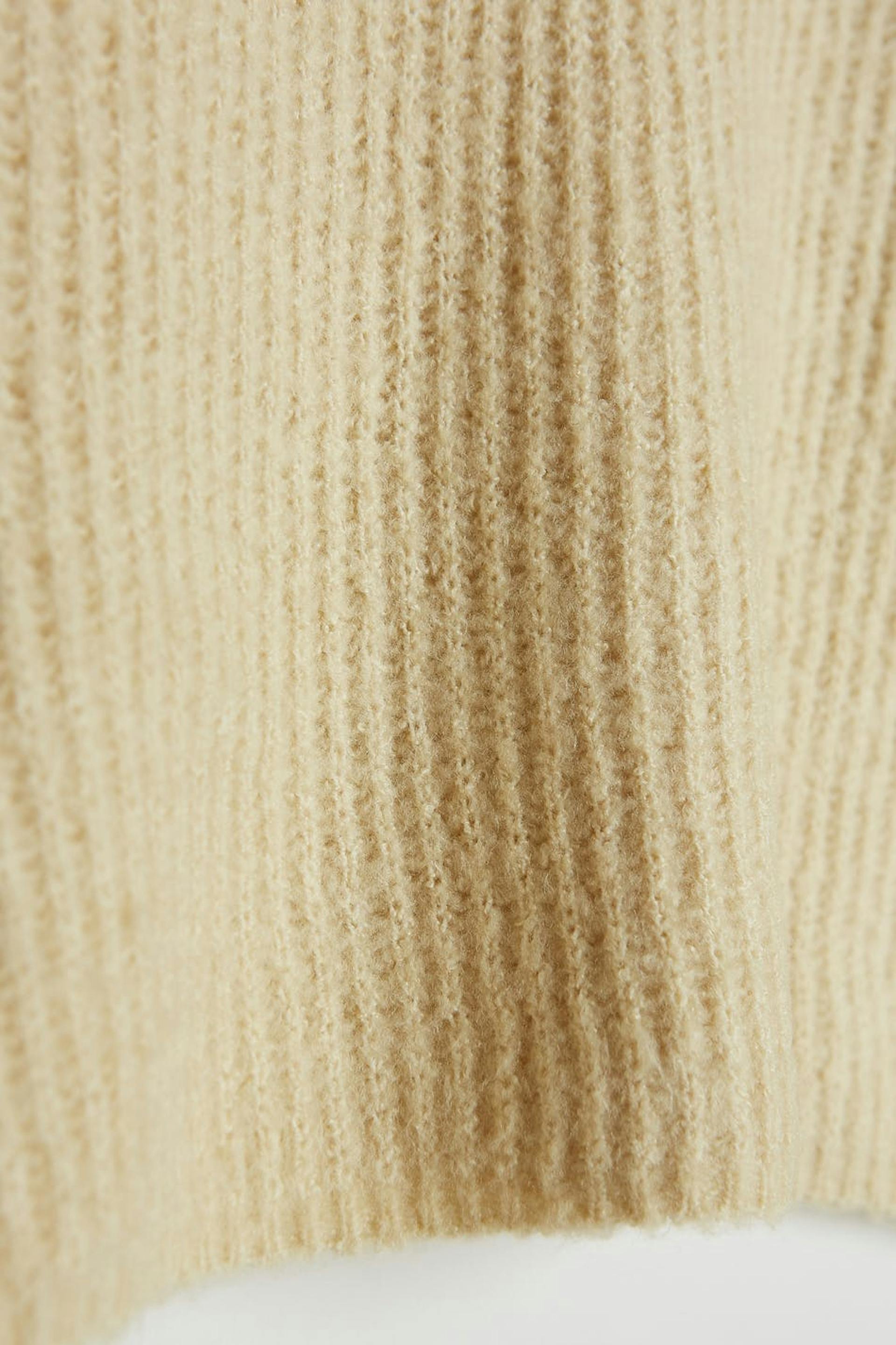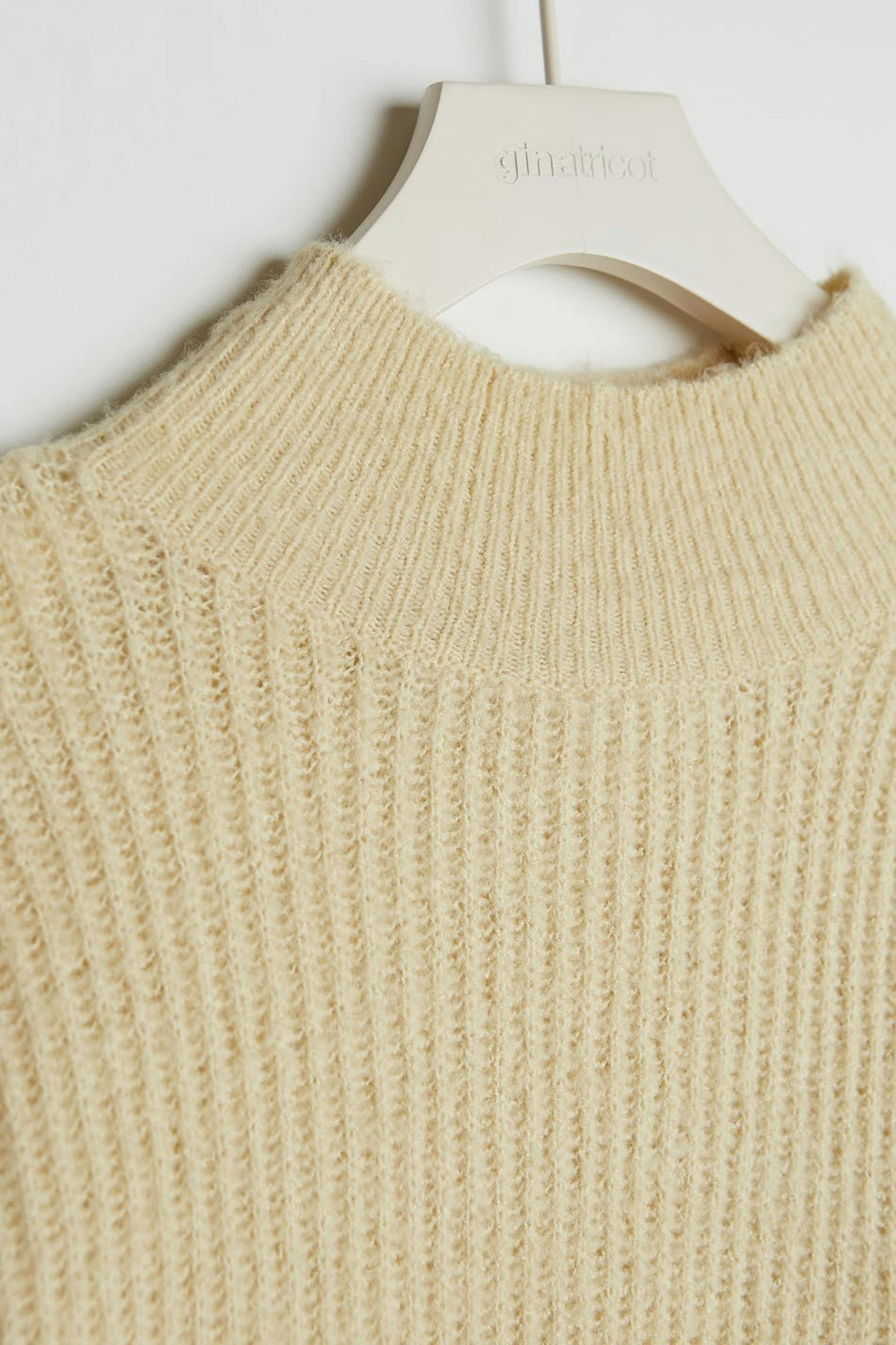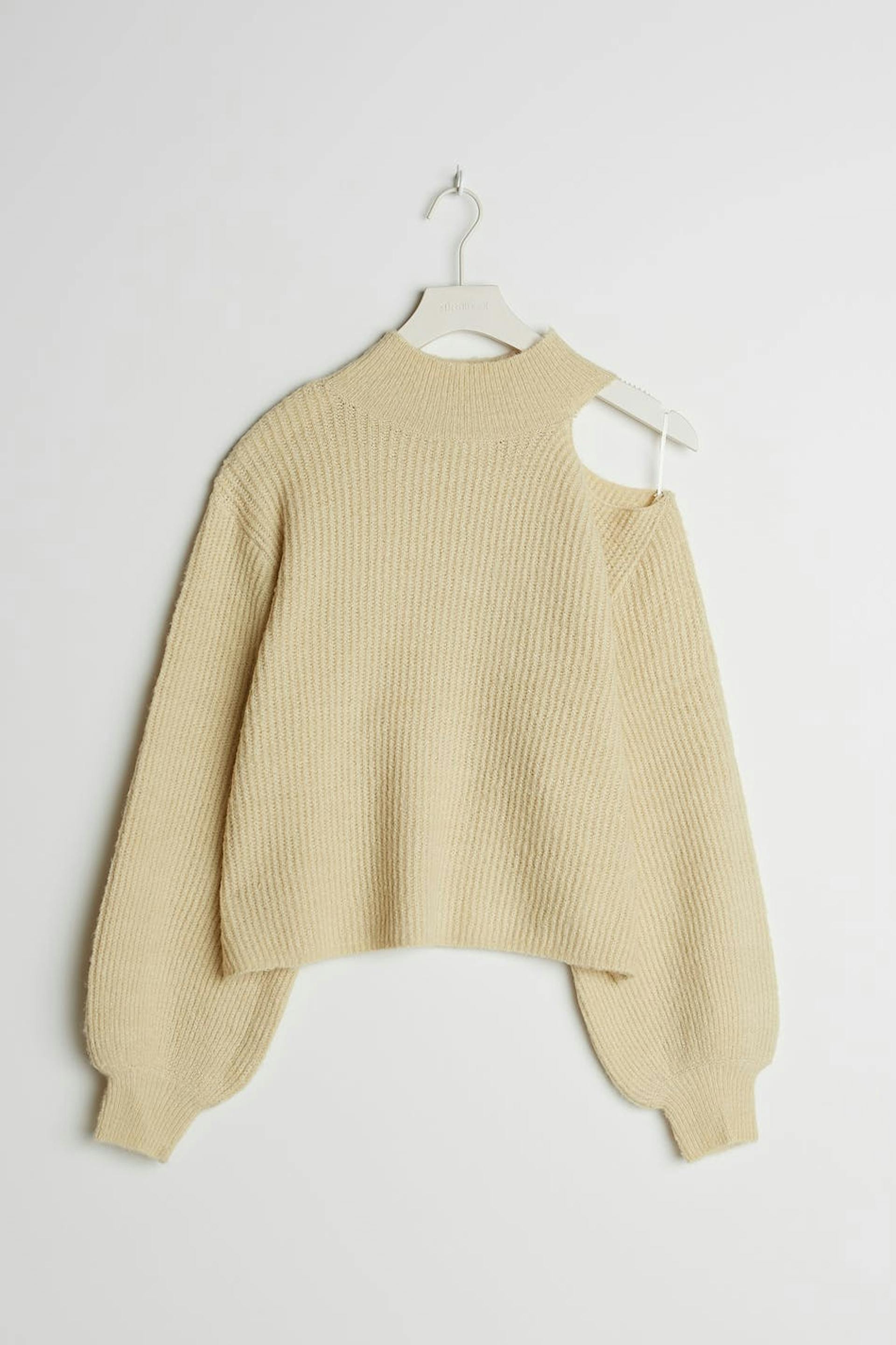 Strikket trøje med rummelige ærmer. Trøjen er beige og ribbet og har en bar skulder. Den har en høj udskæring.