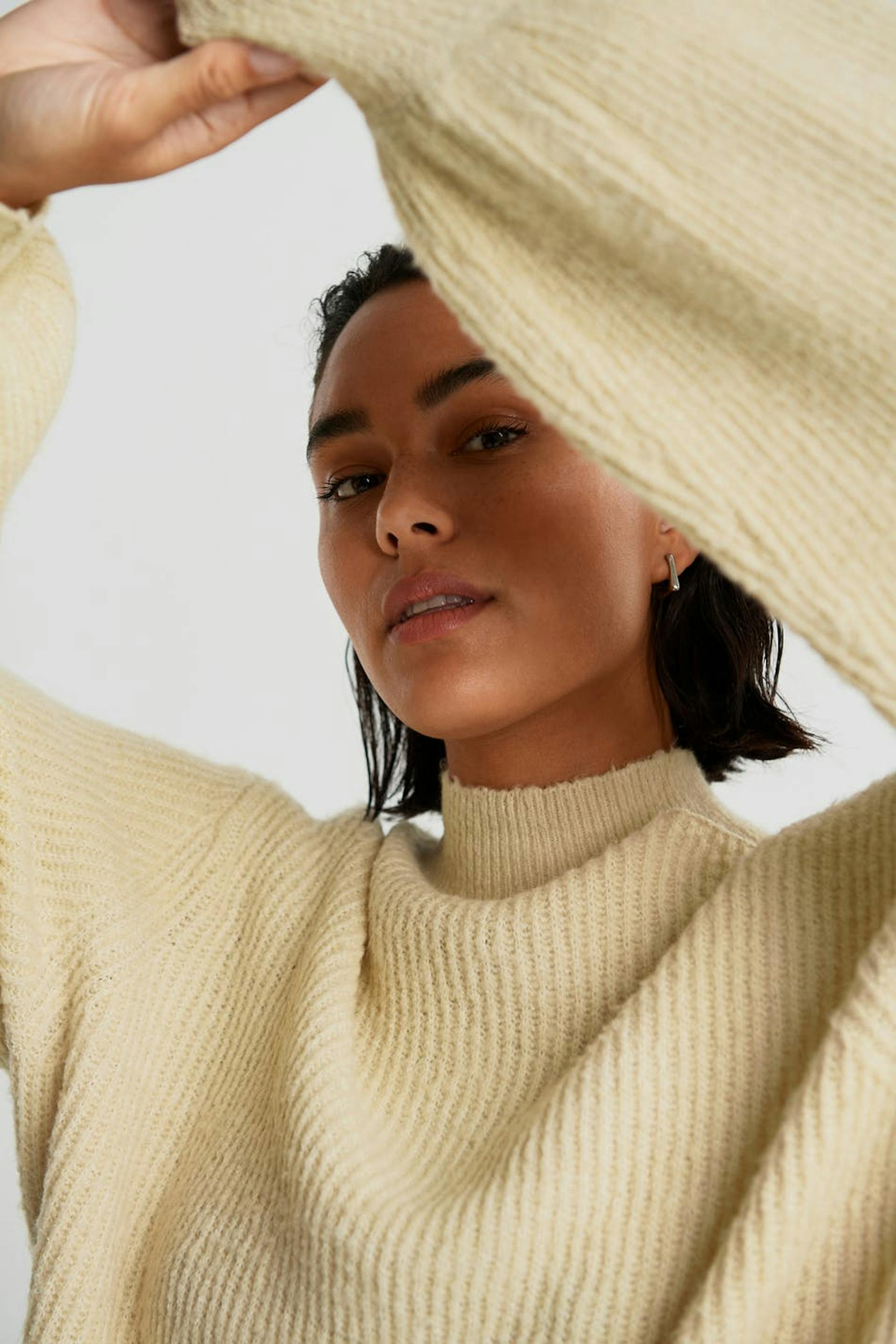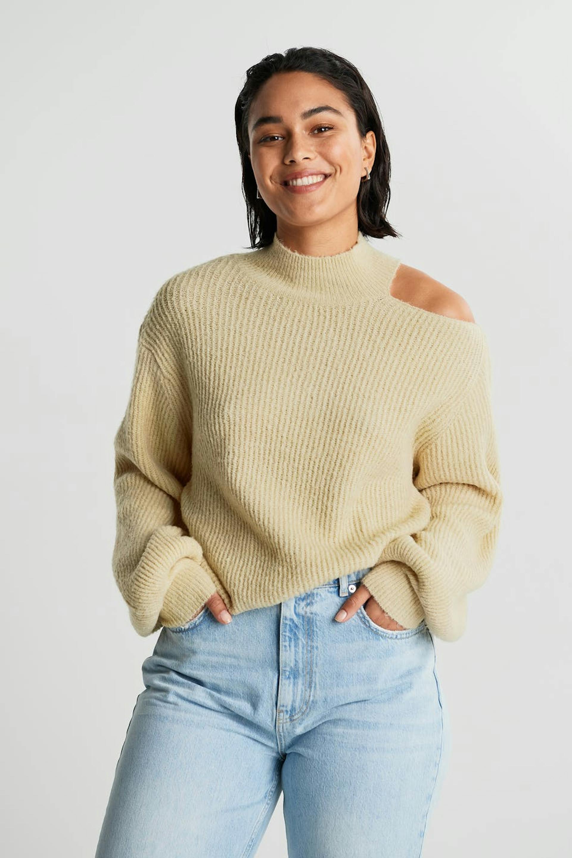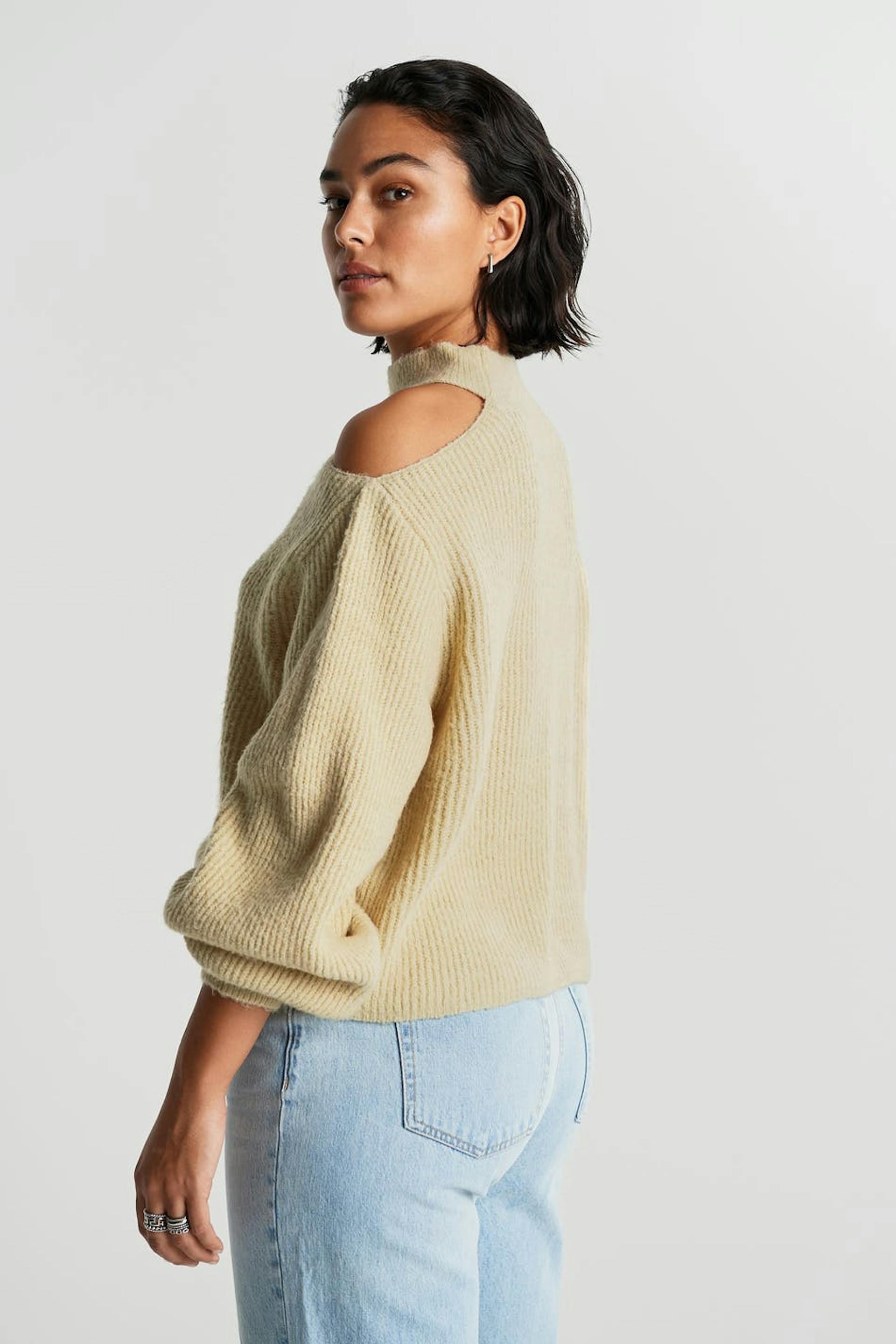 Strikket trøje med rummelige ærmer. Trøjen er beige og ribbet og har en bar skulder. Den har en høj udskæring.