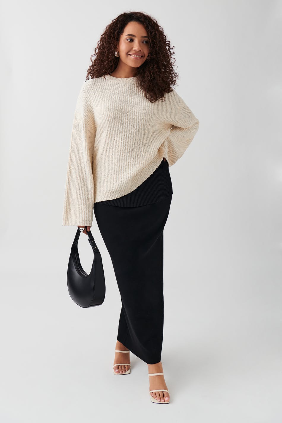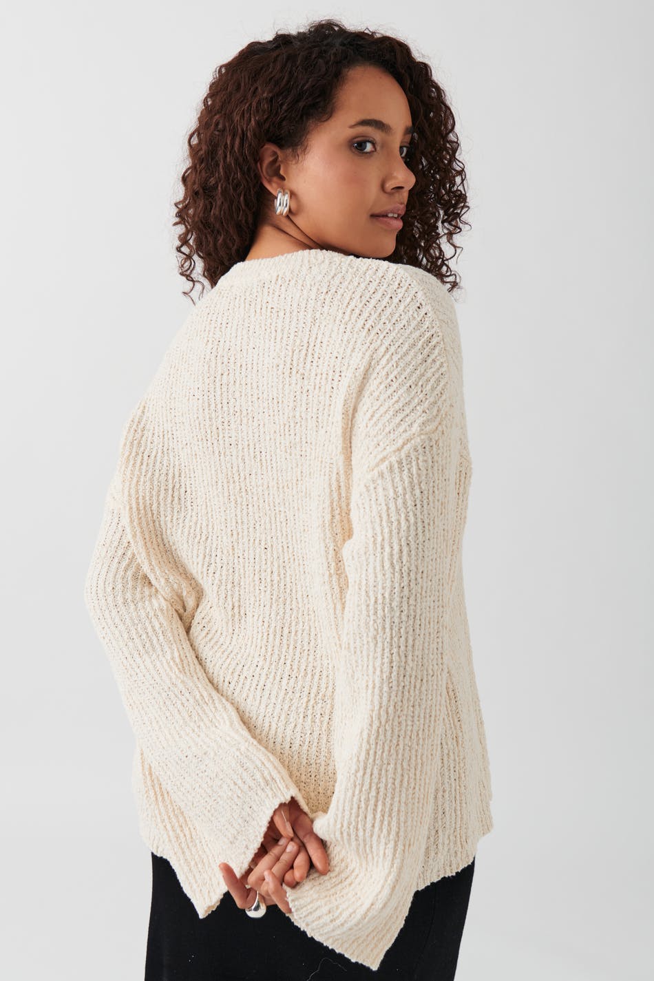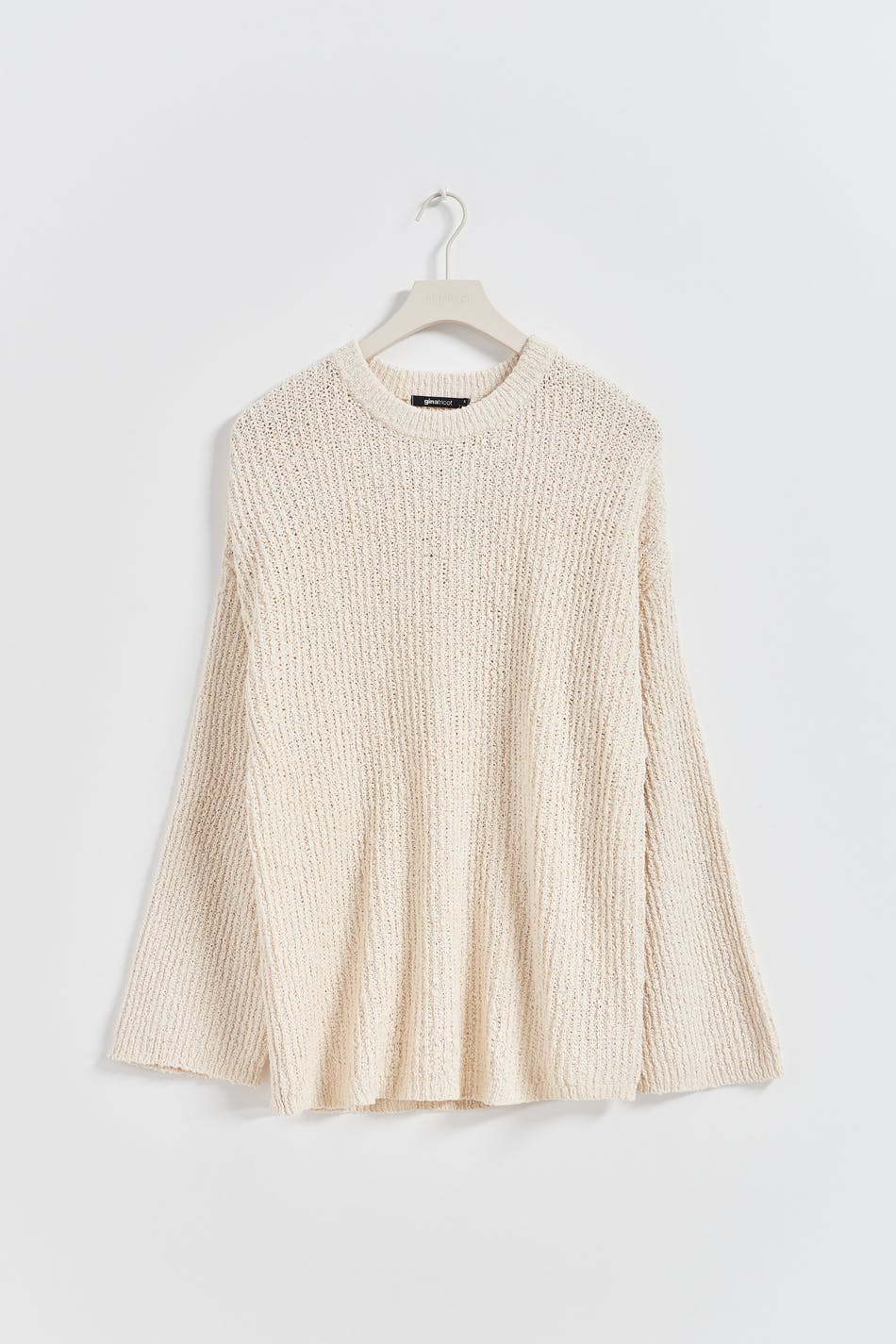 Striktrøje i slub-garn med boxy pasform. Trøjen er beige og har rund udskæring. Den har langt ærme, lav skulder og ribstrik ved ærmekanter og ved den nederste kant.