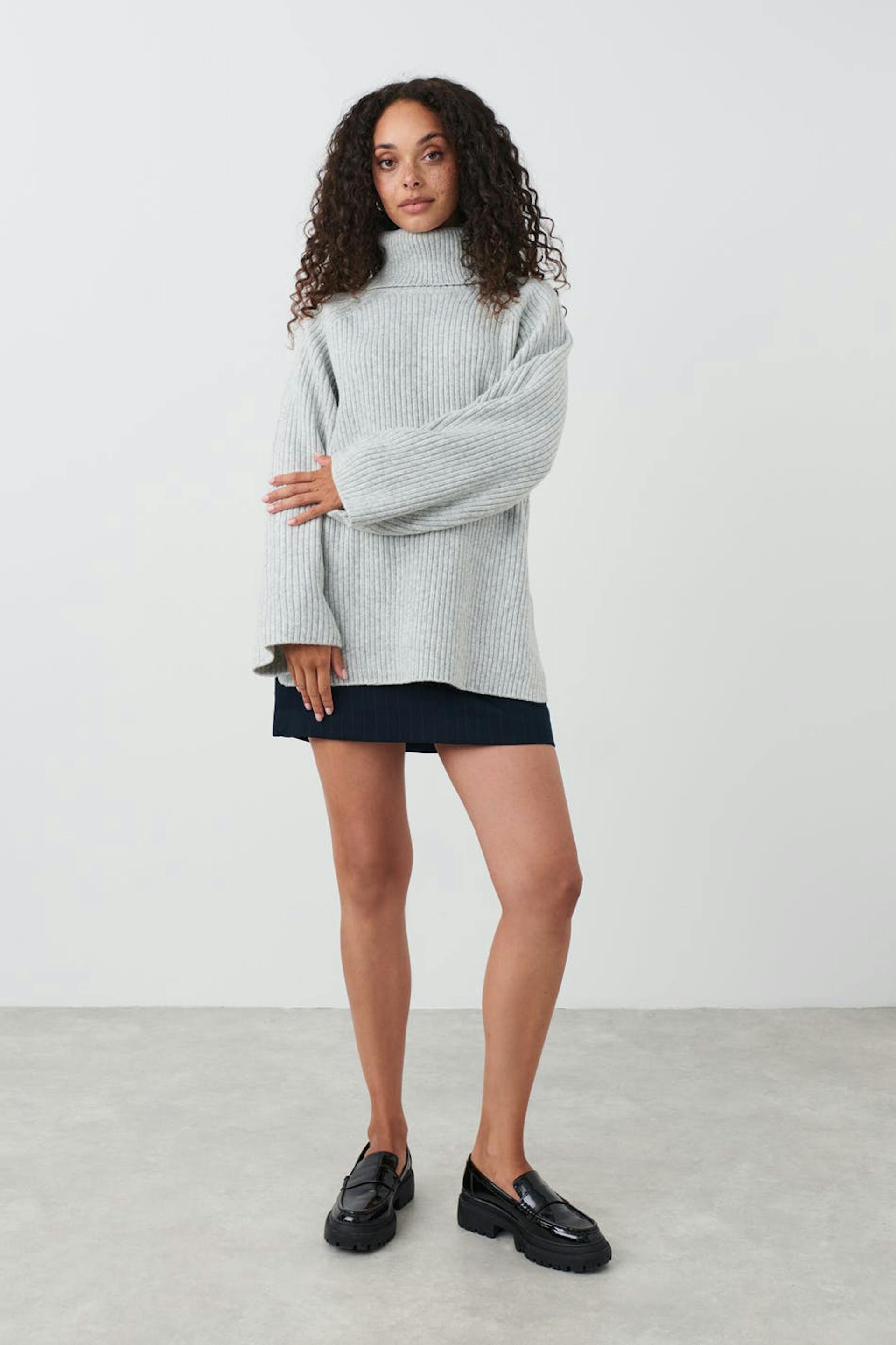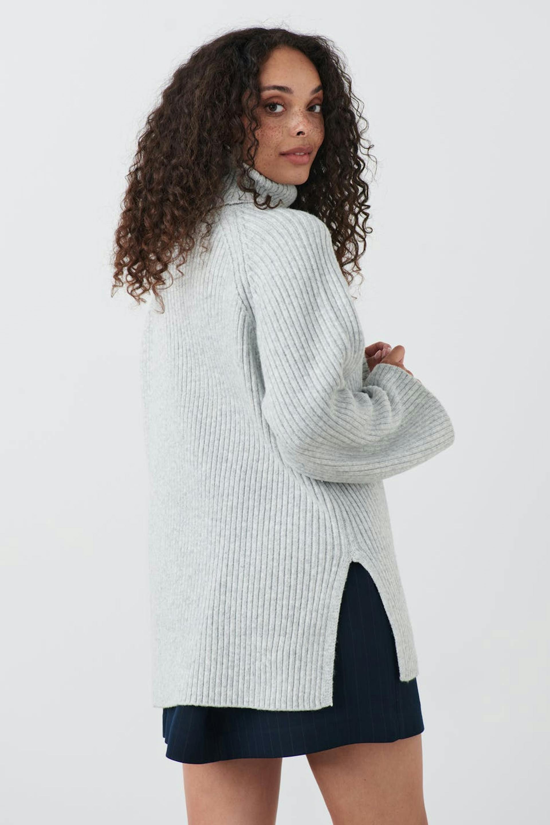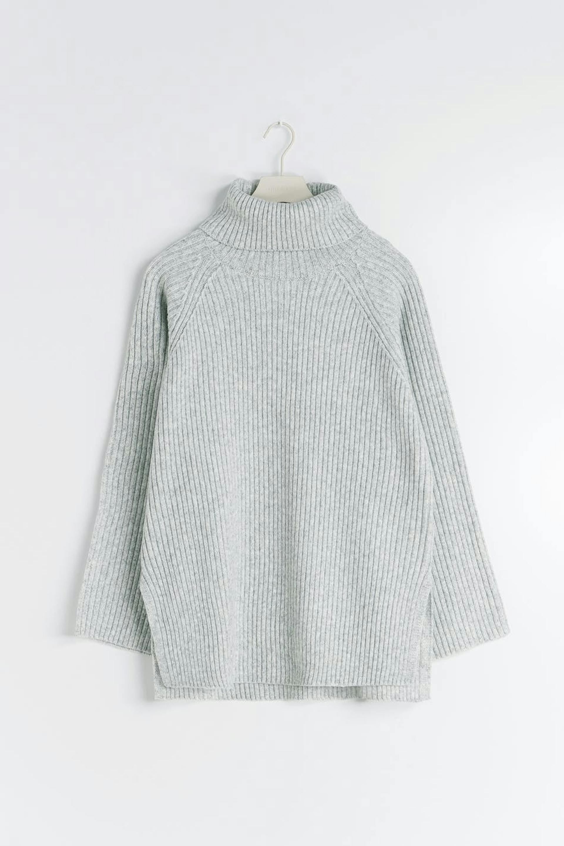 Striktrøje med boxy pasform. Trøjen er grå og har blød, ribbet kvalitet. Den har nedadvendt turtleneck, langt raglanærme, slids i siderne og lidt længere bagside.