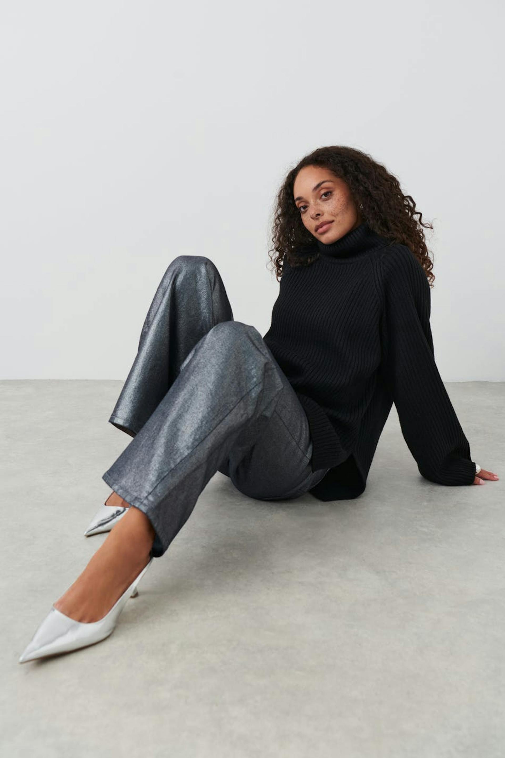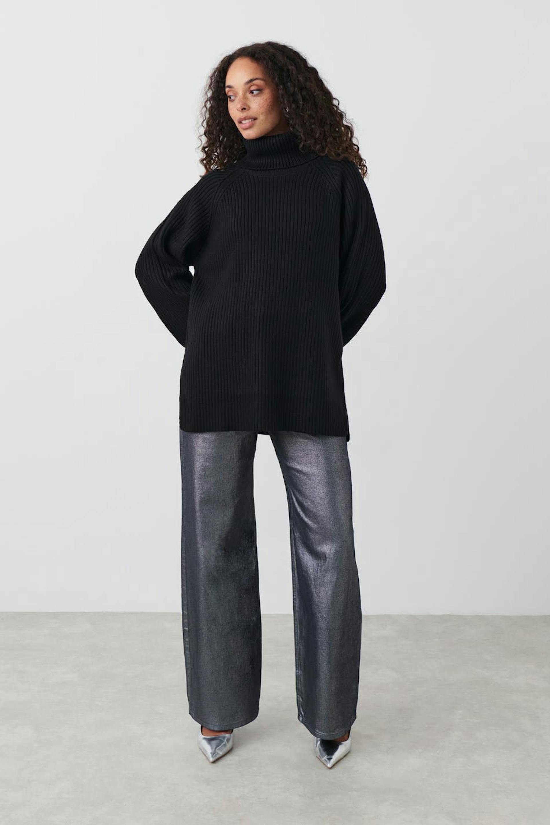 Strikket trøje med boxy pasform. Trøjen er sort og har blød, ribbet kvalitet. Den har nedadvendt turtleneck, langt raglanærme, slids i siderne og lidt længere bagside.