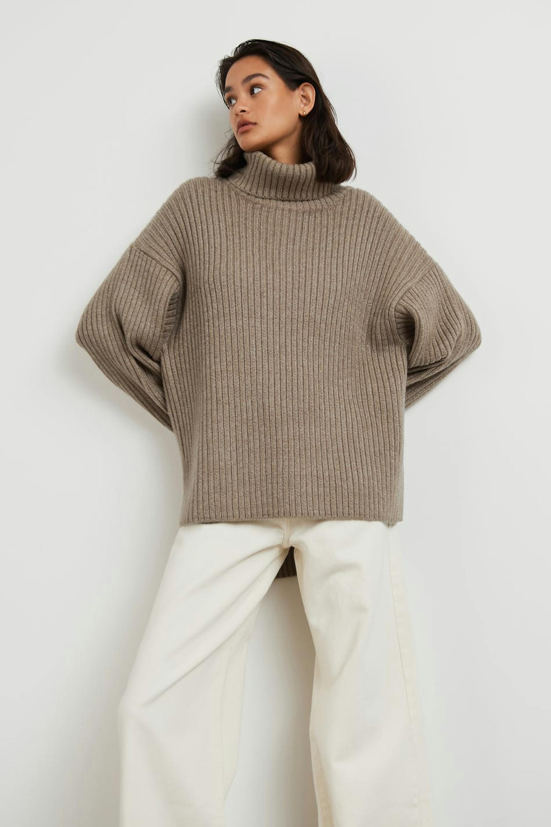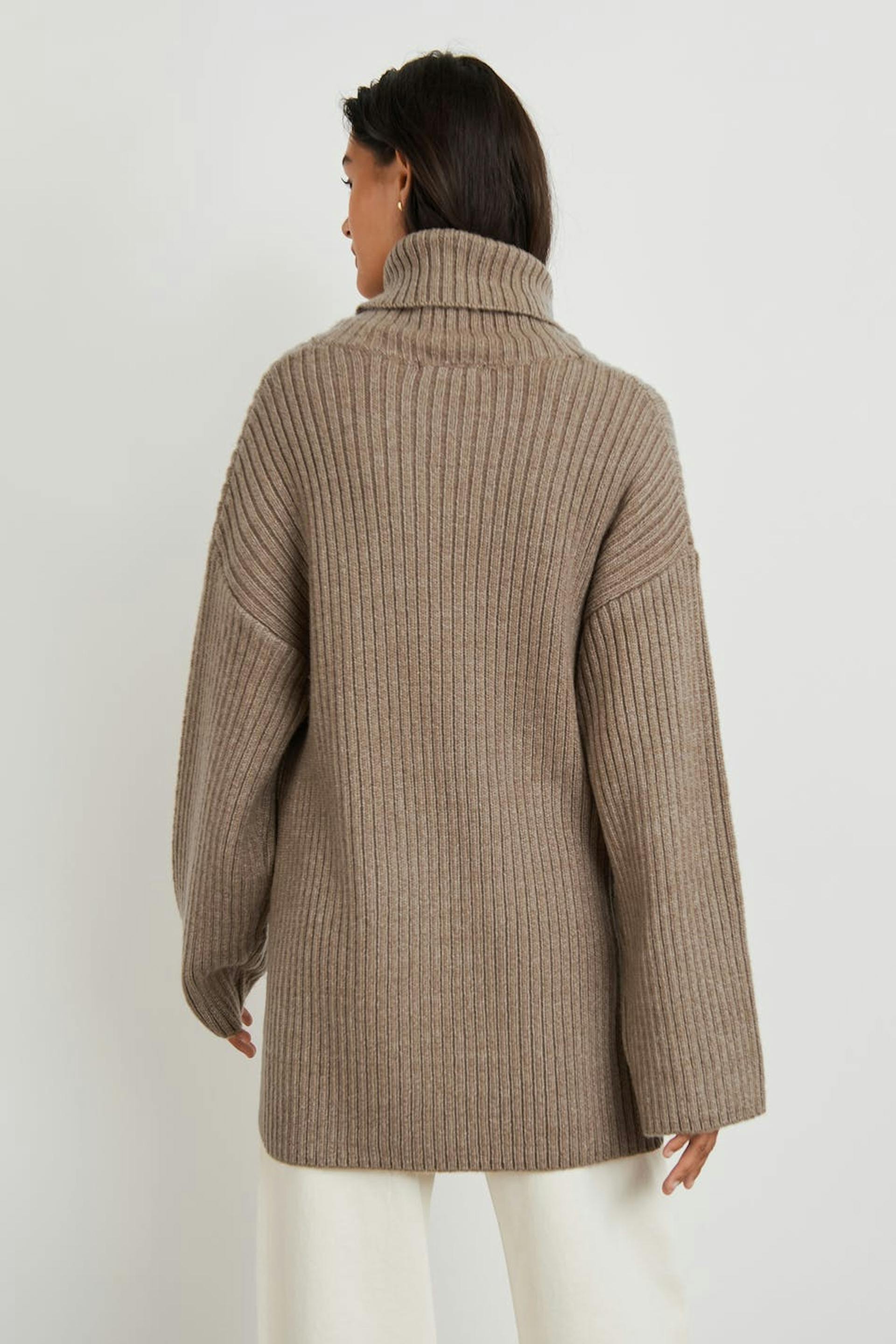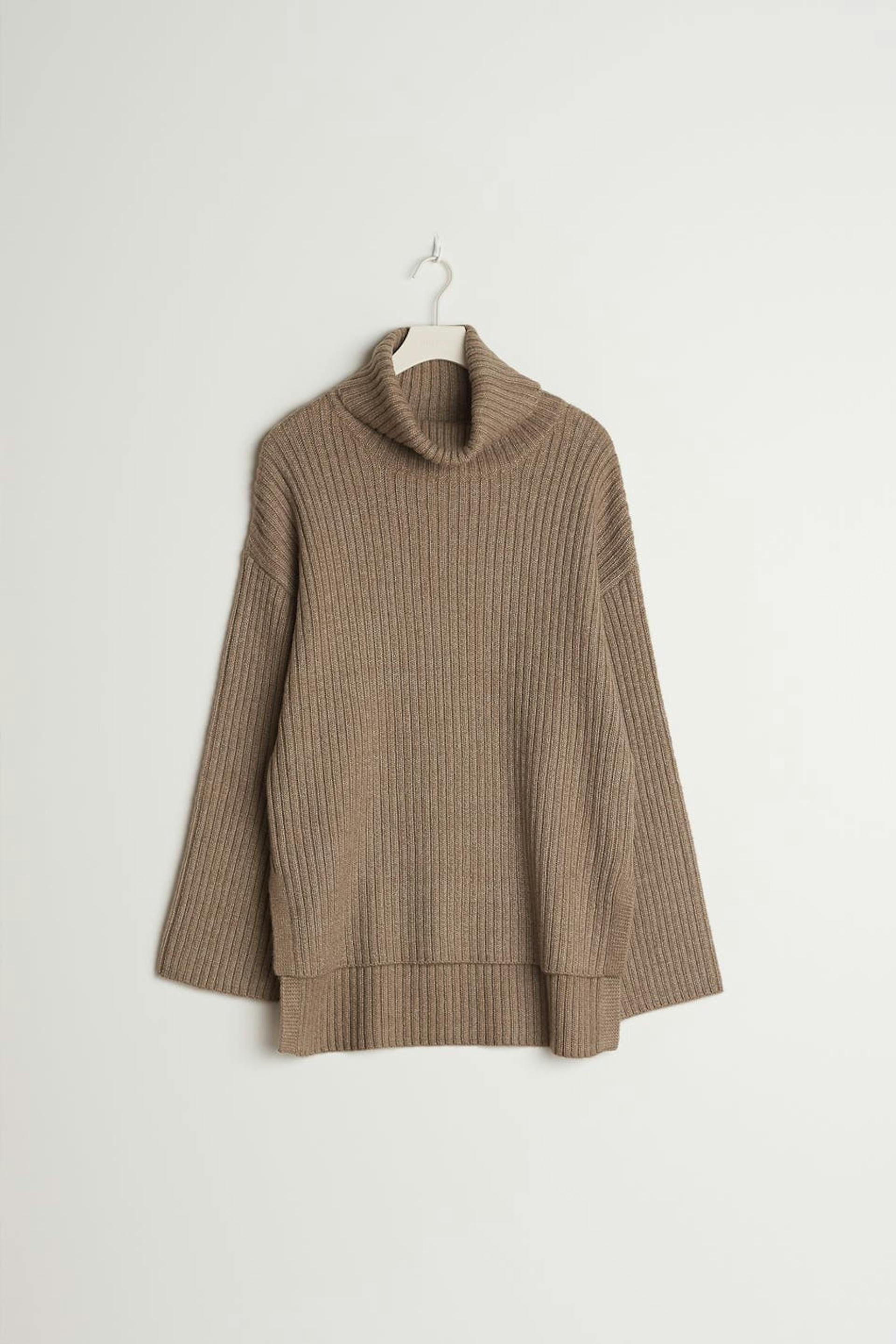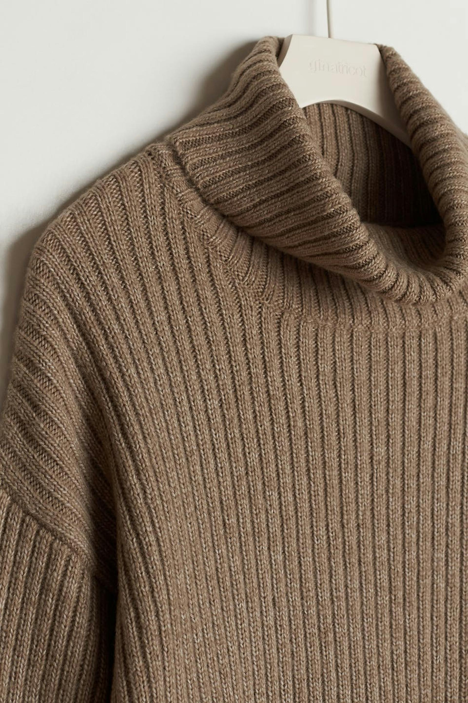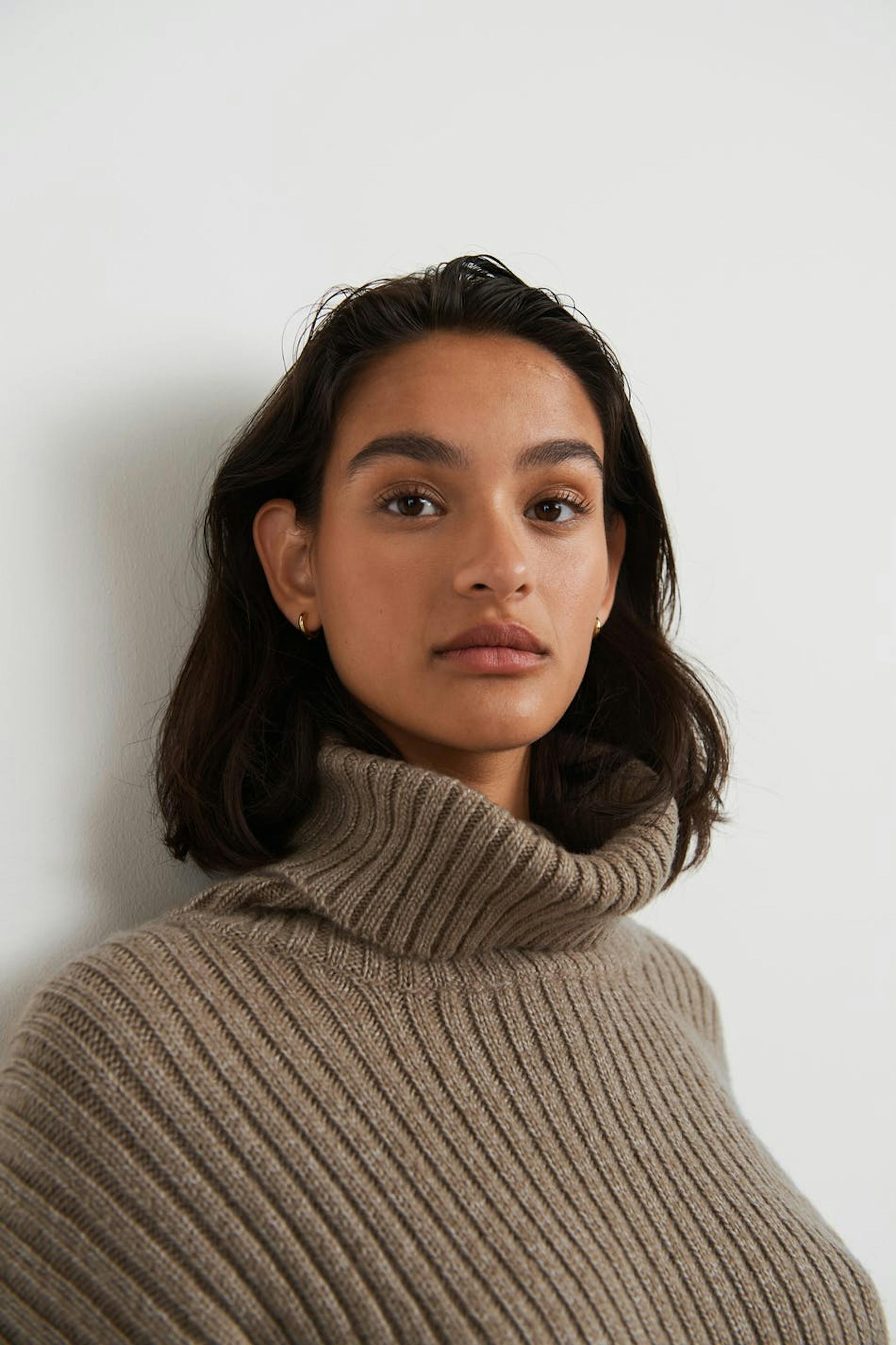 Strikket trøje med en normal pasform. Trøjen er beige, strikket og lidt længere bagtil. Den har en turtleneck og rummelige ærmer.
