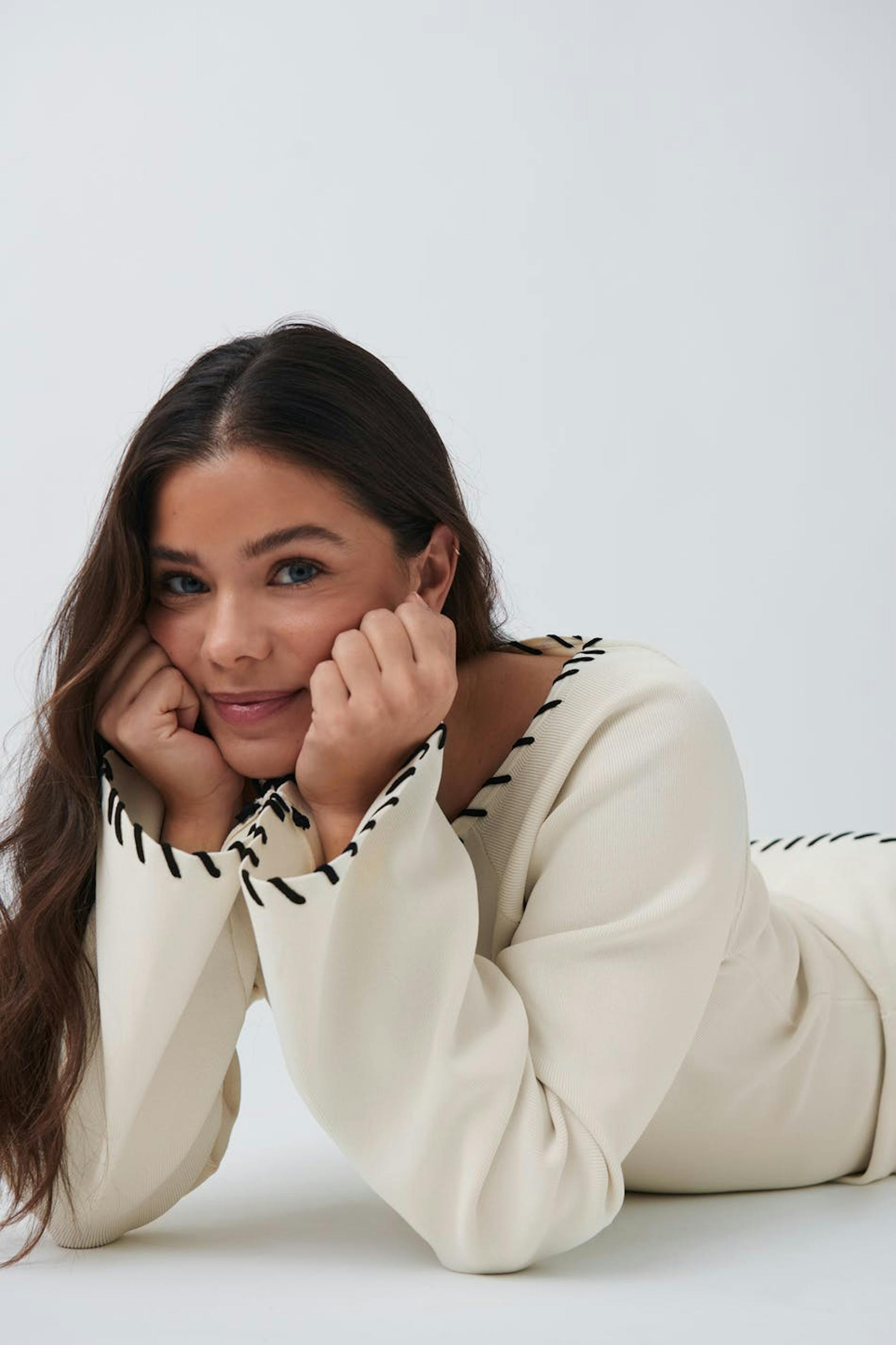 Strikket top med langt ærme. Toppen er beige og har sorte, kontrastfarvede syninger.