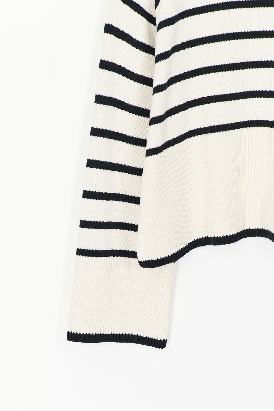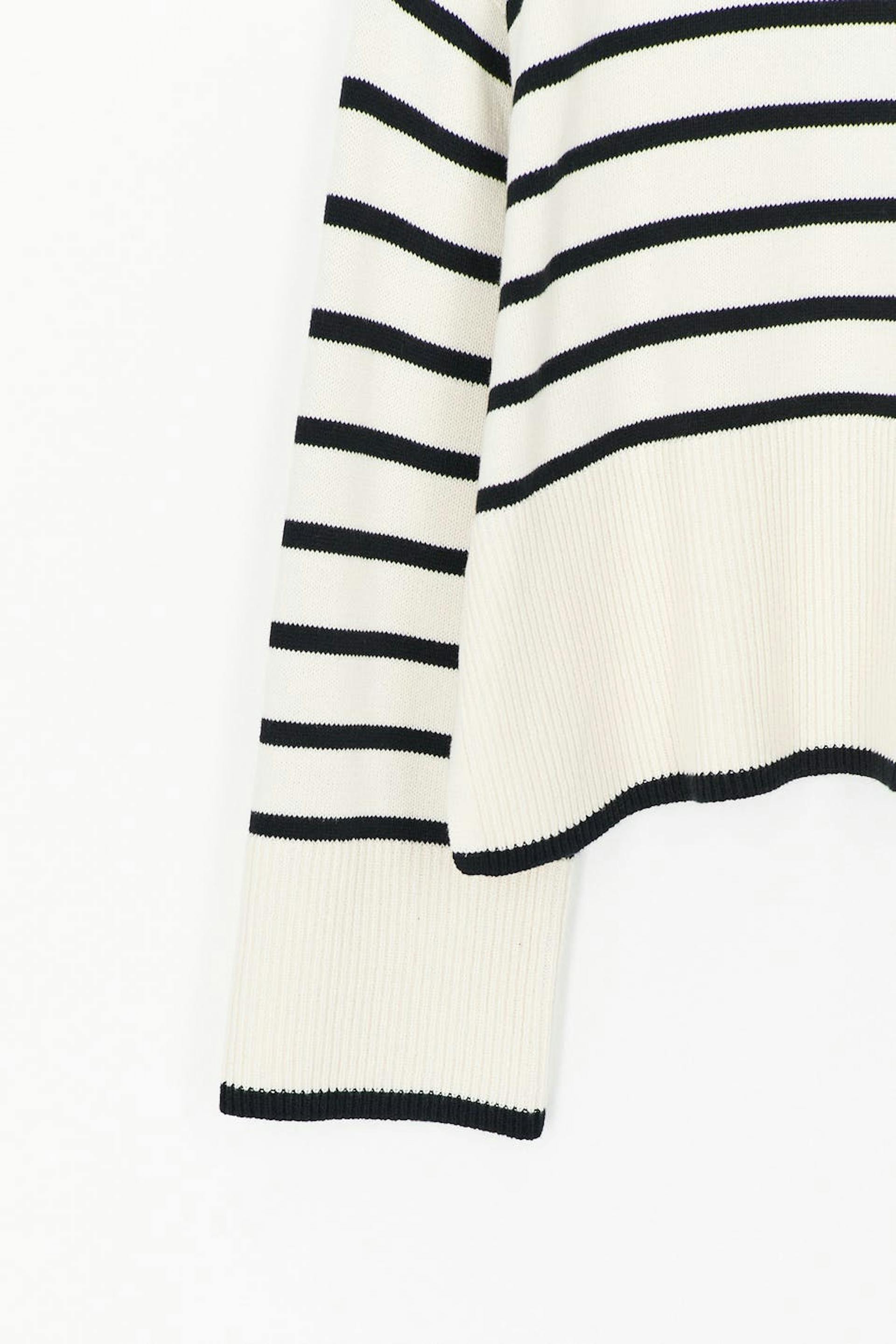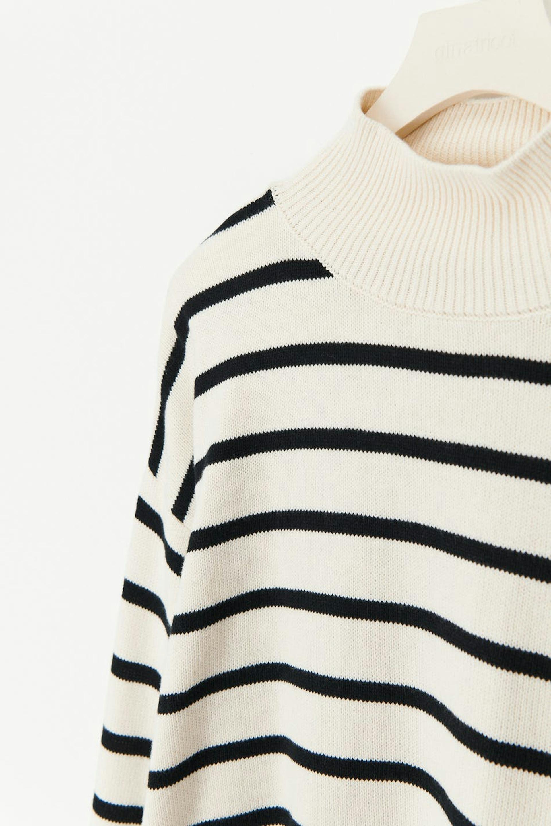 Stribet striktrøje med boxy pasform. Trøjen er hvid og har lave skuldre. Den har høj udskæring, slids i siderne og ribbet søm.