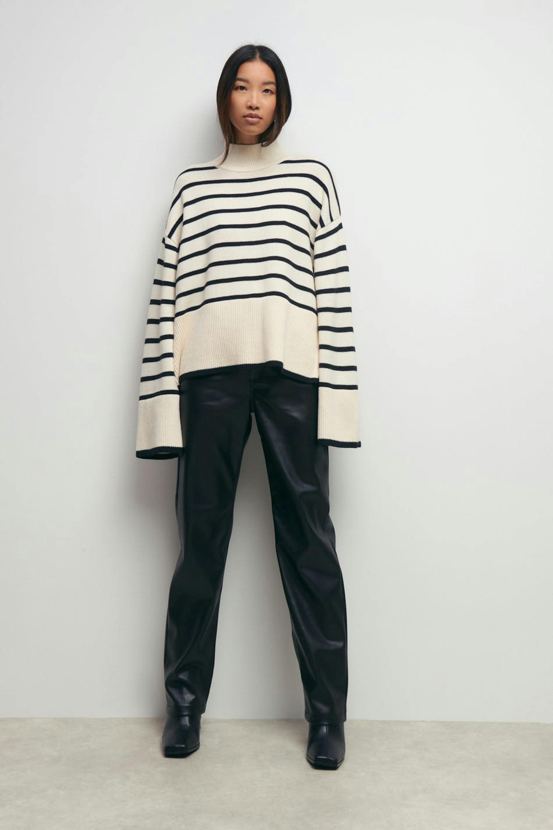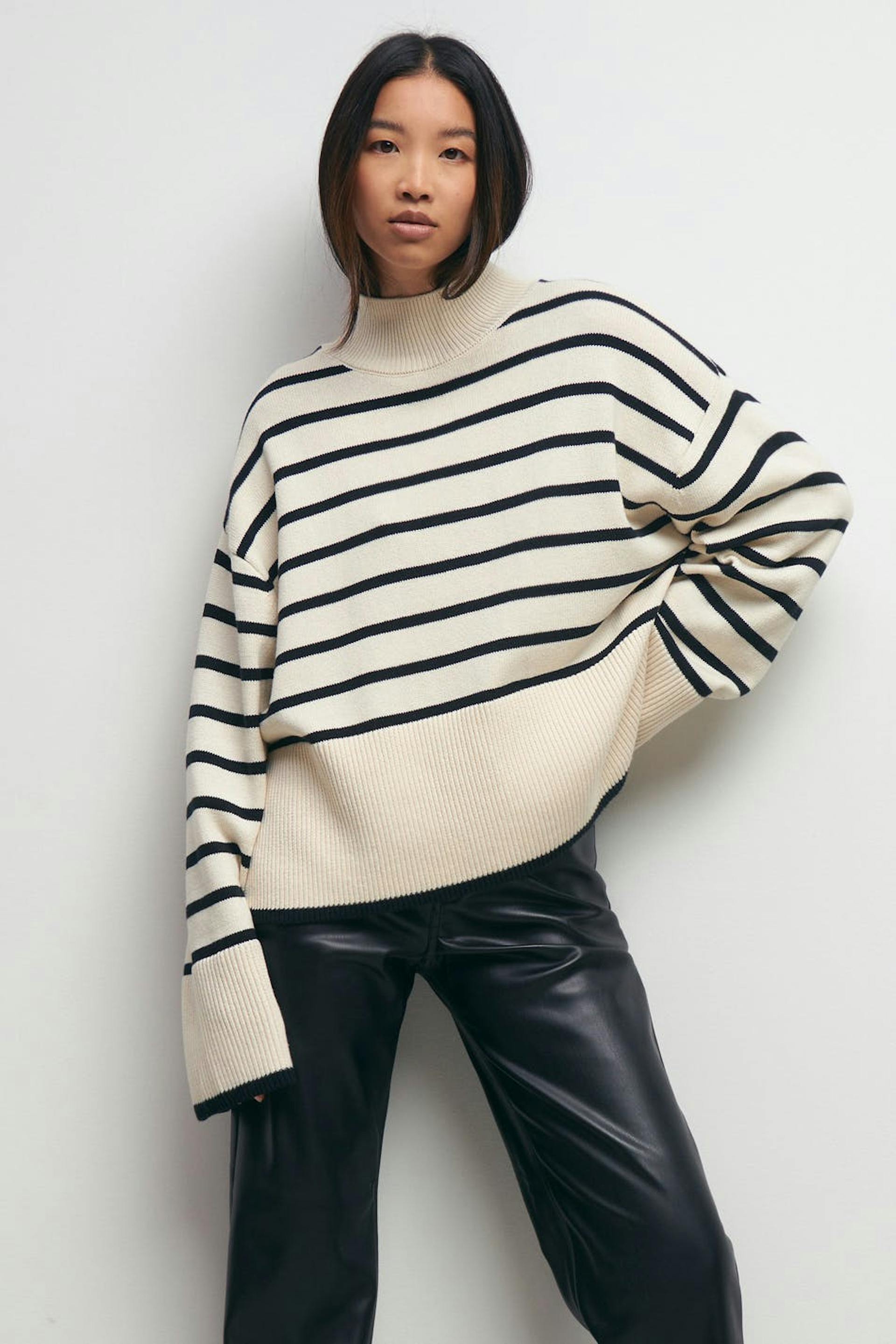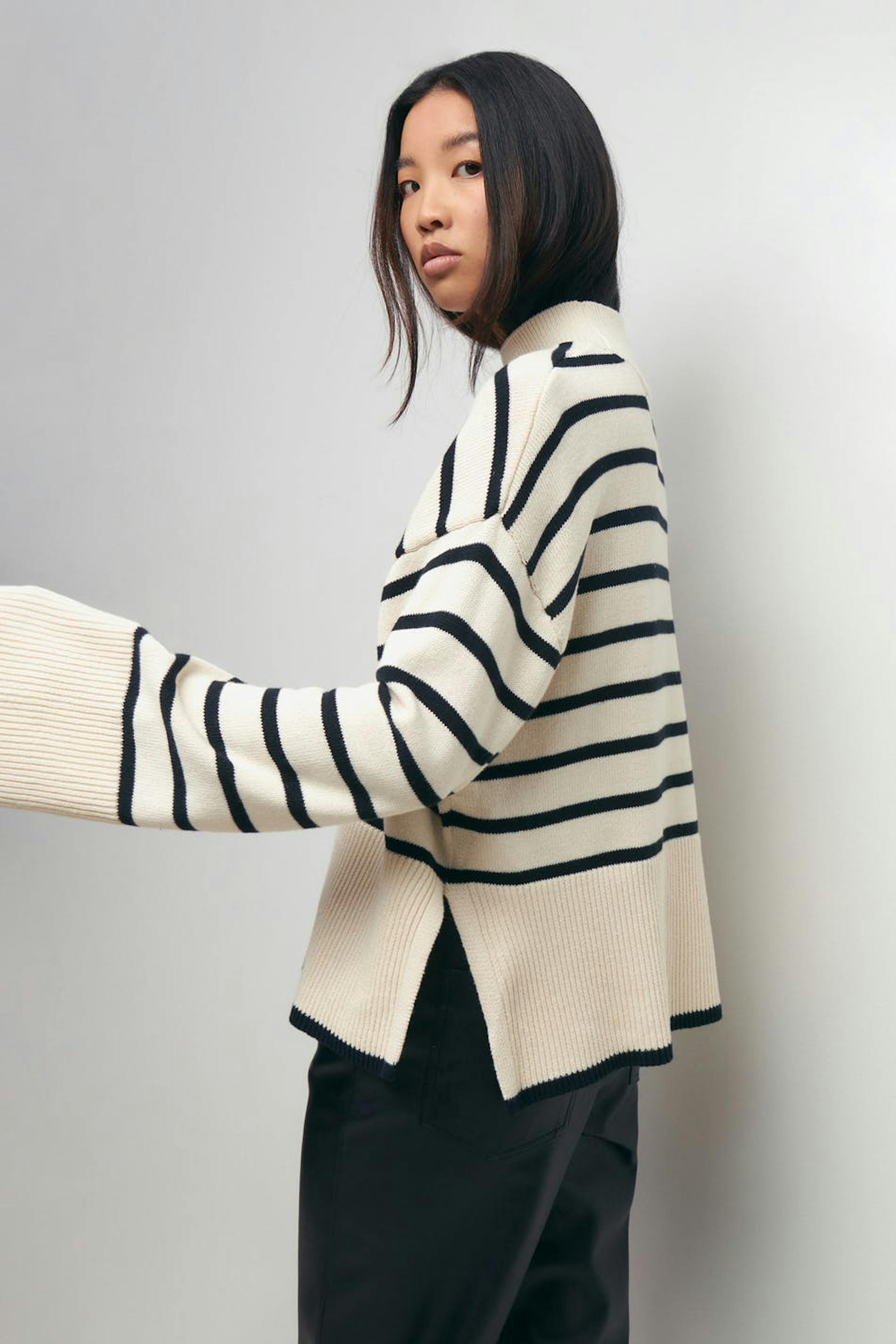 Stribet striktrøje med boxy pasform. Trøjen er hvid og har lave skuldre. Den har høj udskæring, slids i siderne og ribbet søm.
