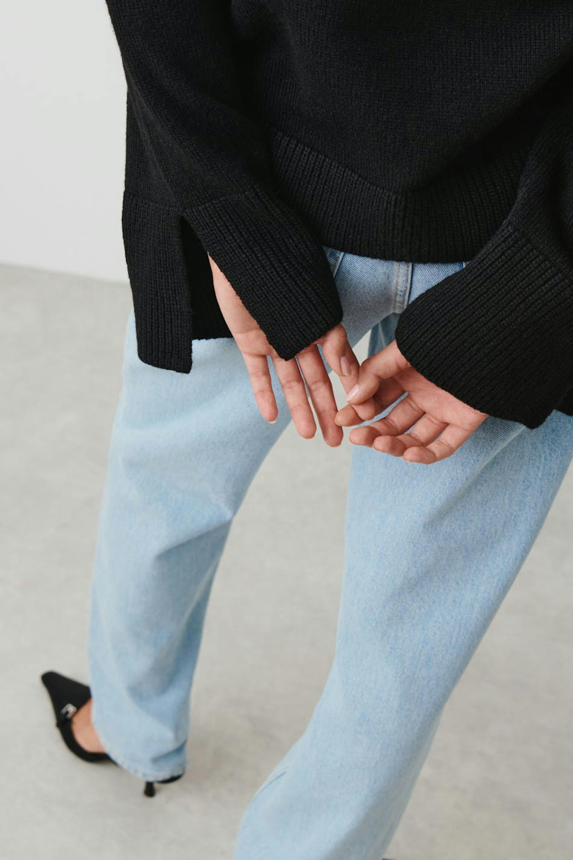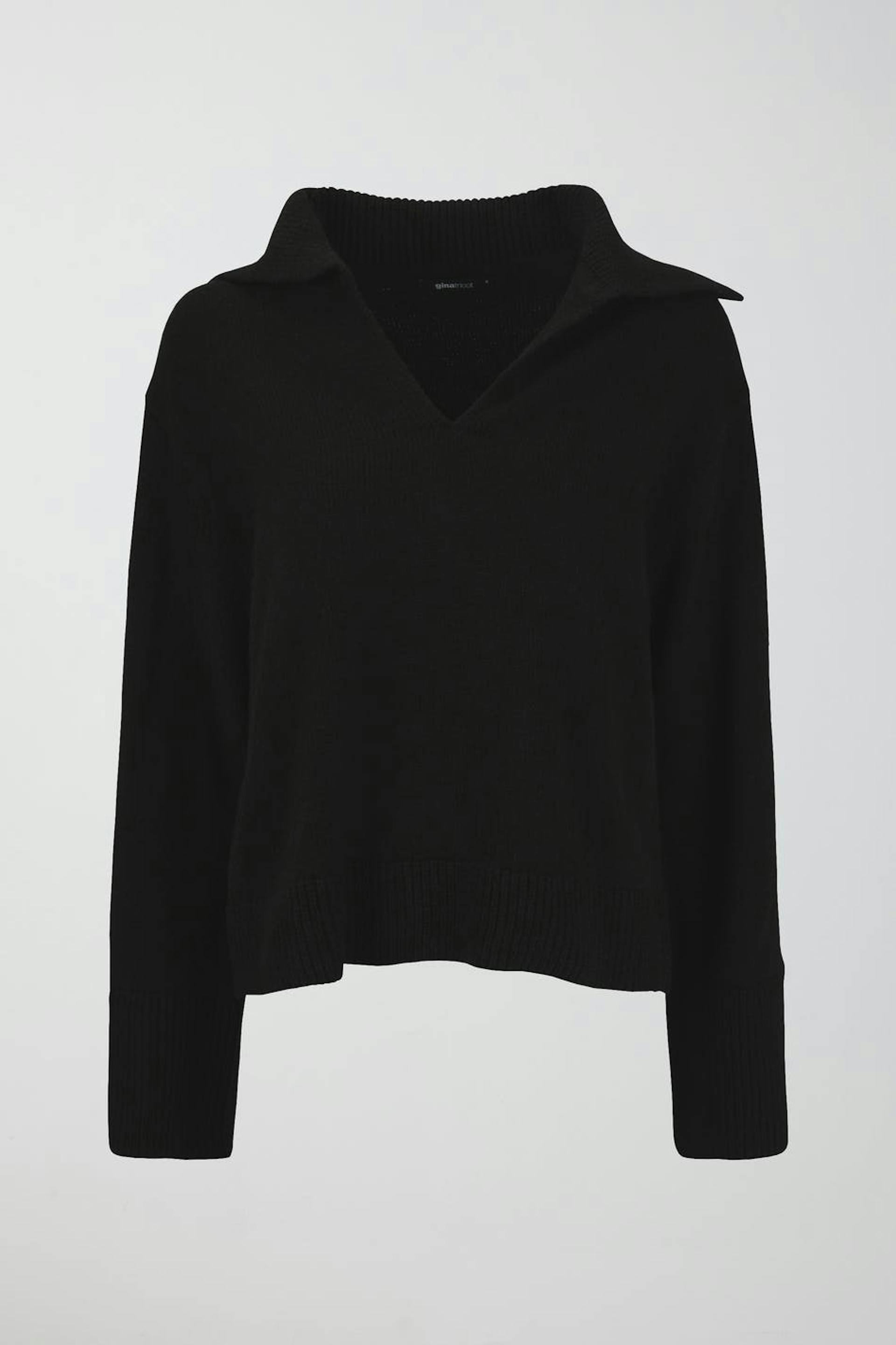 Striktrøje med v-udskæring. Trøjen er sort og har boxy pasform. Den har krave og langt ærme.