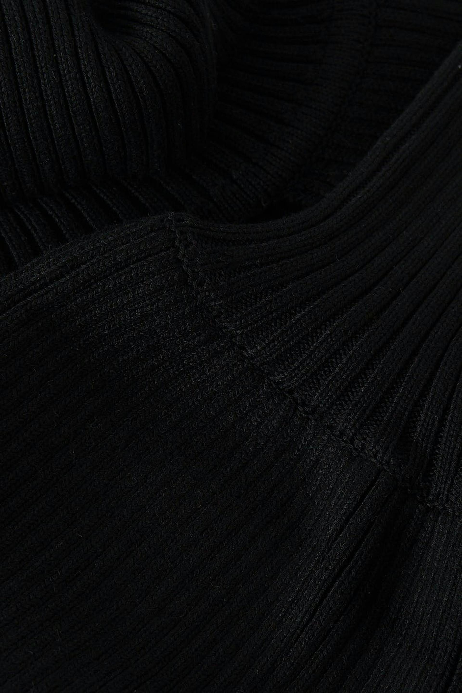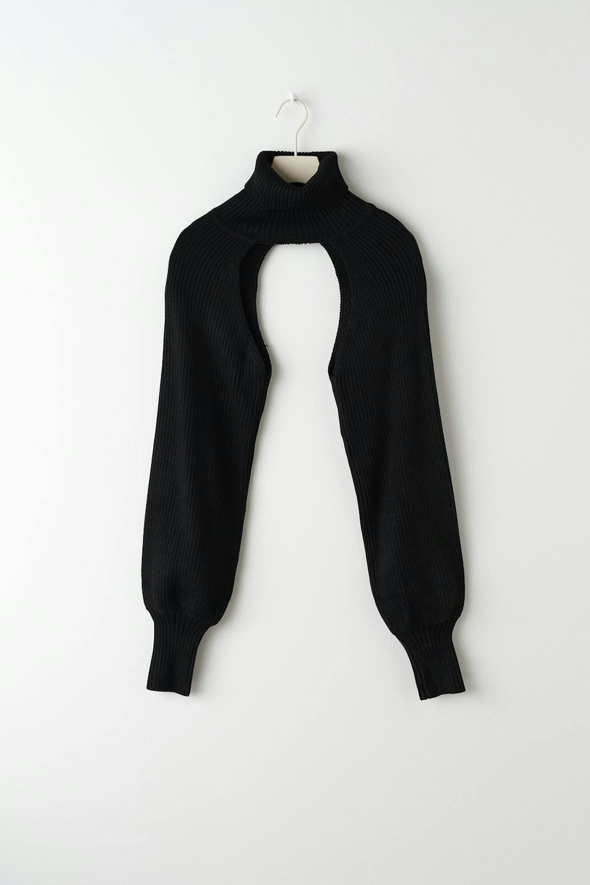Strikket turtleneck trøje uden for- og bagstykke med voluminøse raglanærmer. Trøjen er sort.