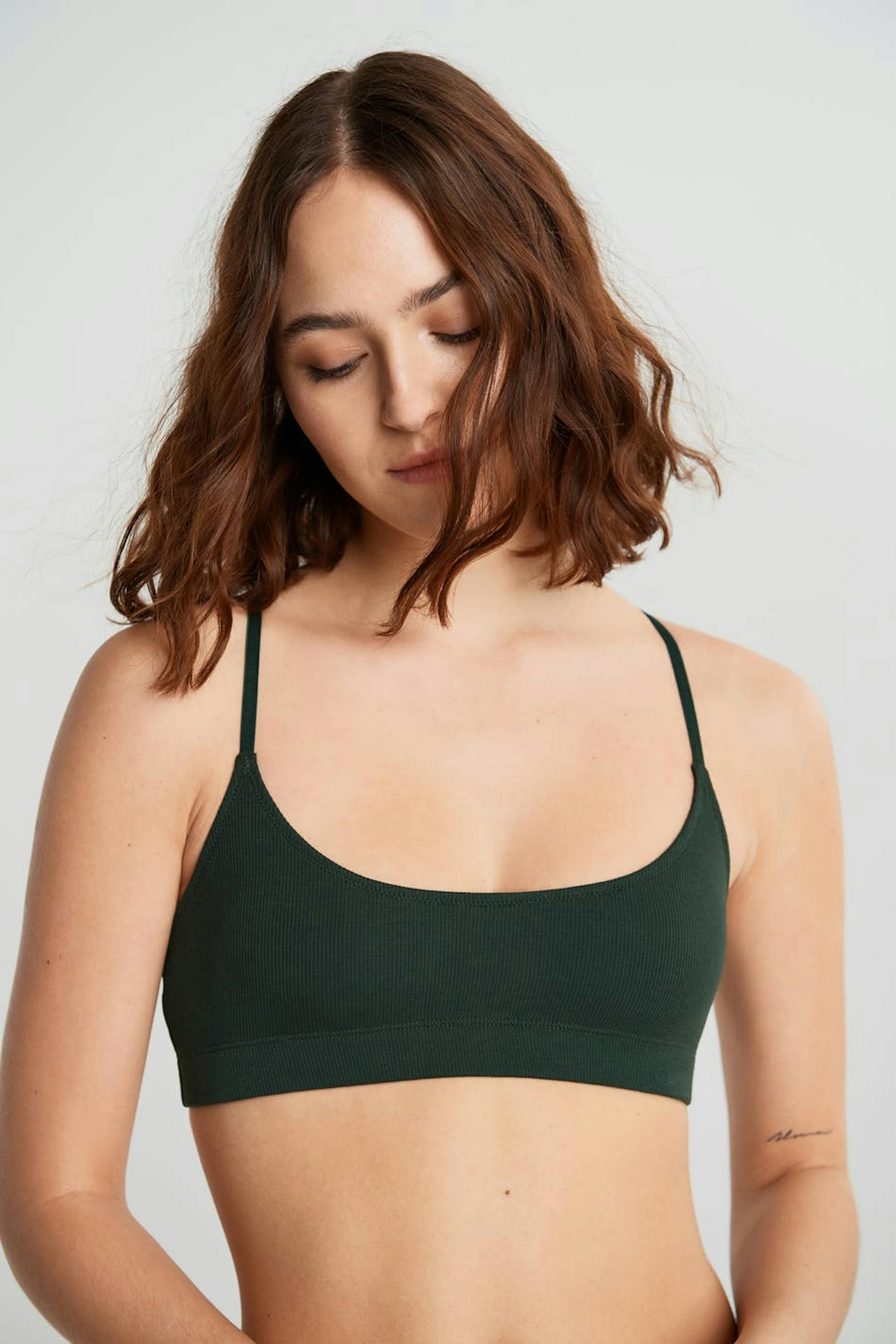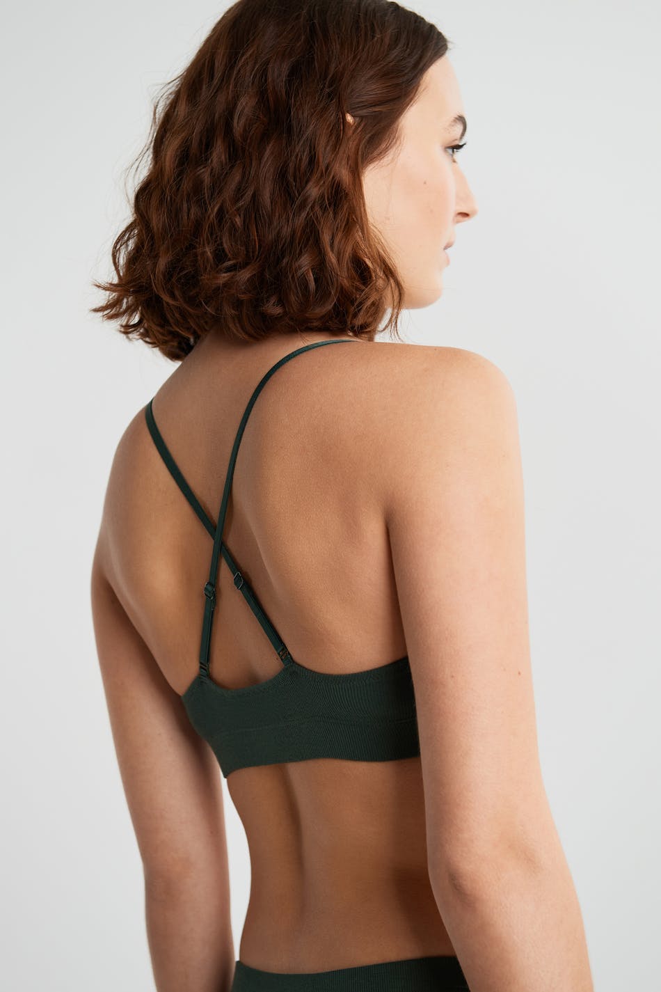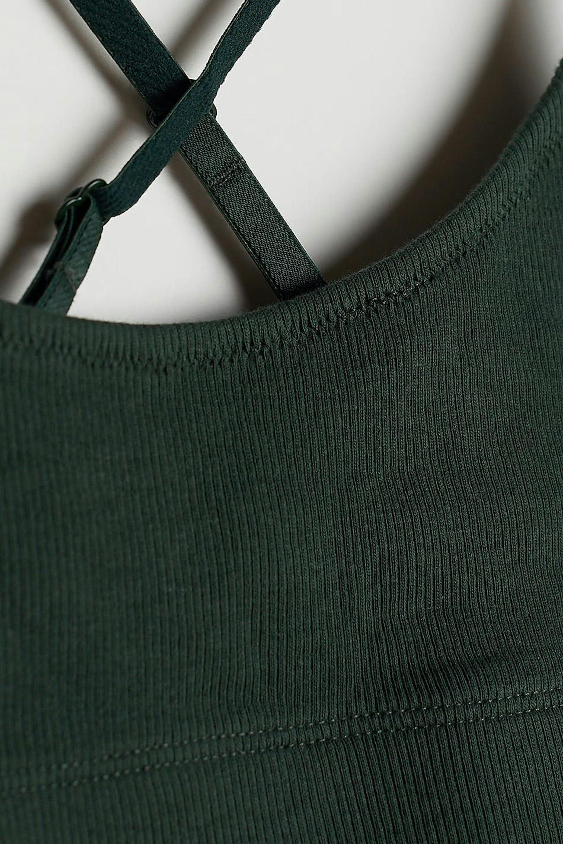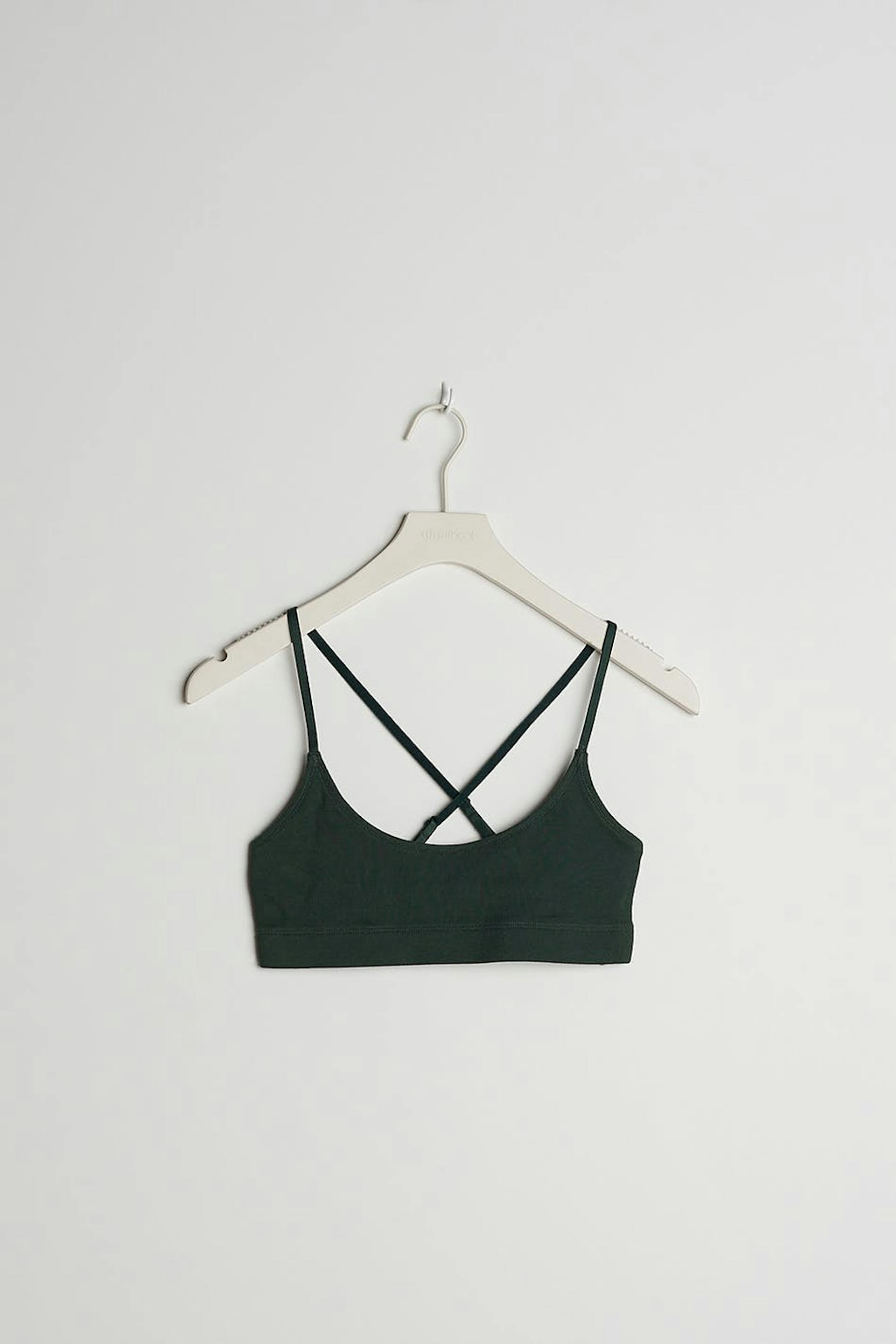 Blød bh med krydsmønstrede, justerbare skulderstropper. Bh'en er mørkegrøn og ribbet. Den er fremstillet af bomuld.