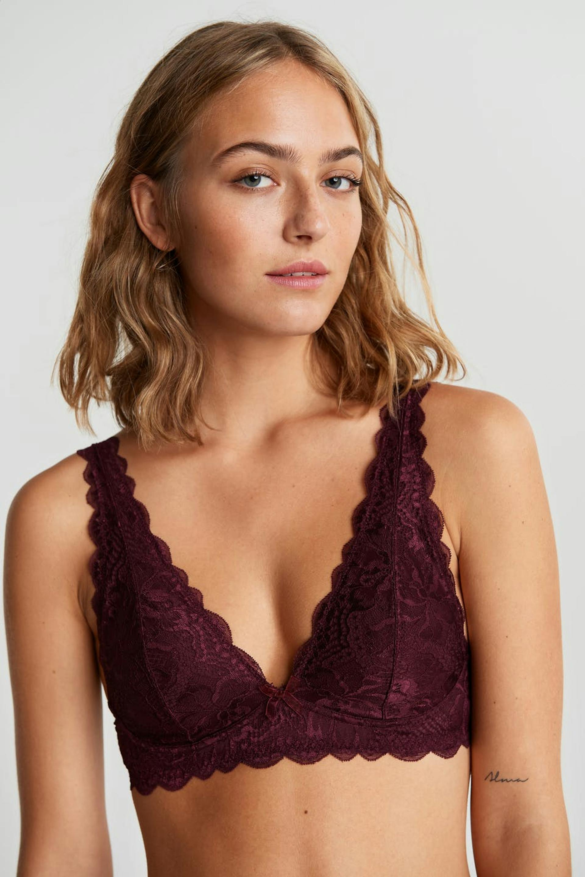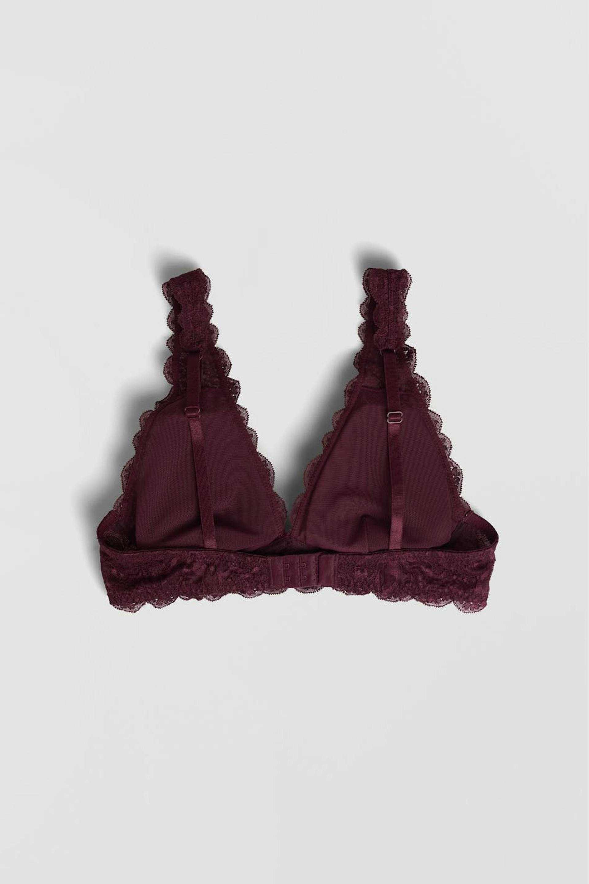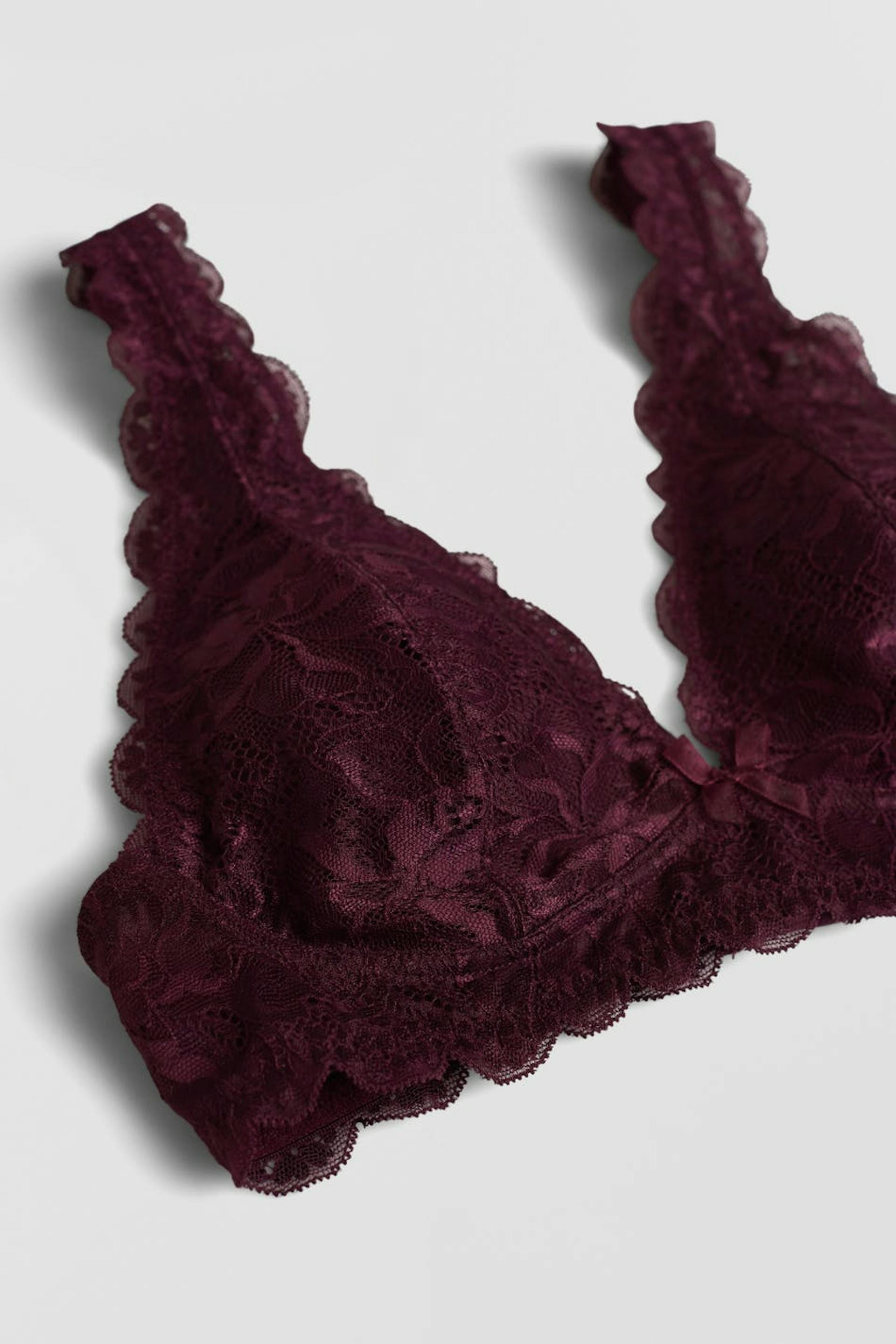 Bh med blød polstring. Bh'en er rød og har et elastisk bånd ved afslutningerne. Den er fremstillet af blonde og har justerbare skulderstropper, en justerbar lukning i ryggen og en dekorativ sløjfe.
