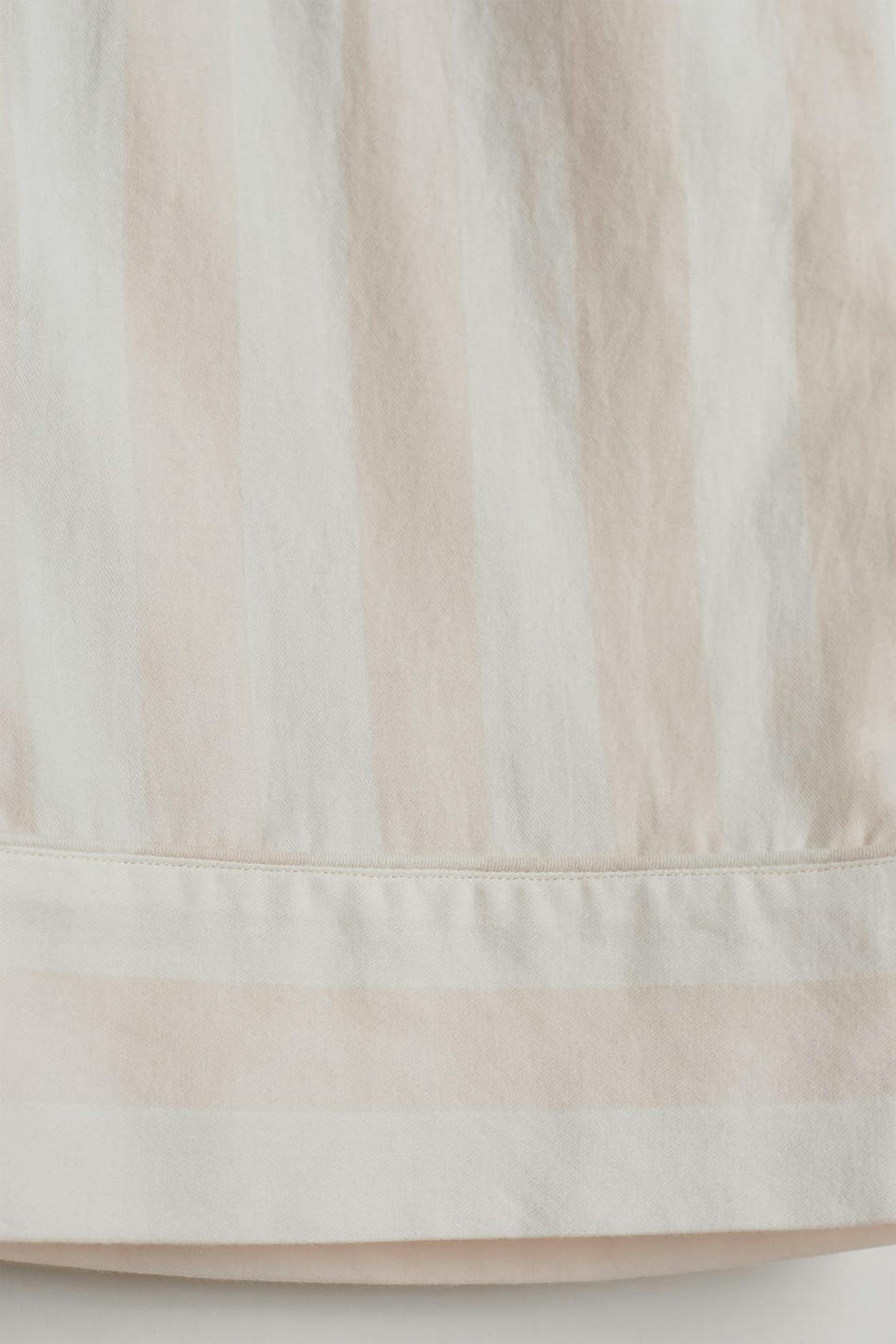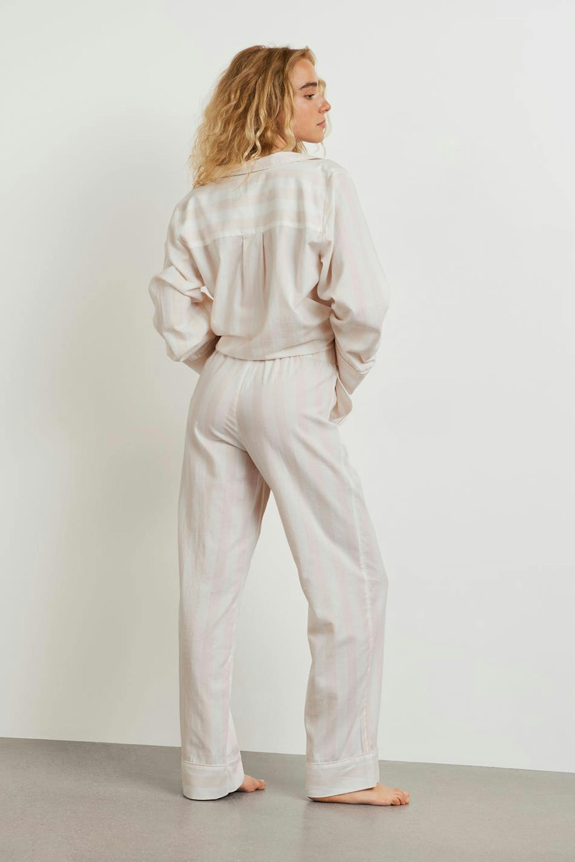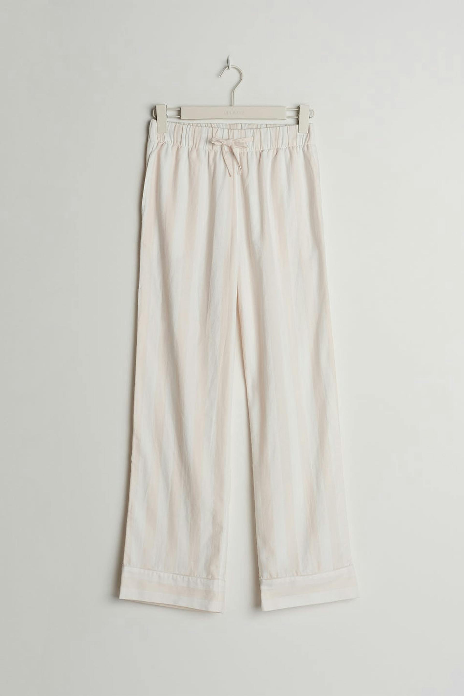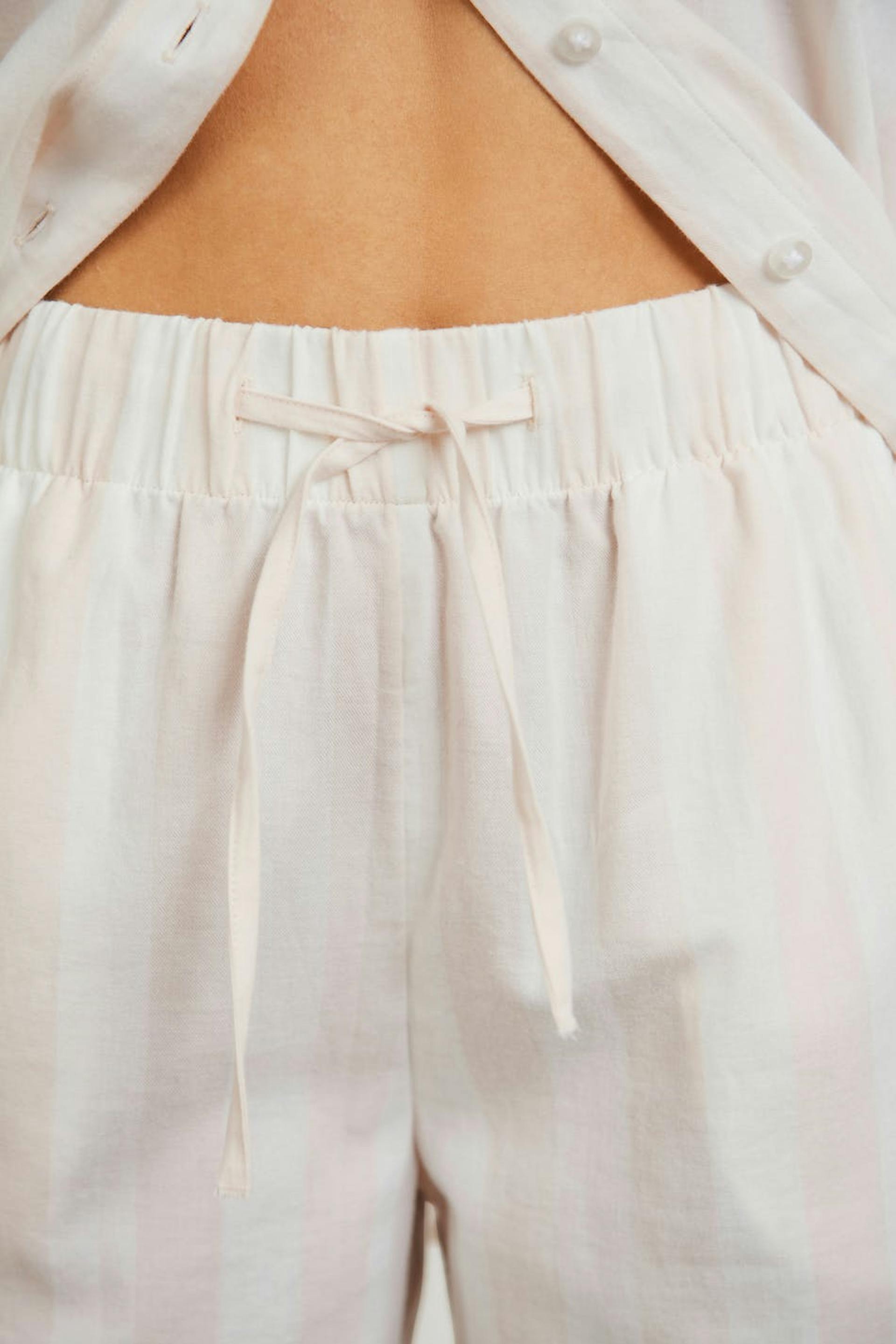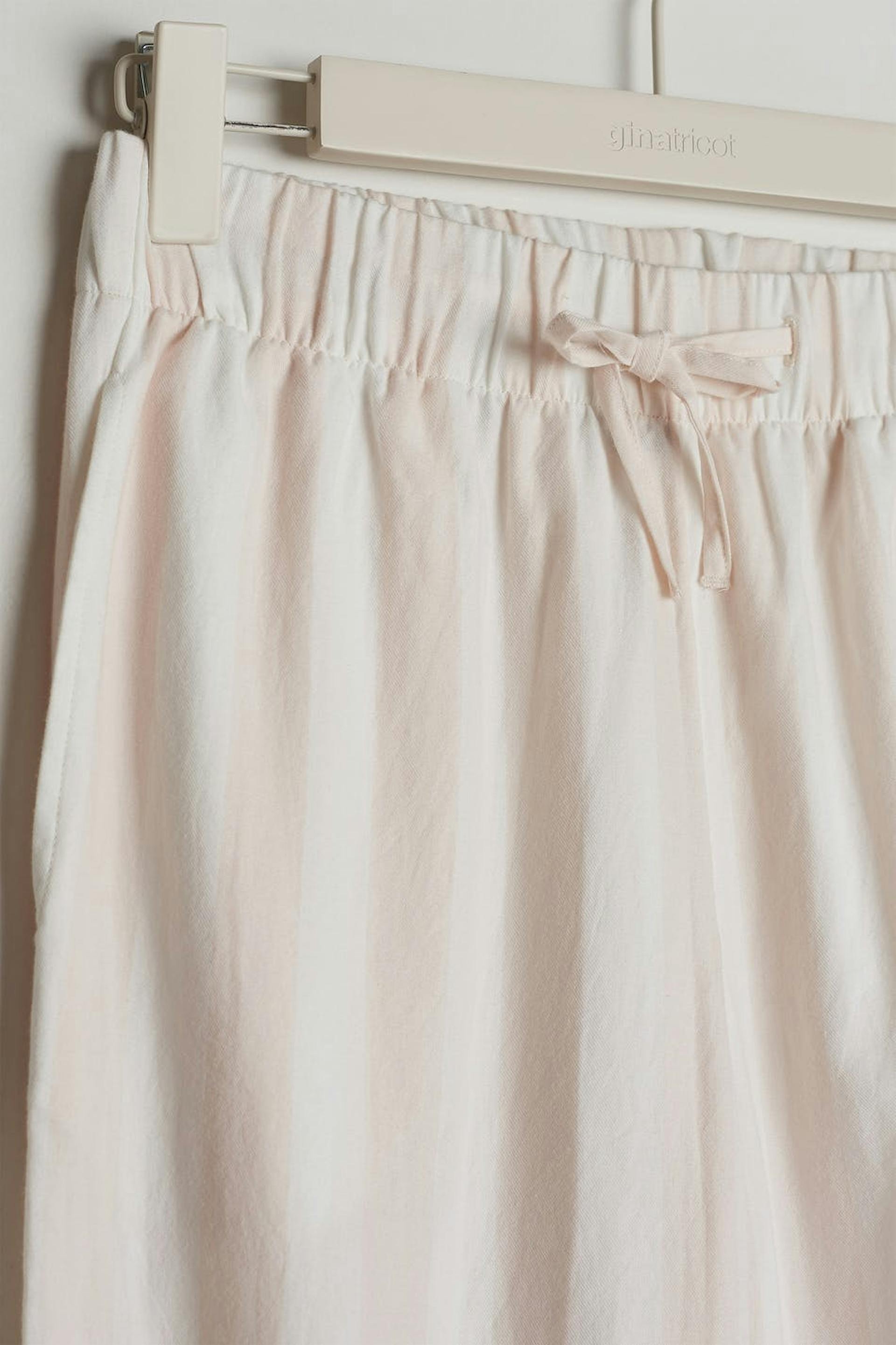 Stribede pyjamasbukser med et blødt materiale i bomuld. Pyjamassen er pink og hvid og har elastik ved taljen med et bindbart bånd ved fronten.
