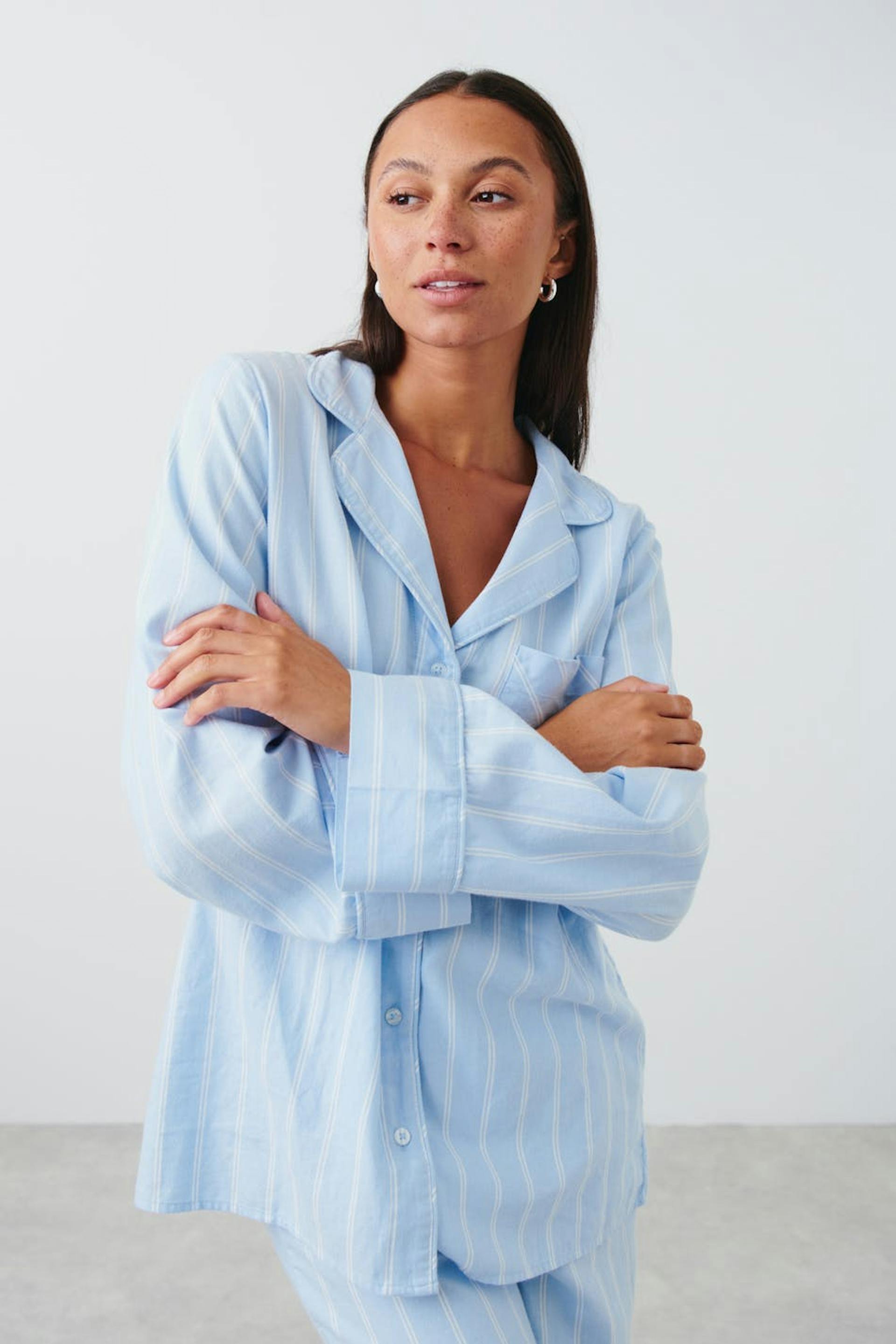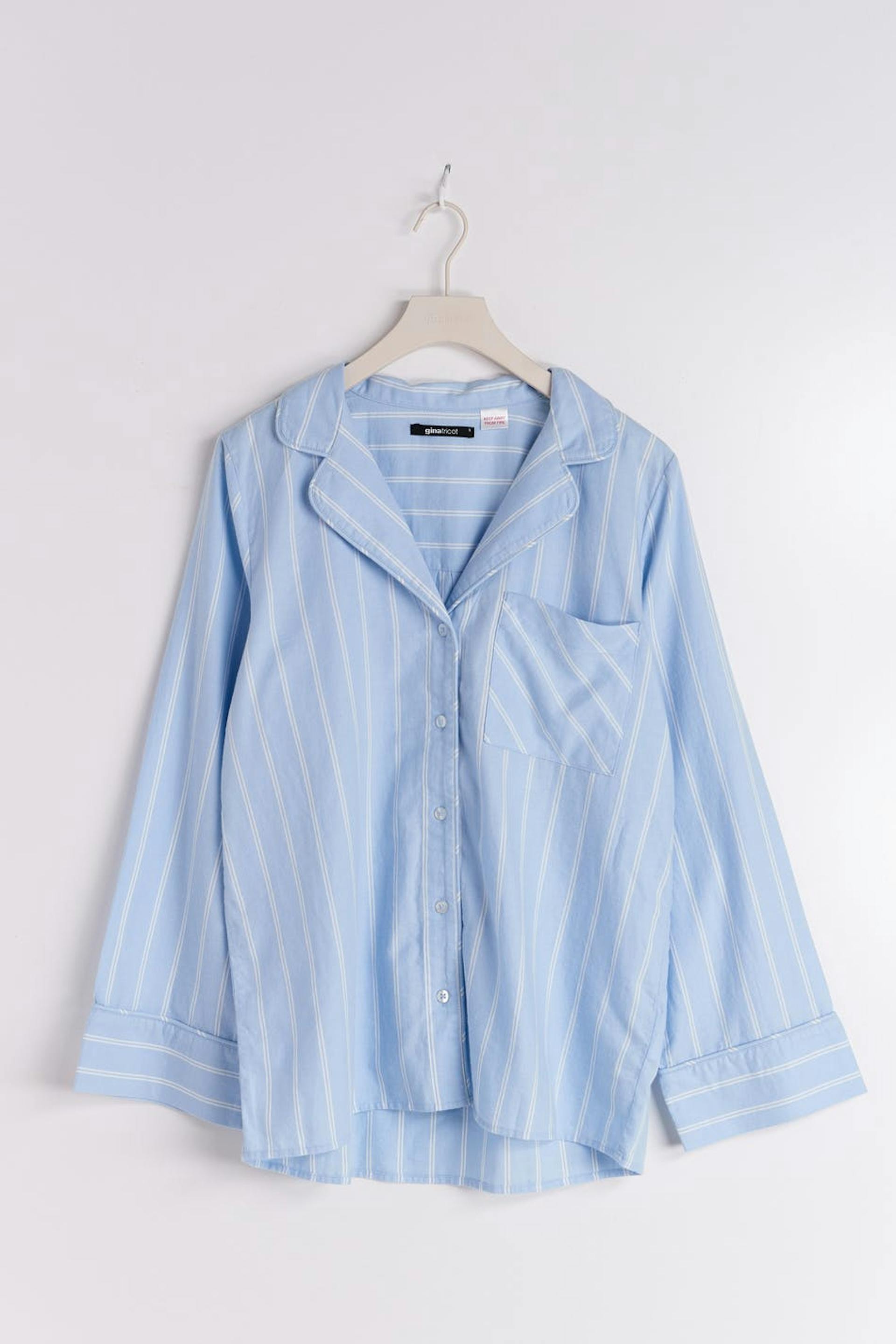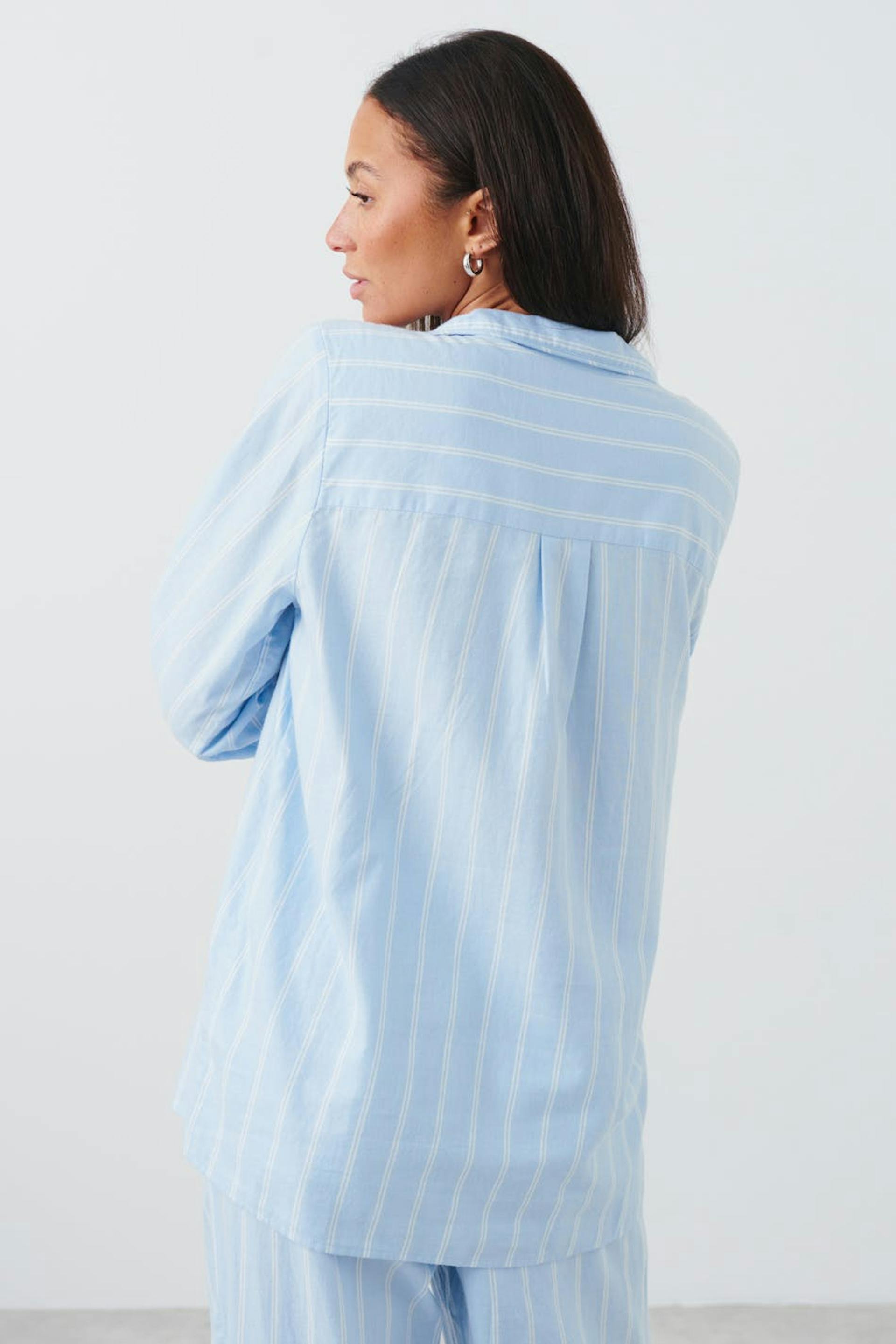 Stribet pyjamasskjorte i flonel med oversize pasform. Skjorten er blå og har brystlomme på den venstre side. Den har krave og langt ærme med knap og manchet.